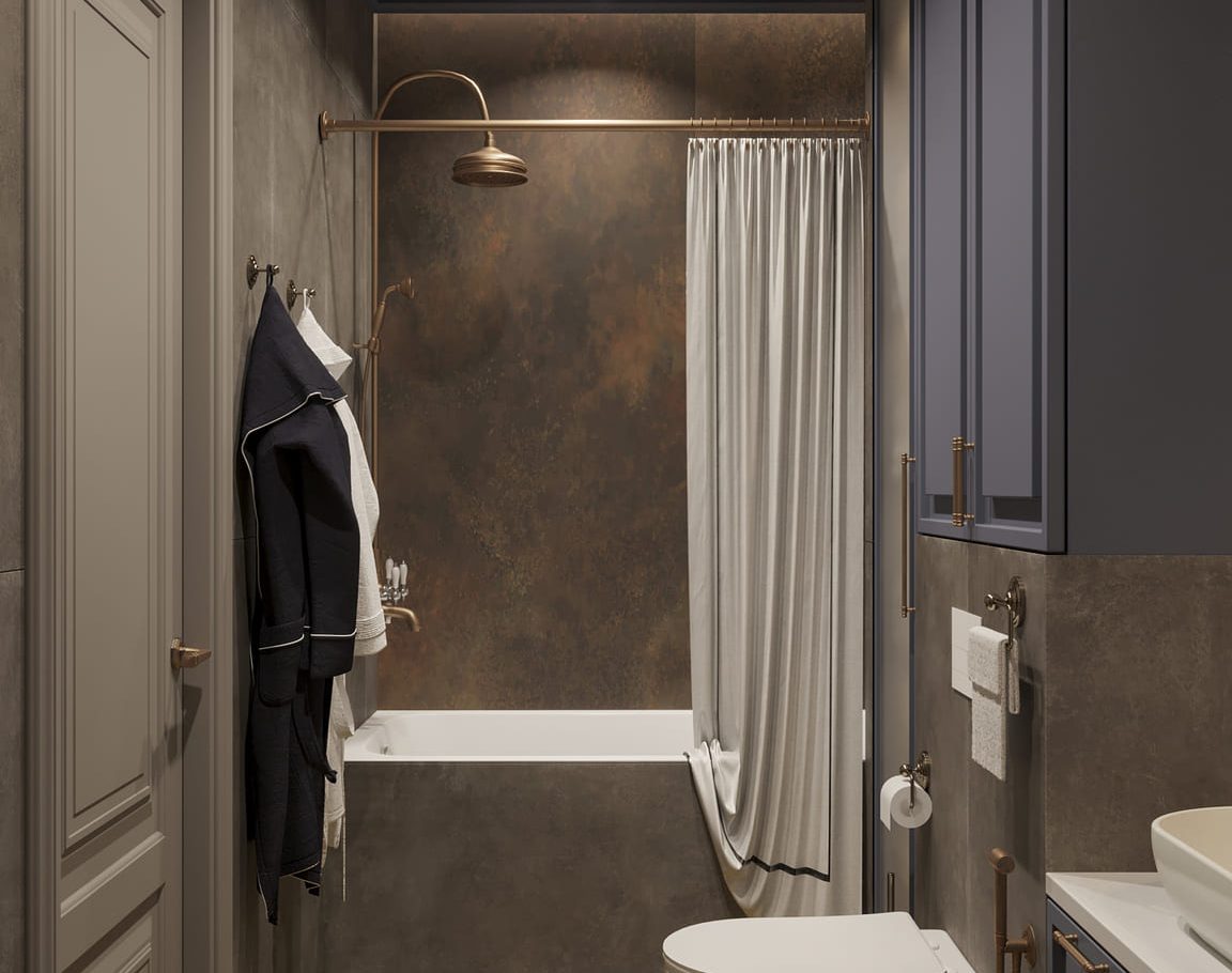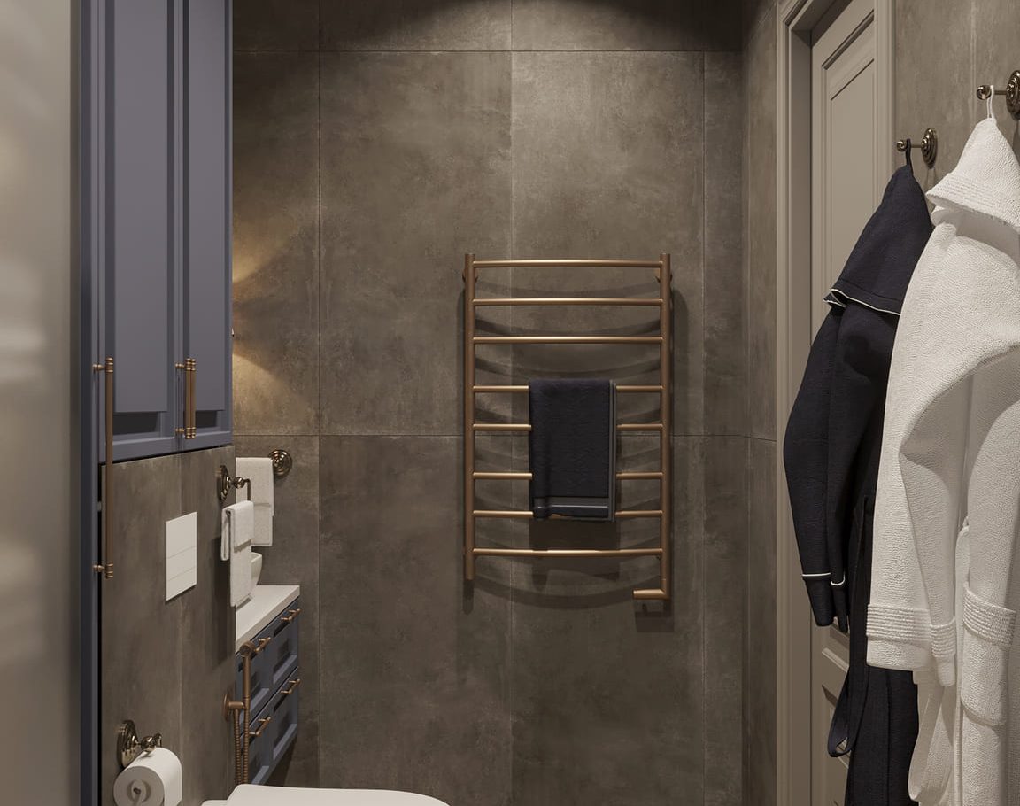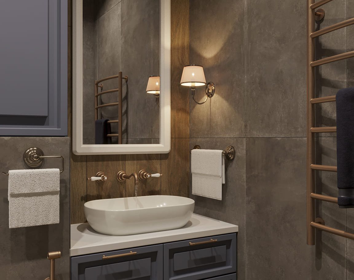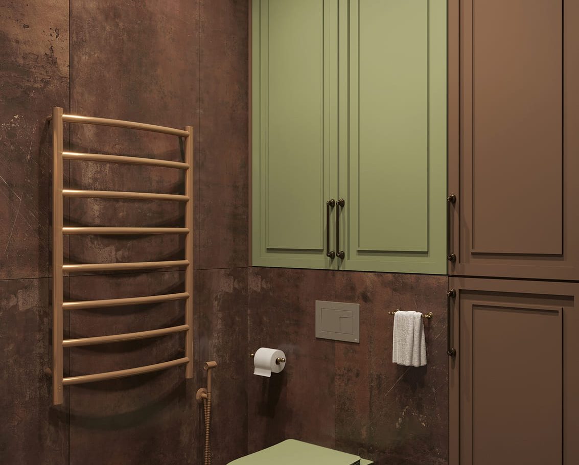 В каждой комнате мы использовали бронзовые акценты — в освещении, сантехнике и фурнитуре. Эти детали добавили глубины и благородства пространству. В итоге интерьер получился многослойным, детализированным и отражающим характер владельцев.