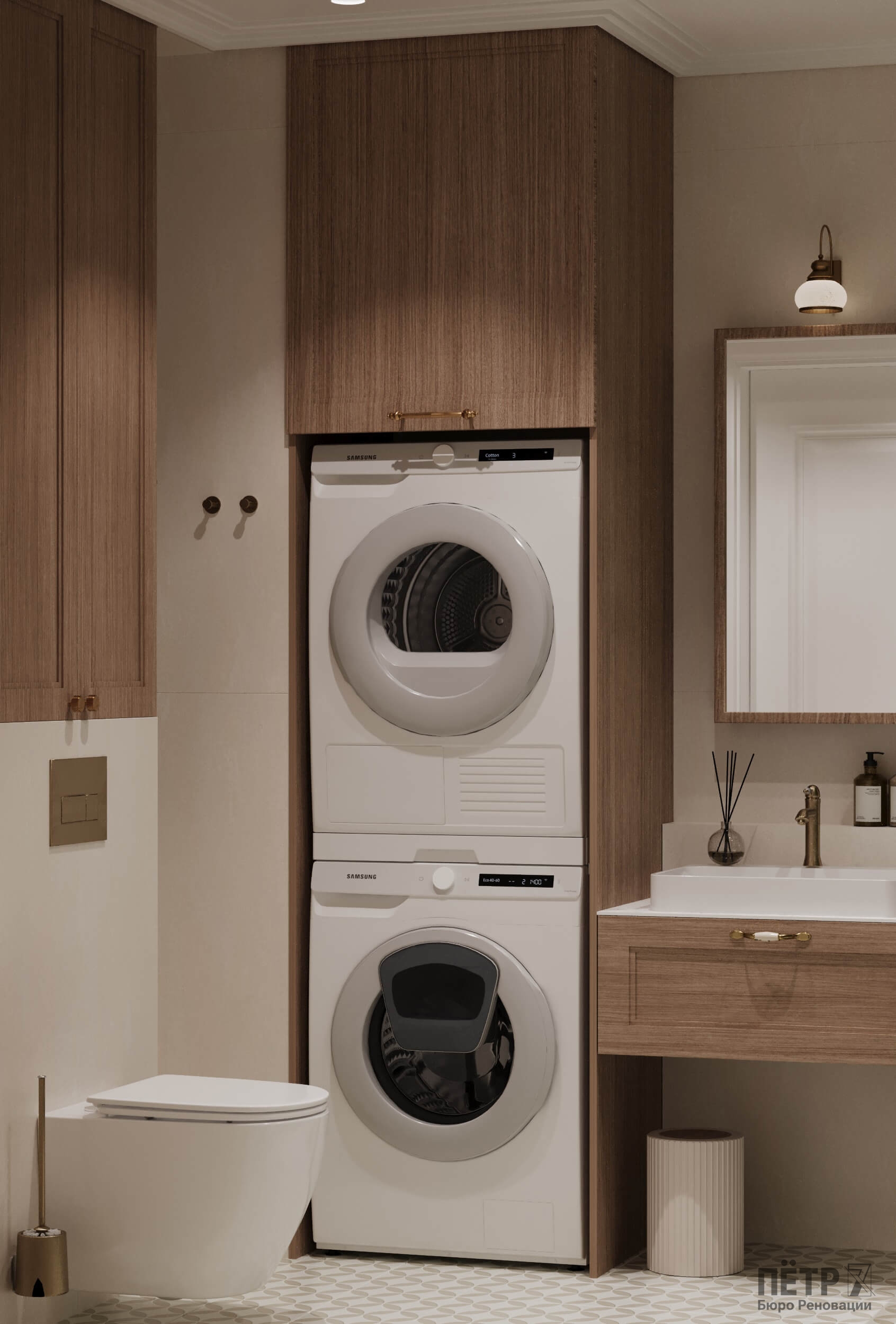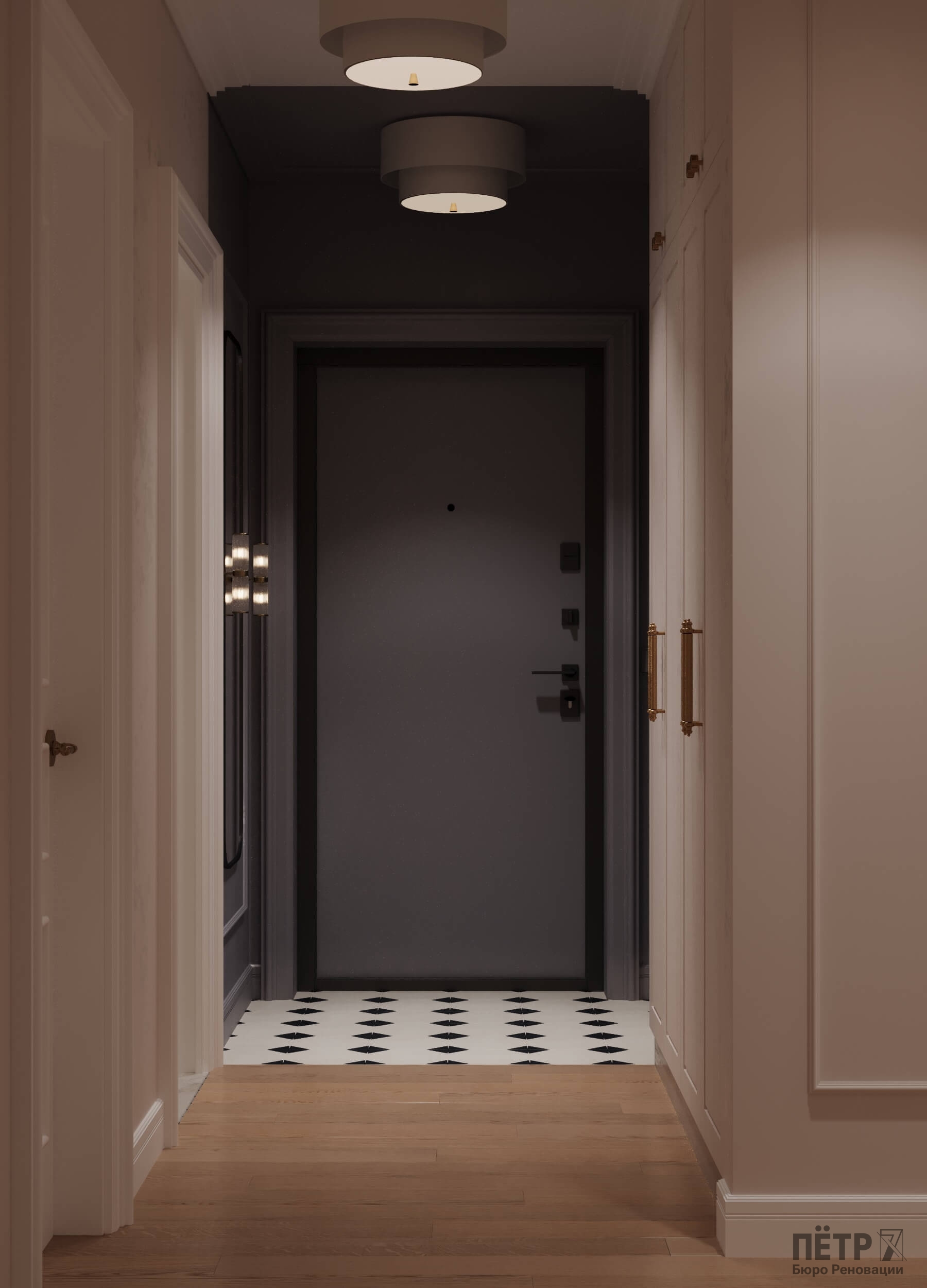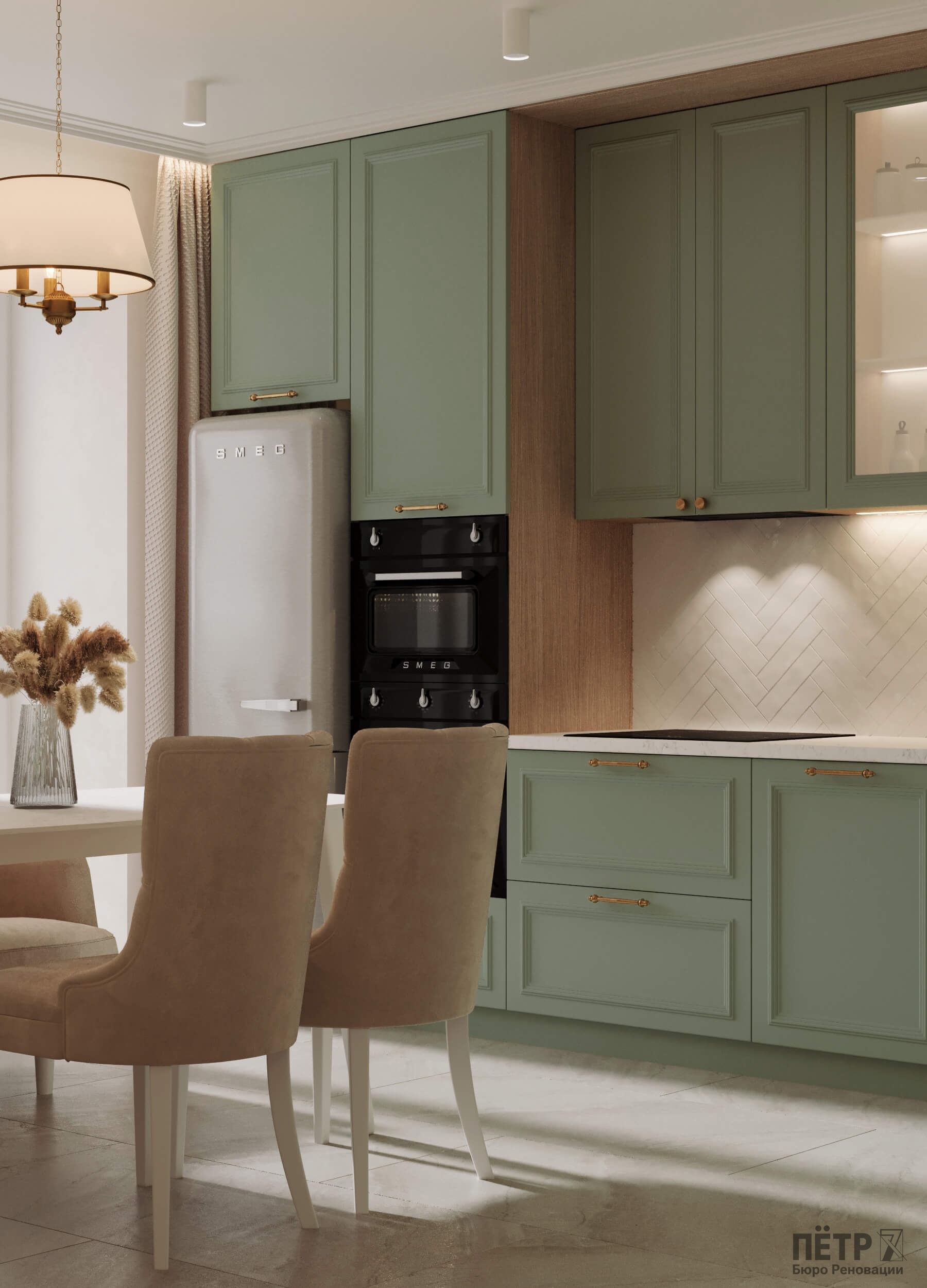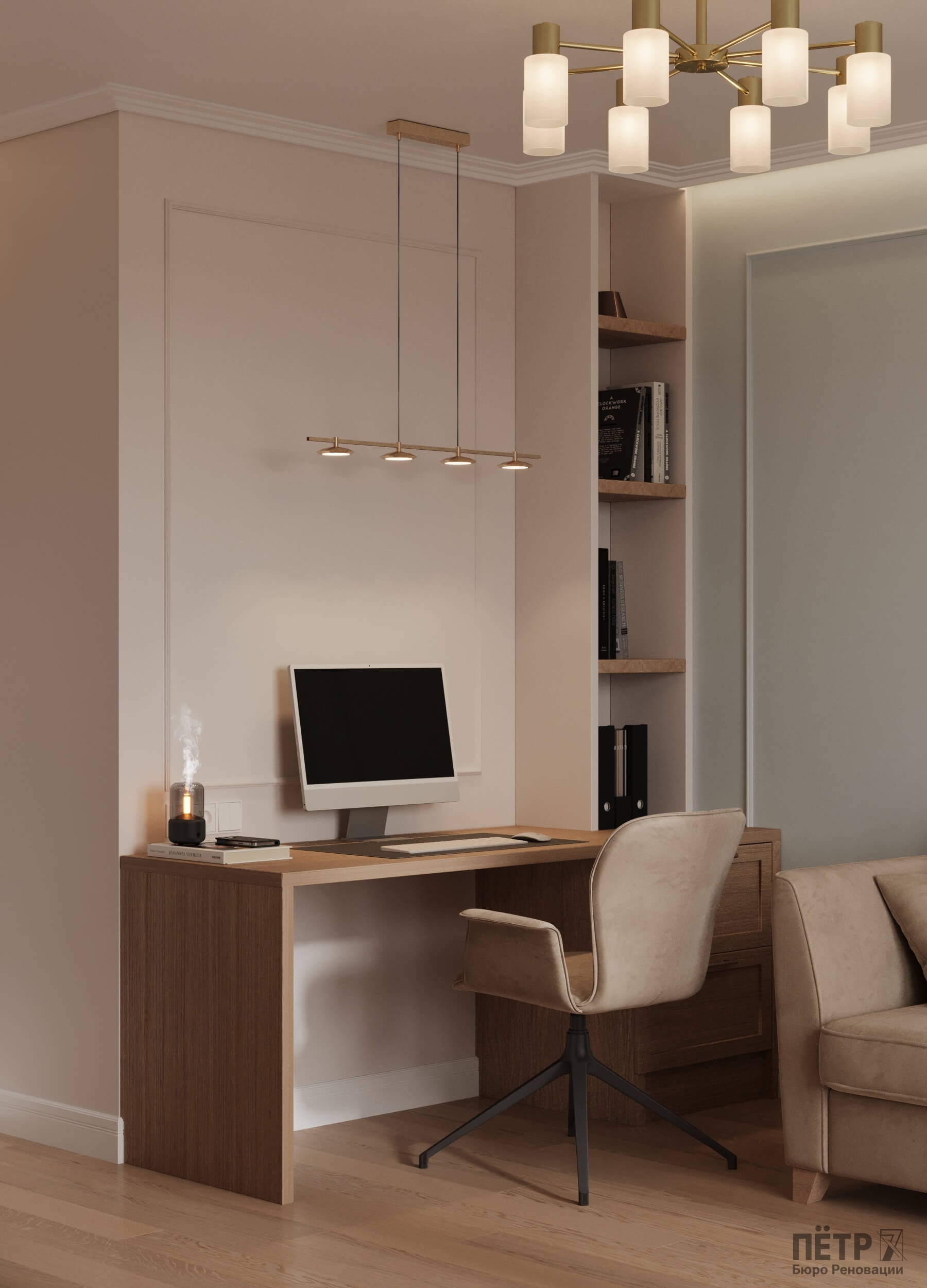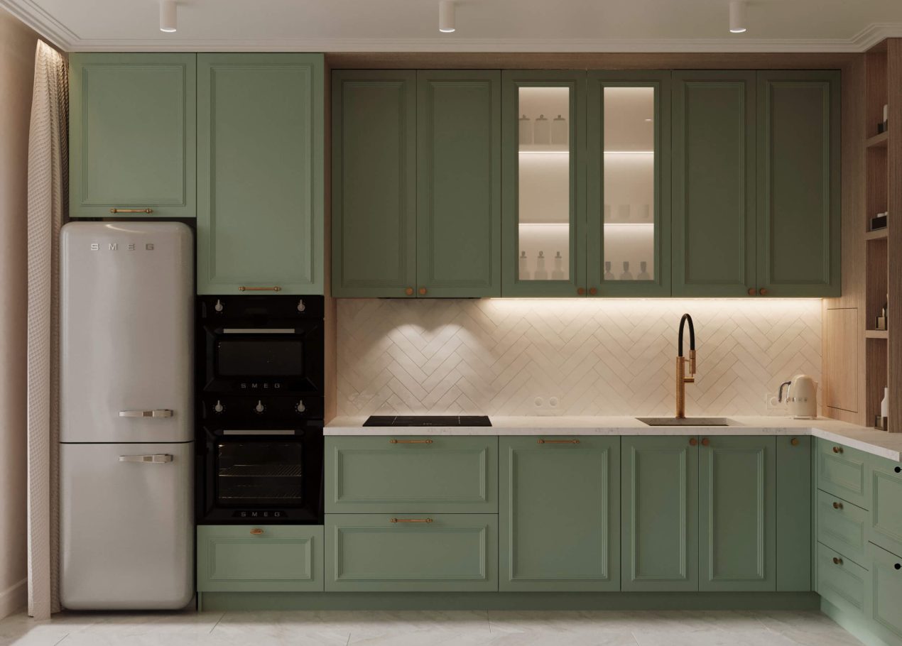 Главным инструментом стала цветовая палитра — именно она формирует характер каждой комнаты. Медные акценты в светильниках и фурнитуре добавили интерьеру тепла и благородства. В результате пространство получилось стильным, уютным и продуманным до мелочей.