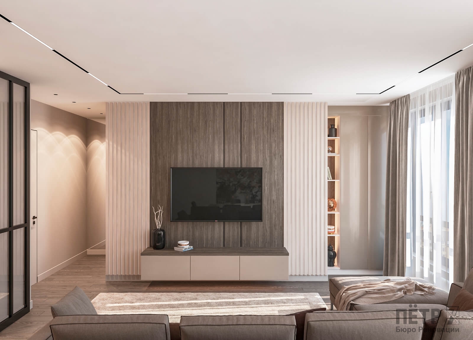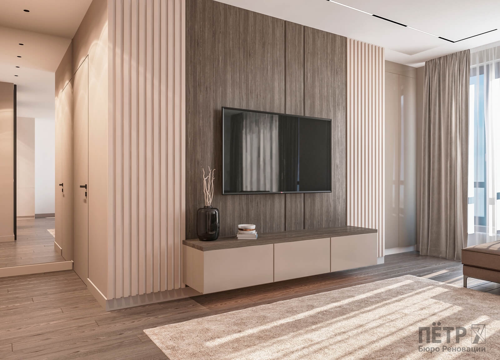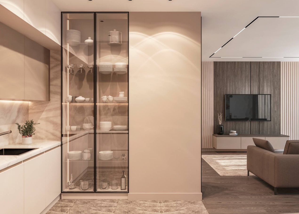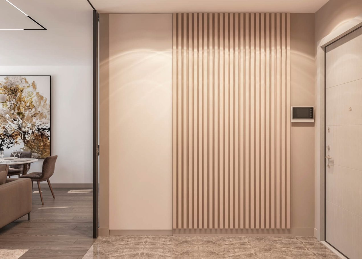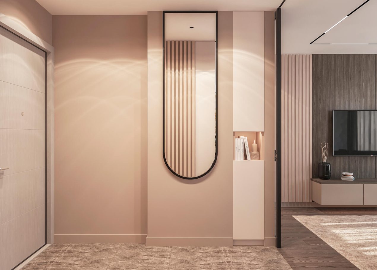 В этом проекте мы выстроили интерьер на плавных переходах бежевых оттенков — от светлых до более глубоких и насыщенных. Такой приём позволил создать цельное, мягкое и обволакивающее пространство.