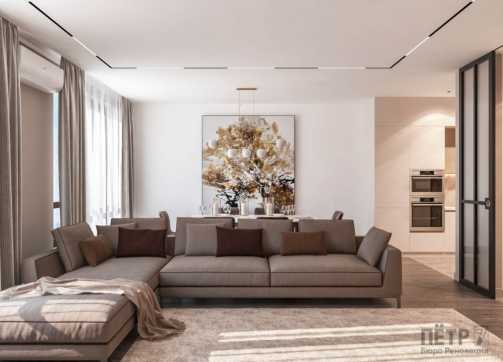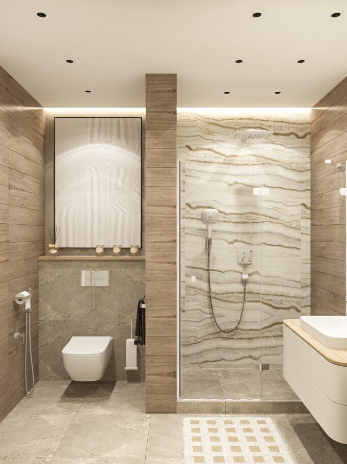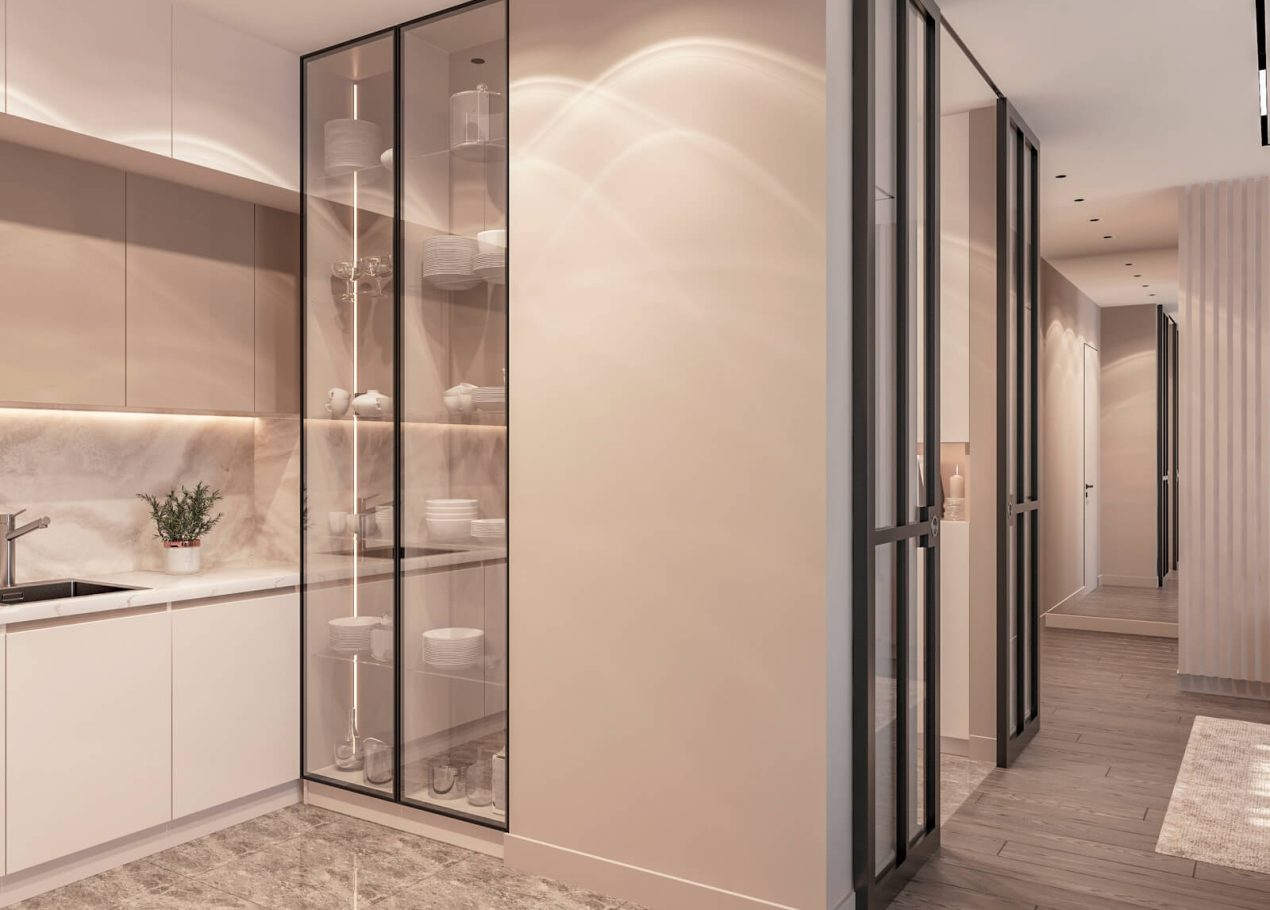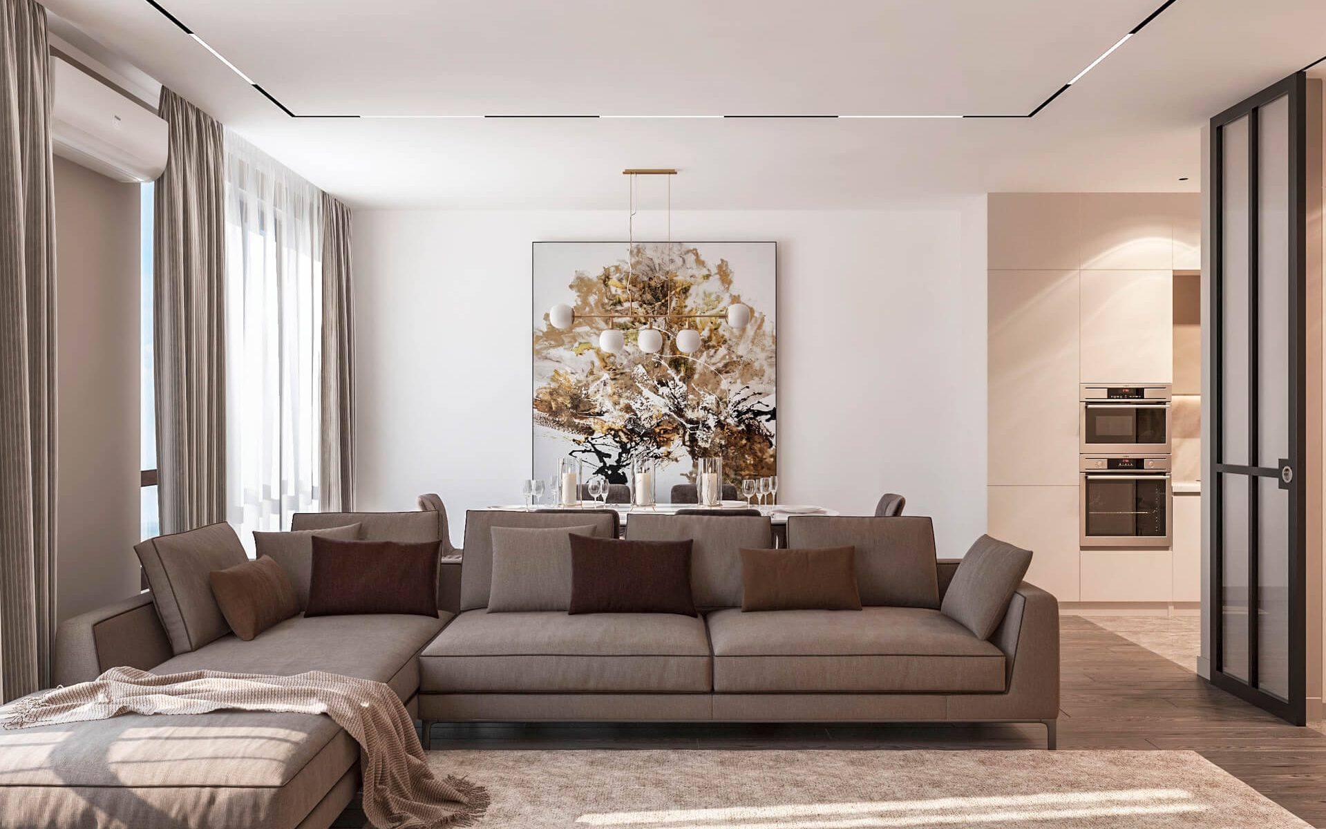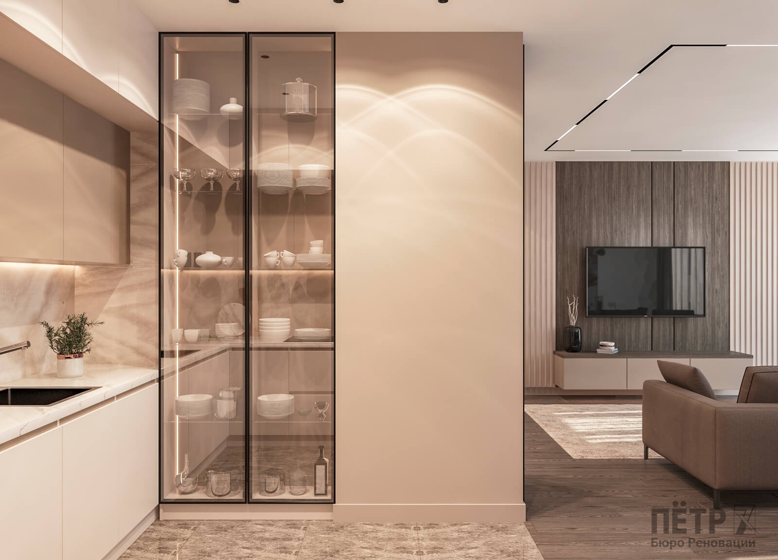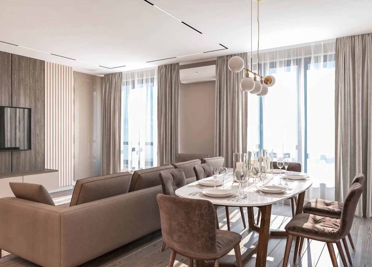 В этом проекте мы выстроили интерьер на плавных переходах бежевых оттенков — от светлых до более глубоких и насыщенных. Такой приём позволил создать цельное, мягкое и обволакивающее пространство.