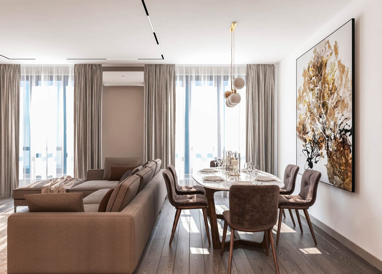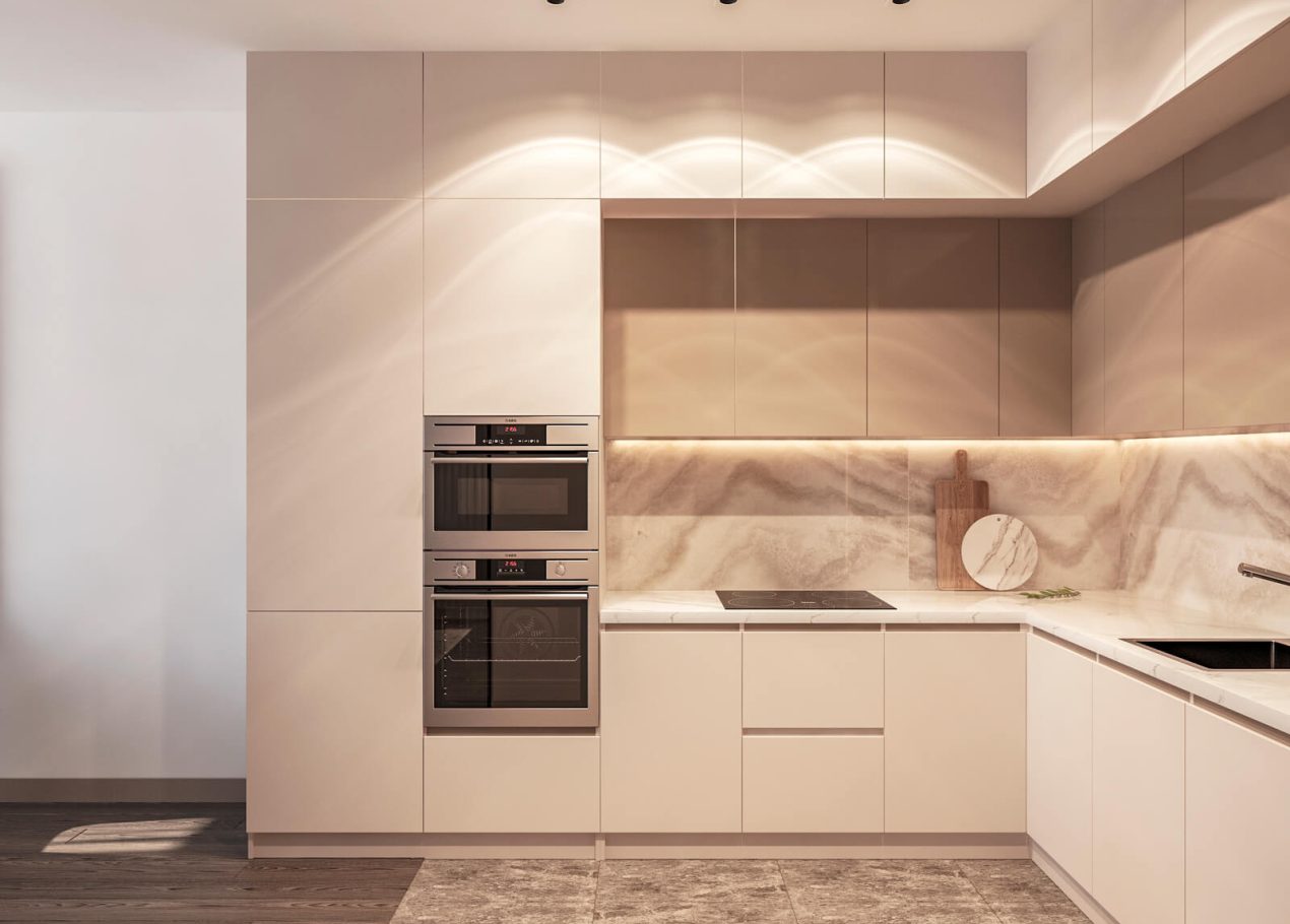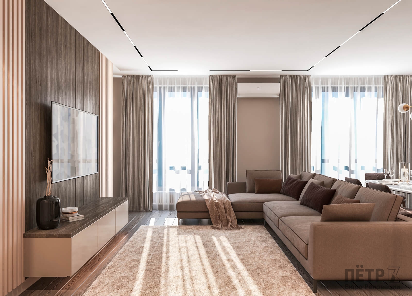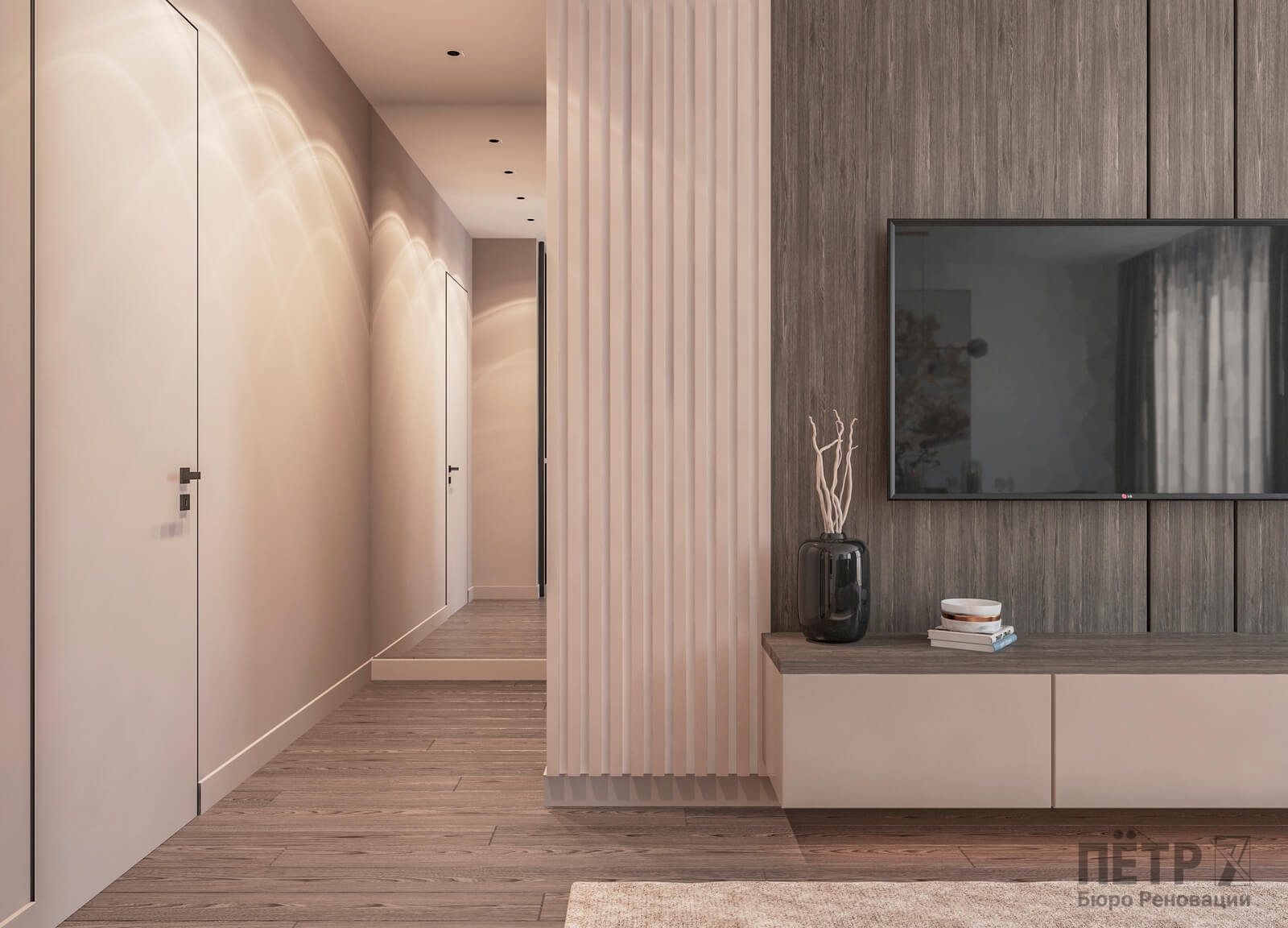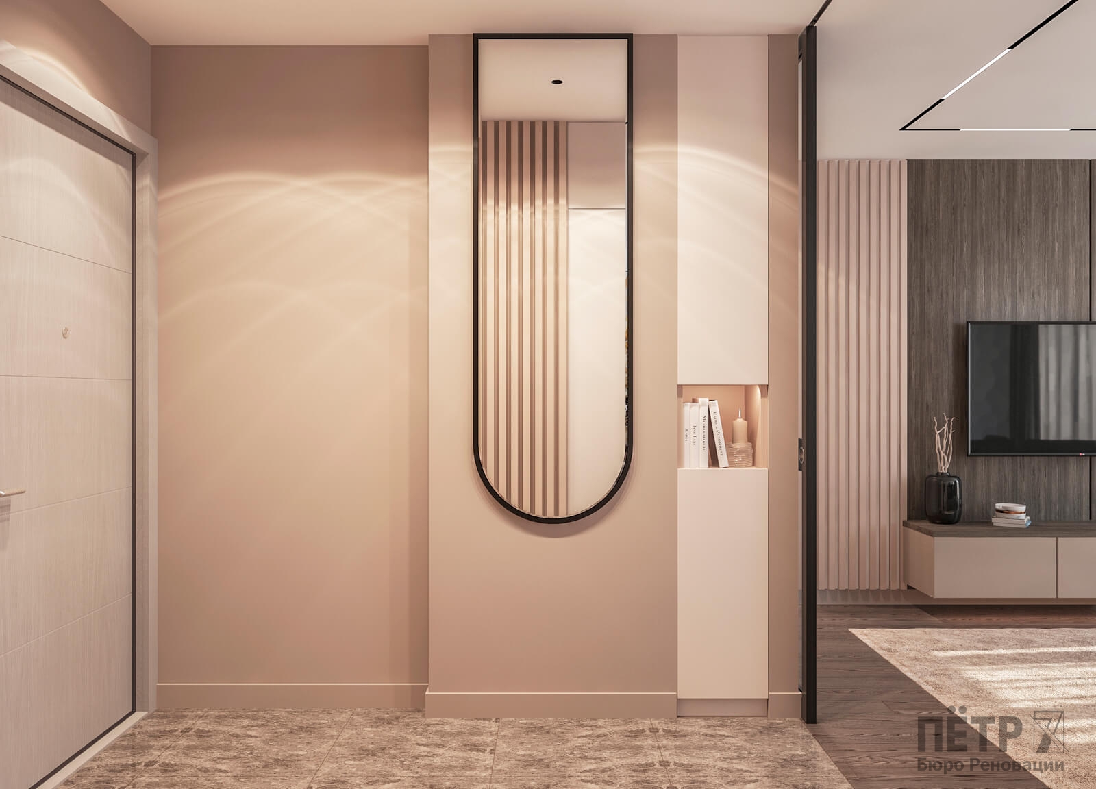 В этом проекте мы выстроили интерьер на плавных переходах бежевых оттенков — от светлых до более глубоких и насыщенных. Такой приём позволил создать цельное, мягкое и обволакивающее пространство.