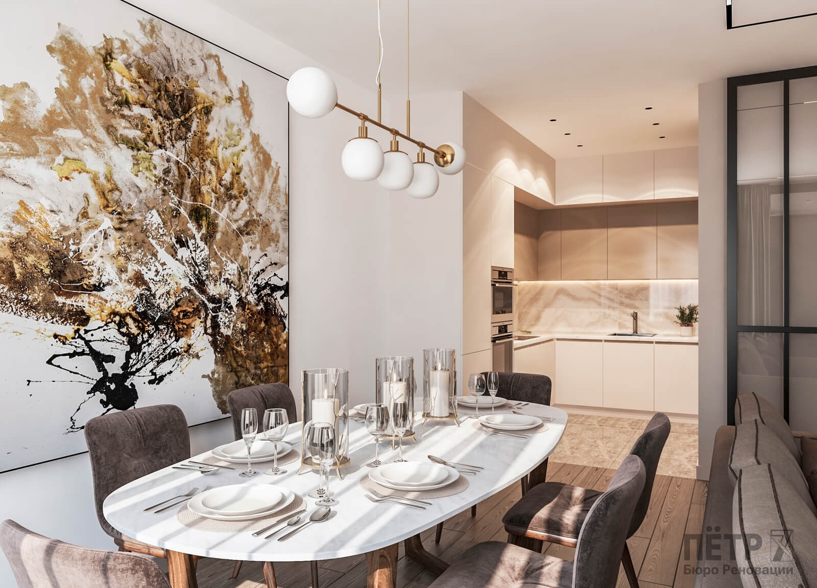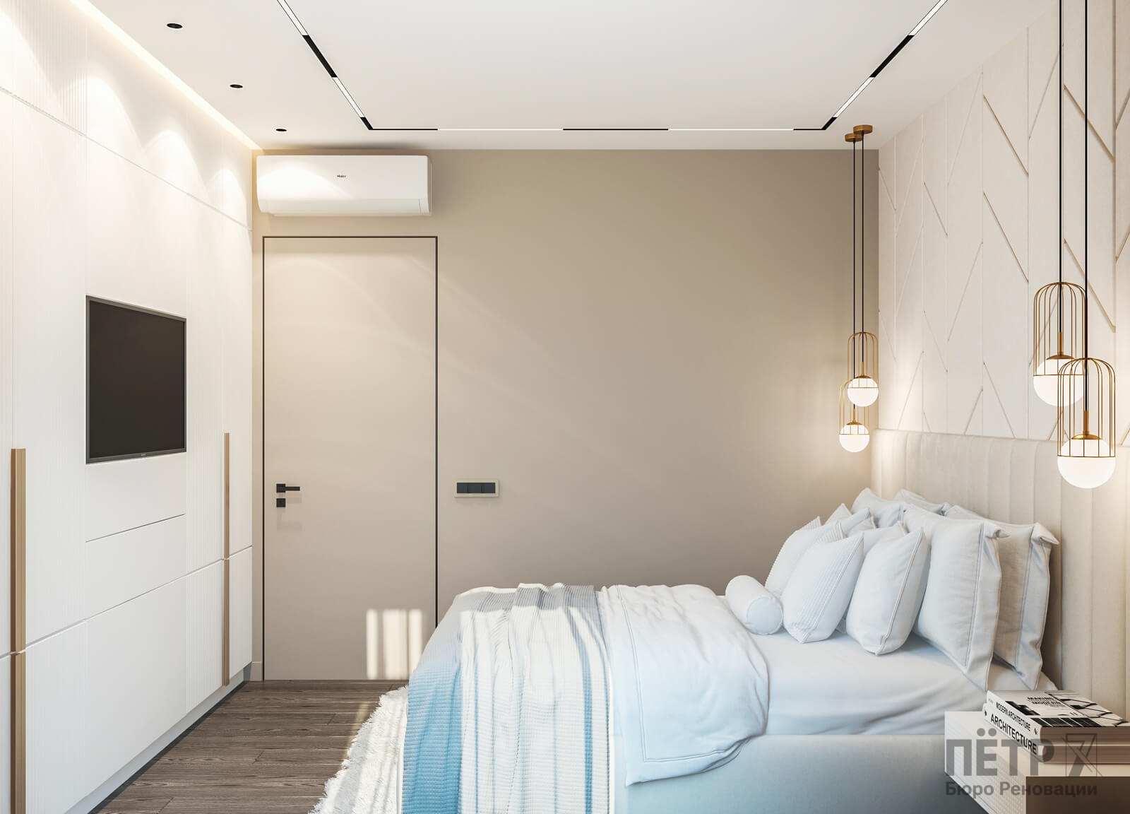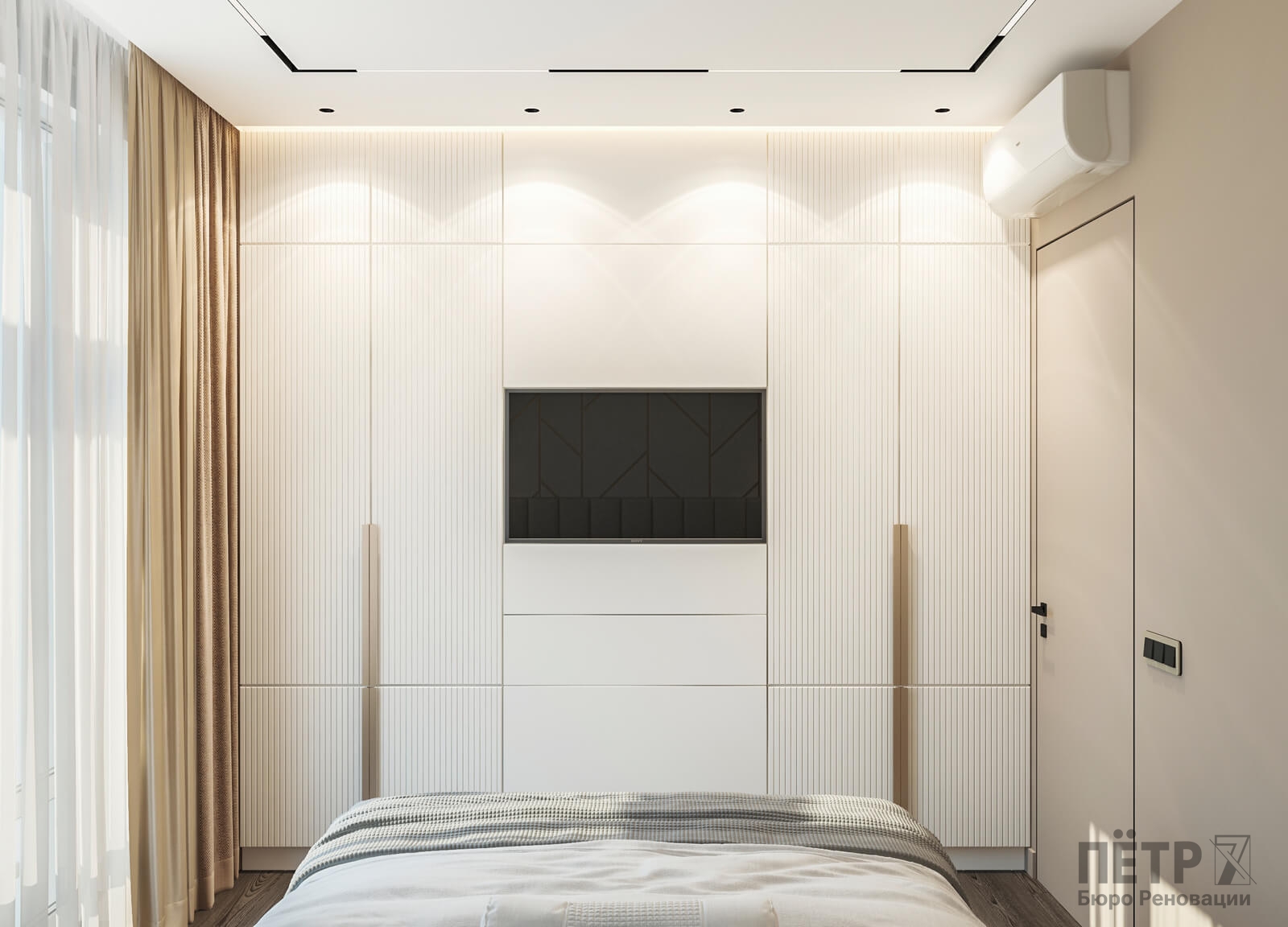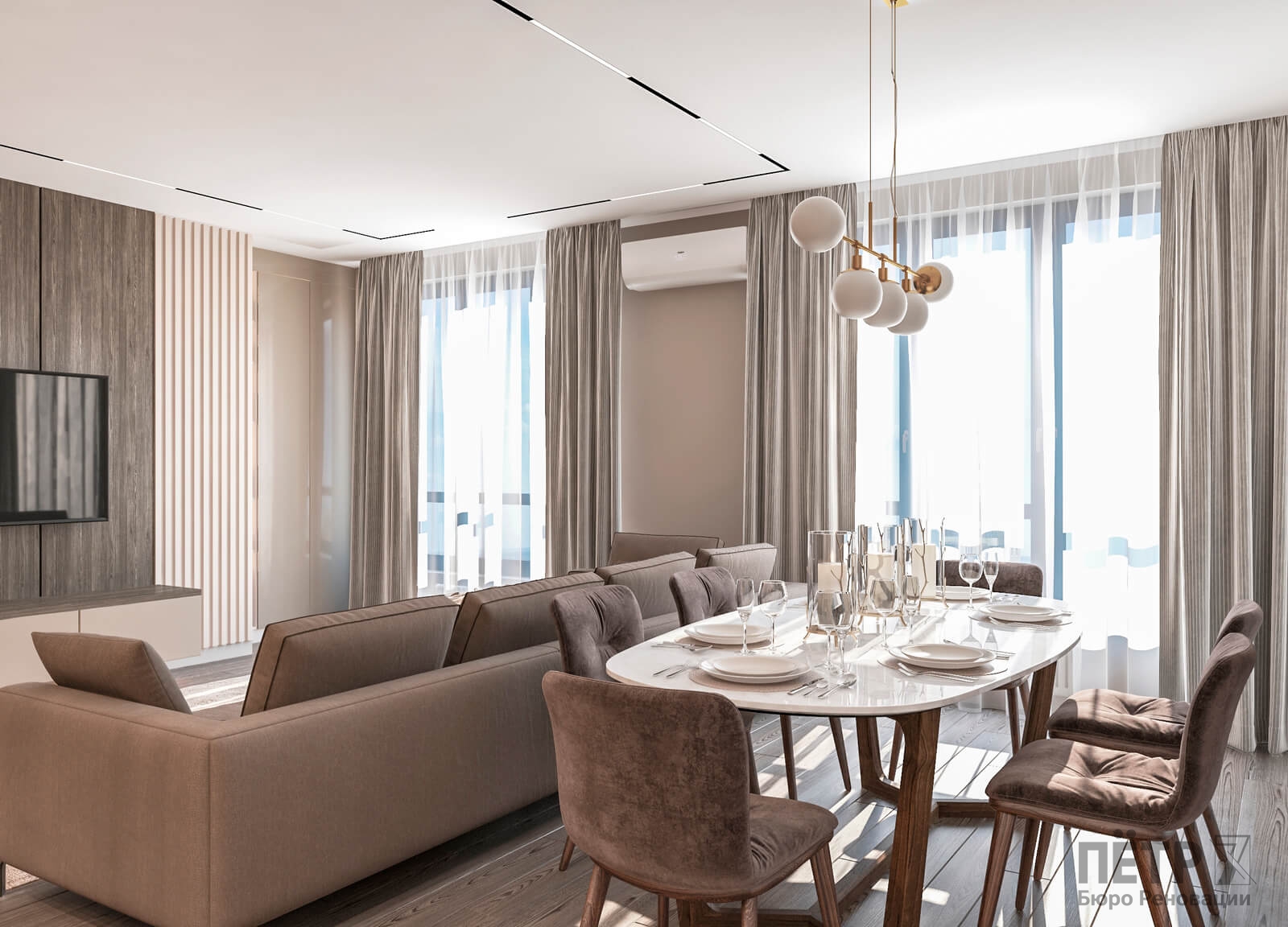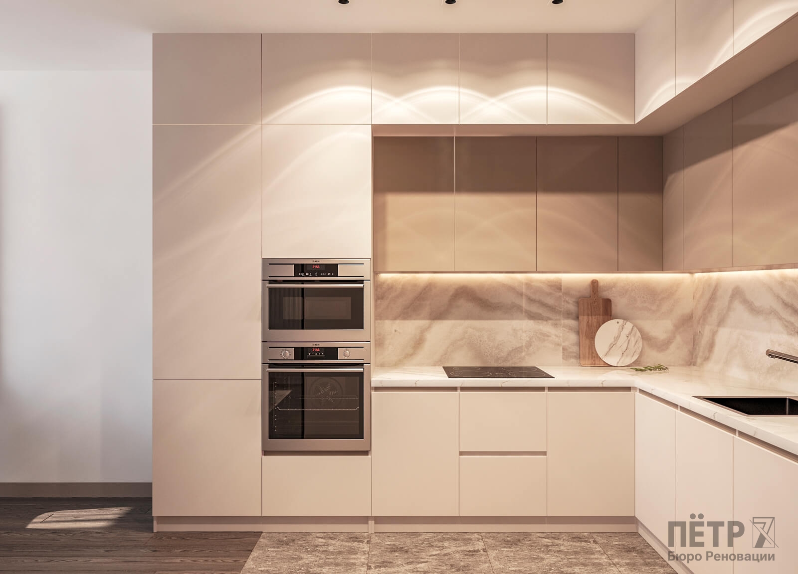 В этом проекте мы выстроили интерьер на плавных переходах бежевых оттенков — от светлых до более глубоких и насыщенных. Такой приём позволил создать цельное, мягкое и обволакивающее пространство.