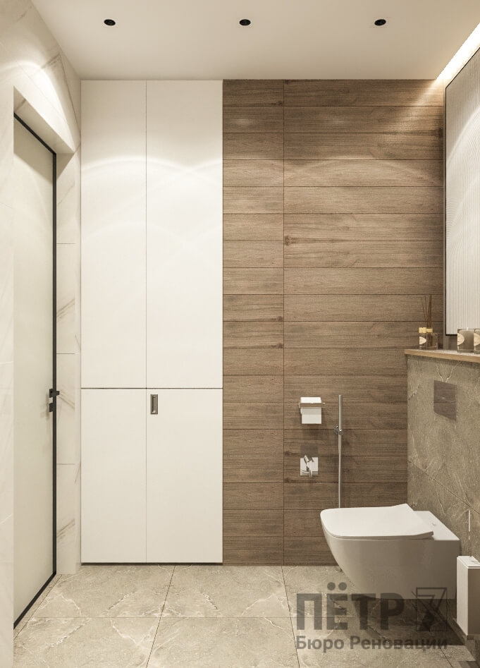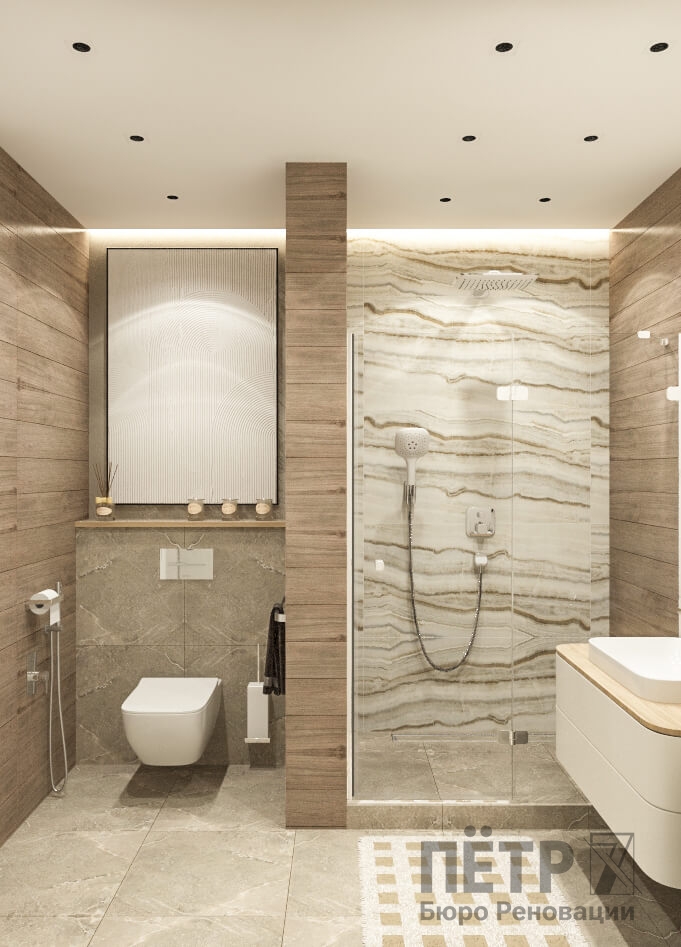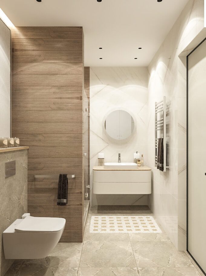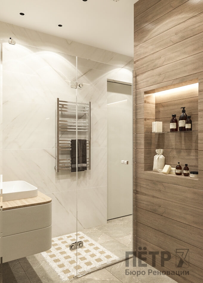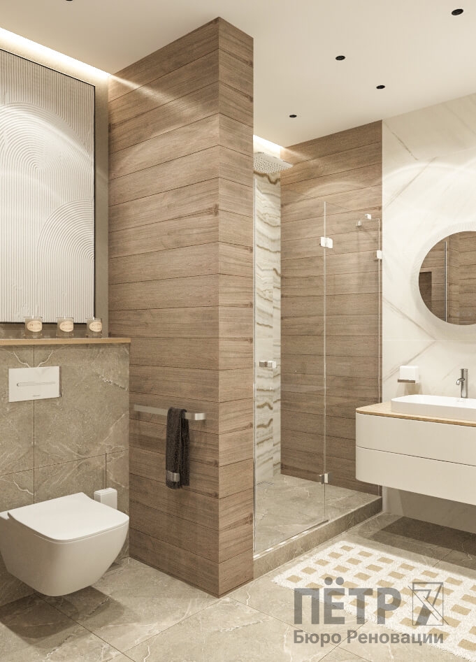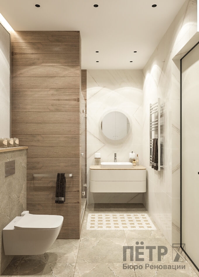 Бежевую базу мы усилили натуральными фактурами дерева, глянцевым керамогранитом и современным трековым освещением на магнитном шинопроводе. В результате интерьер получился уютным, гармоничным и визуально просторным, несмотря на компактную площадь квартиры.
