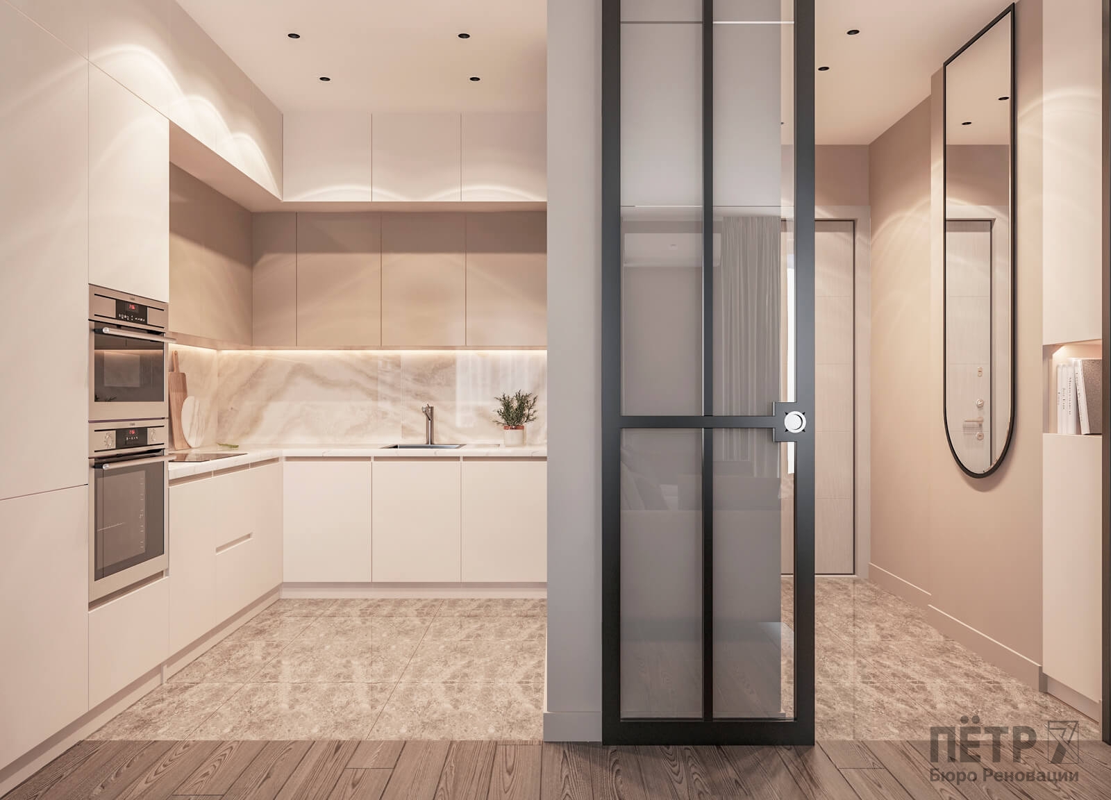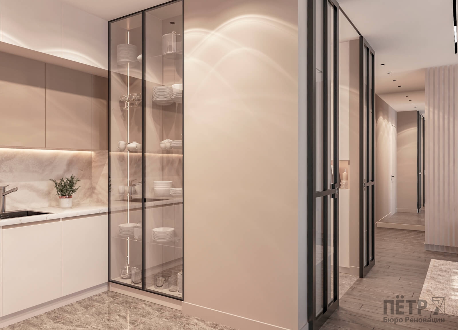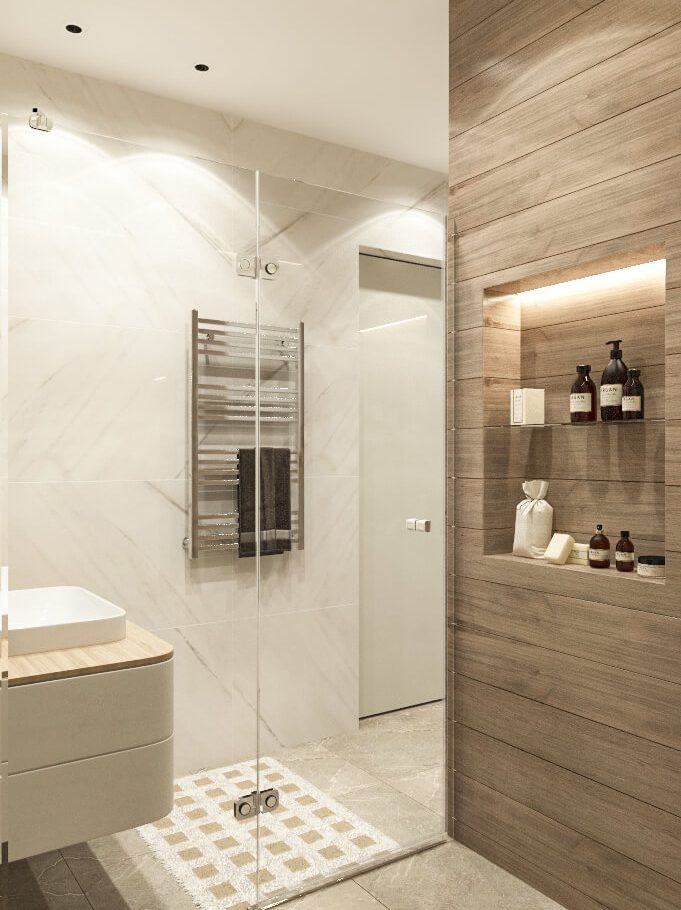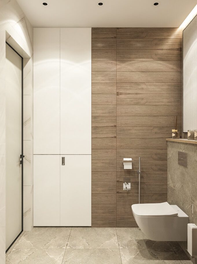 Бежевую базу мы усилили натуральными фактурами дерева, глянцевым керамогранитом и современным трековым освещением на магнитном шинопроводе. В результате интерьер получился уютным, гармоничным и визуально просторным, несмотря на компактную площадь квартиры.