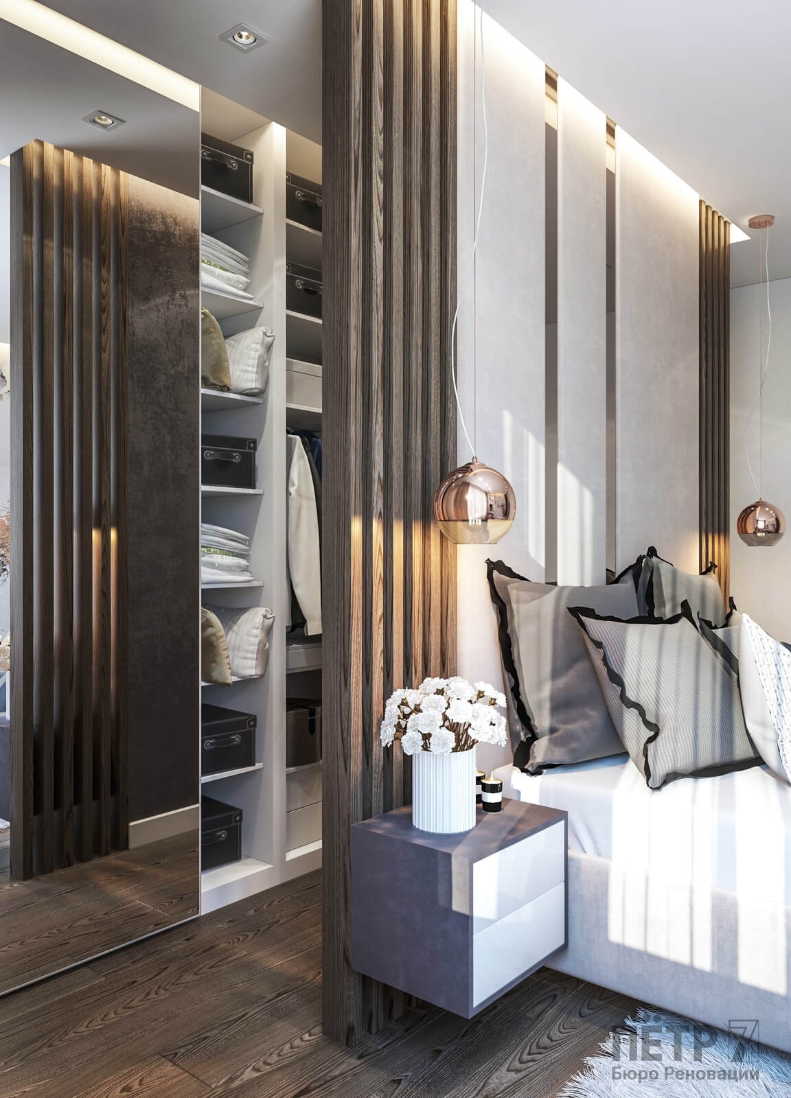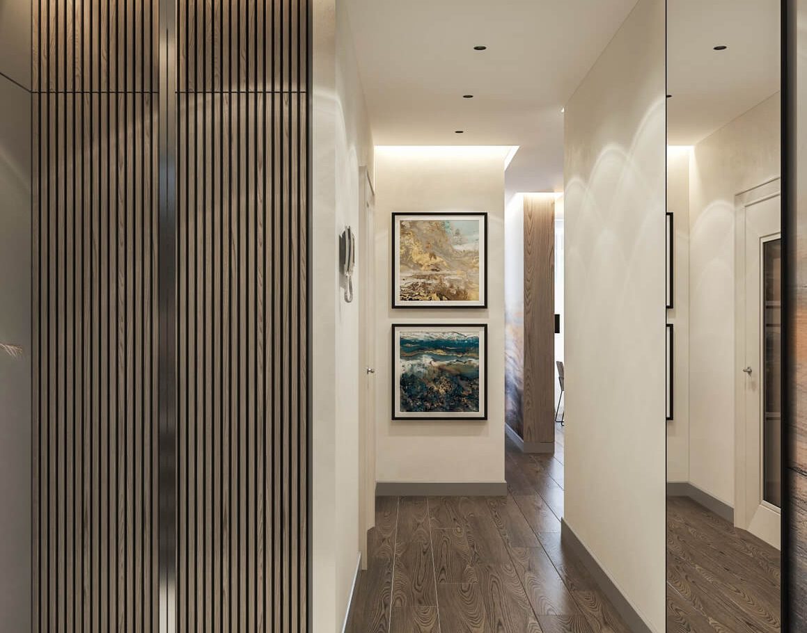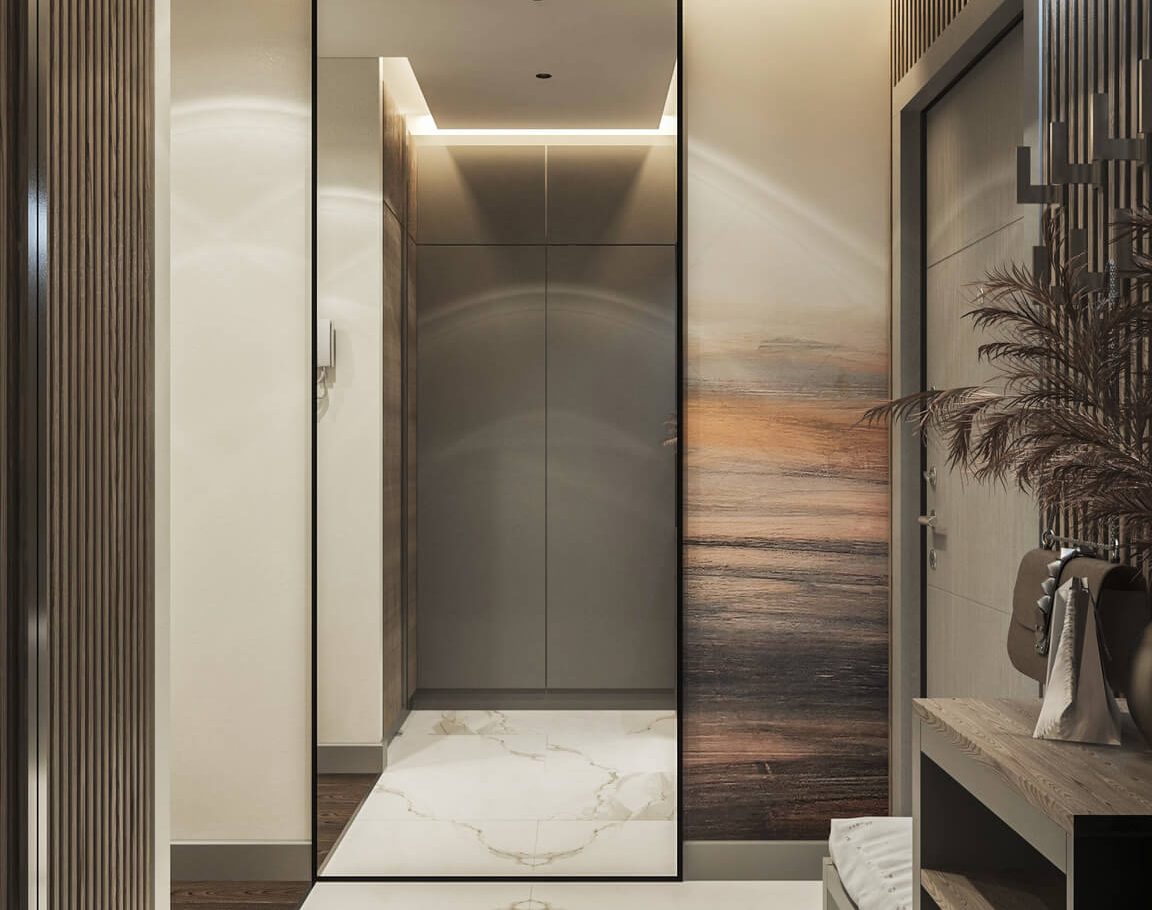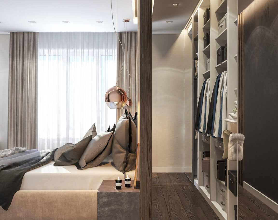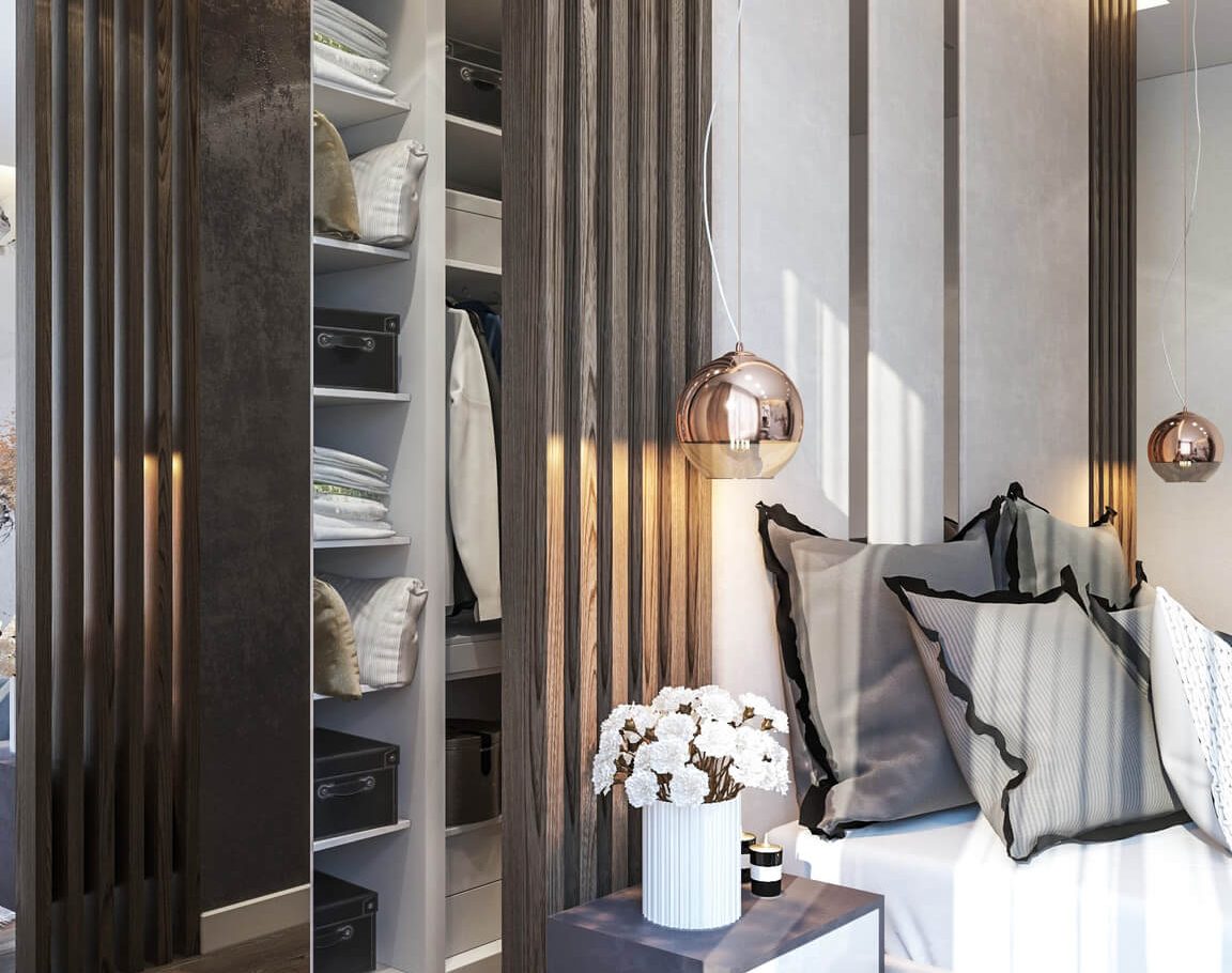 В спальне нам удалось грамотно организовать компактную гардеробную, не перегружая комнату. Интерьер получился лаконичным, функциональным и продуманным до деталей — каждый квадратный метр работает эффективно и соответствует запросам владельцев.