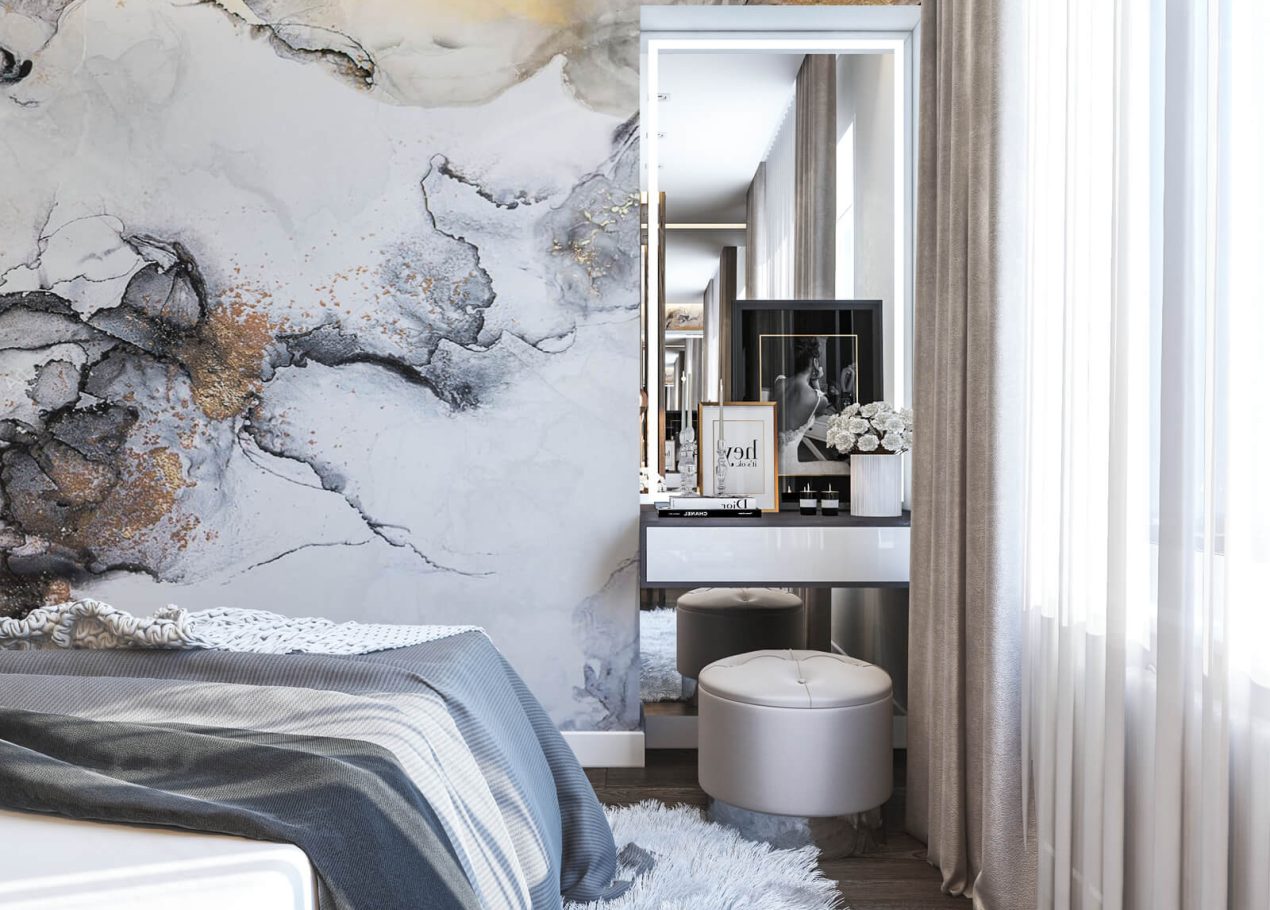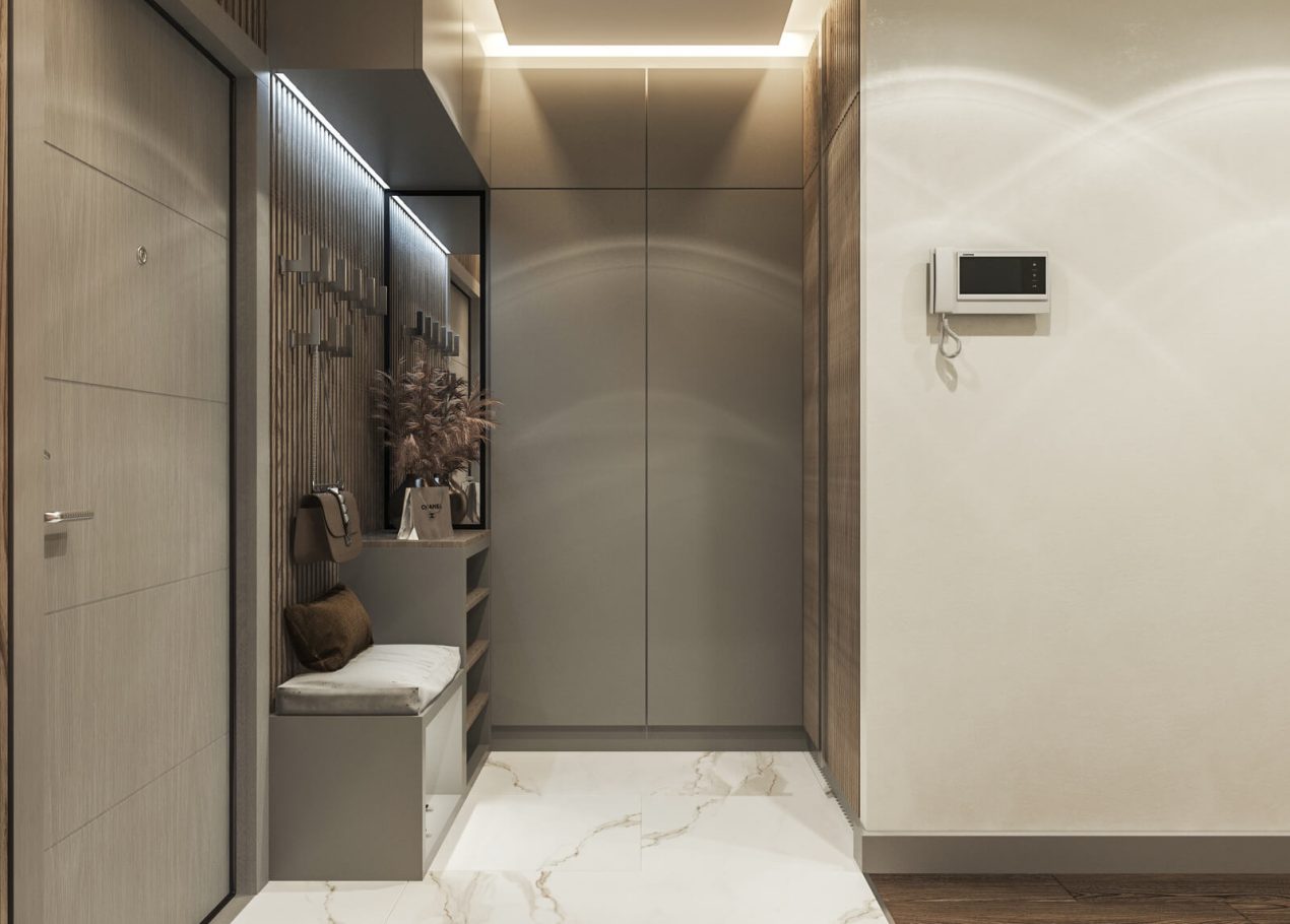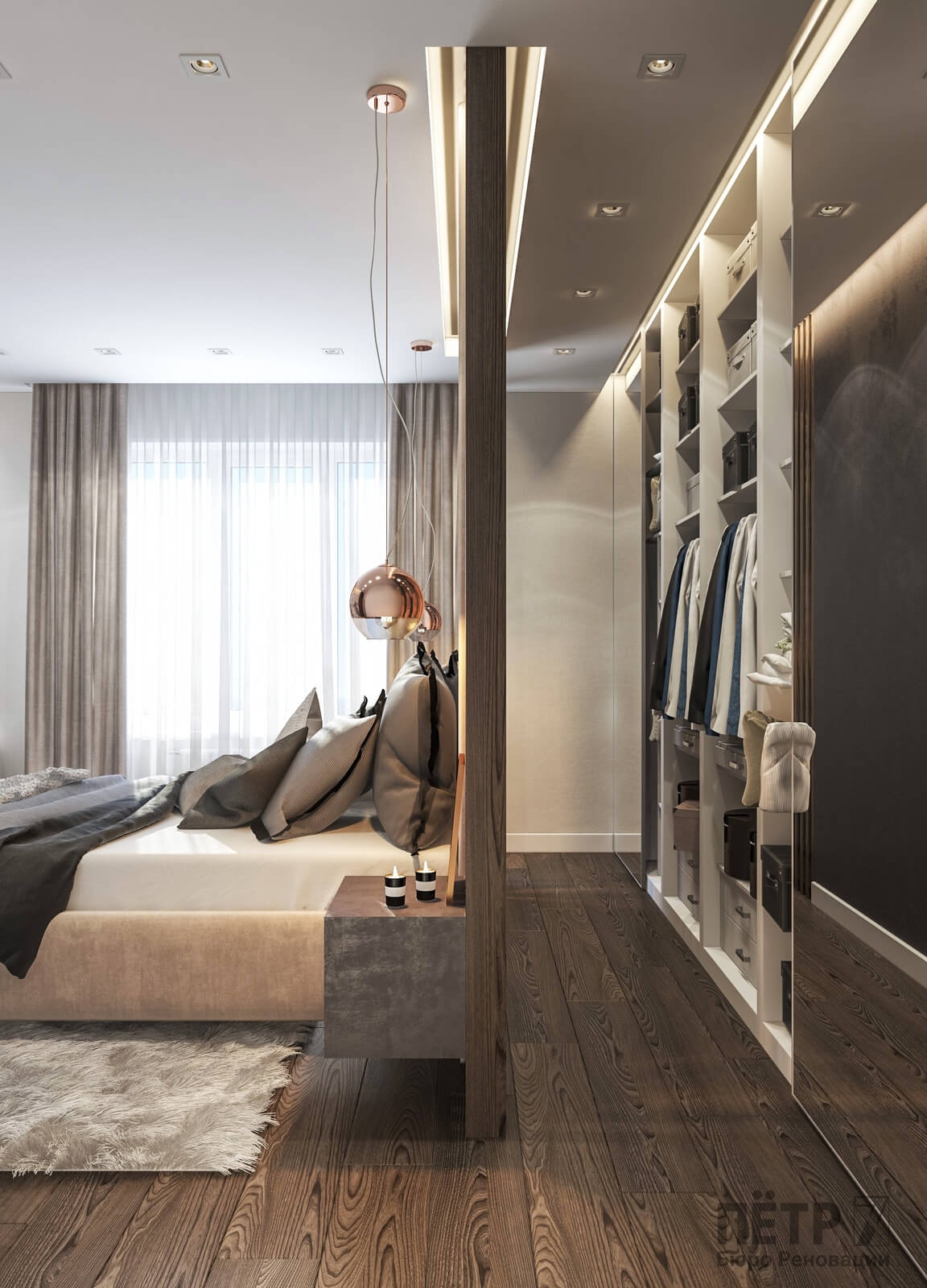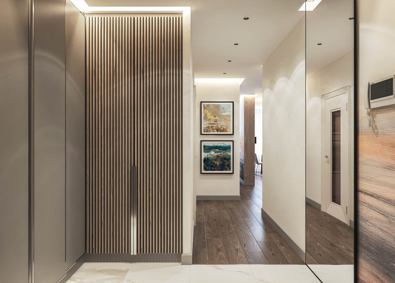 В спальне нам удалось грамотно организовать компактную гардеробную, не перегружая комнату. Интерьер получился лаконичным, функциональным и продуманным до деталей — каждый квадратный метр работает эффективно и соответствует запросам владельцев.