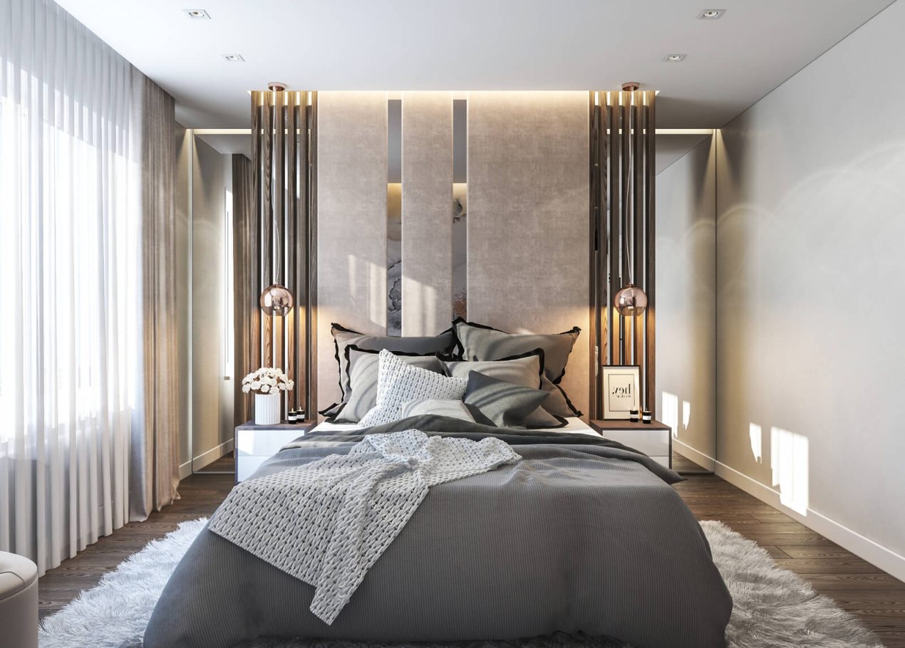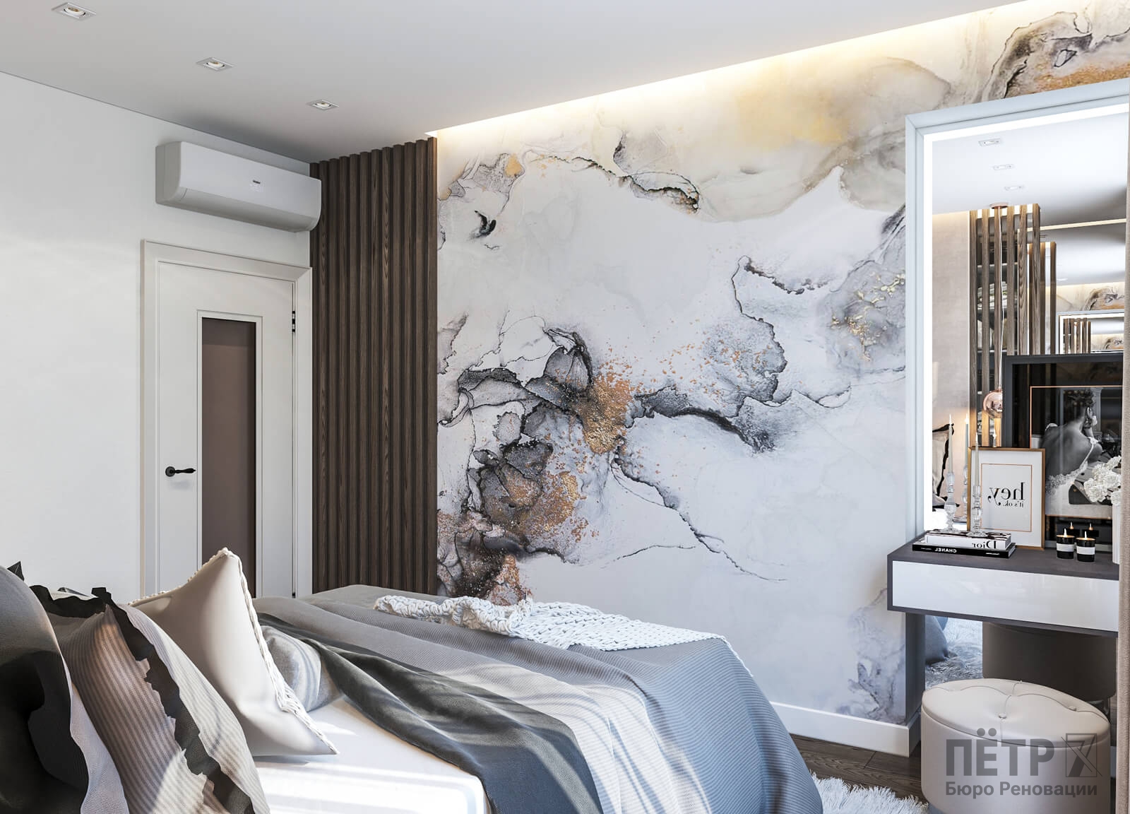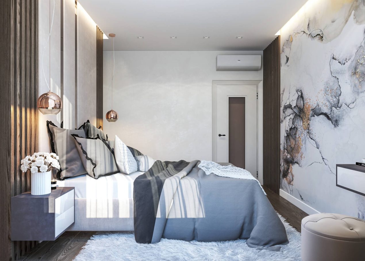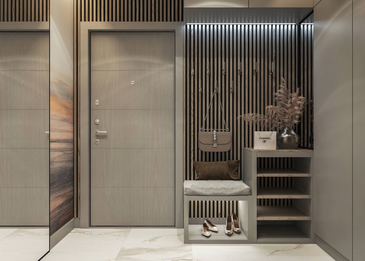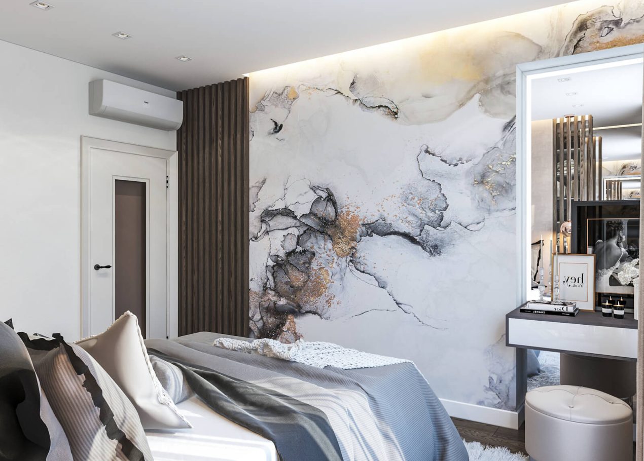 В спальне нам удалось грамотно организовать компактную гардеробную, не перегружая комнату. Интерьер получился лаконичным, функциональным и продуманным до деталей — каждый квадратный метр работает эффективно и соответствует запросам владельцев.