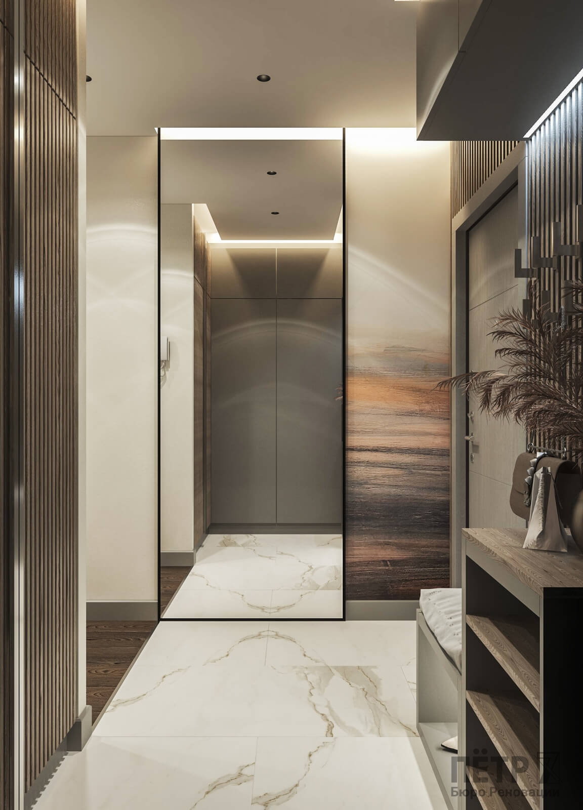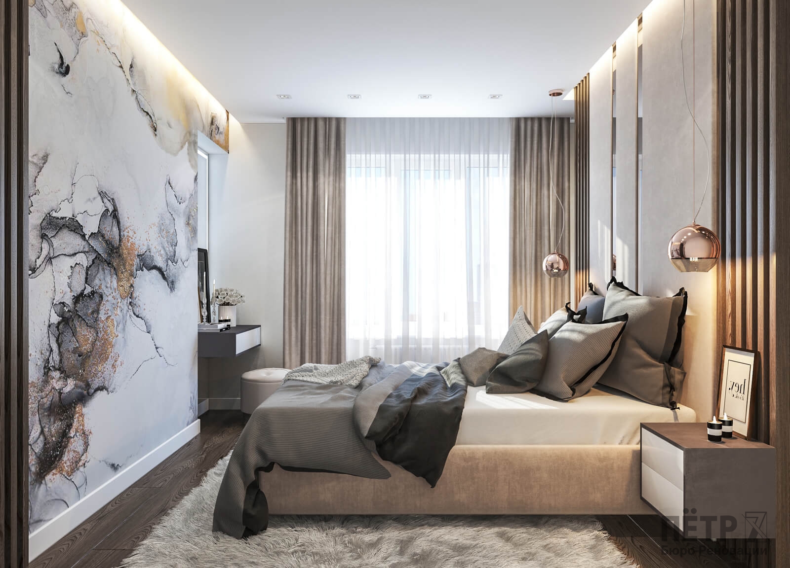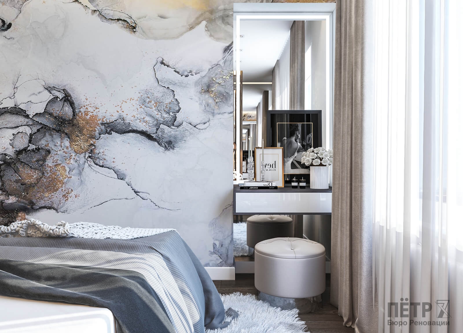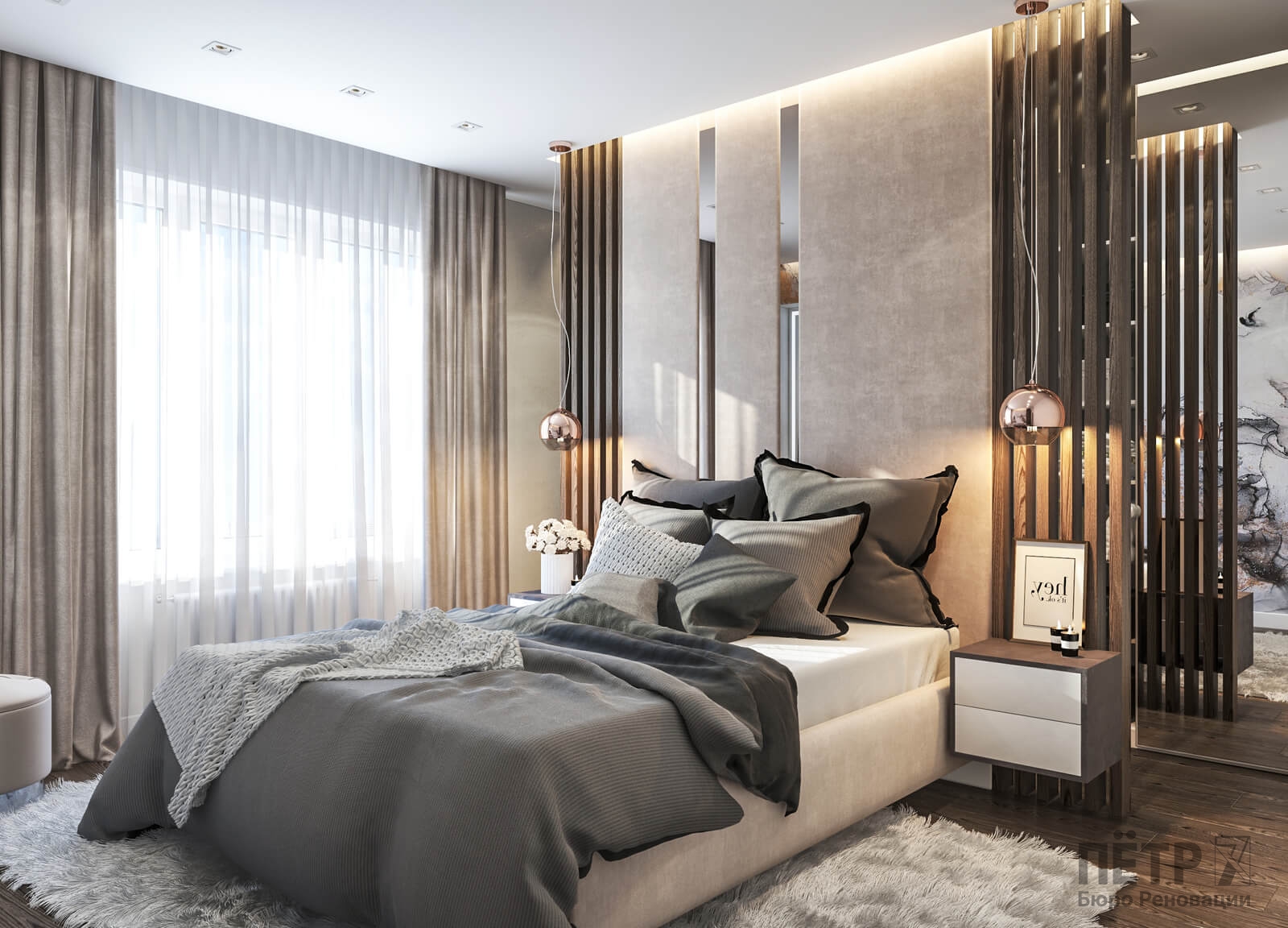 В спальне нам удалось грамотно организовать компактную гардеробную, не перегружая комнату. Интерьер получился лаконичным, функциональным и продуманным до деталей — каждый квадратный метр работает эффективно и соответствует запросам владельцев.