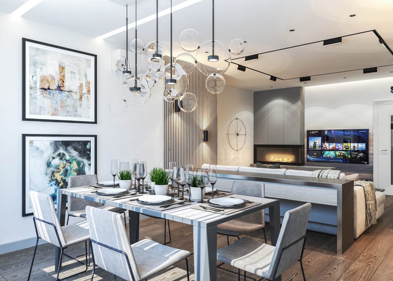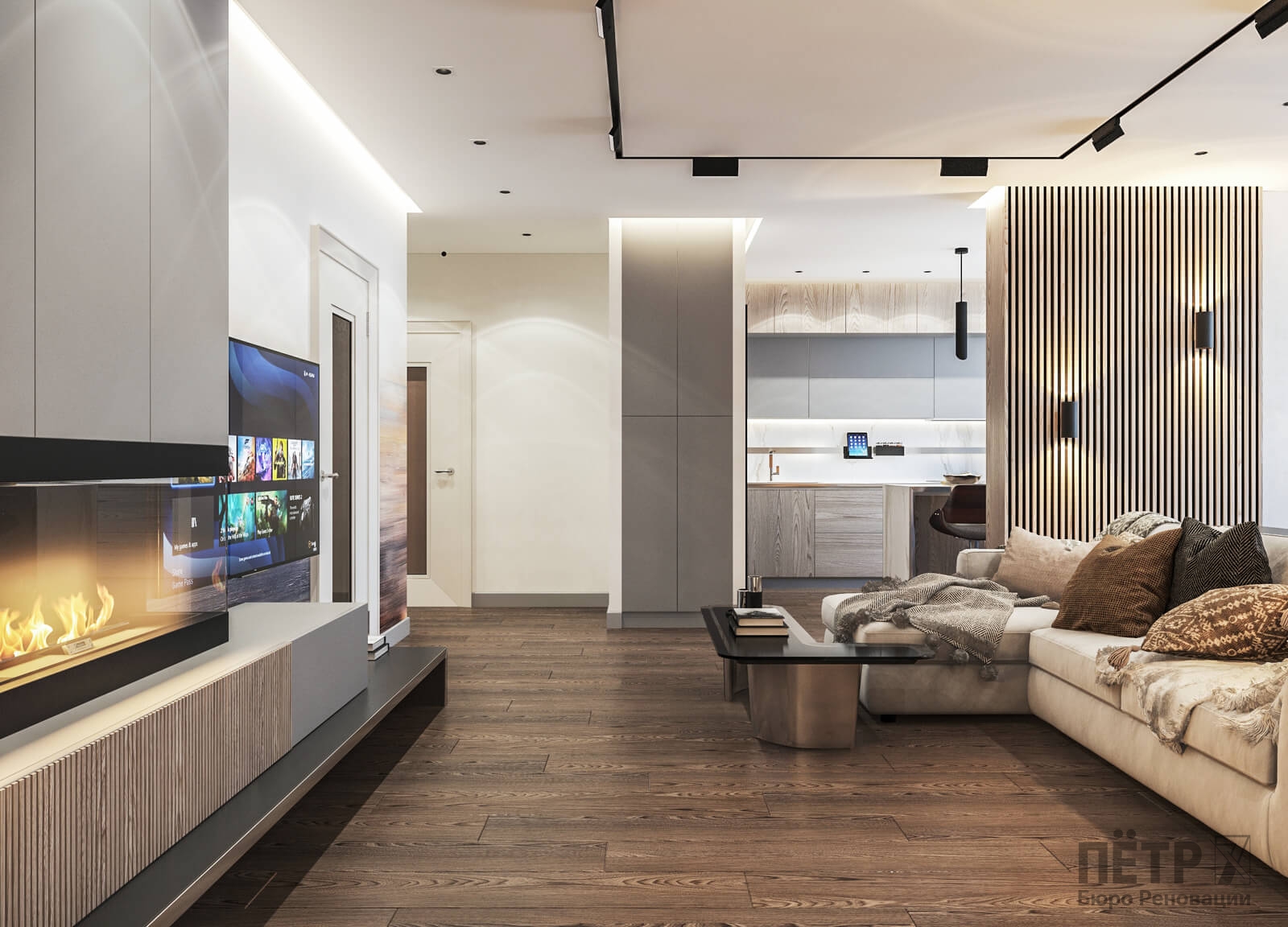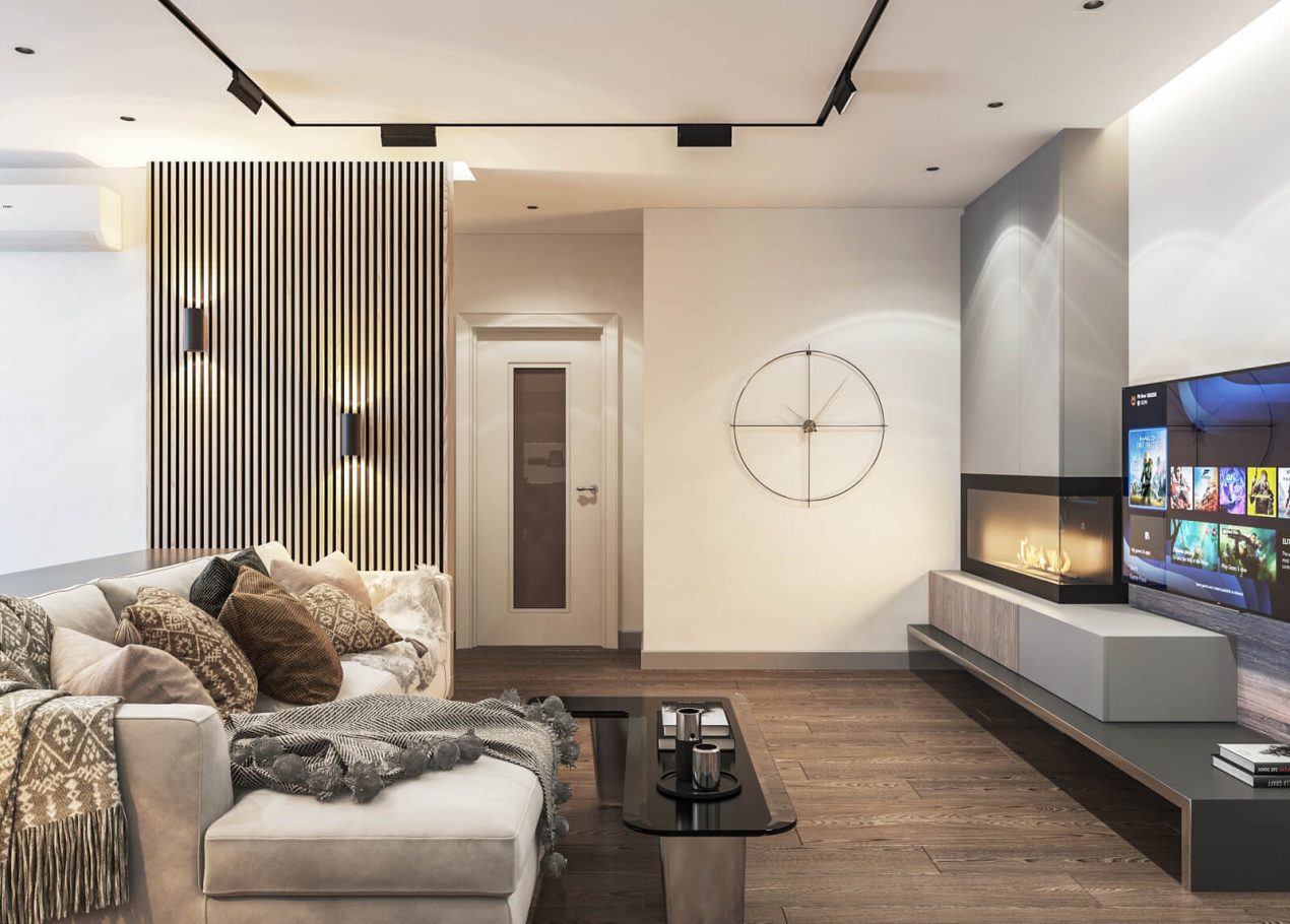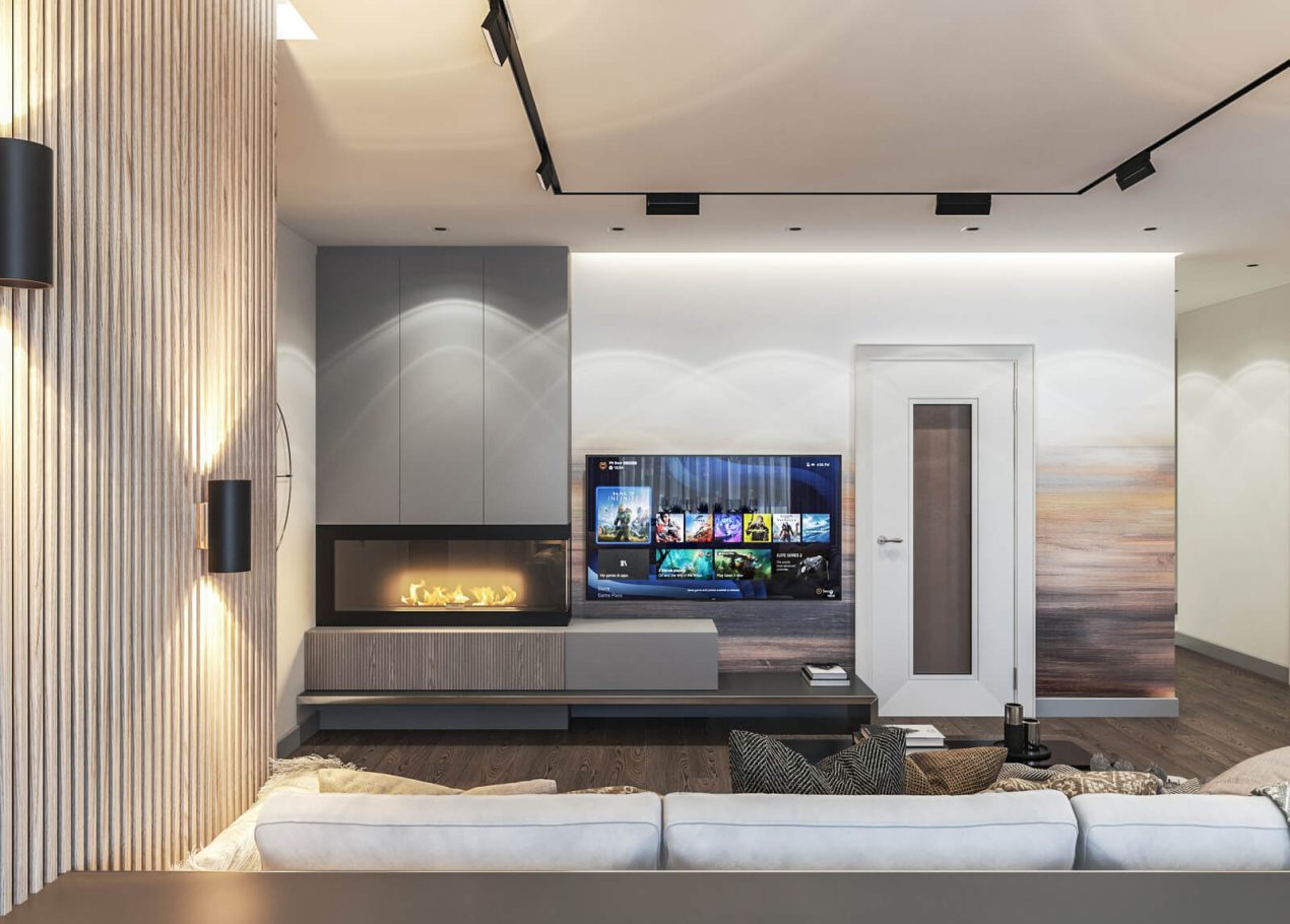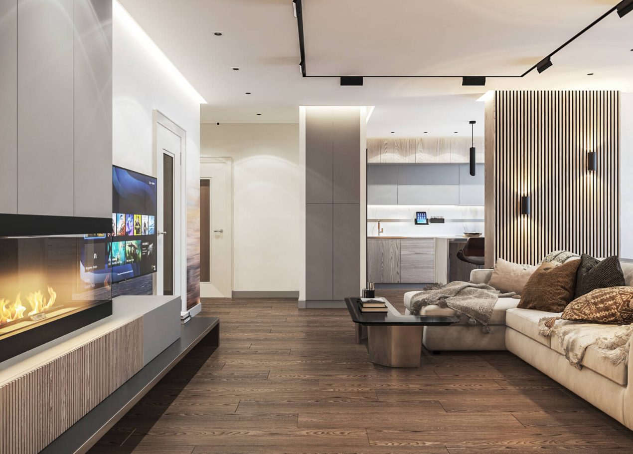 В этом проекте мы сделали ставку на сдержанность и рациональность планировки. Открытое пространство студии разделили на логичные зоны: входную группу, кухню, обеденную часть и гостиную с ТВ и биокамином — при этом сохранили ощущение целостности.