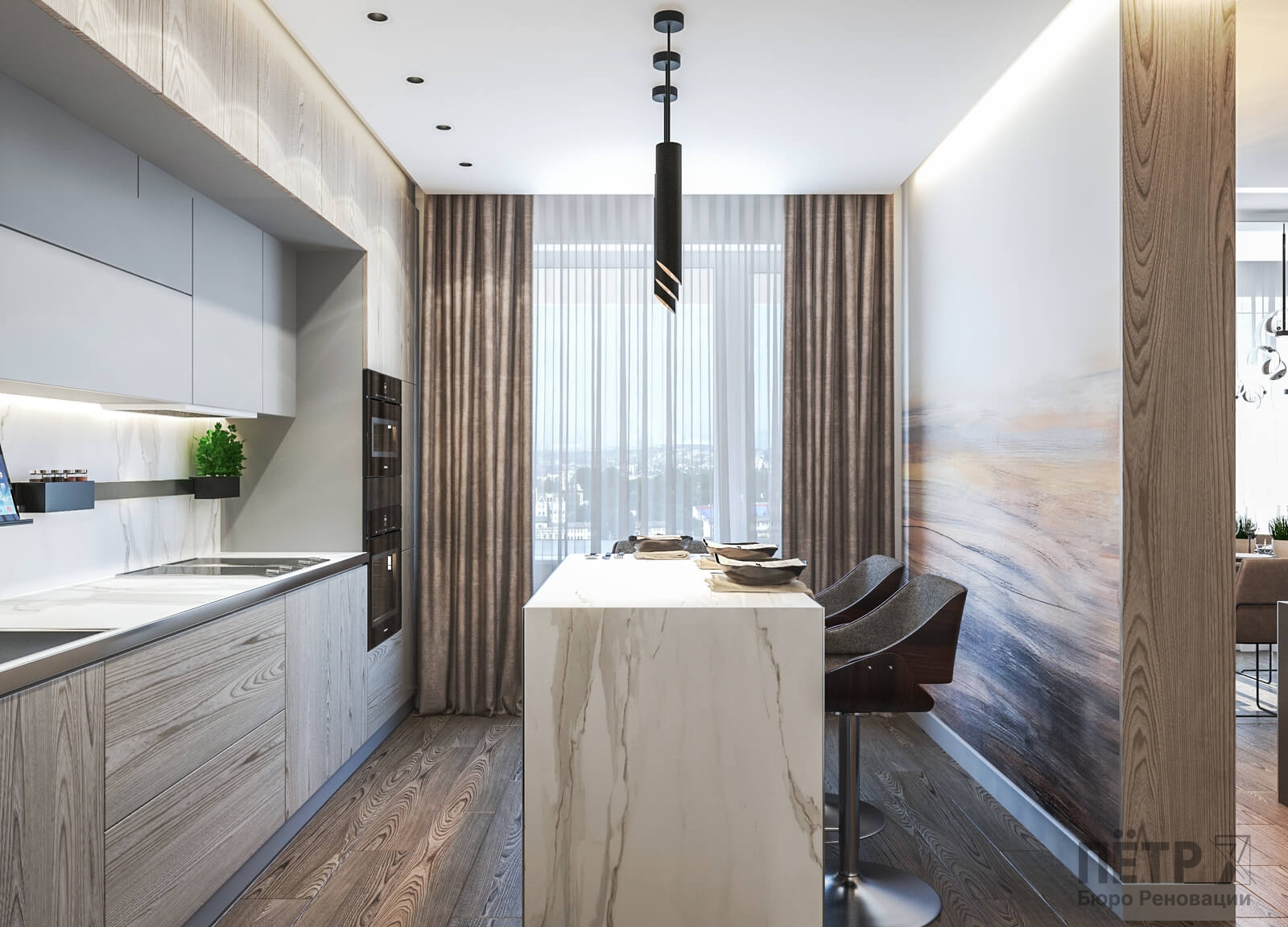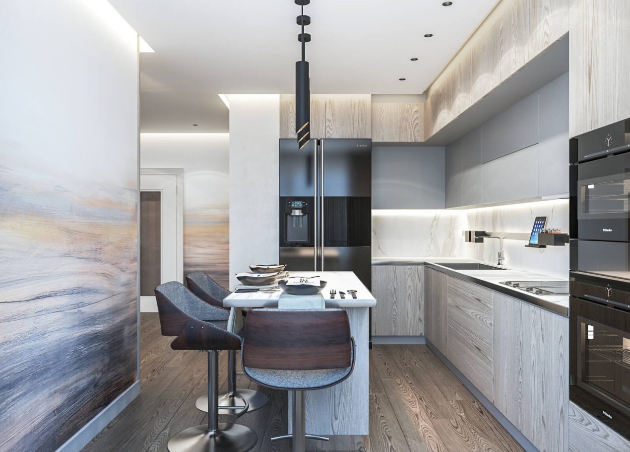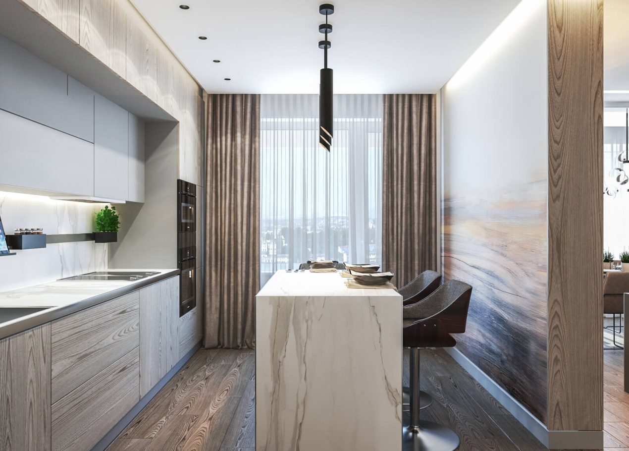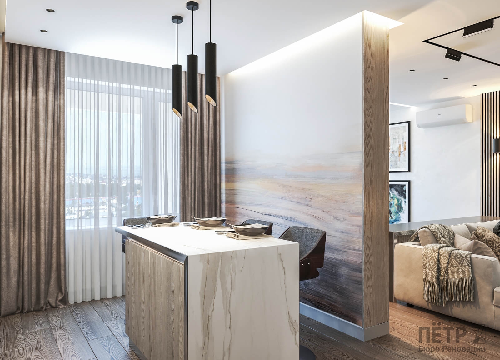 В этом проекте мы сделали ставку на сдержанность и рациональность планировки. Открытое пространство студии разделили на логичные зоны: входную группу, кухню, обеденную часть и гостиную с ТВ и биокамином — при этом сохранили ощущение целостности.