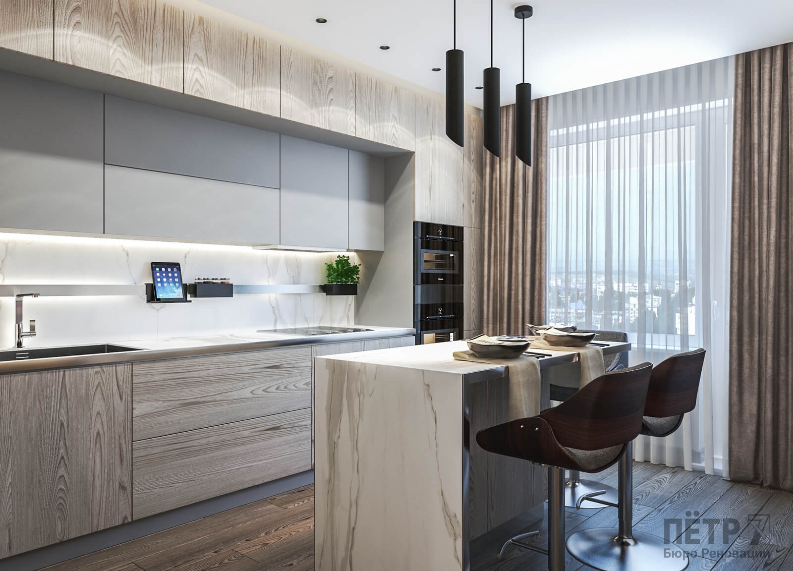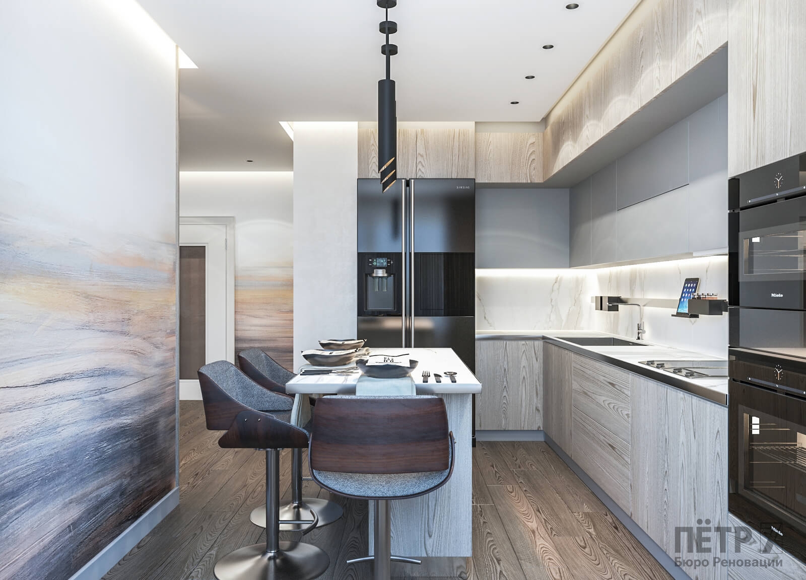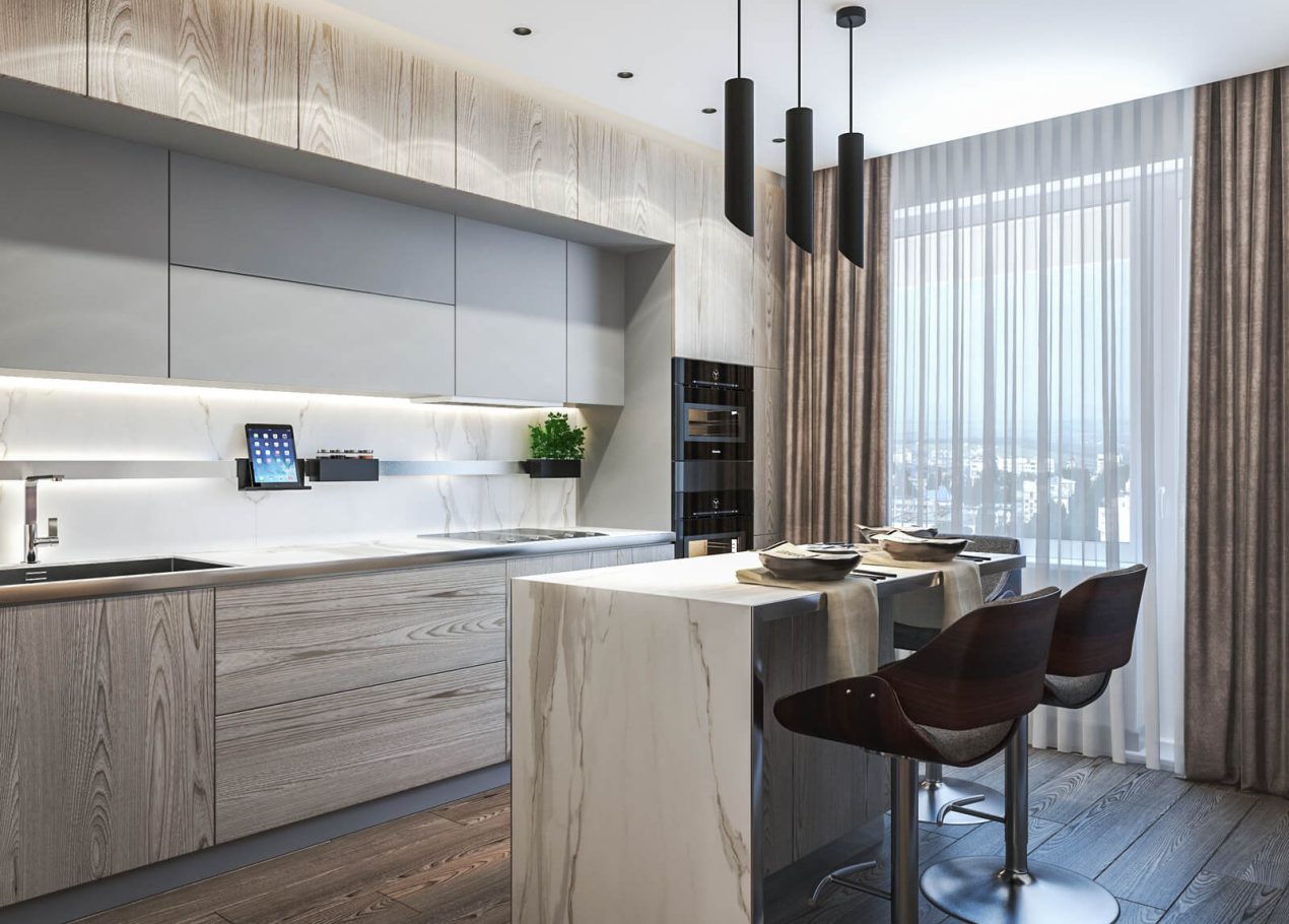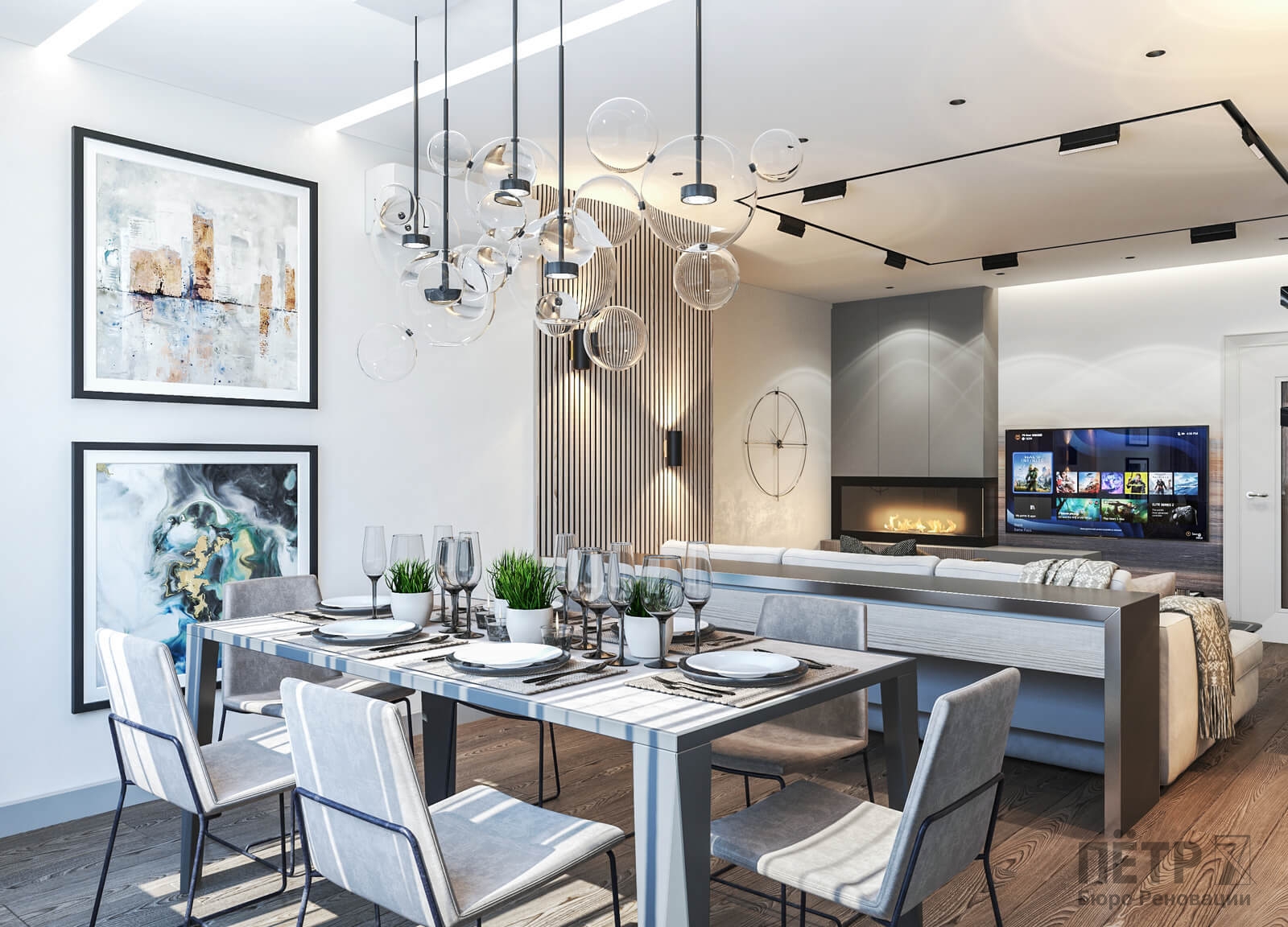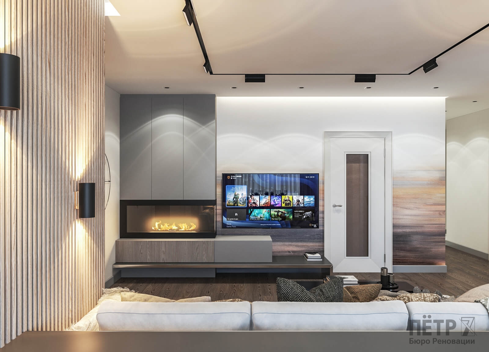 В этом проекте мы сделали ставку на сдержанность и рациональность планировки. Открытое пространство студии разделили на логичные зоны: входную группу, кухню, обеденную часть и гостиную с ТВ и биокамином — при этом сохранили ощущение целостности.