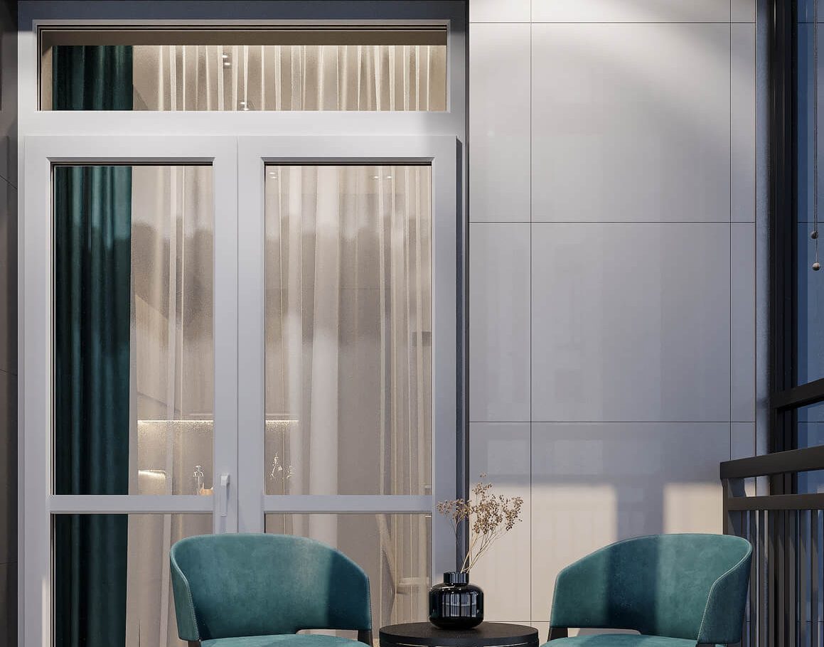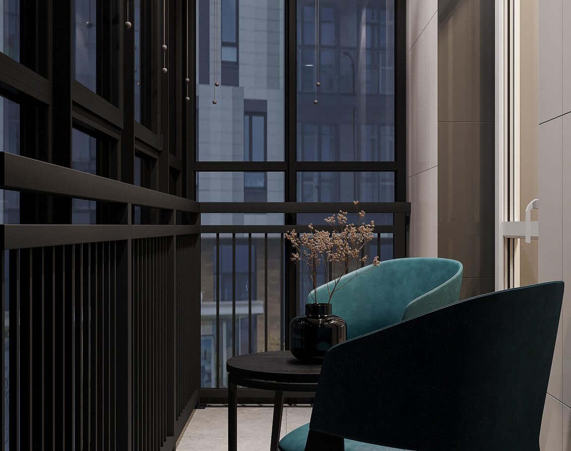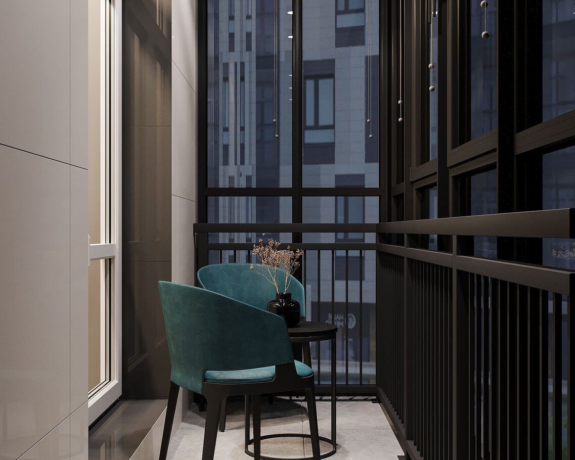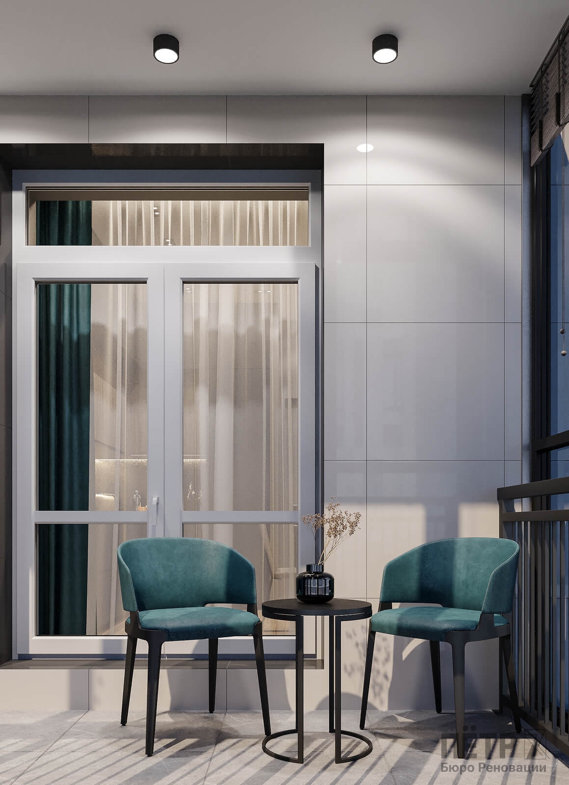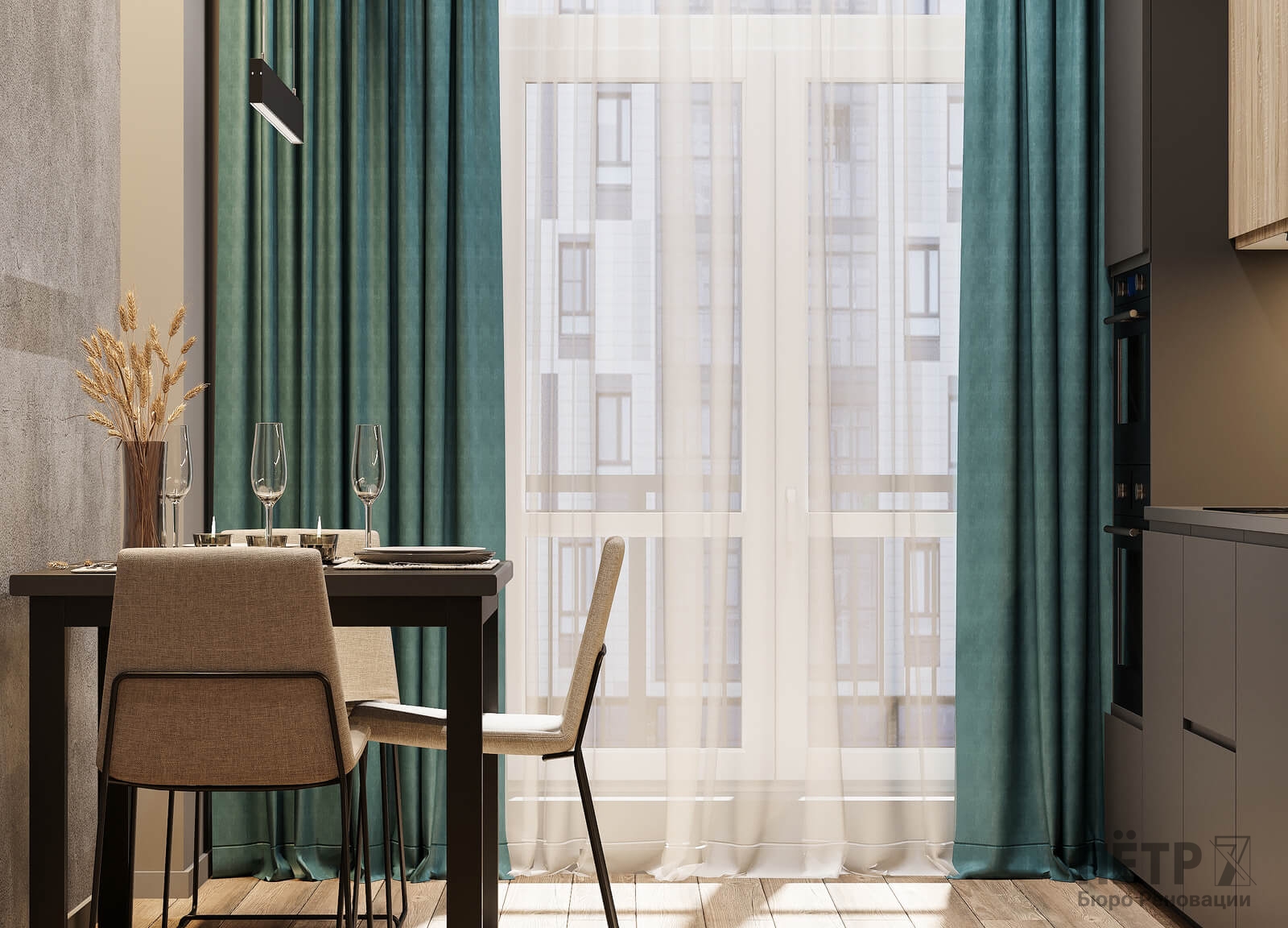 Характер пространству придали цветовые акценты. В спальне и прилегающем санузле мы использовали глубокий насыщенный зелёный, а в кухне и на балконе добавили бирюзовые оттенки в текстиле. Благодаря такому приёму интерьер получился живым, динамичным и при этом гармоничным.