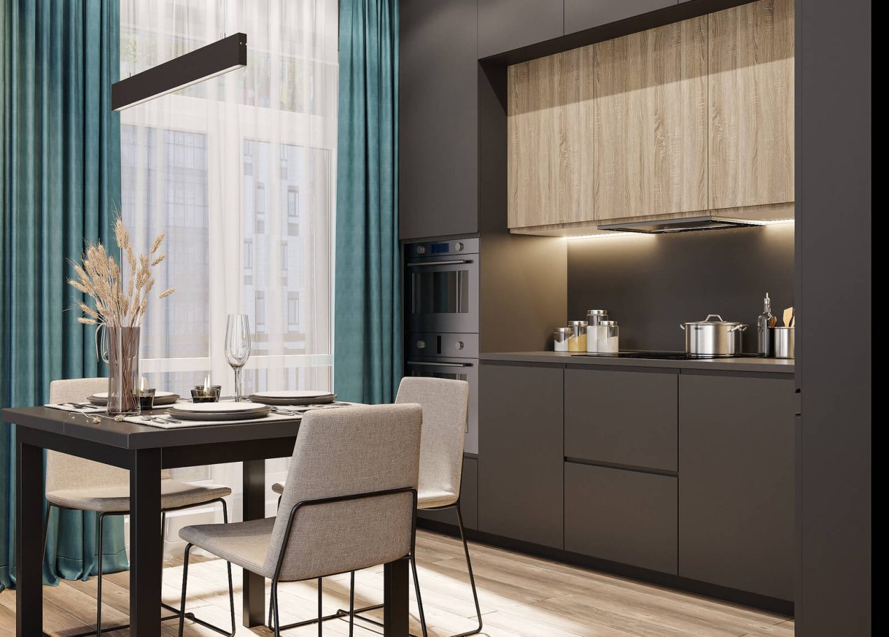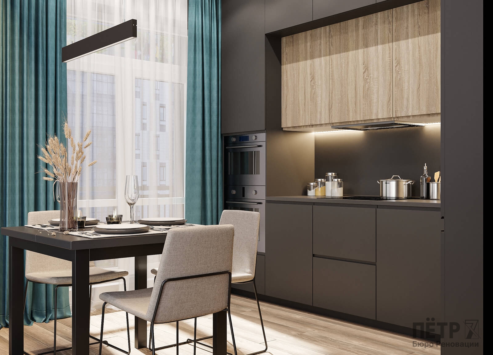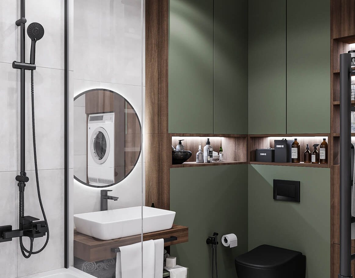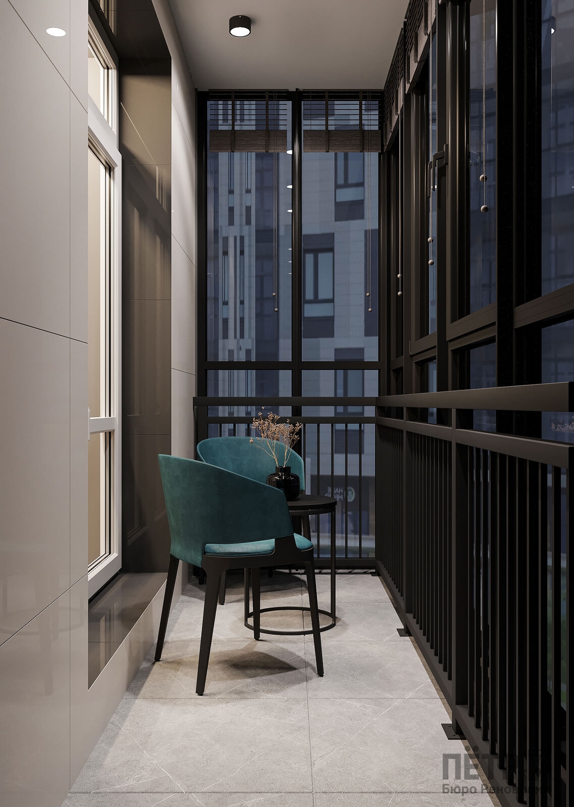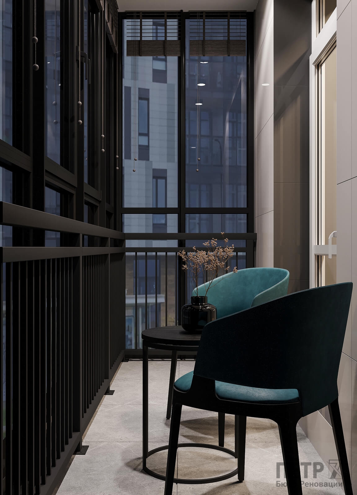Характер пространству придали цветовые акценты. В спальне и прилегающем санузле мы использовали глубокий насыщенный зелёный, а в кухне и на балконе добавили бирюзовые оттенки в текстиле. Благодаря такому приёму интерьер получился живым, динамичным и при этом гармоничным.