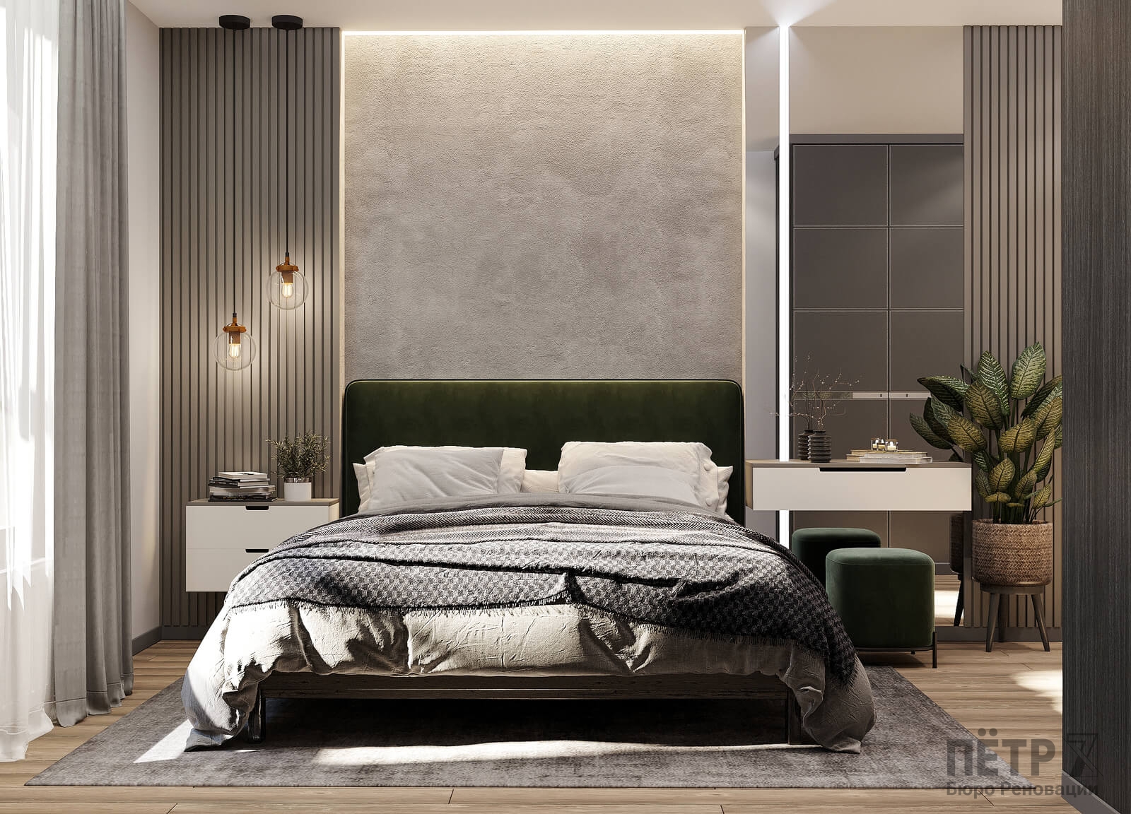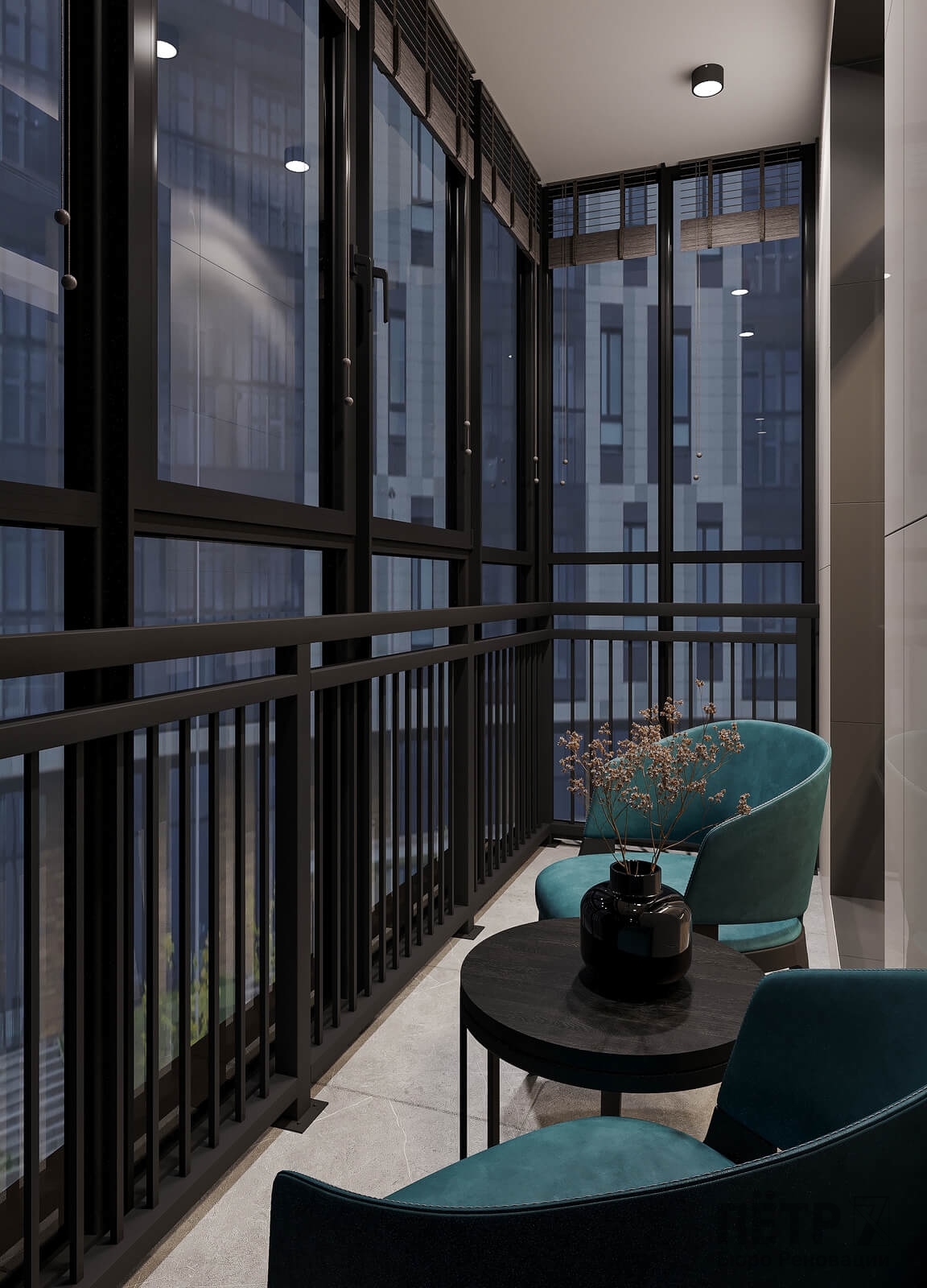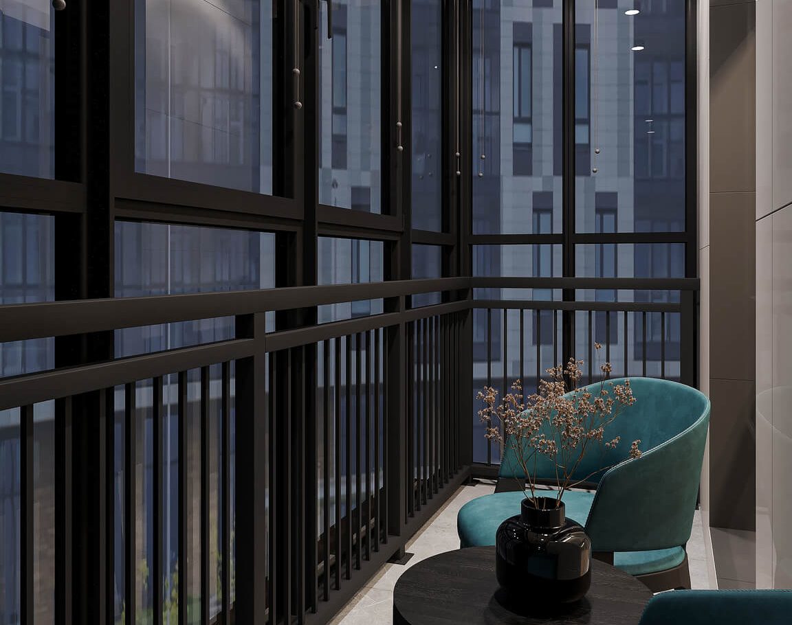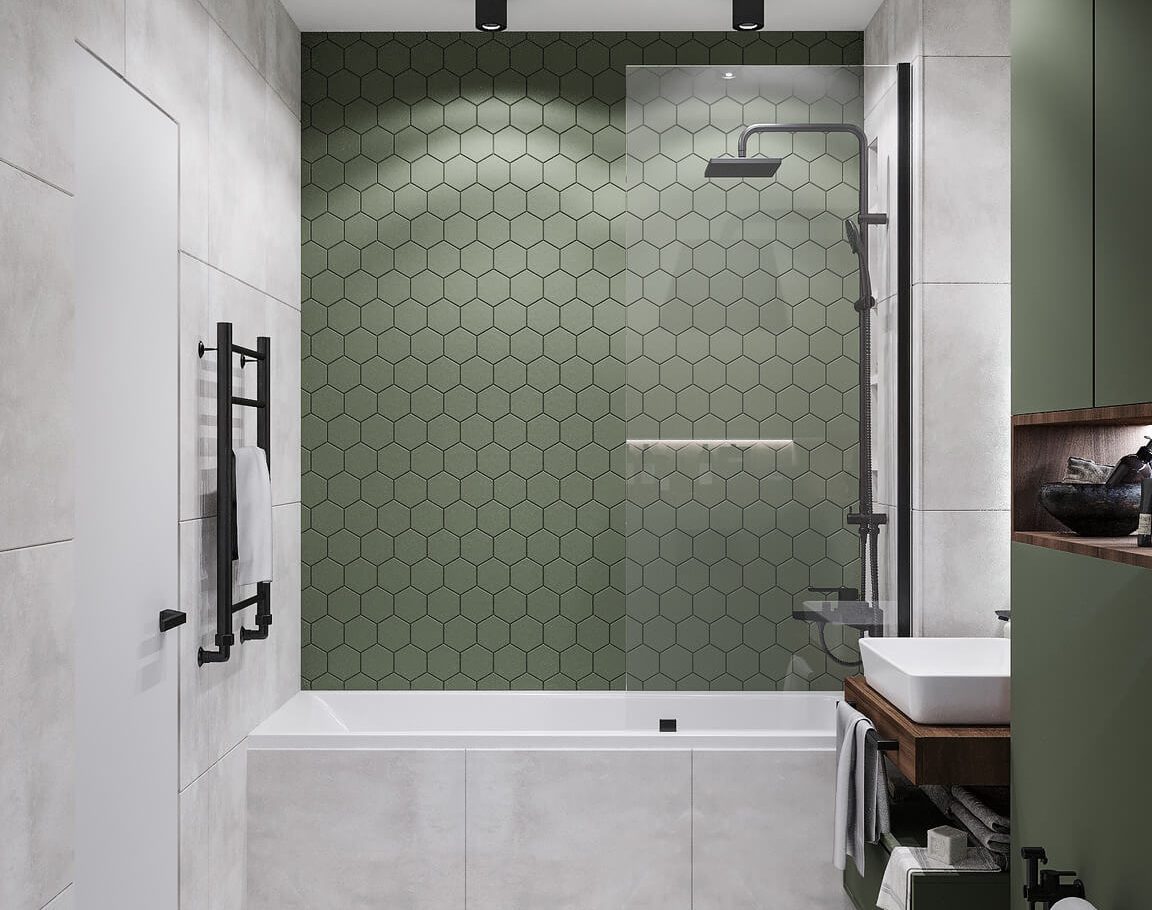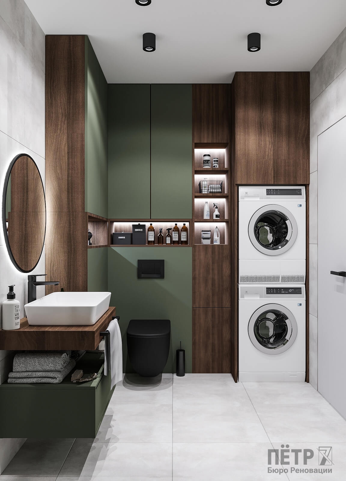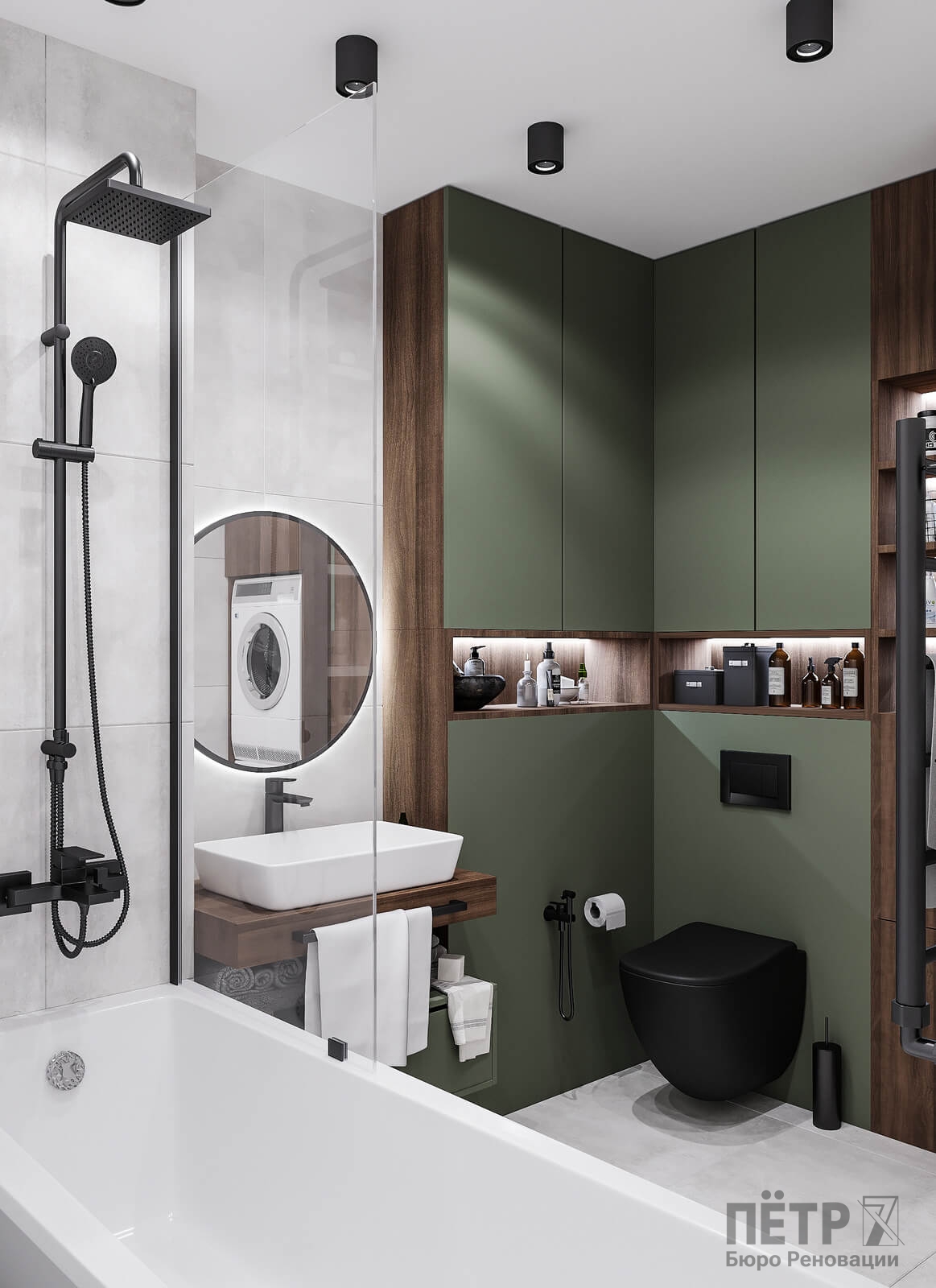 Характер пространству придали цветовые акценты. В спальне и прилегающем санузле мы использовали глубокий насыщенный зелёный, а в кухне и на балконе добавили бирюзовые оттенки в текстиле. Благодаря такому приёму интерьер получился живым, динамичным и при этом гармоничным.
