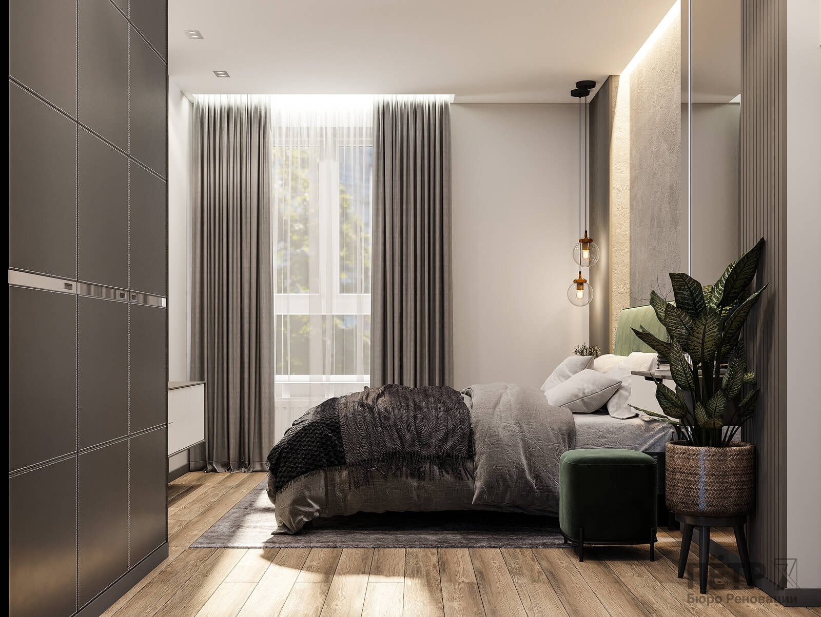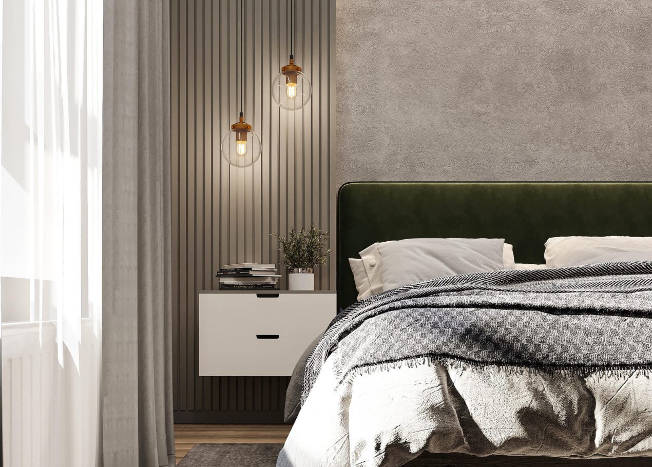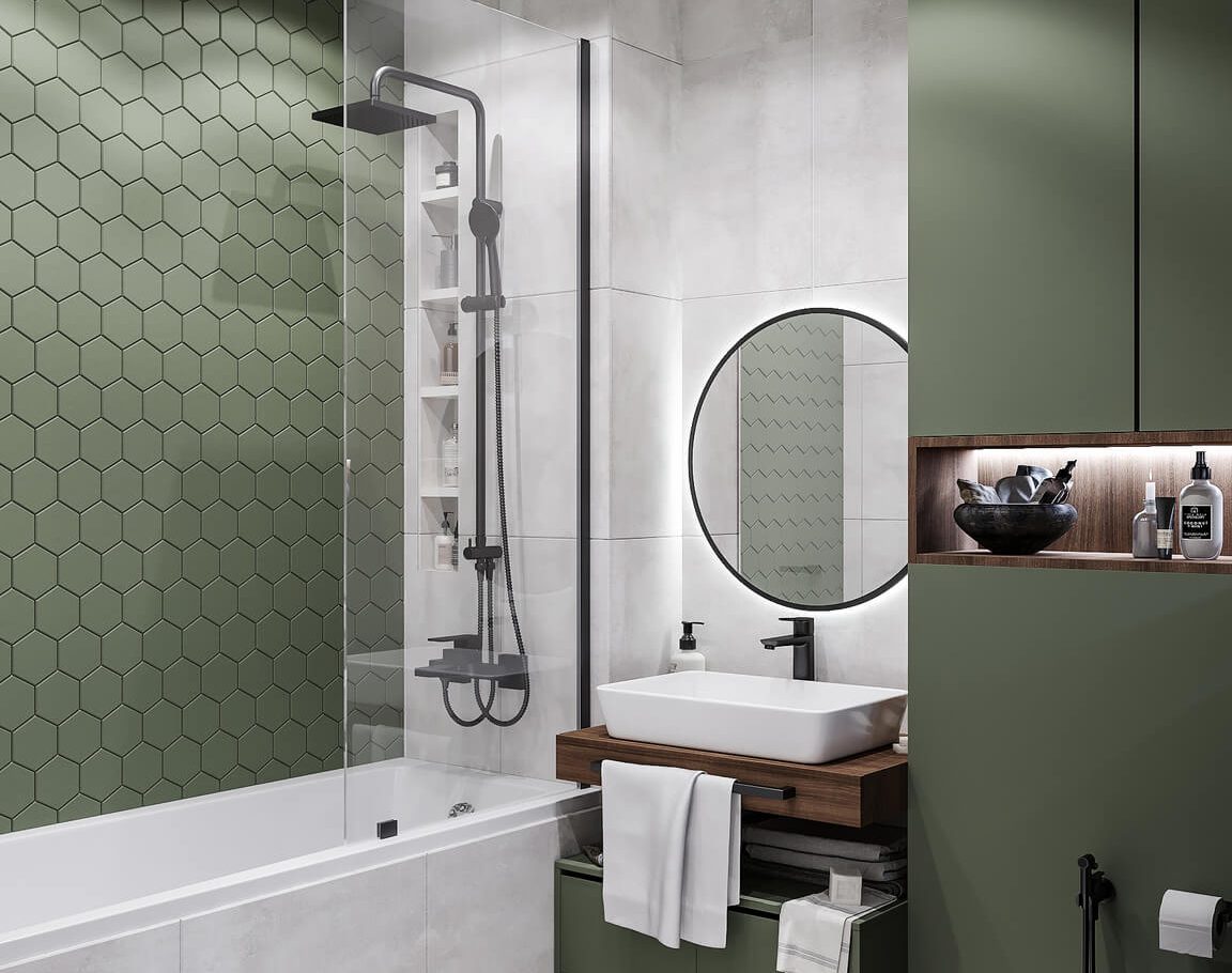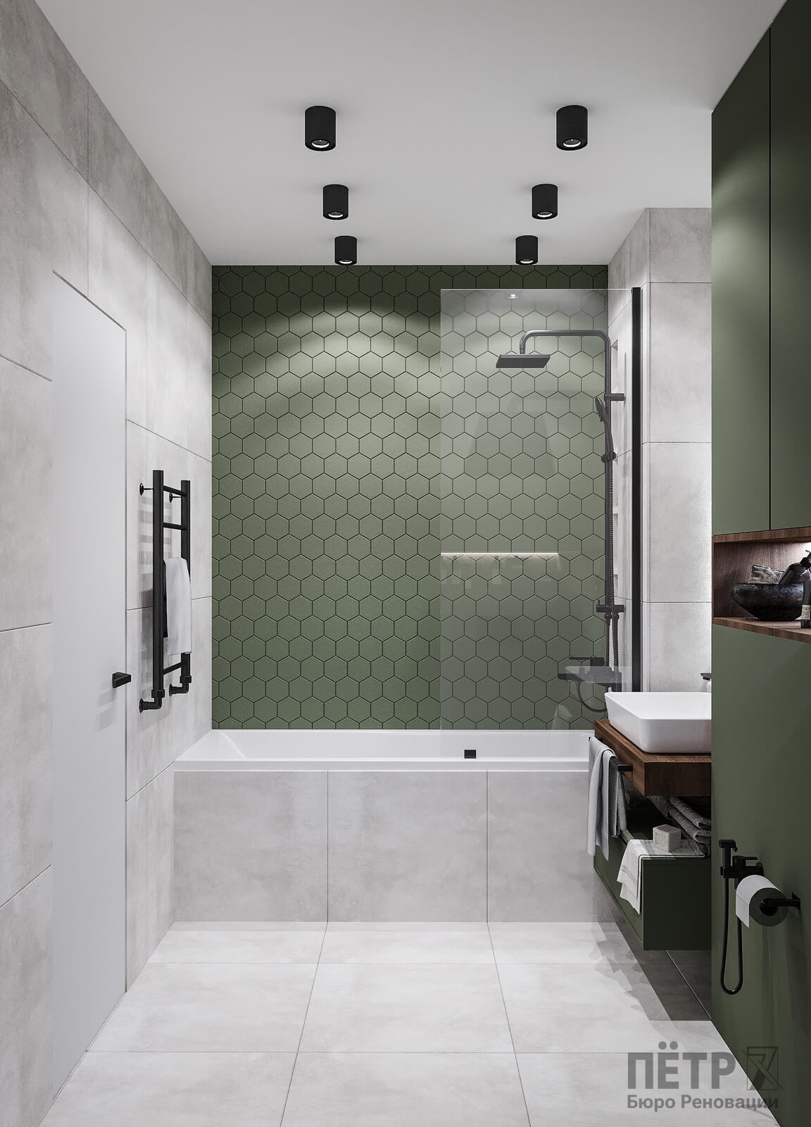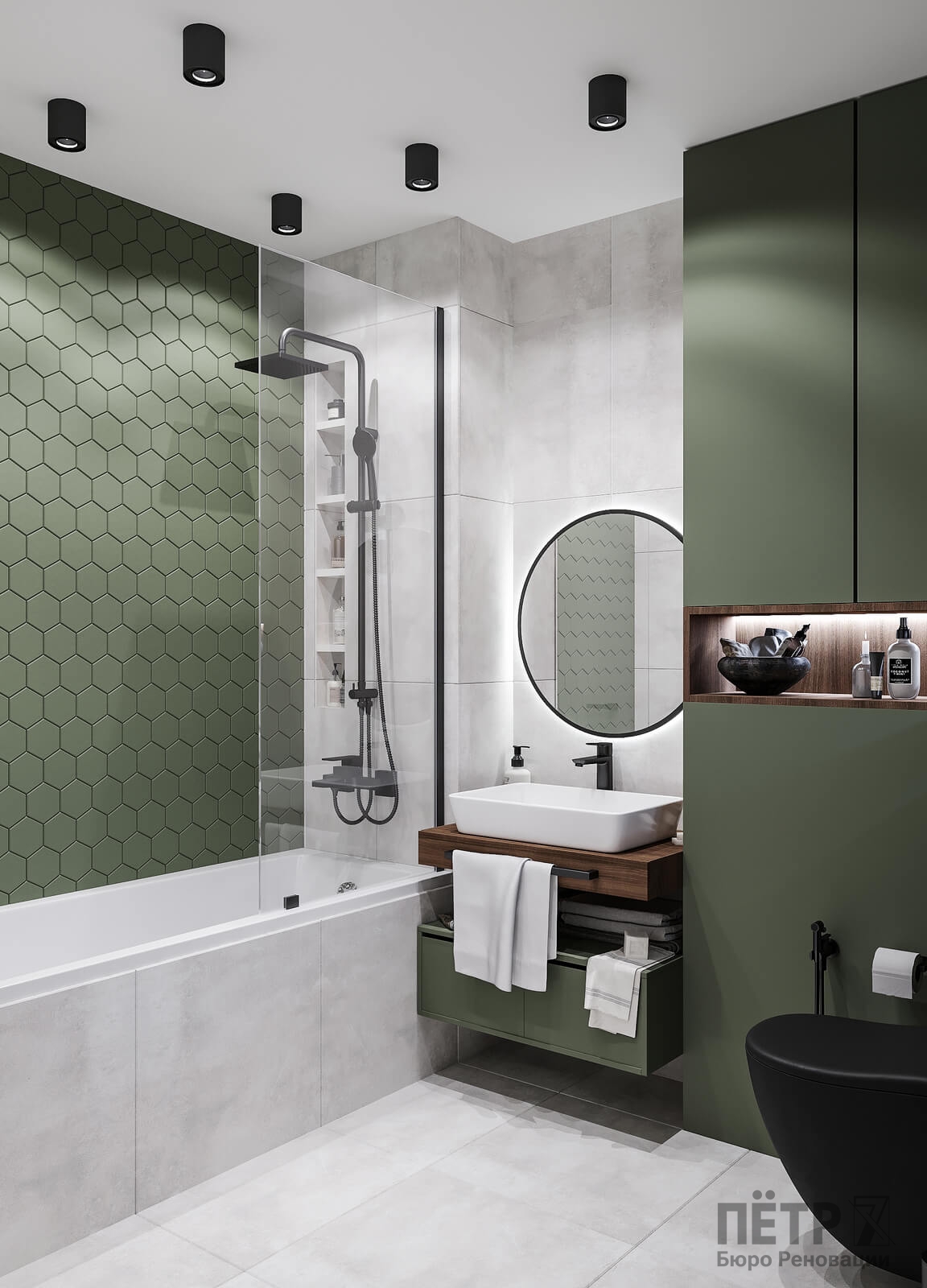 Характер пространству придали цветовые акценты. В спальне и прилегающем санузле мы использовали глубокий насыщенный зелёный, а в кухне и на балконе добавили бирюзовые оттенки в текстиле. Благодаря такому приёму интерьер получился живым, динамичным и при этом гармоничным.