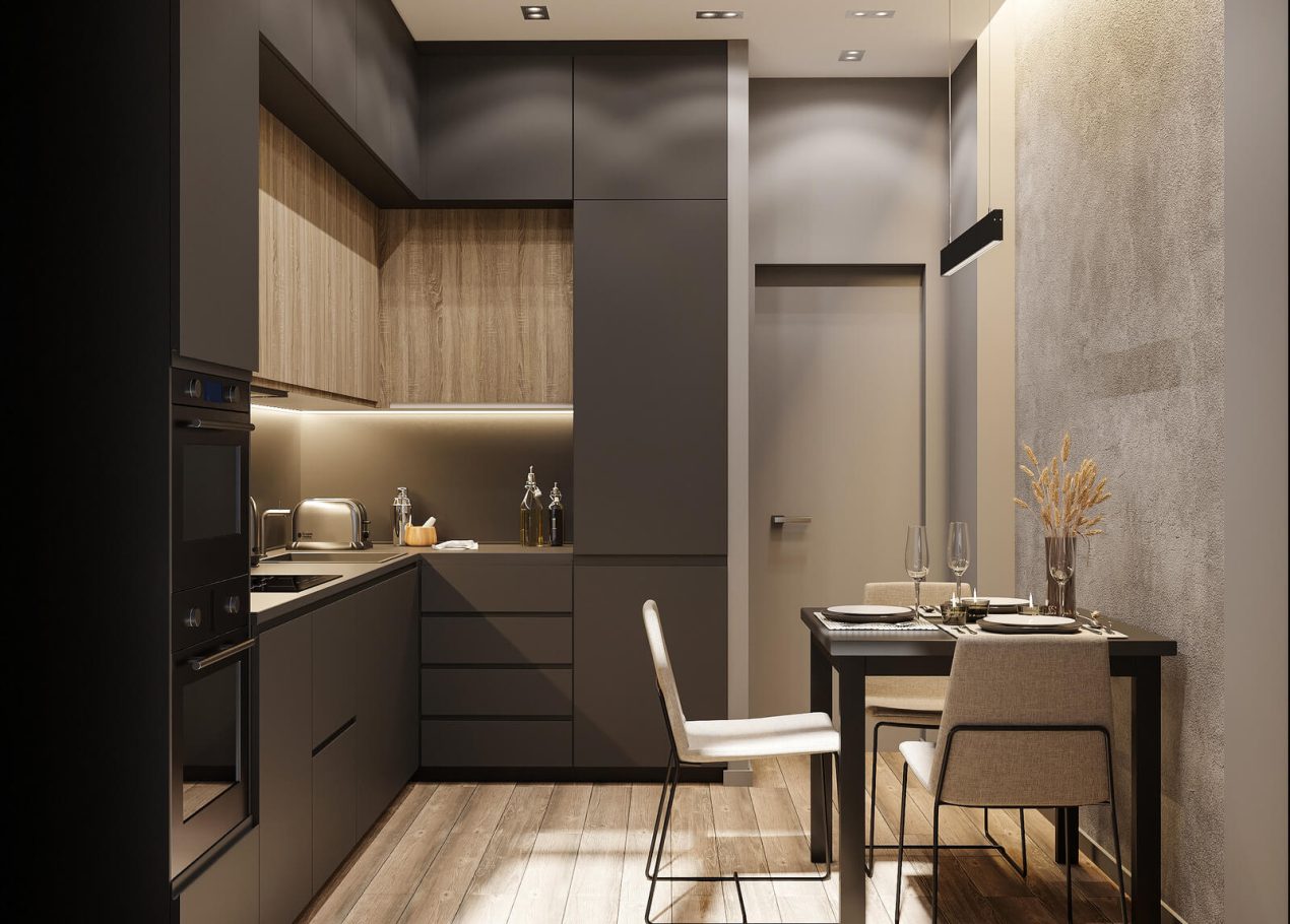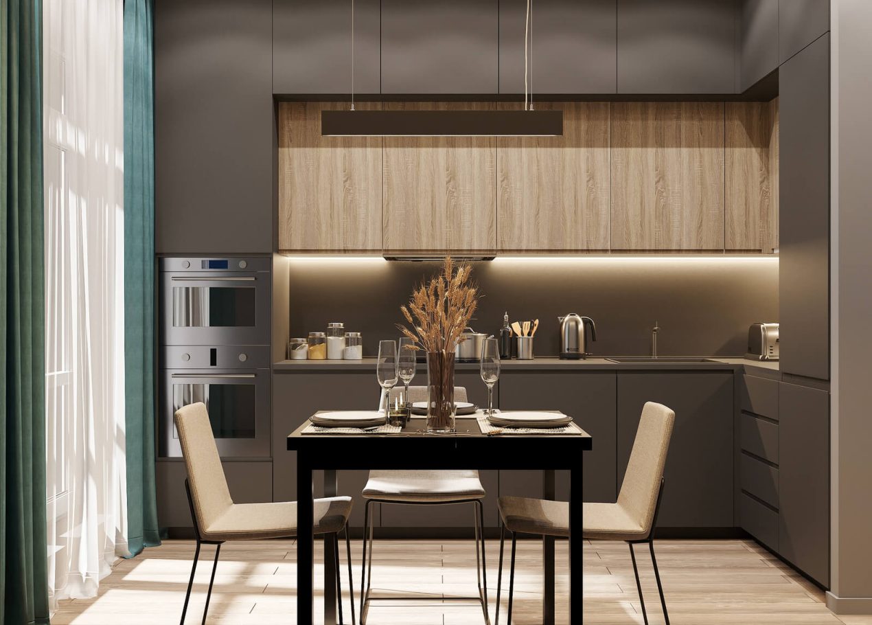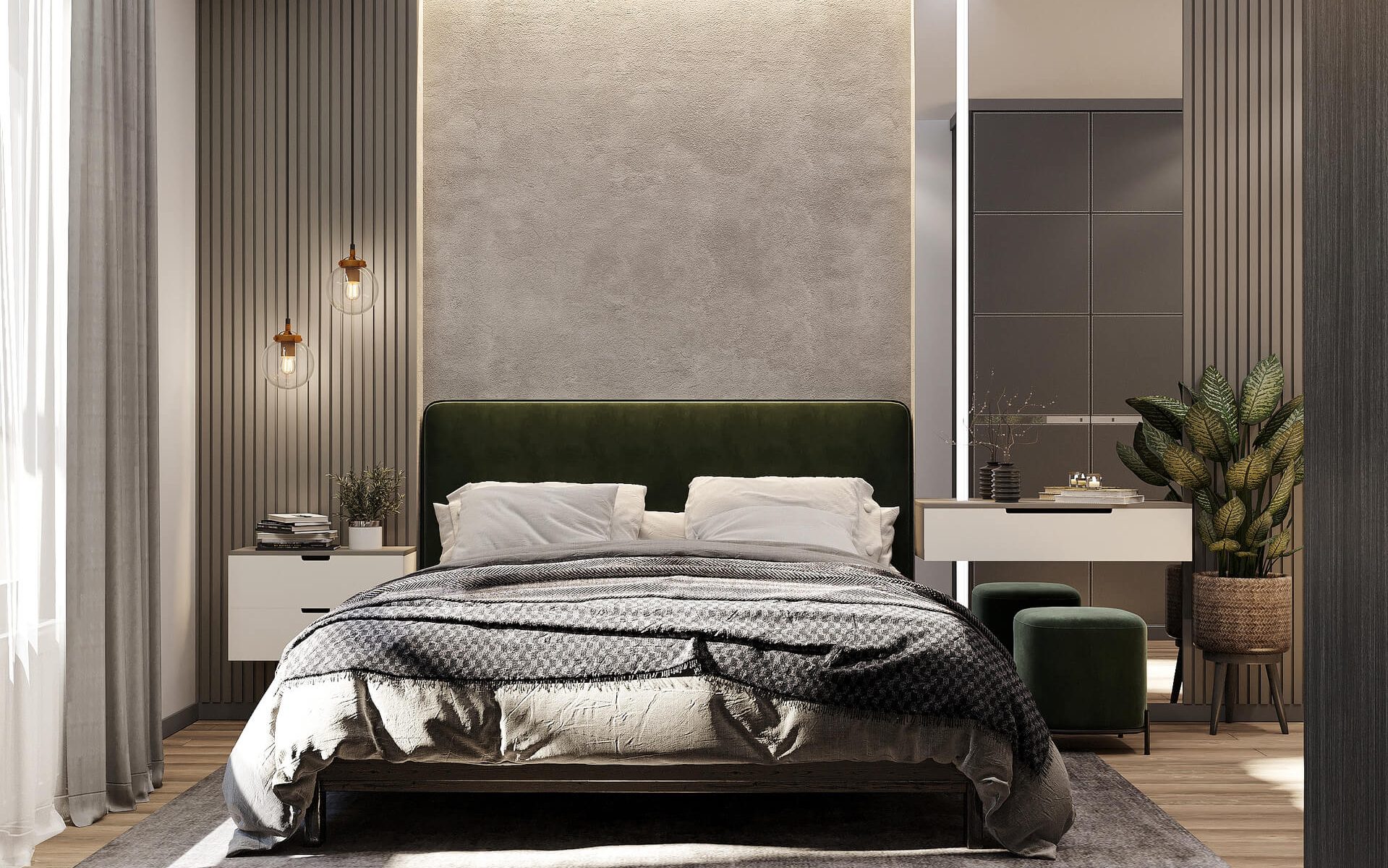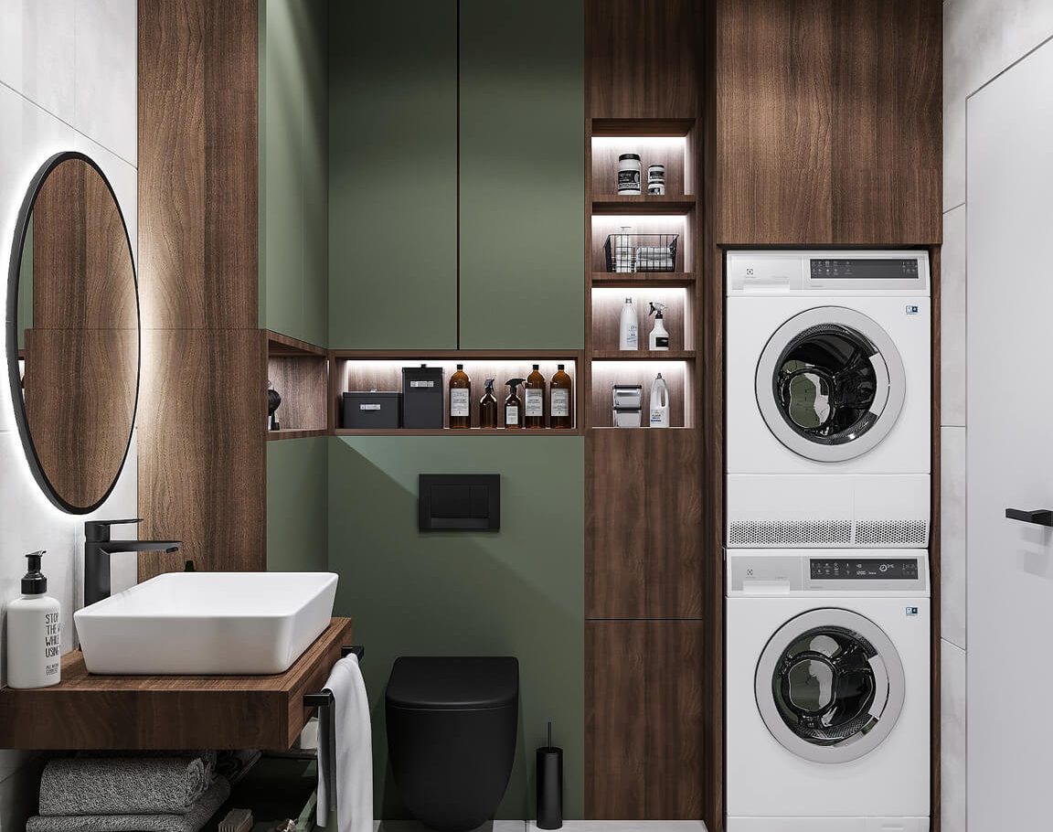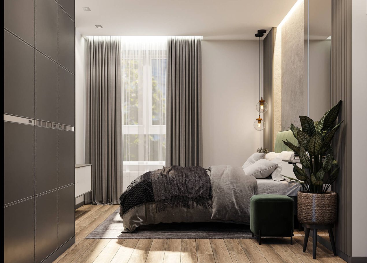 Характер пространству придали цветовые акценты. В спальне и прилегающем санузле мы использовали глубокий насыщенный зелёный, а в кухне и на балконе добавили бирюзовые оттенки в текстиле. Благодаря такому приёму интерьер получился живым, динамичным и при этом гармоничным.
