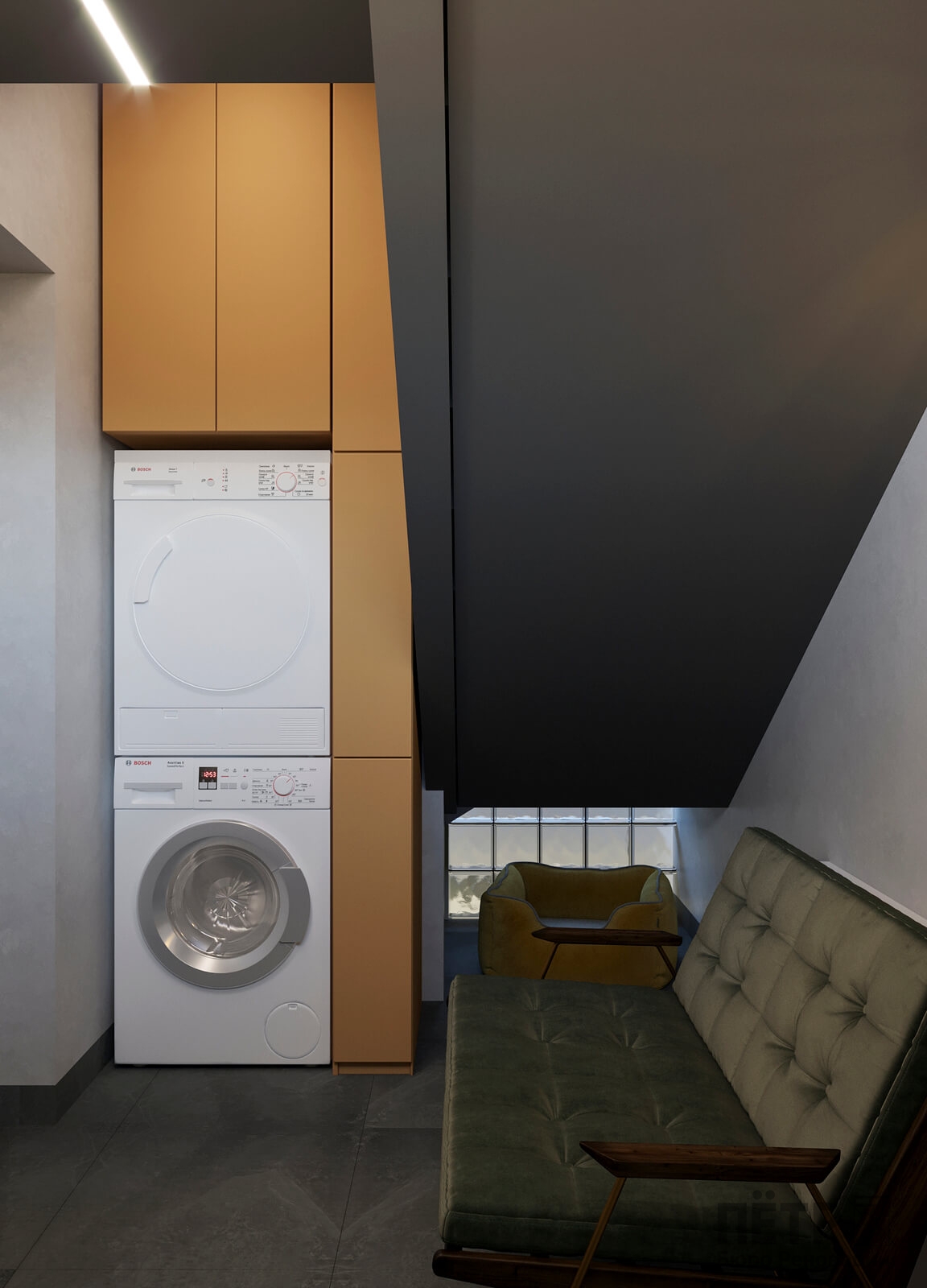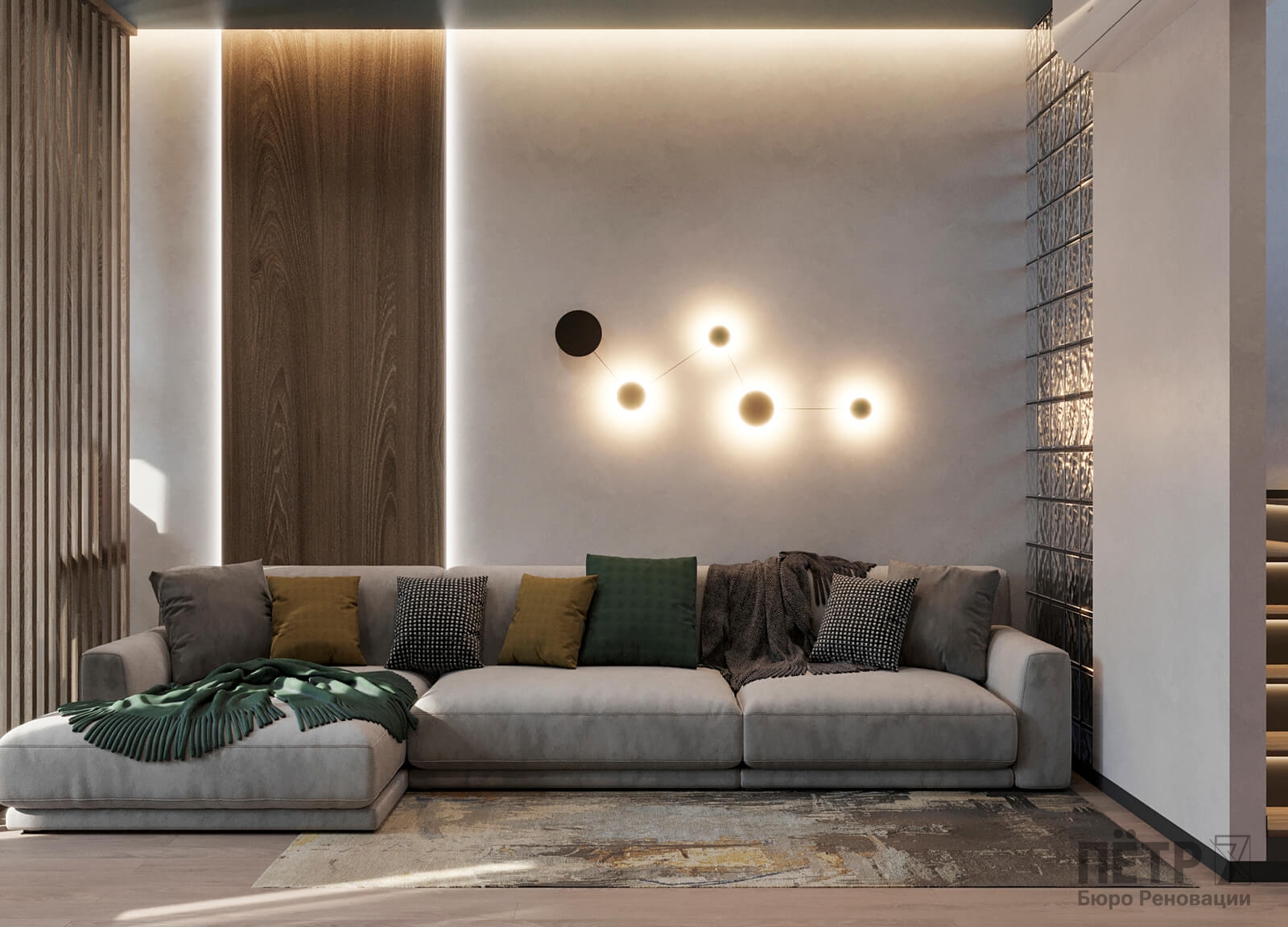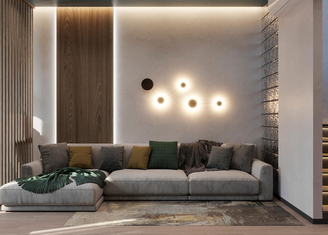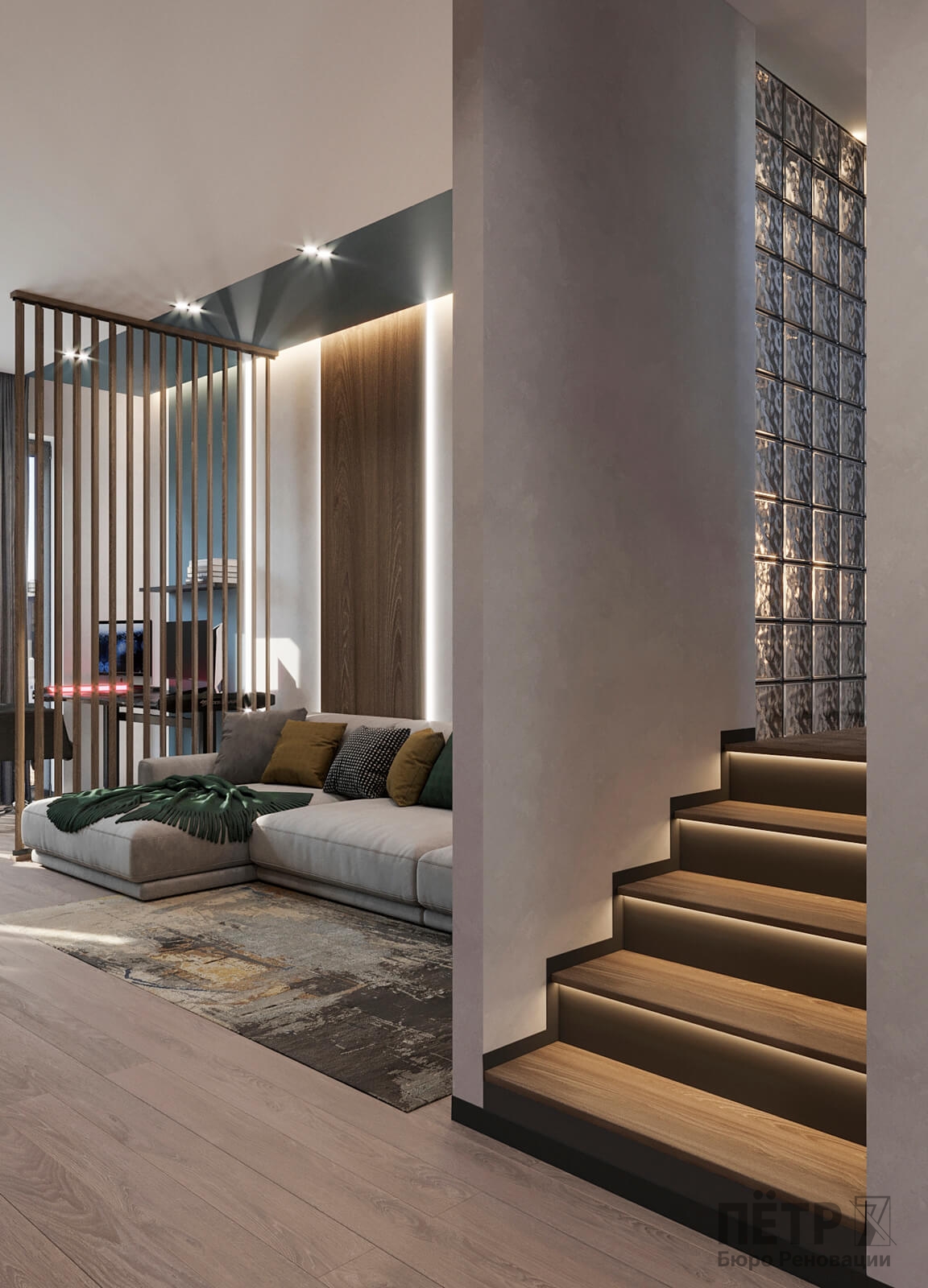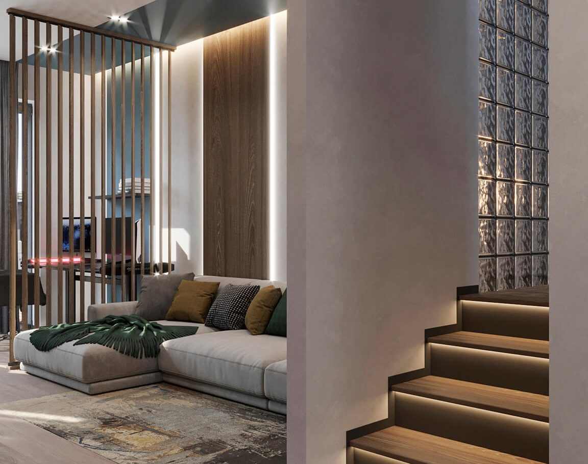 Нам было интересно сочетать современные материалы и нестандартные решения — в интерьере появились реечные перегородки и стеклоблоки, которые добавили глубины и характера. В итоге таунхаус получился ярким, динамичным и полностью отражающим пожелания семьи.