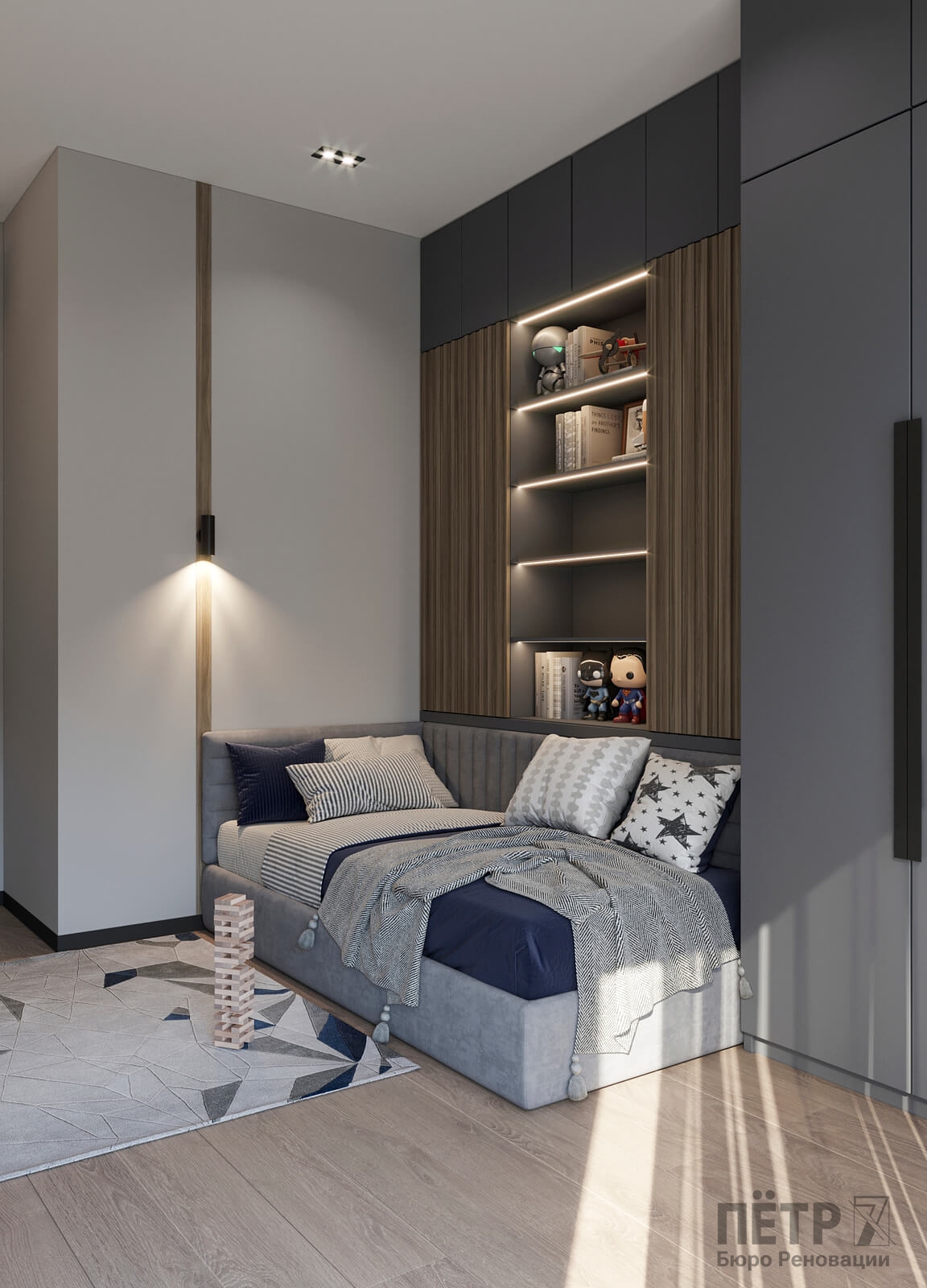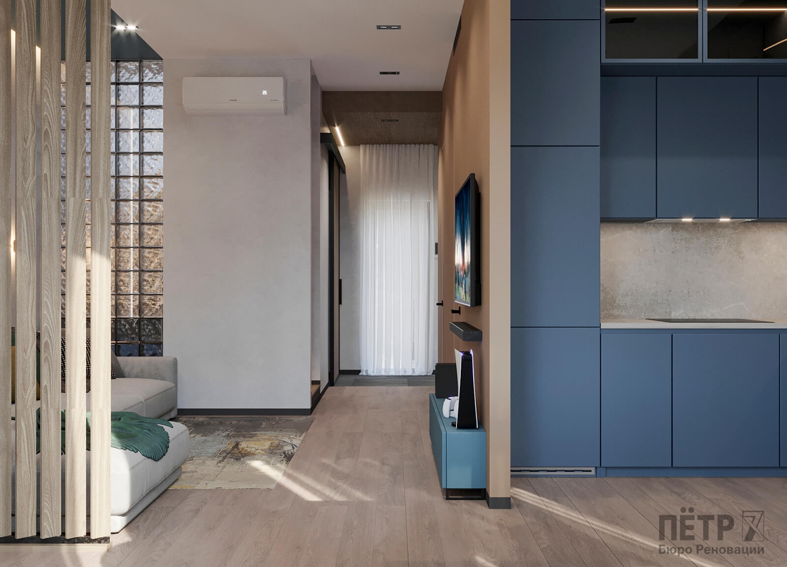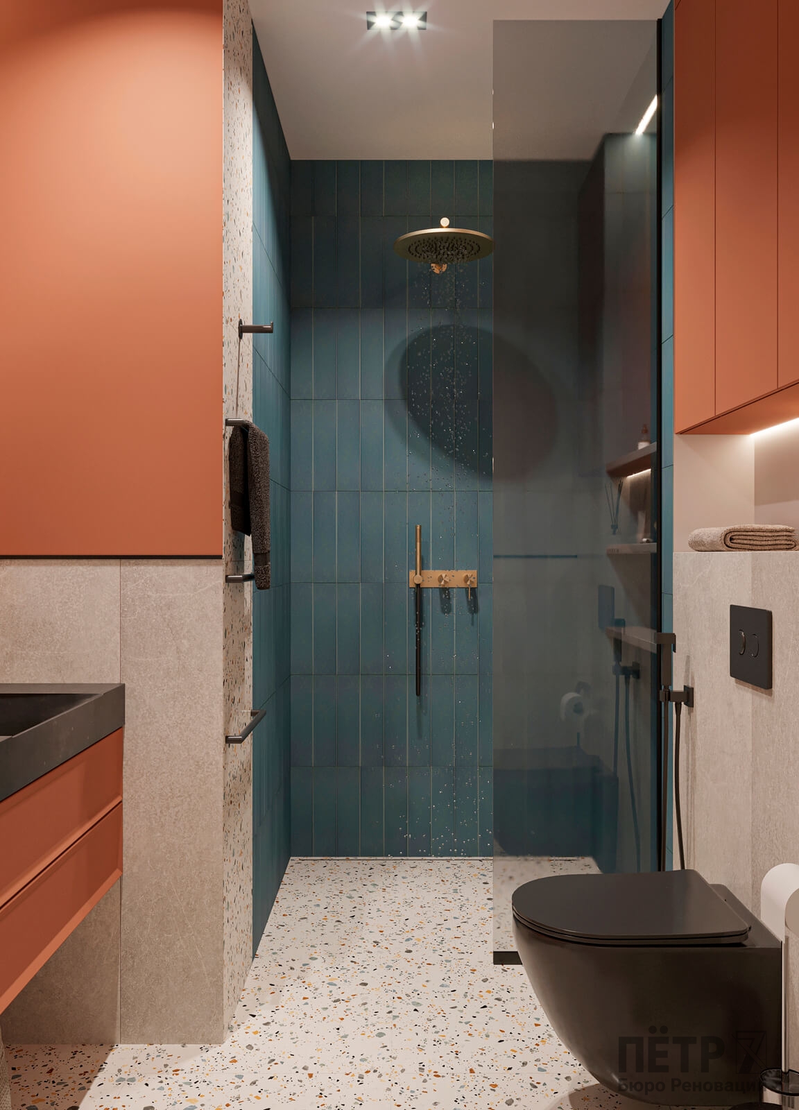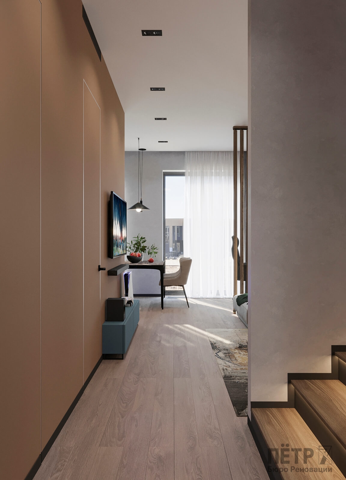 Нам было интересно сочетать современные материалы и нестандартные решения — в интерьере появились реечные перегородки и стеклоблоки, которые добавили глубины и характера. В итоге таунхаус получился ярким, динамичным и полностью отражающим пожелания семьи.