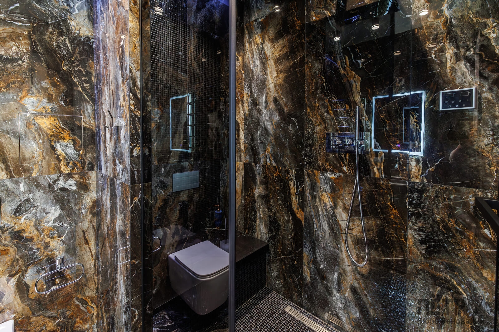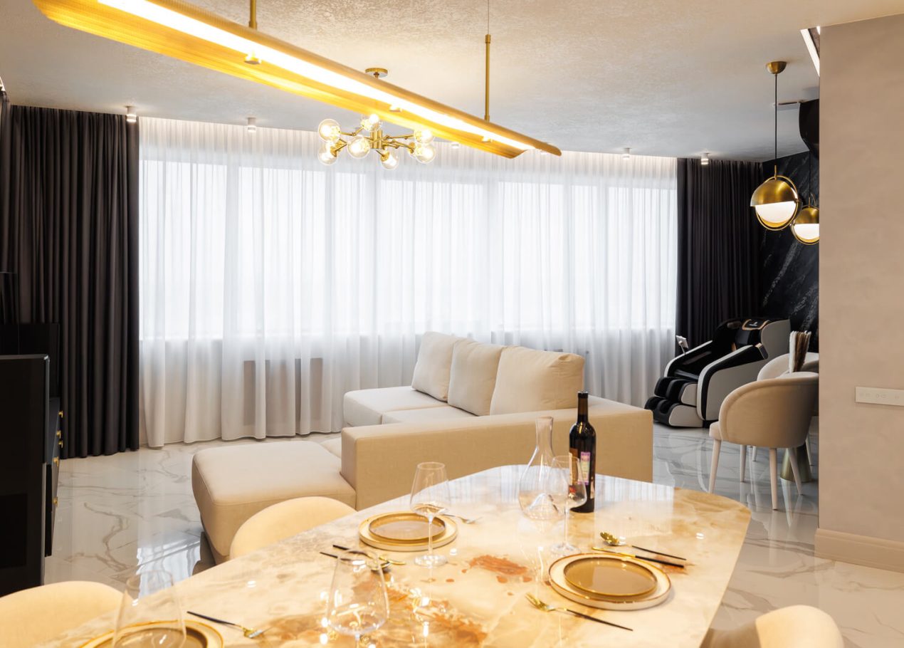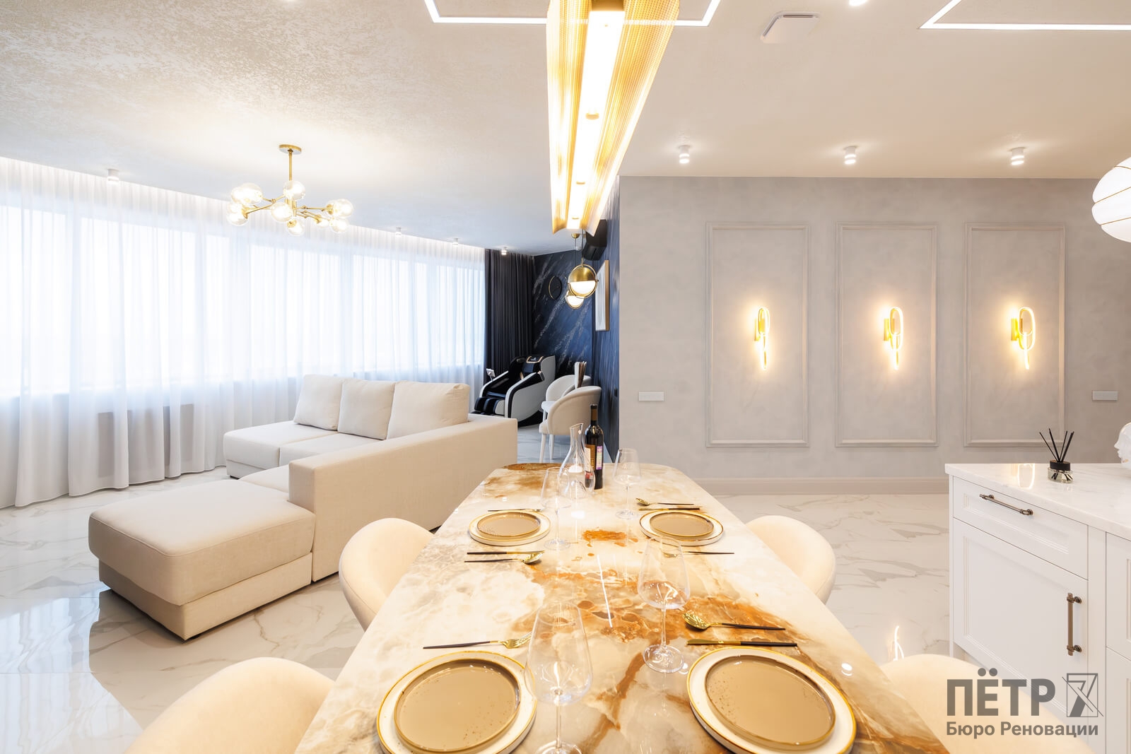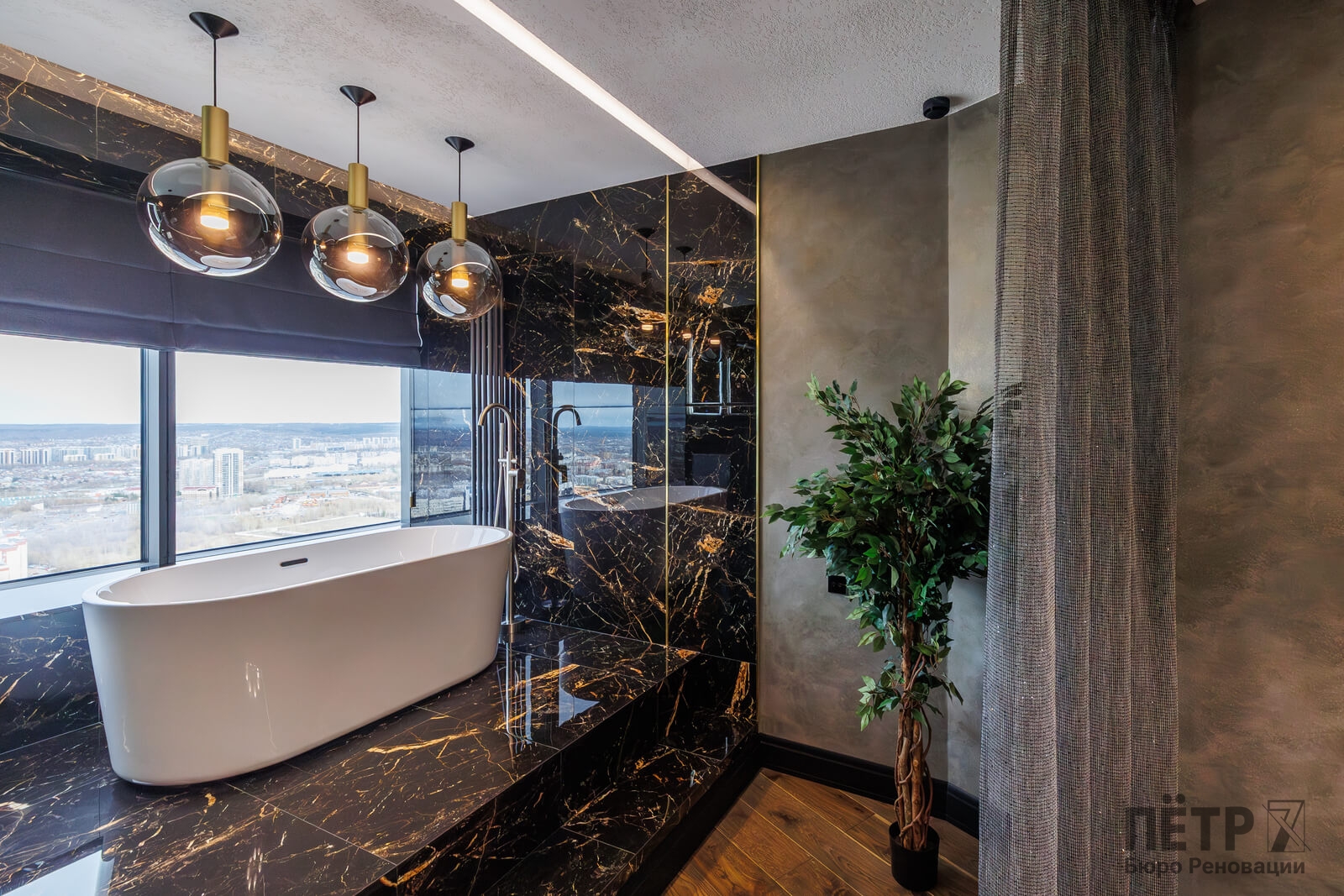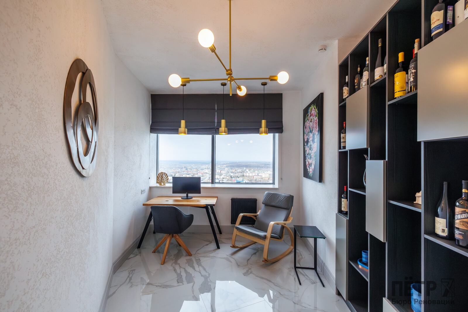 Квартира площадью 180 м² расположена на 32 этаже и имеет панорамные виды на город. Интерьер выполнен в более светлой современной стилистике с ощущением простора и воздуха: глянцевый керамогранит на полу, светлая палитра и минималистичная архитектура пространства.