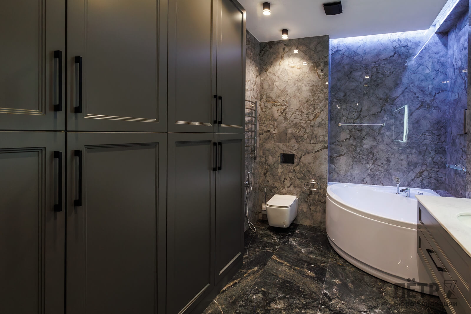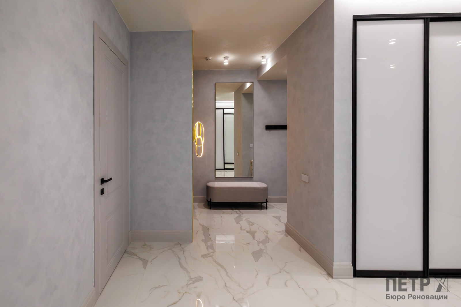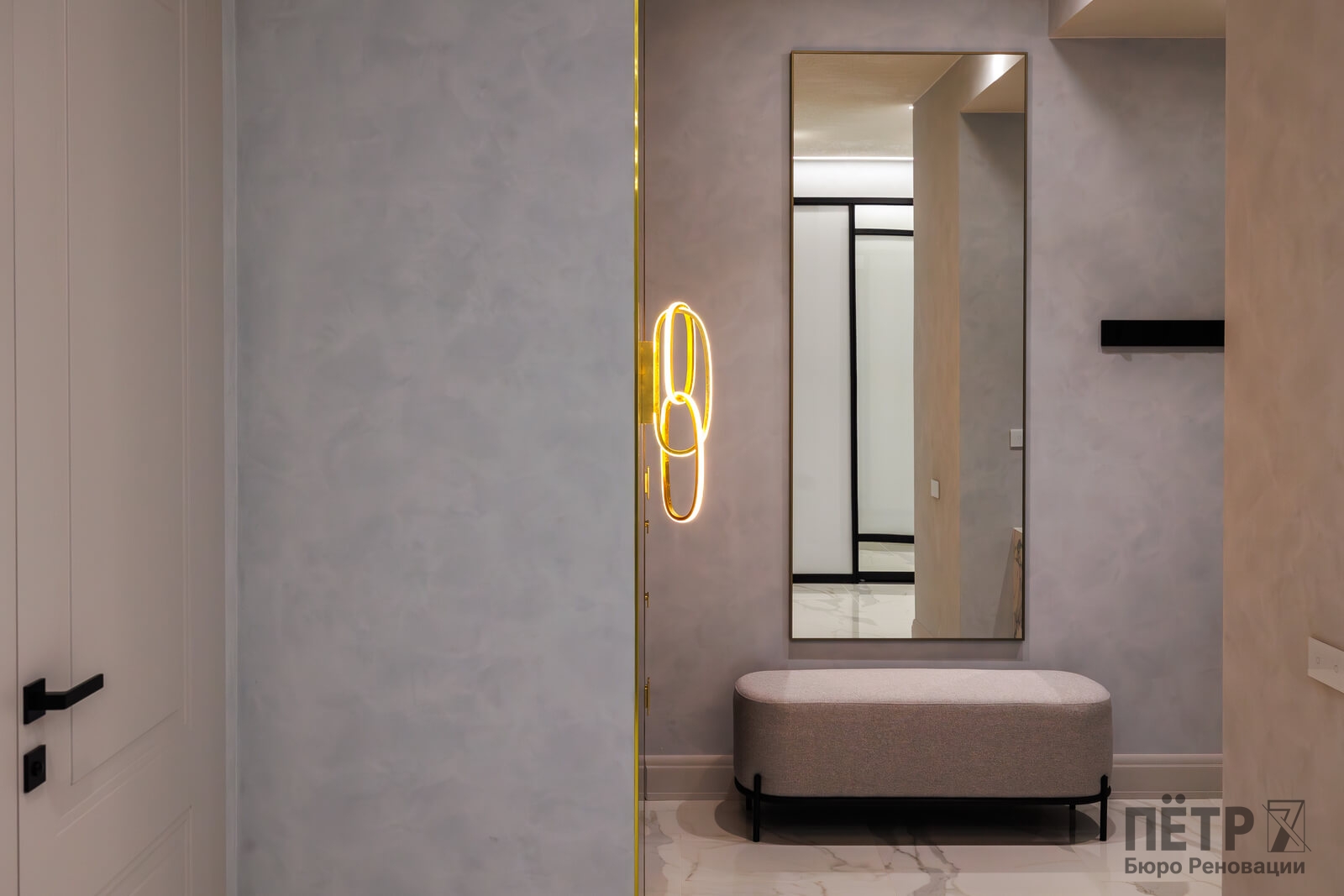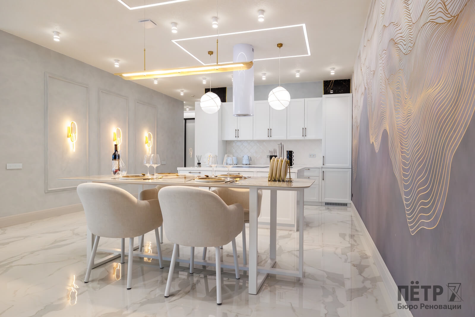 Квартира площадью 180 м² расположена на 32 этаже и имеет панорамные виды на город. Интерьер выполнен в более светлой современной стилистике с ощущением простора и воздуха: глянцевый керамогранит на полу, светлая палитра и минималистичная архитектура пространства.