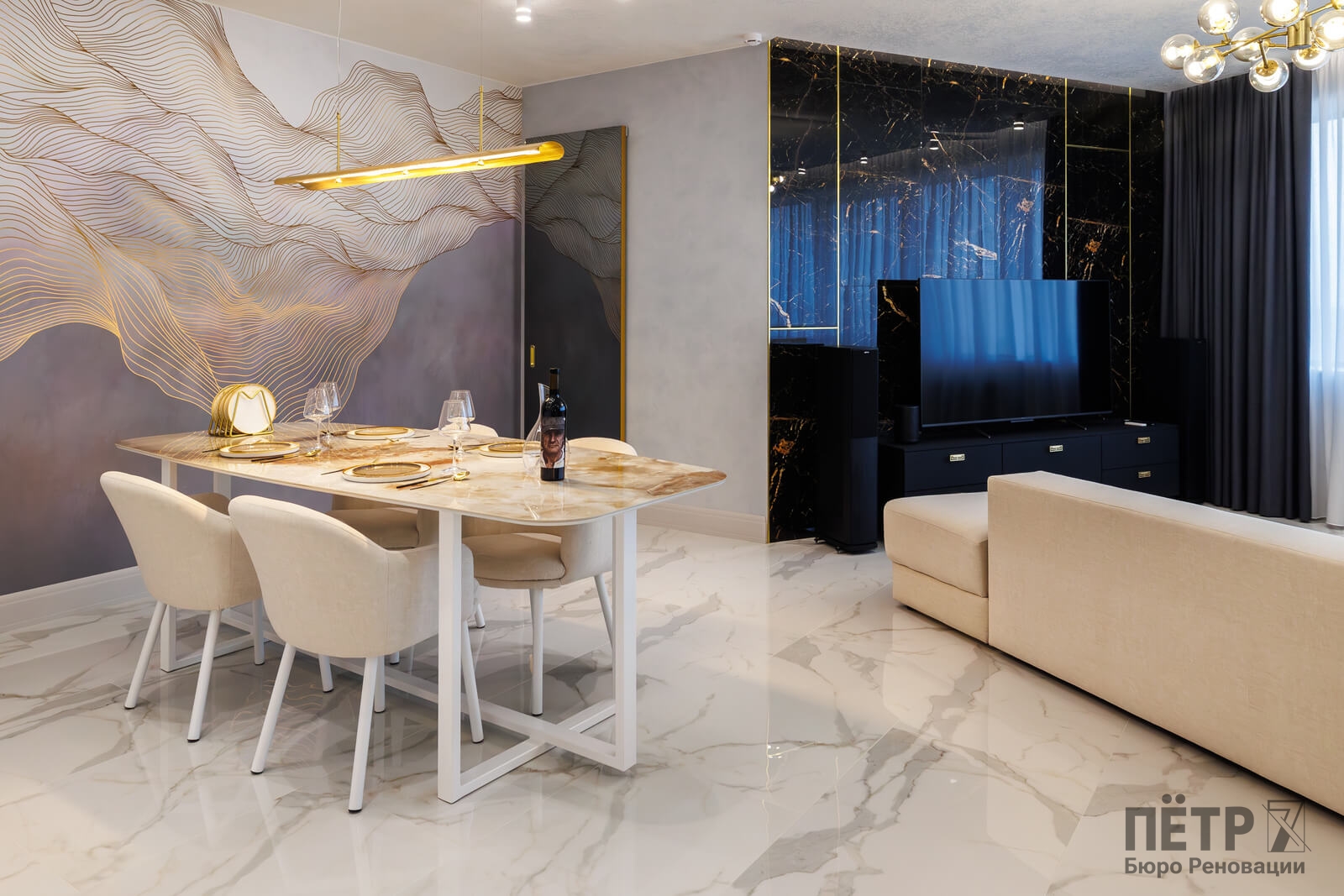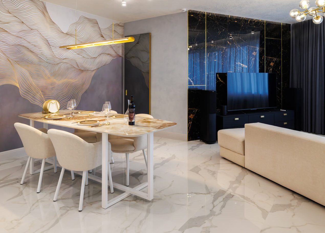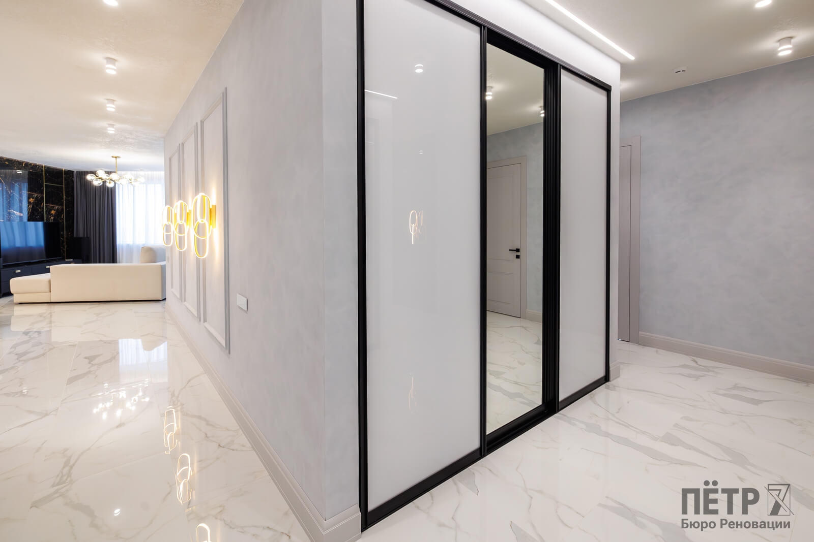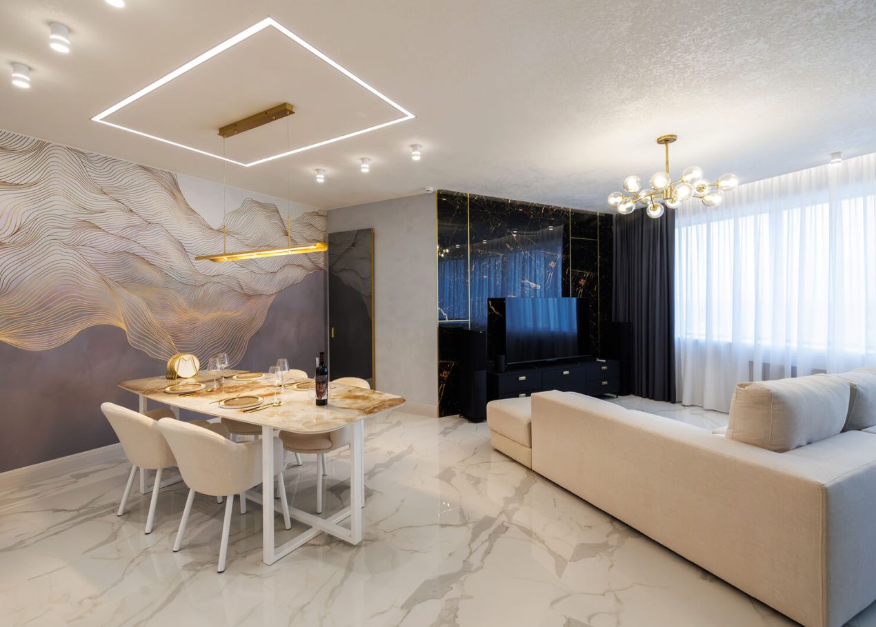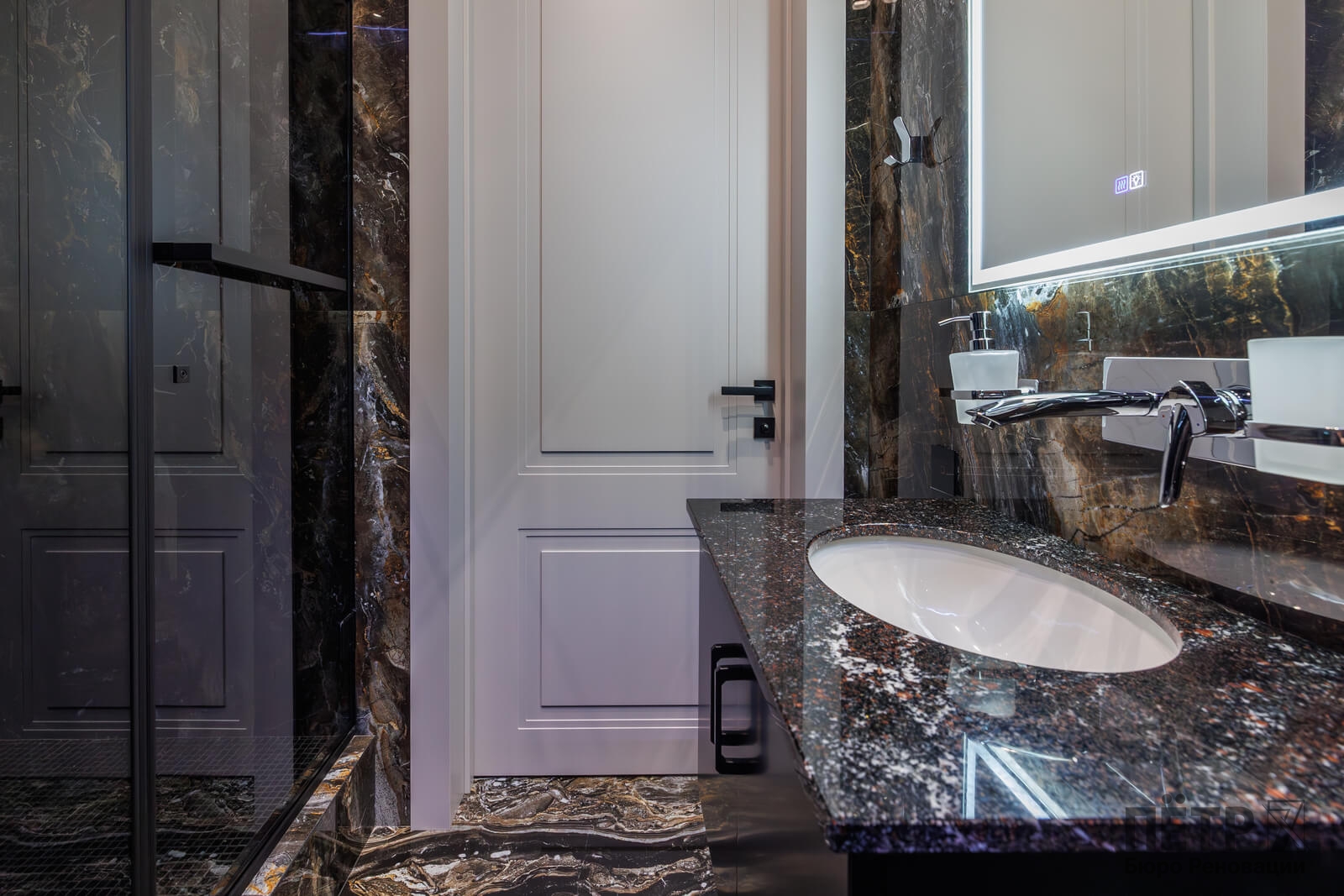 Квартира площадью 180 м² расположена на 32 этаже и имеет панорамные виды на город. Интерьер выполнен в более светлой современной стилистике с ощущением простора и воздуха: глянцевый керамогранит на полу, светлая палитра и минималистичная архитектура пространства.