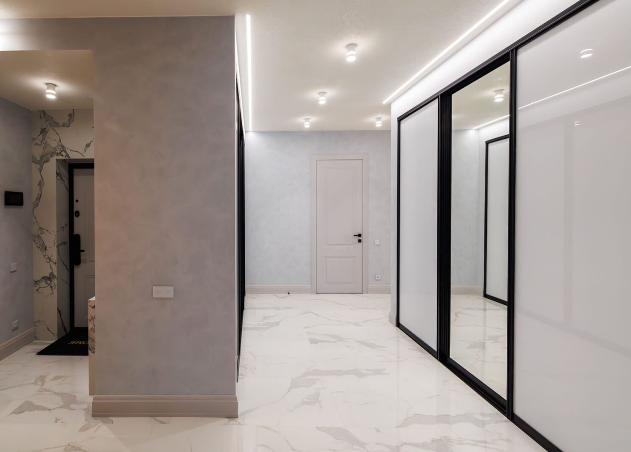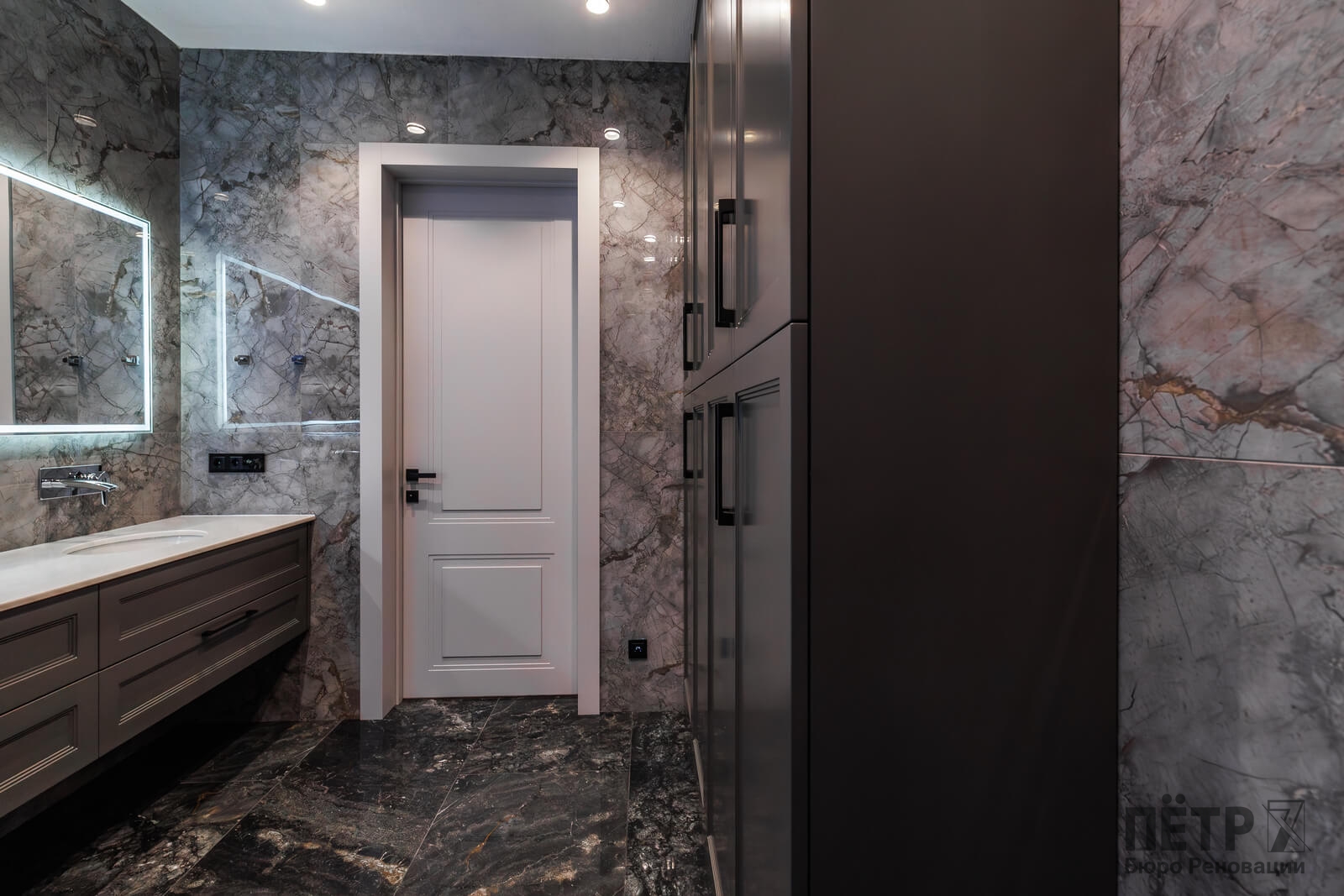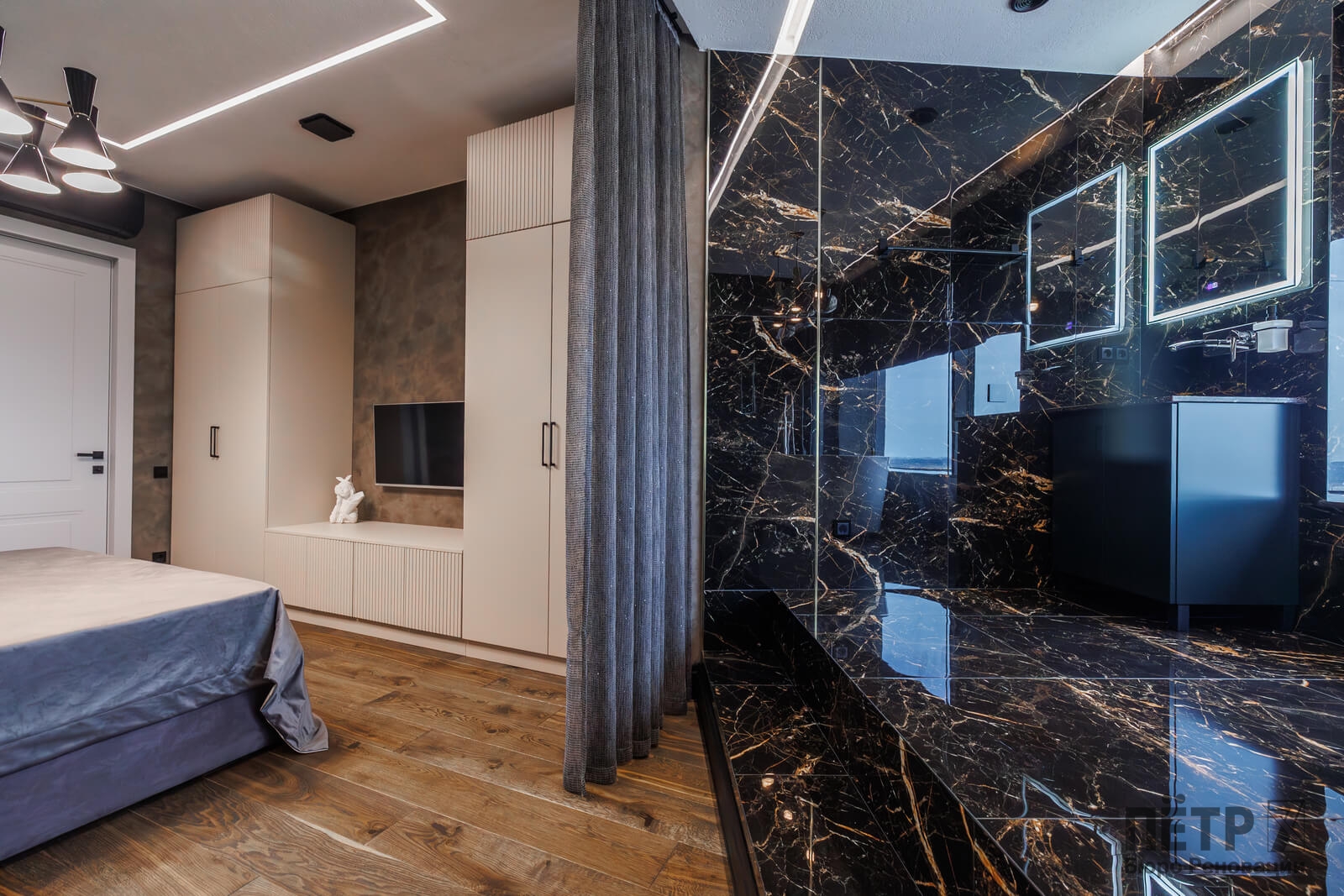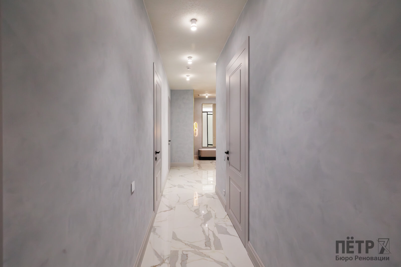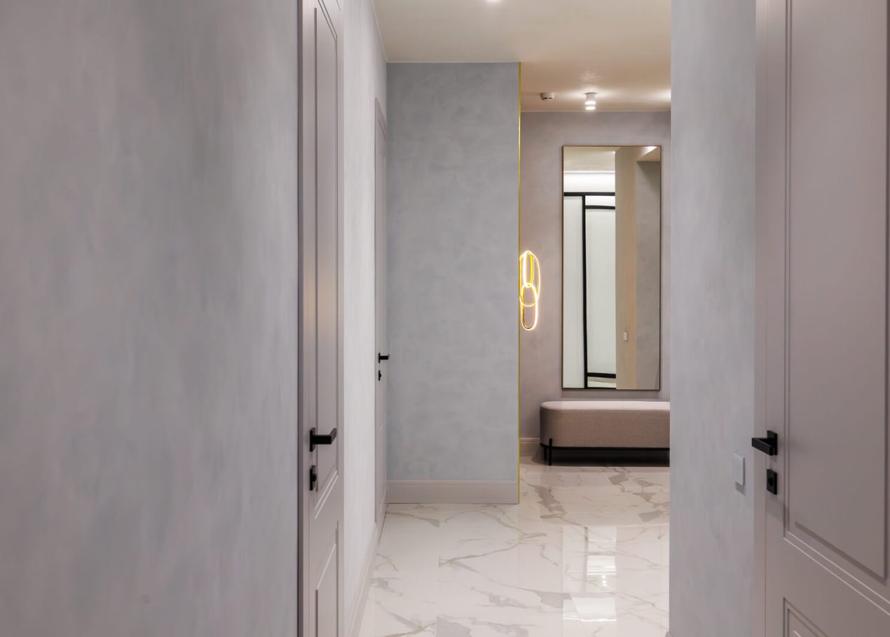 Квартира площадью 180 м² расположена на 32 этаже и имеет панорамные виды на город. Интерьер выполнен в более светлой современной стилистике с ощущением простора и воздуха: глянцевый керамогранит на полу, светлая палитра и минималистичная архитектура пространства.