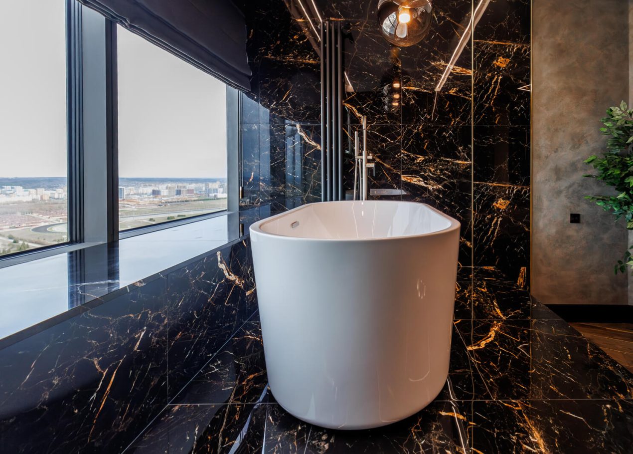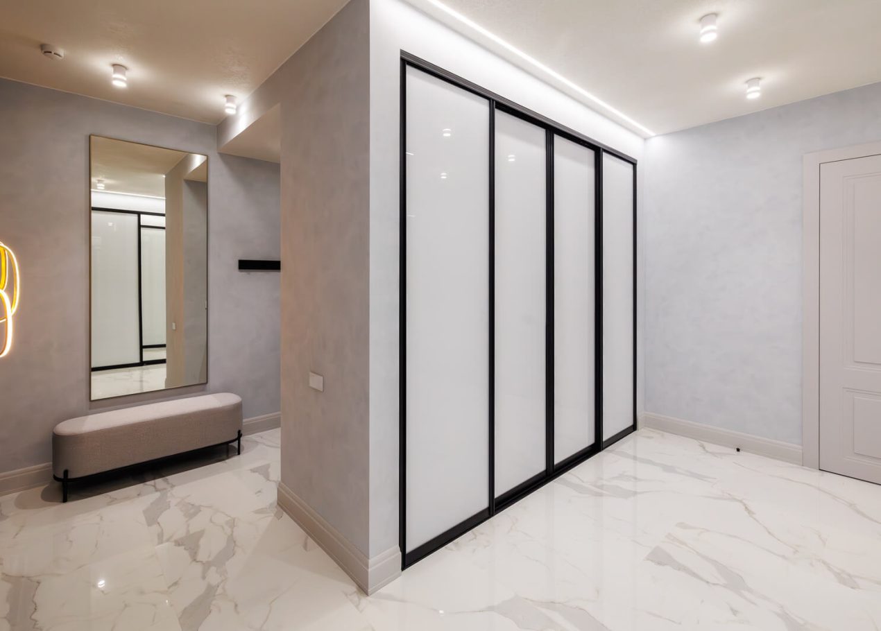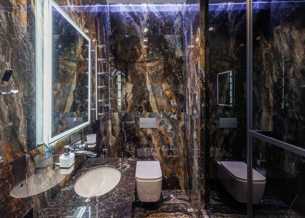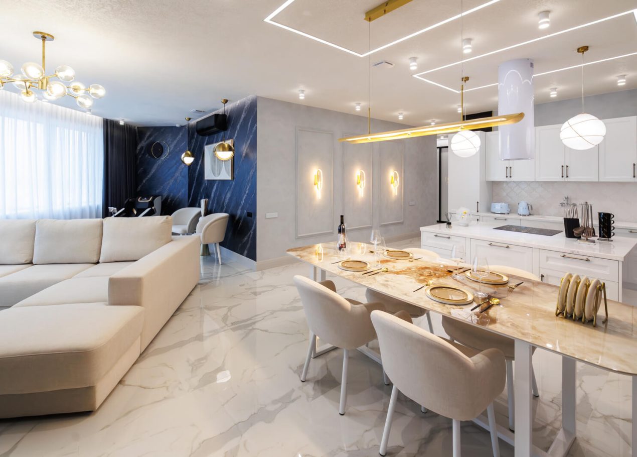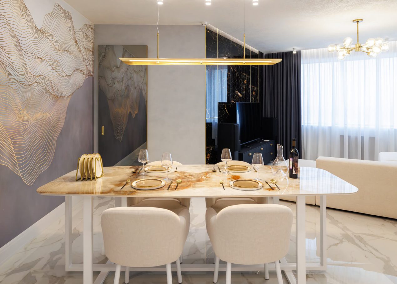 Квартира площадью 180 м² расположена на 32 этаже и имеет панорамные виды на город. Интерьер выполнен в более светлой современной стилистике с ощущением простора и воздуха: глянцевый керамогранит на полу, светлая палитра и минималистичная архитектура пространства.