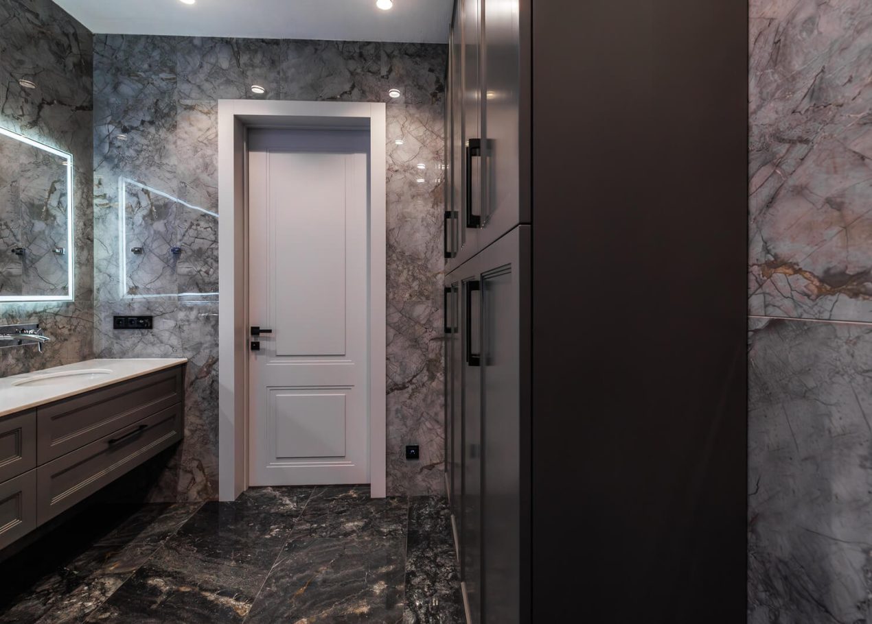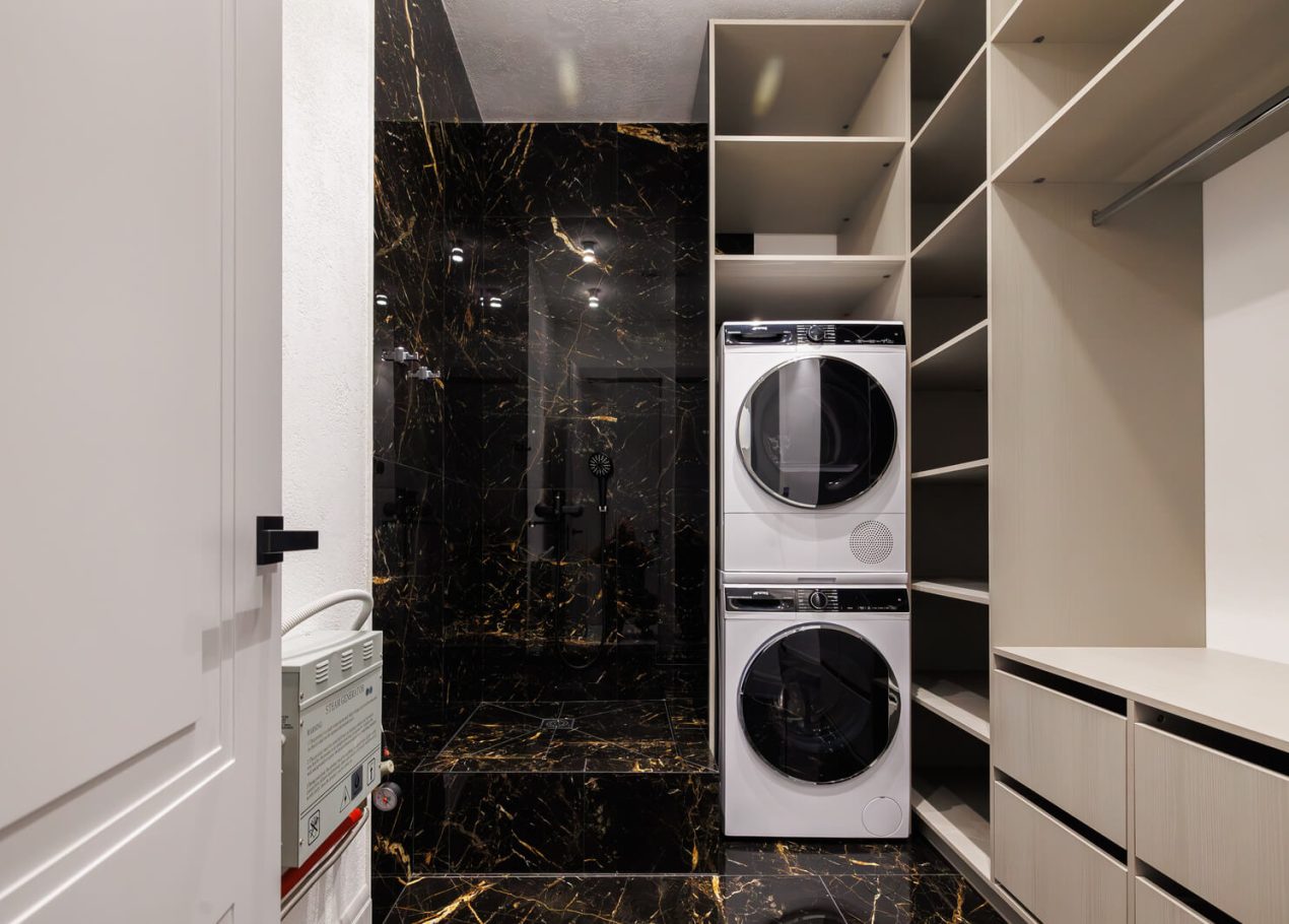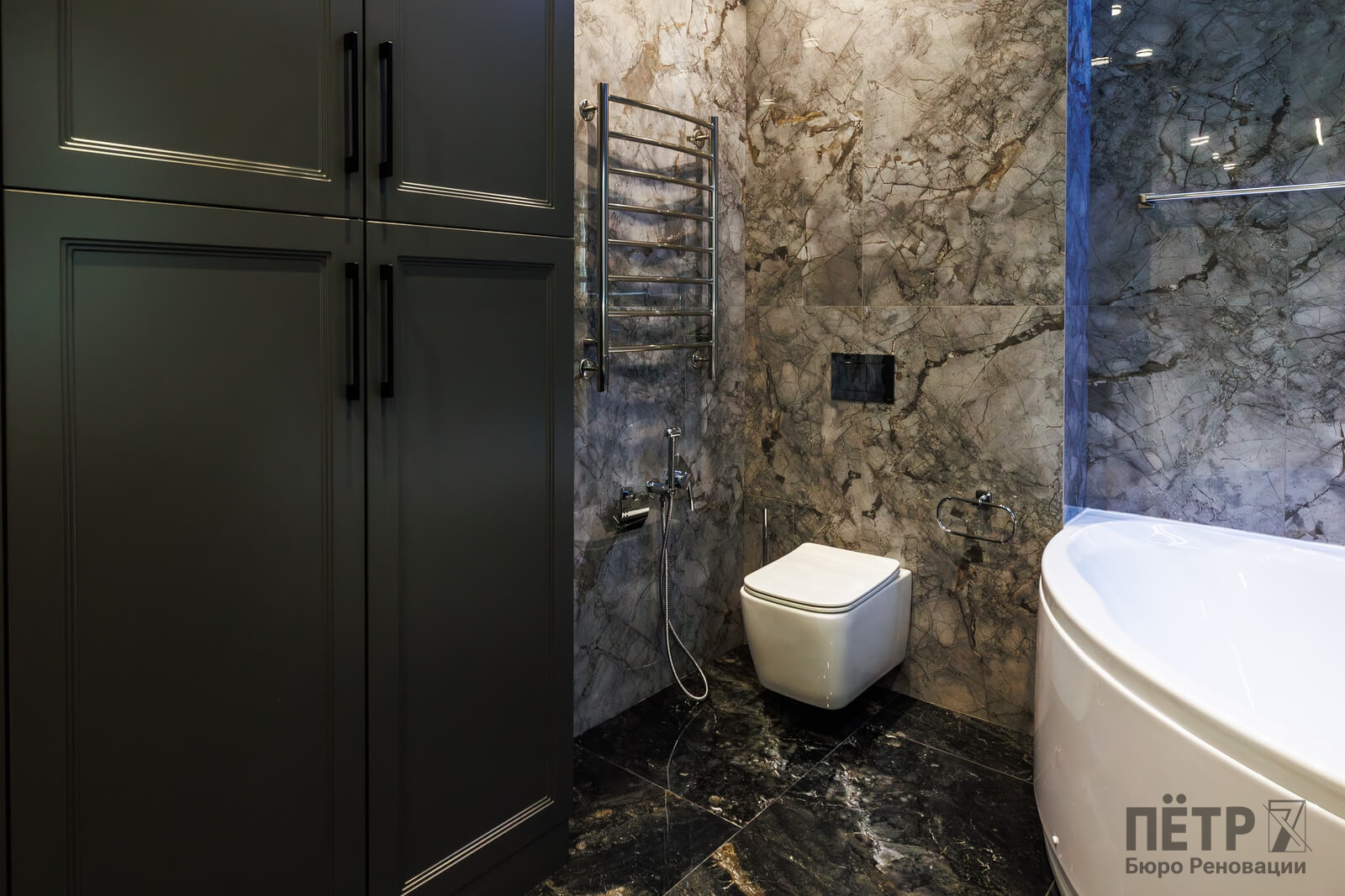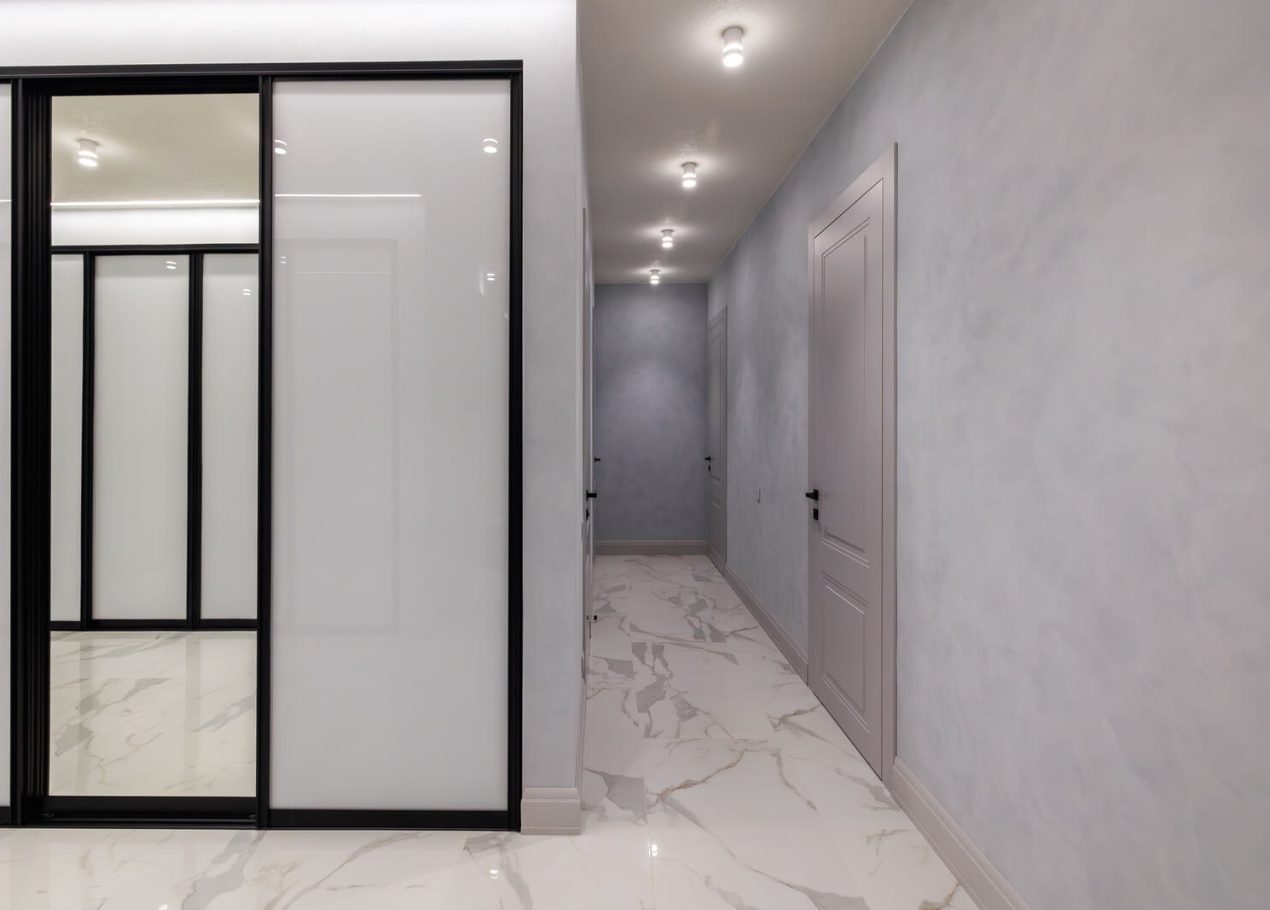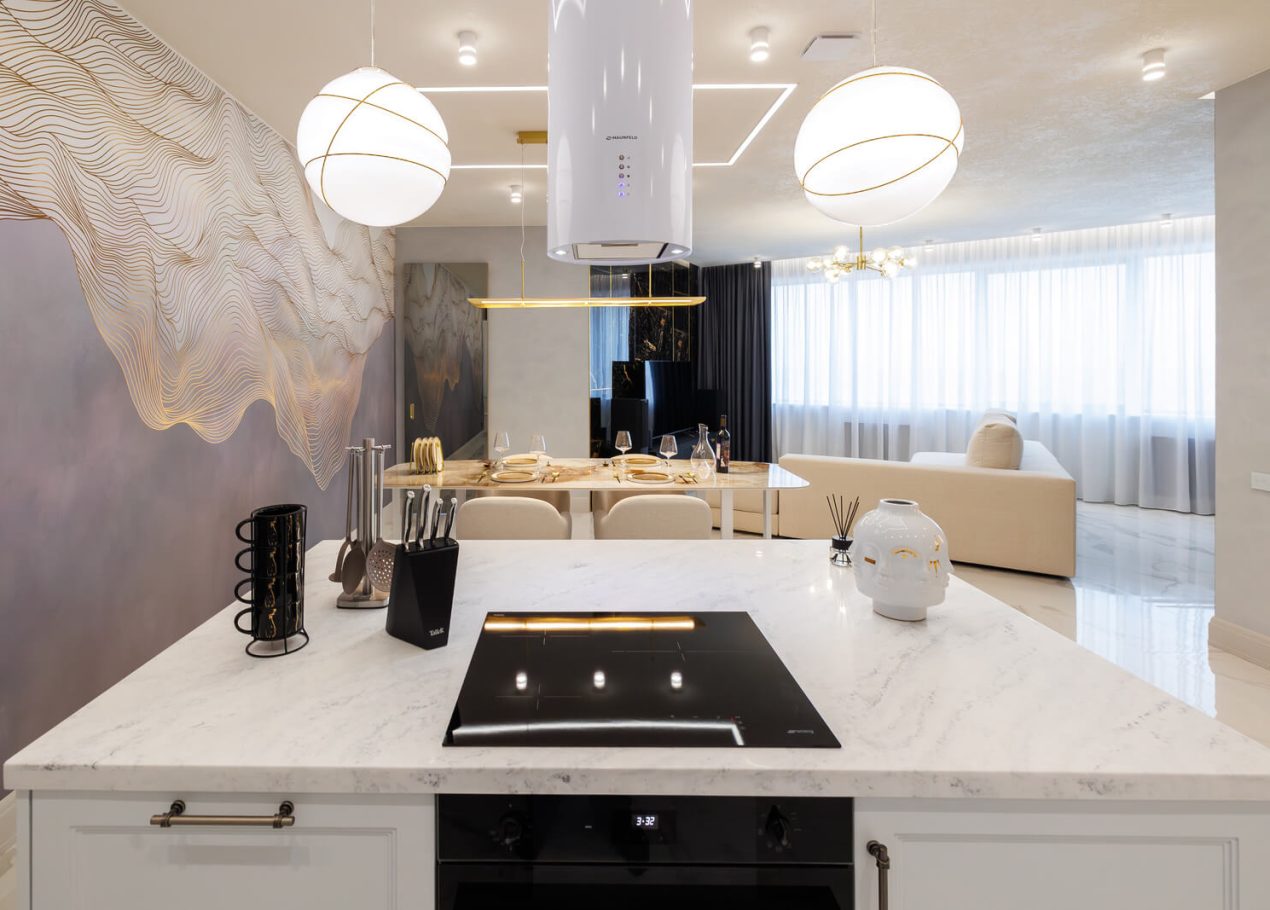 Квартира площадью 180 м² расположена на 32 этаже и имеет панорамные виды на город. Интерьер выполнен в более светлой современной стилистике с ощущением простора и воздуха: глянцевый керамогранит на полу, светлая палитра и минималистичная архитектура пространства.
