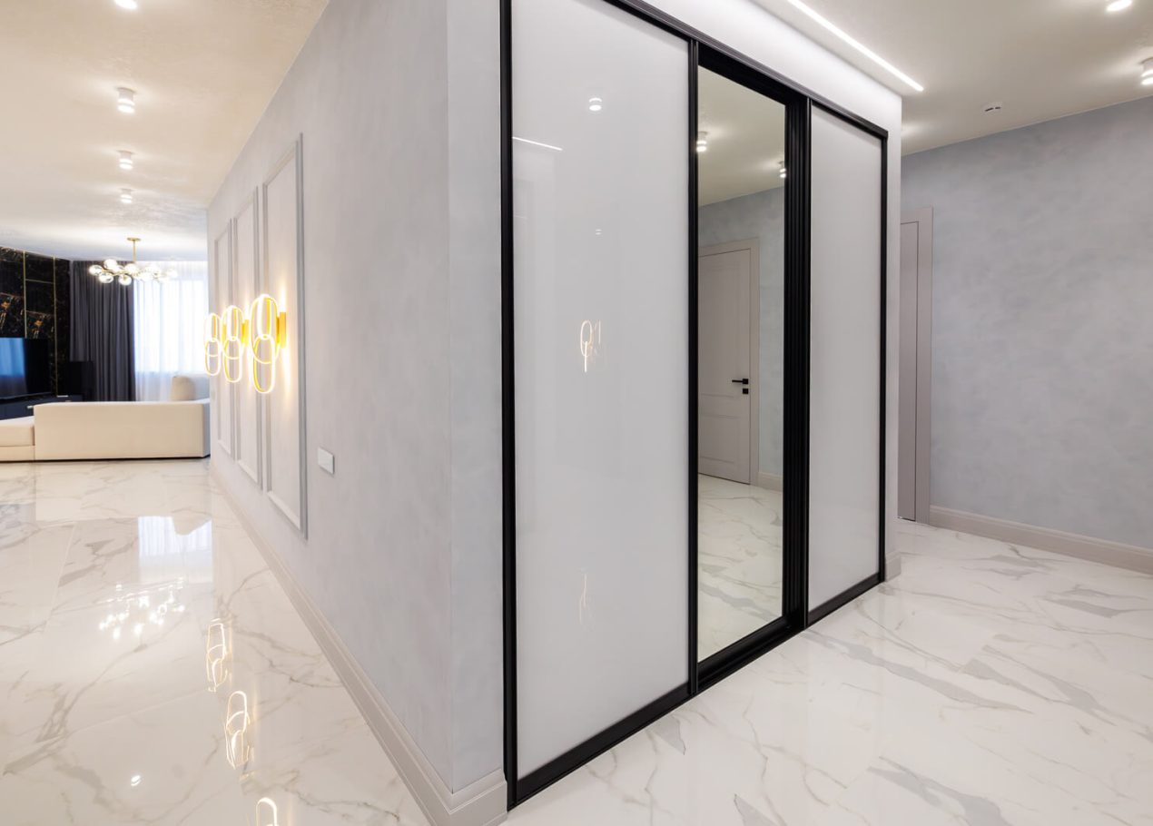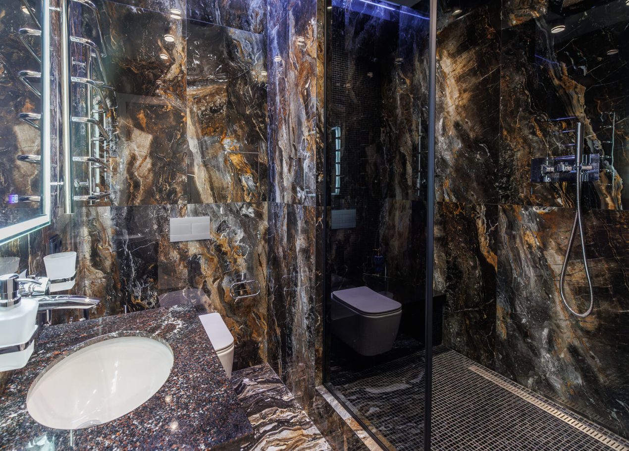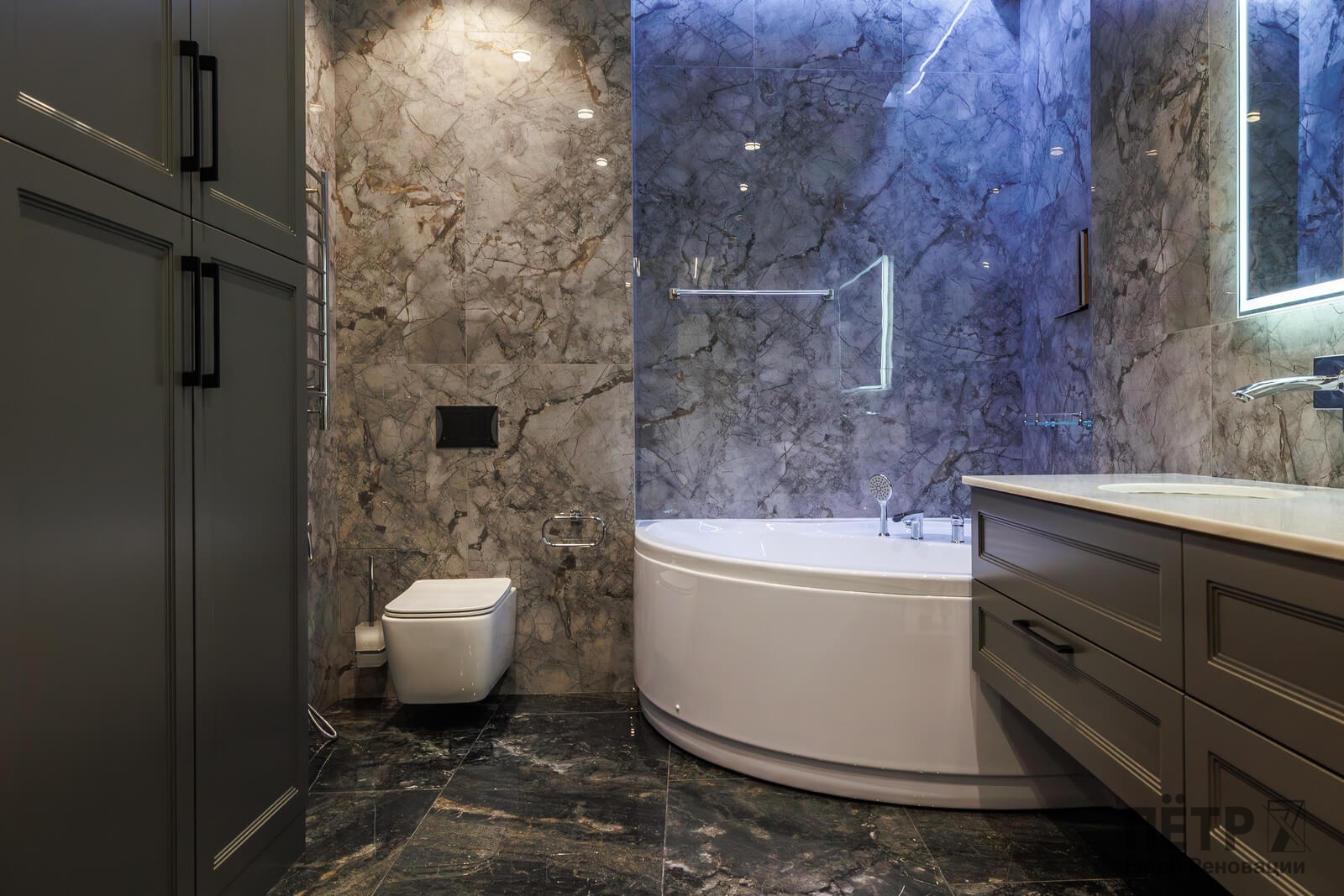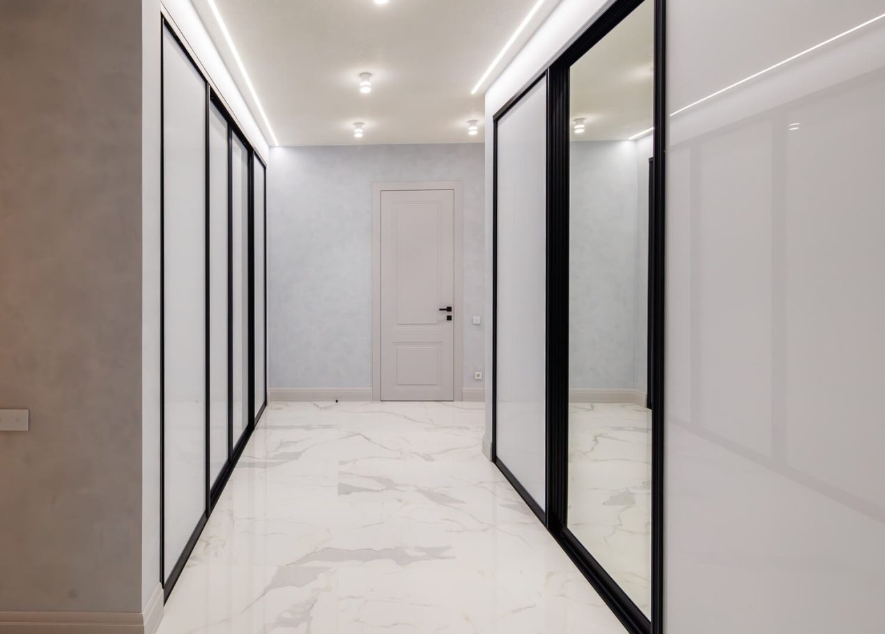 Квартира площадью 180 м² расположена на 32 этаже и имеет панорамные виды на город. Интерьер выполнен в более светлой современной стилистике с ощущением простора и воздуха: глянцевый керамогранит на полу, светлая палитра и минималистичная архитектура пространства.