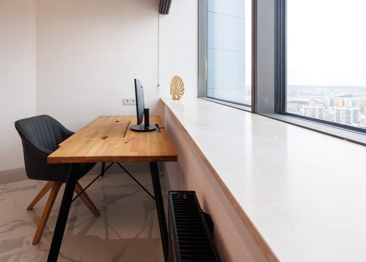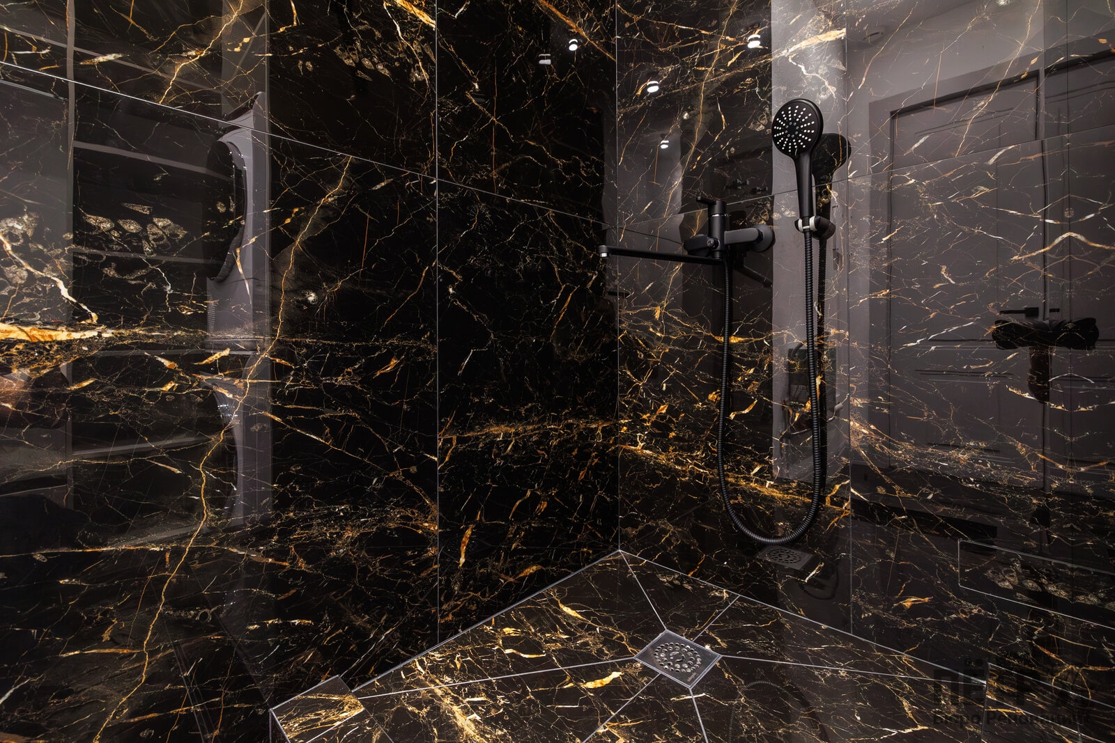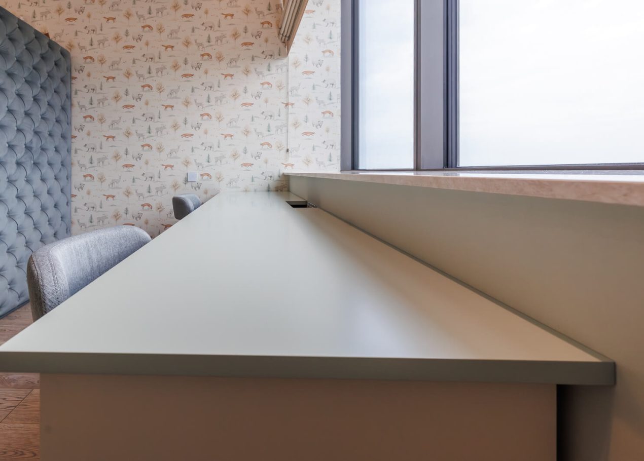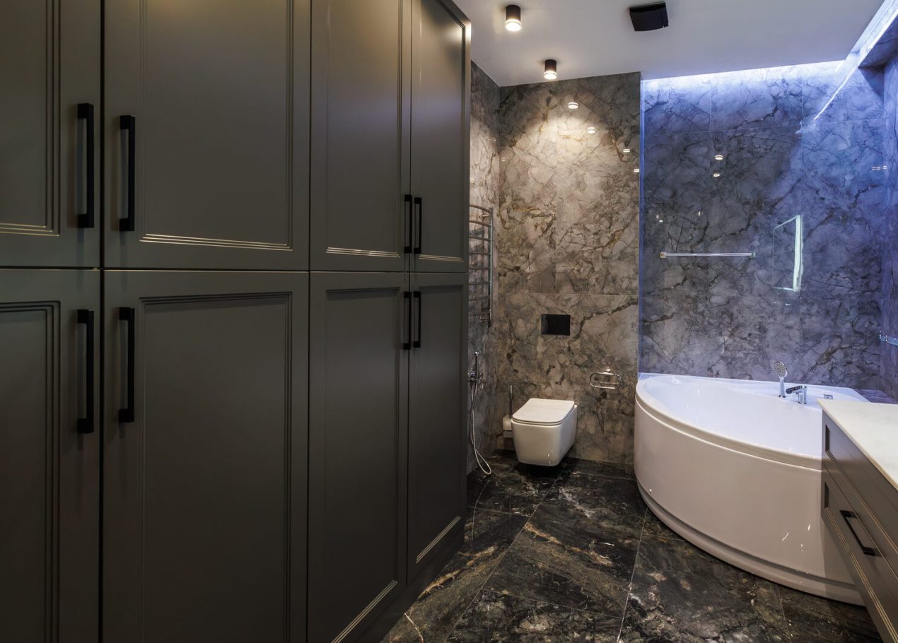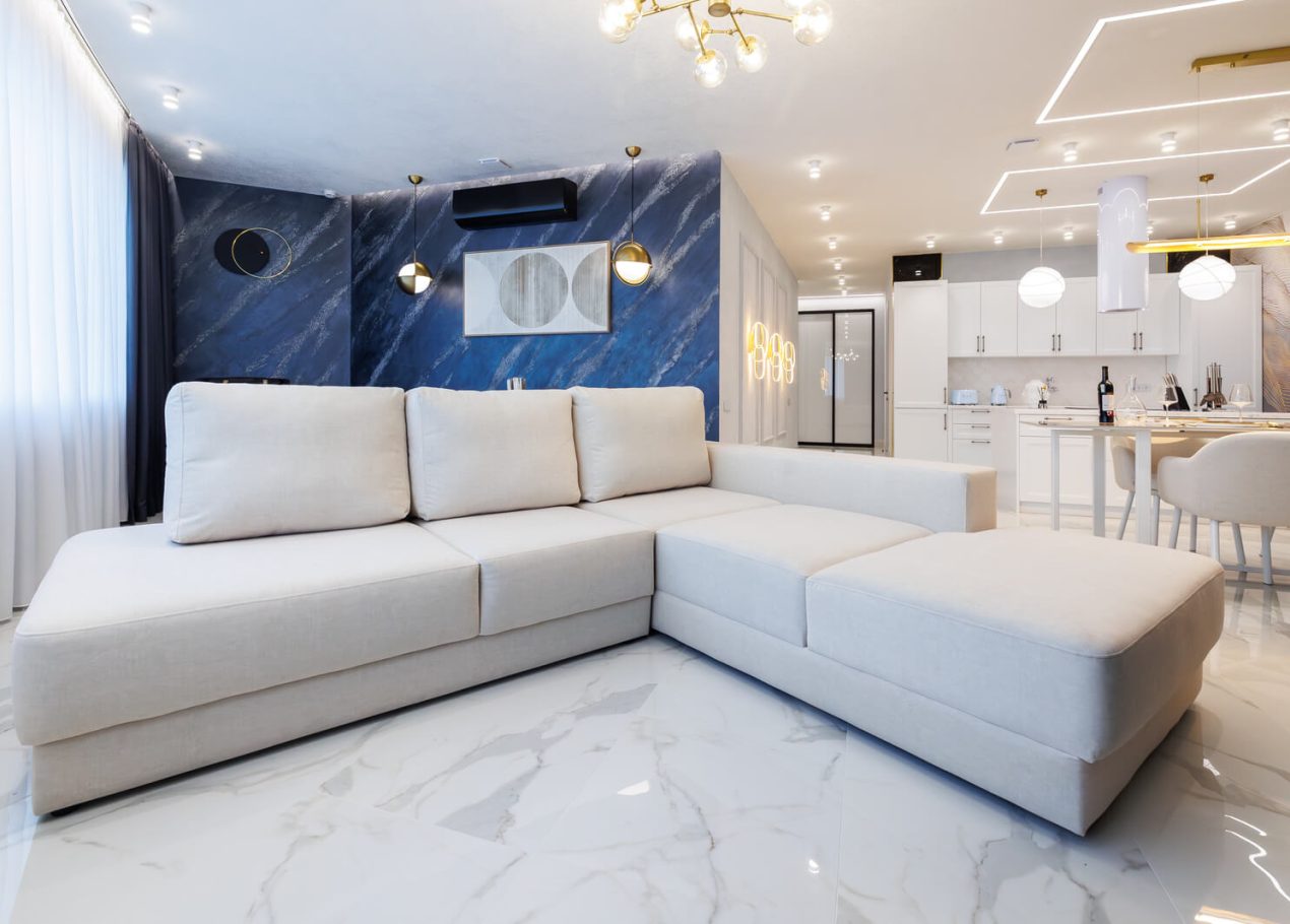 Квартира площадью 180 м² расположена на 32 этаже и имеет панорамные виды на город. Интерьер выполнен в более светлой современной стилистике с ощущением простора и воздуха: глянцевый керамогранит на полу, светлая палитра и минималистичная архитектура пространства.