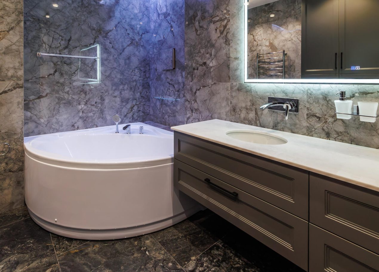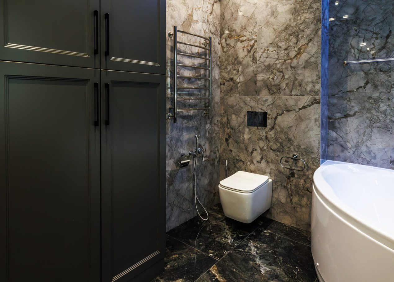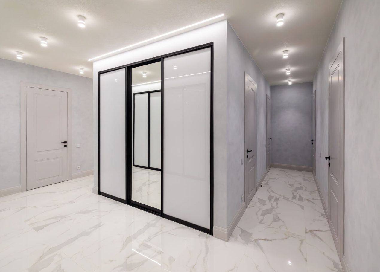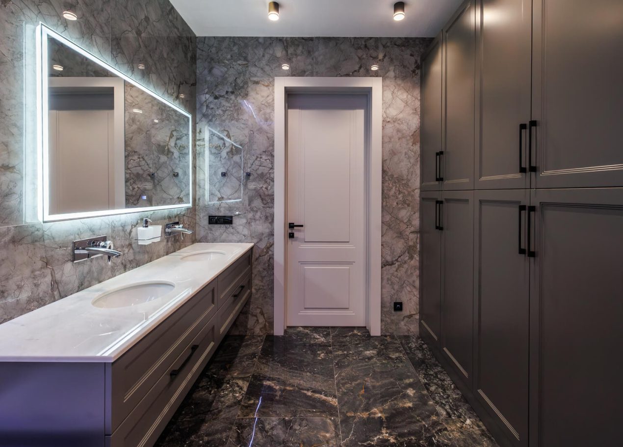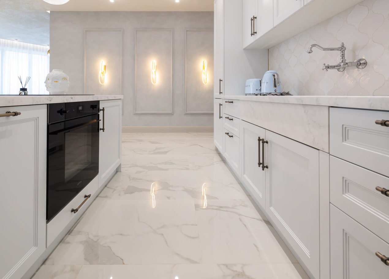 Квартира площадью 180 м² расположена на 32 этаже и имеет панорамные виды на город. Интерьер выполнен в более светлой современной стилистике с ощущением простора и воздуха: глянцевый керамогранит на полу, светлая палитра и минималистичная архитектура пространства.