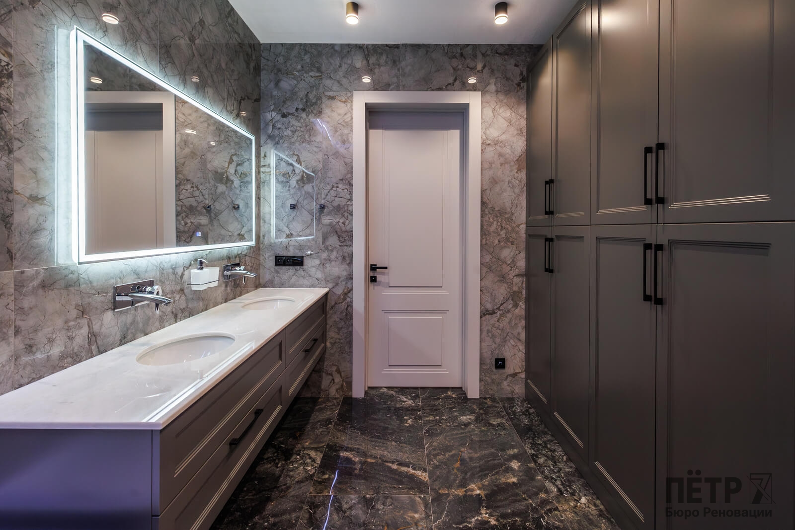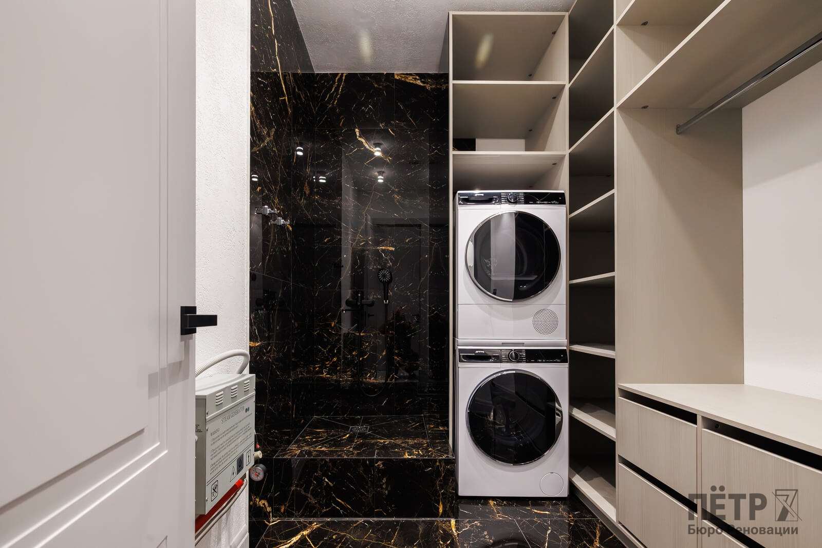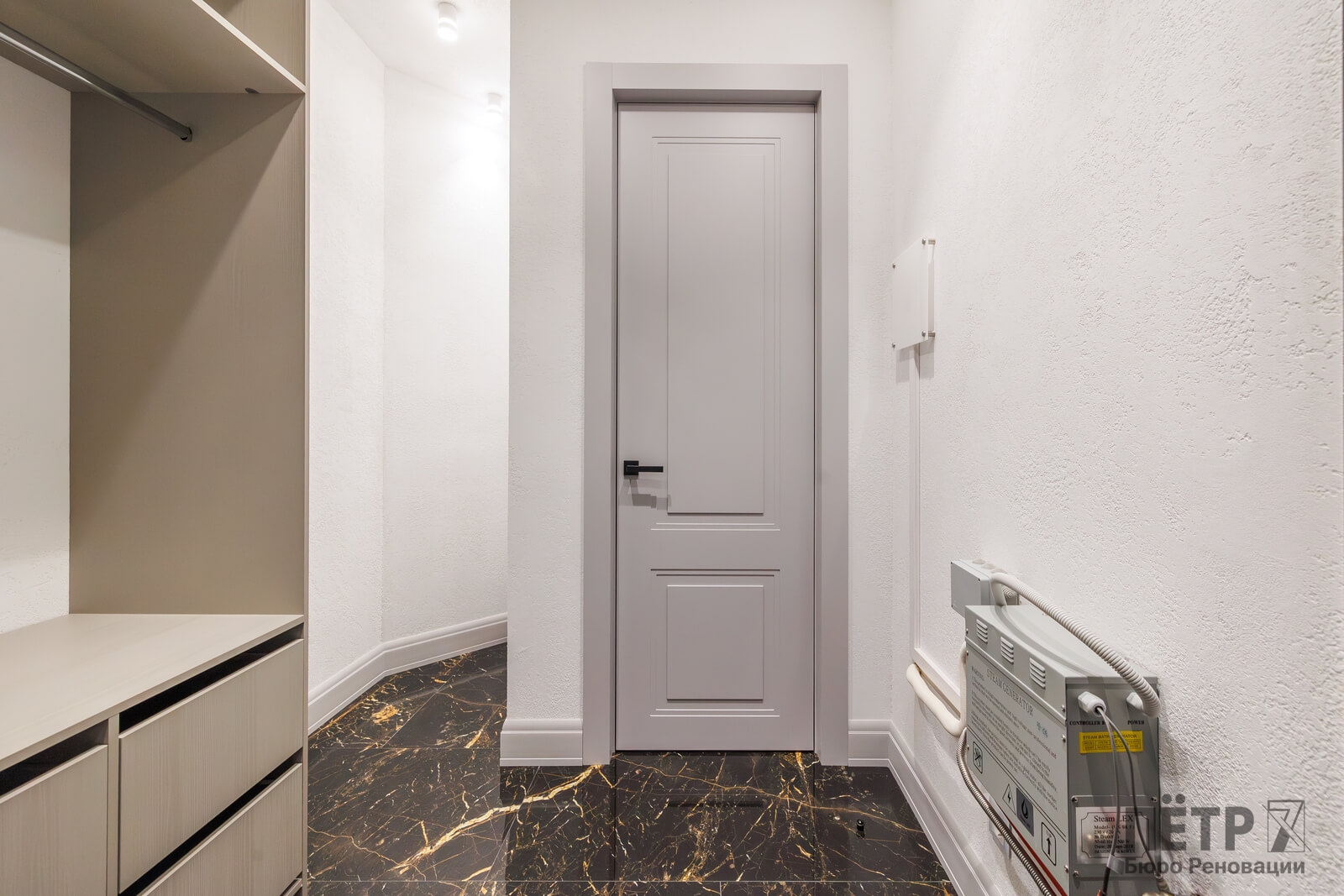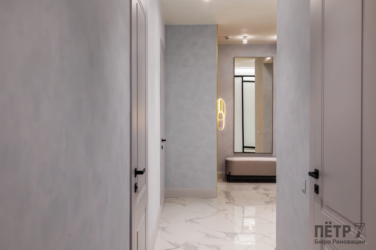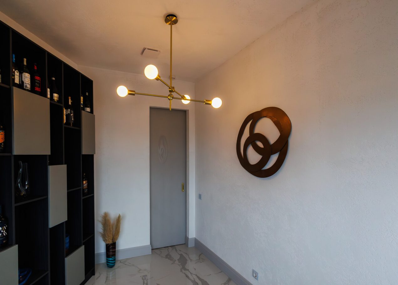 Планировка рассчитана на большую семью: три спальни, просторная кухня-гостиная, большой кабинет, прачечная, два санузла (один с хамамом) и большой холл. Входная группа усилена бронированной дверью с электронным замком. Проект реализовывался постепенно, так как квартира большая и требовала полноценного ремонта премиум-класса.