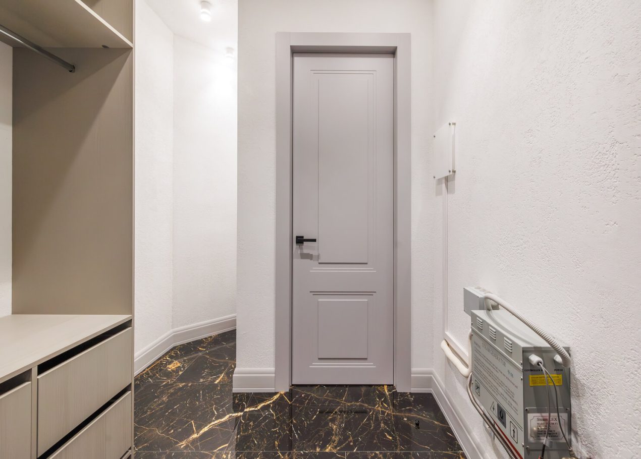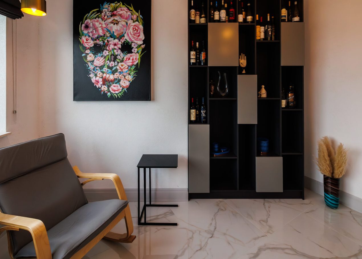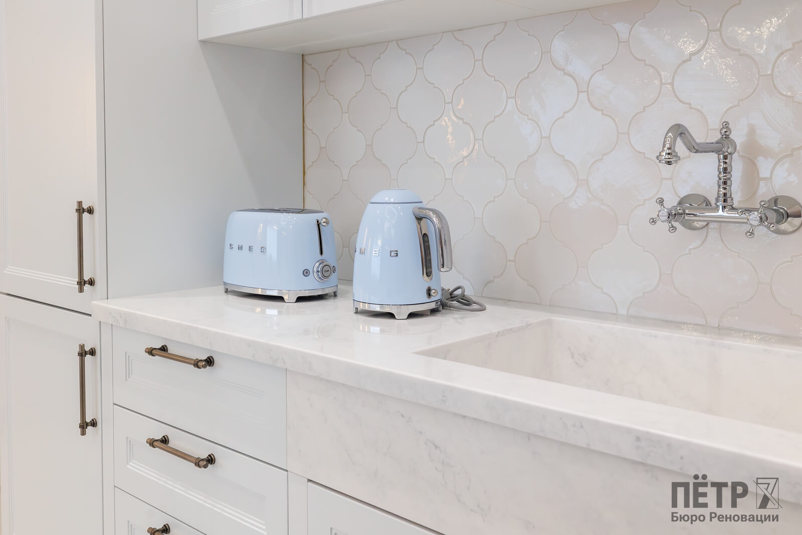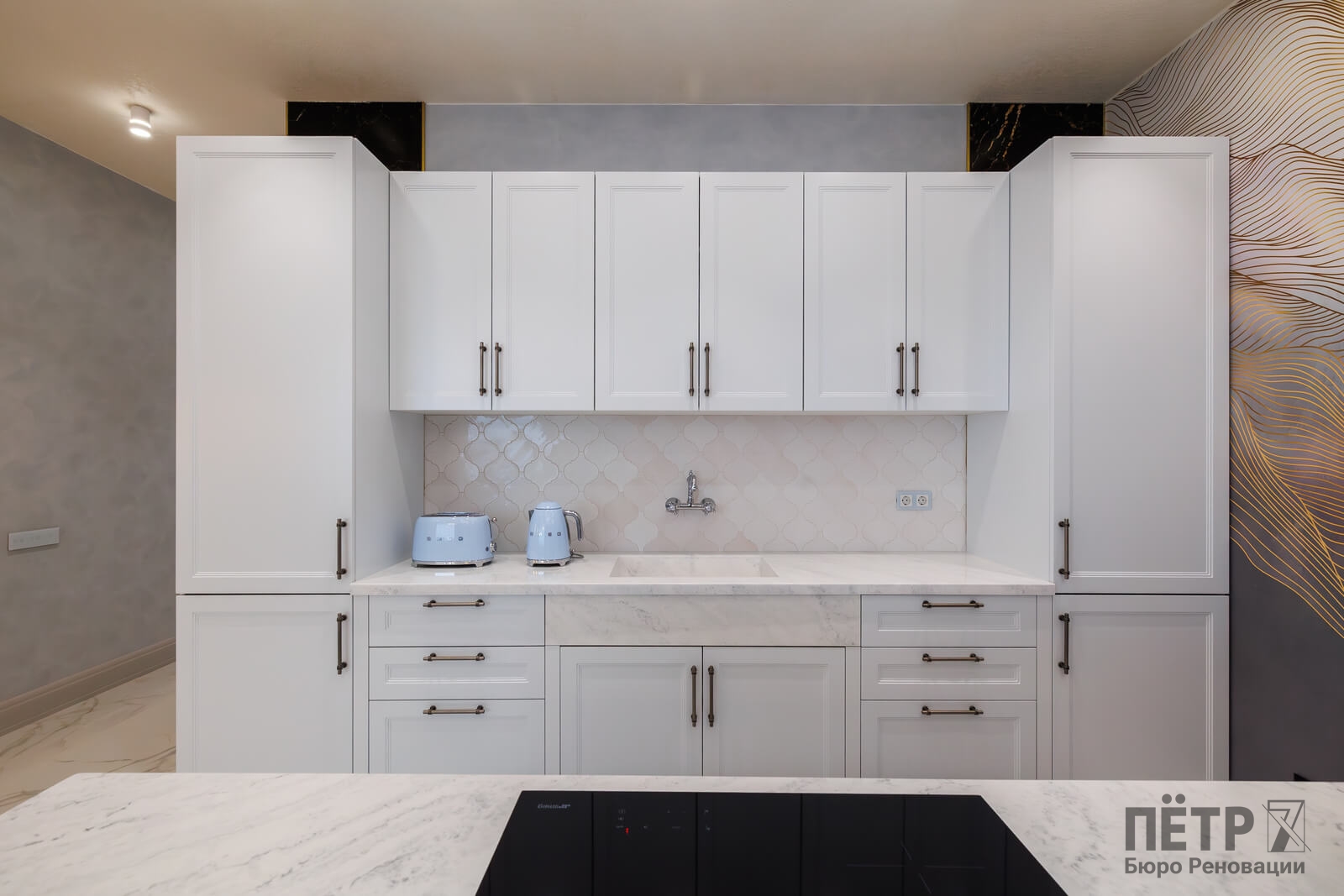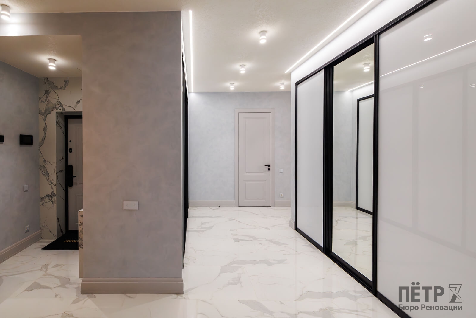 Планировка рассчитана на большую семью: три спальни, просторная кухня-гостиная, большой кабинет, прачечная, два санузла (один с хамамом) и большой холл. Входная группа усилена бронированной дверью с электронным замком. Проект реализовывался постепенно, так как квартира большая и требовала полноценного ремонта премиум-класса.