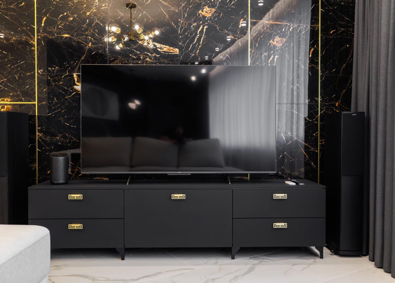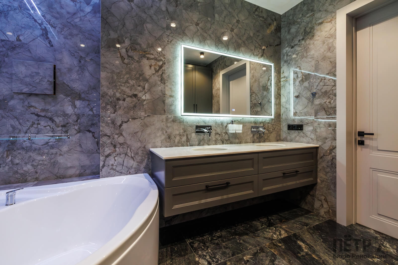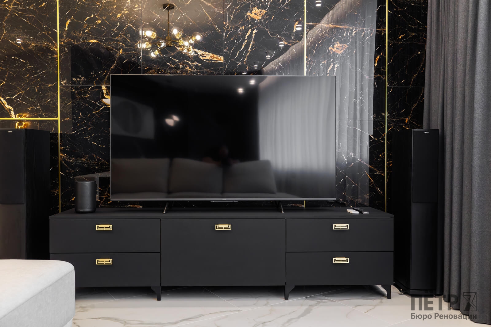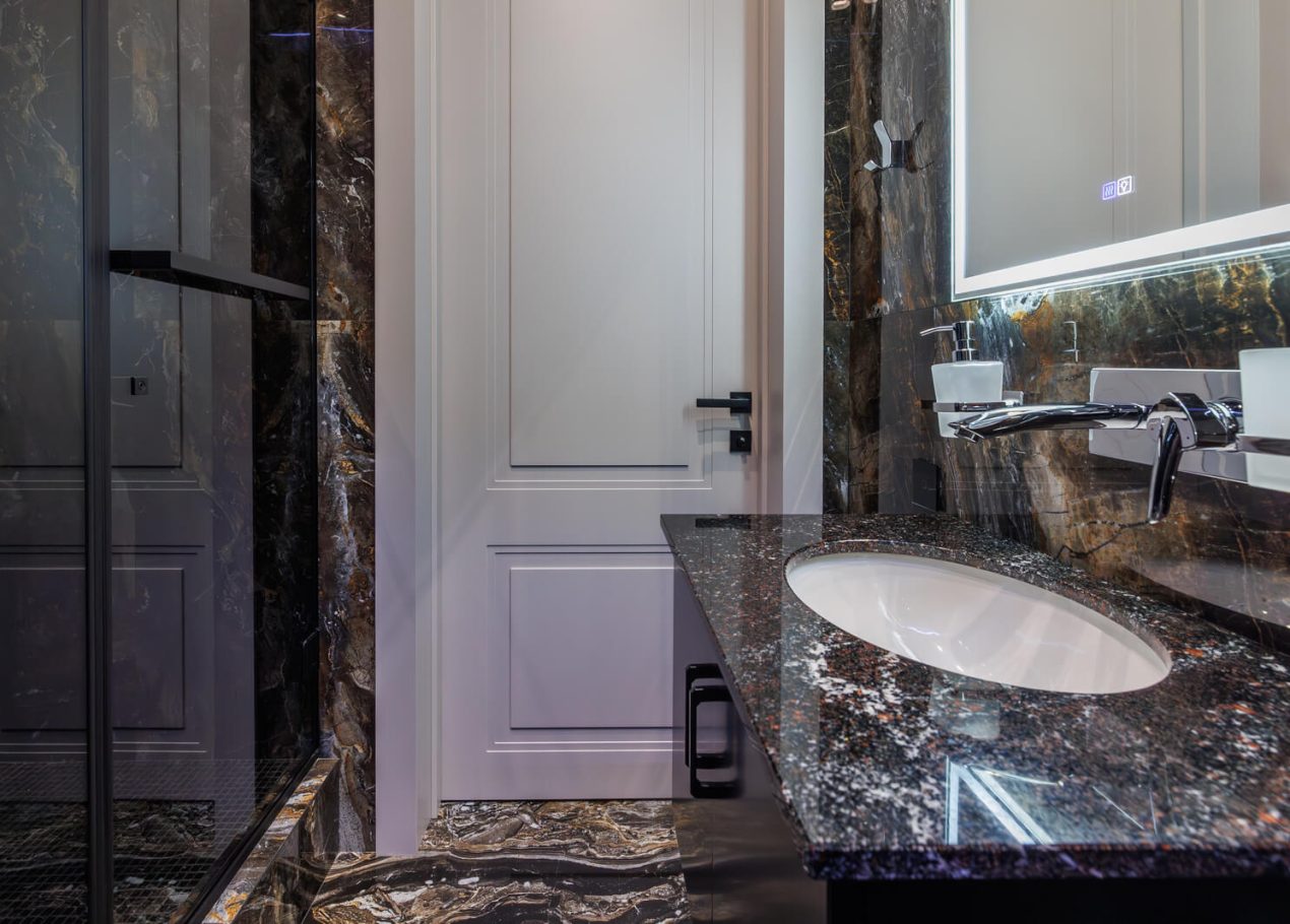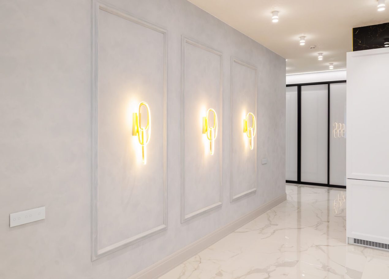 Планировка рассчитана на большую семью: три спальни, просторная кухня-гостиная, большой кабинет, прачечная, два санузла (один с хамамом) и большой холл. Входная группа усилена бронированной дверью с электронным замком. Проект реализовывался постепенно, так как квартира большая и требовала полноценного ремонта премиум-класса.
