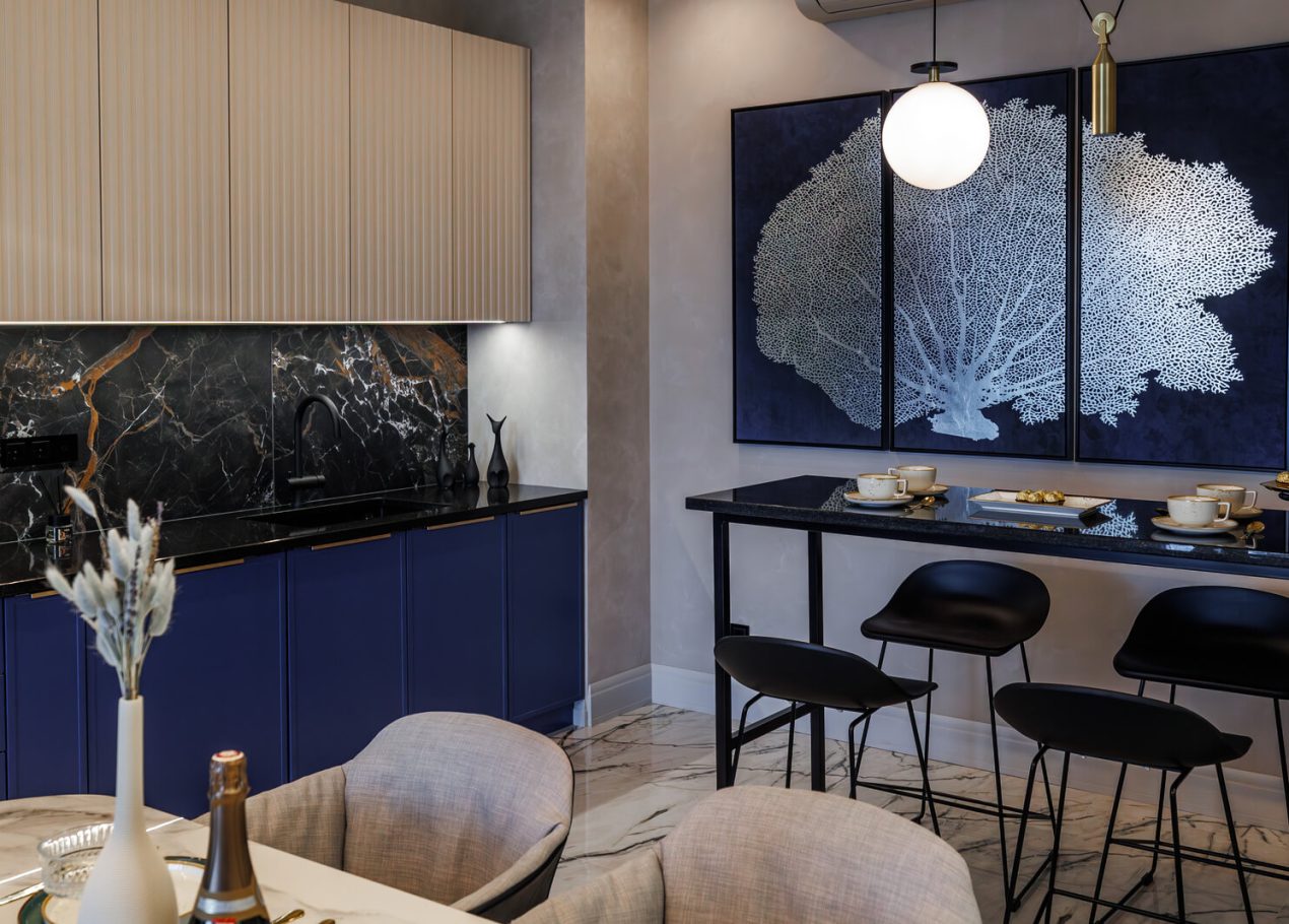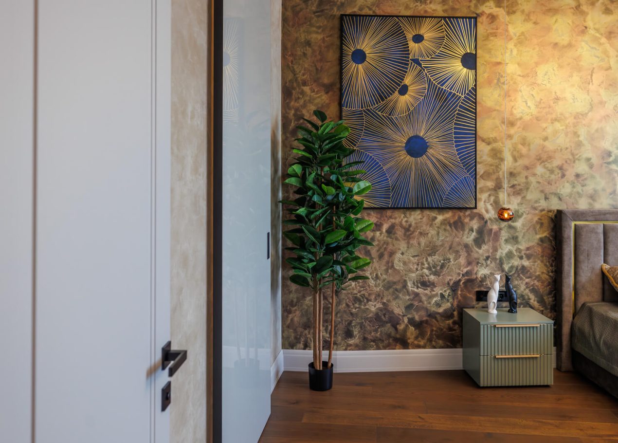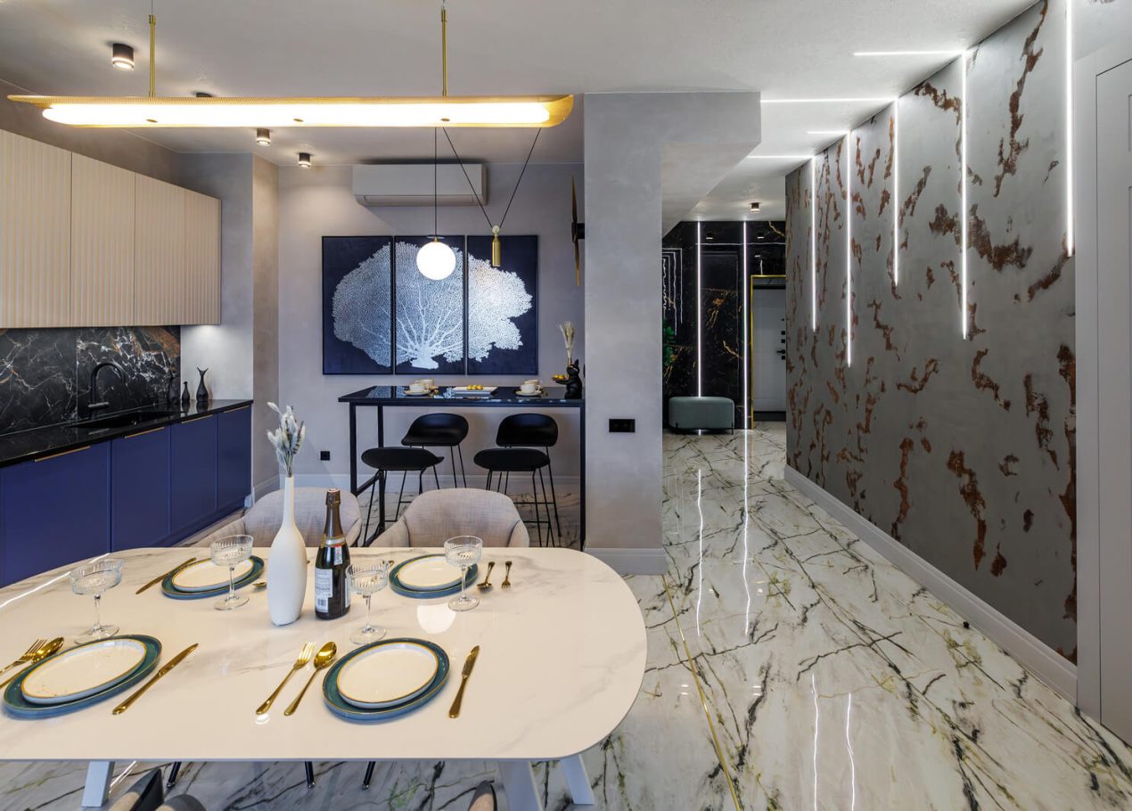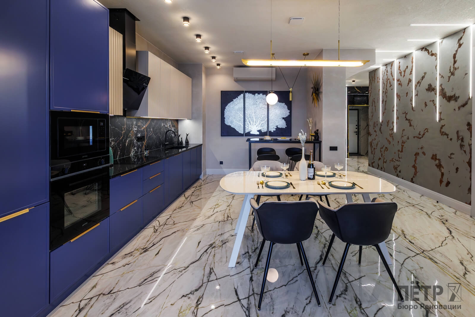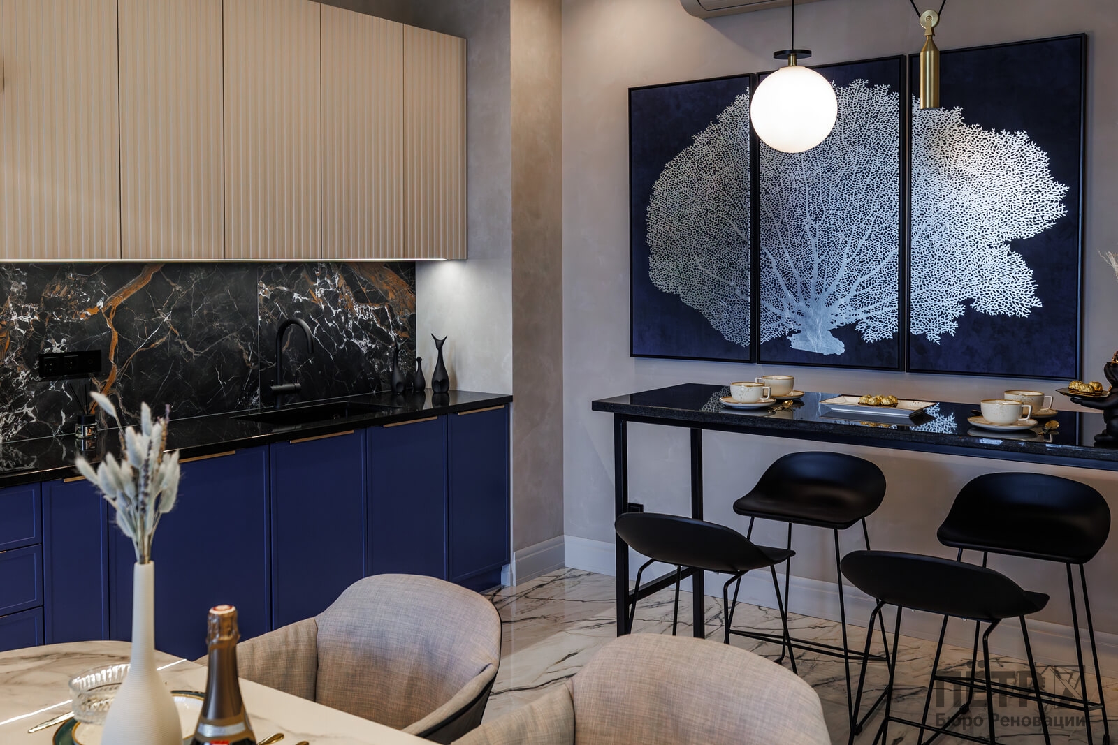Проект реализован в небоскрёбе ЖК «Лазурные небеса» в Казани на 31 этаже с панорамным видом на город. Квартира площадью 130 м² была куплена по выгодной цене за квадратный метр в период, когда условия по ипотеке ещё были максимально комфортными, что позволило оптимизировать инвестиции в проект.