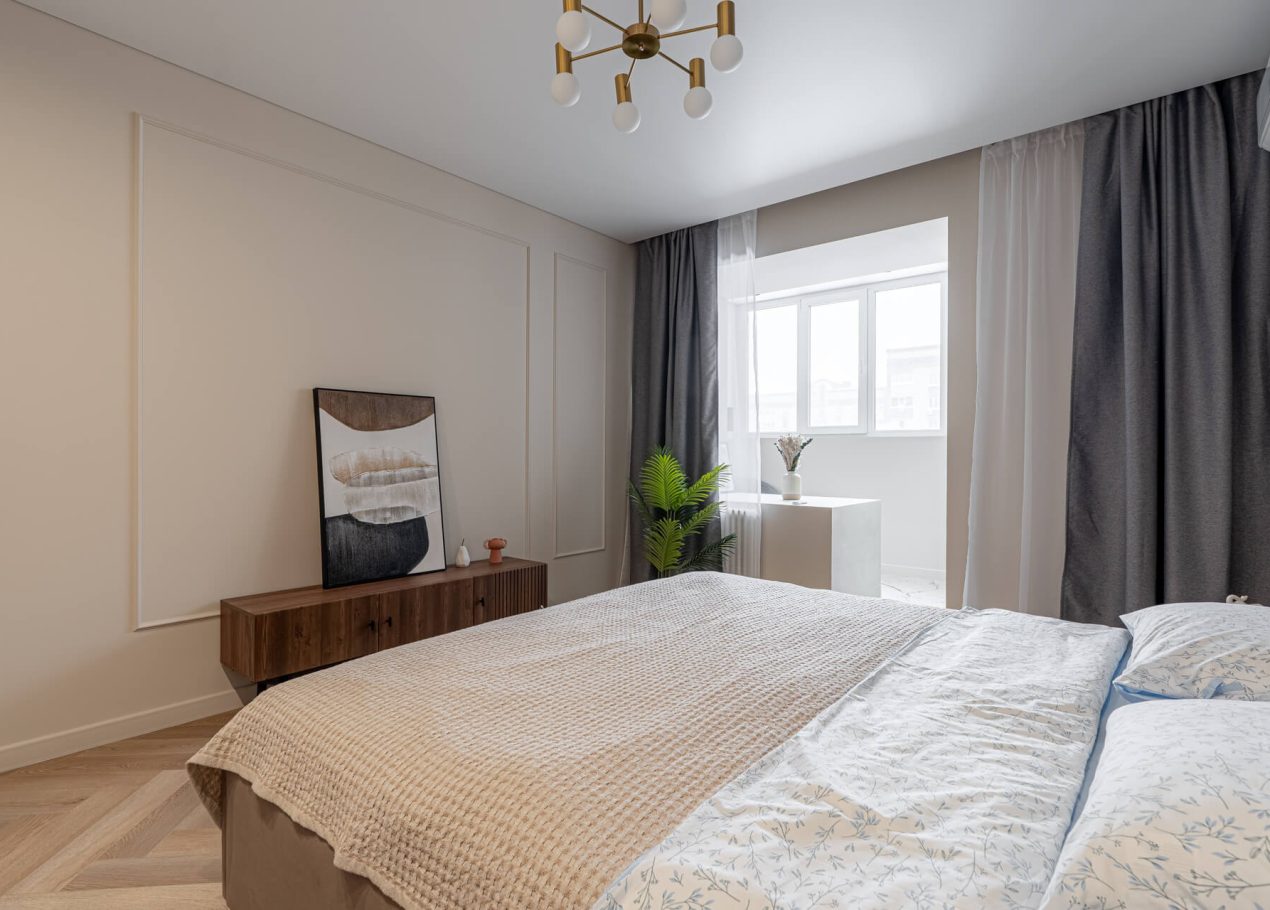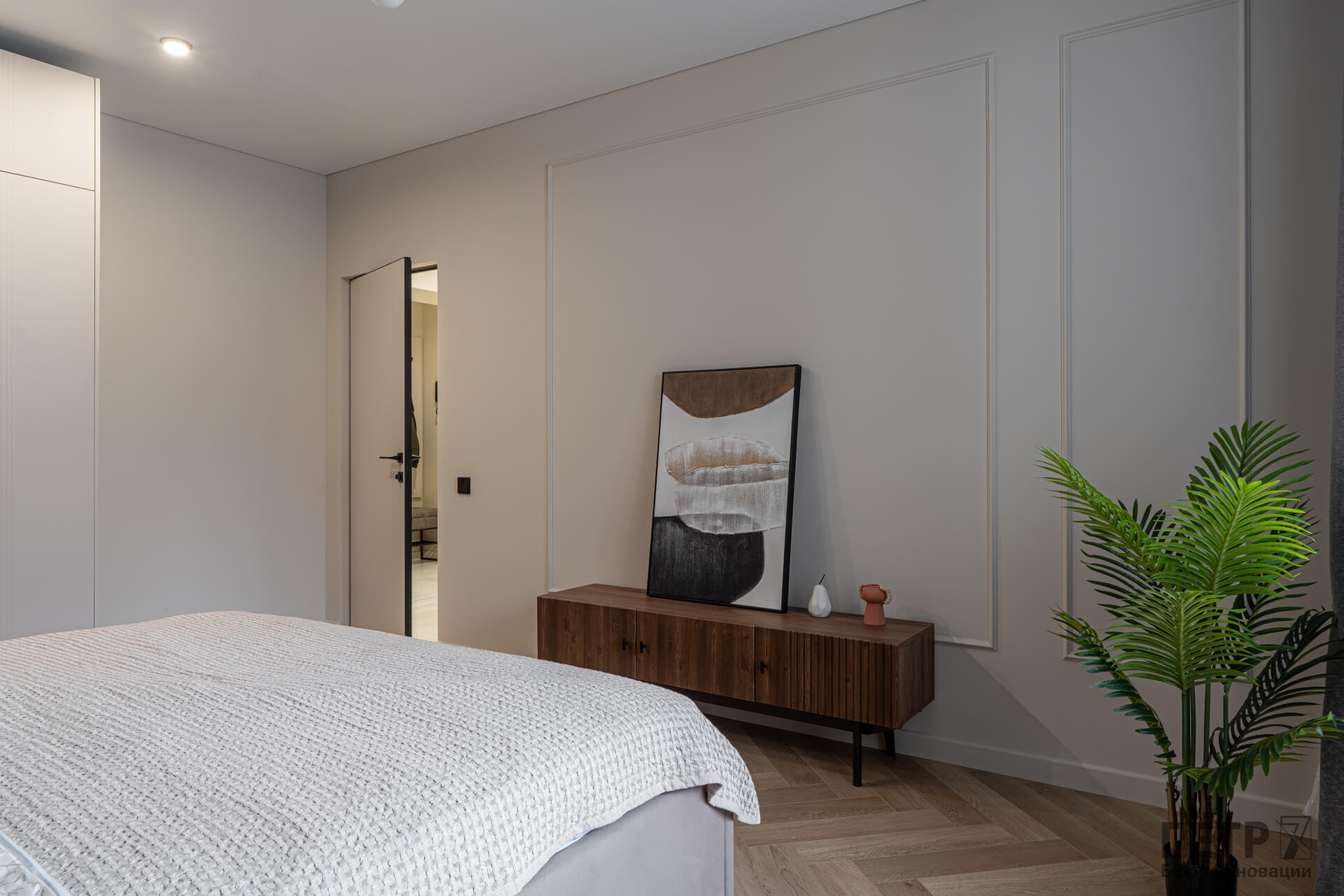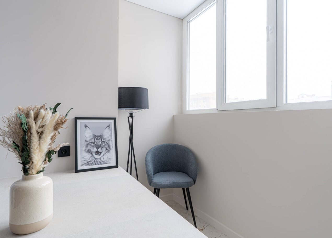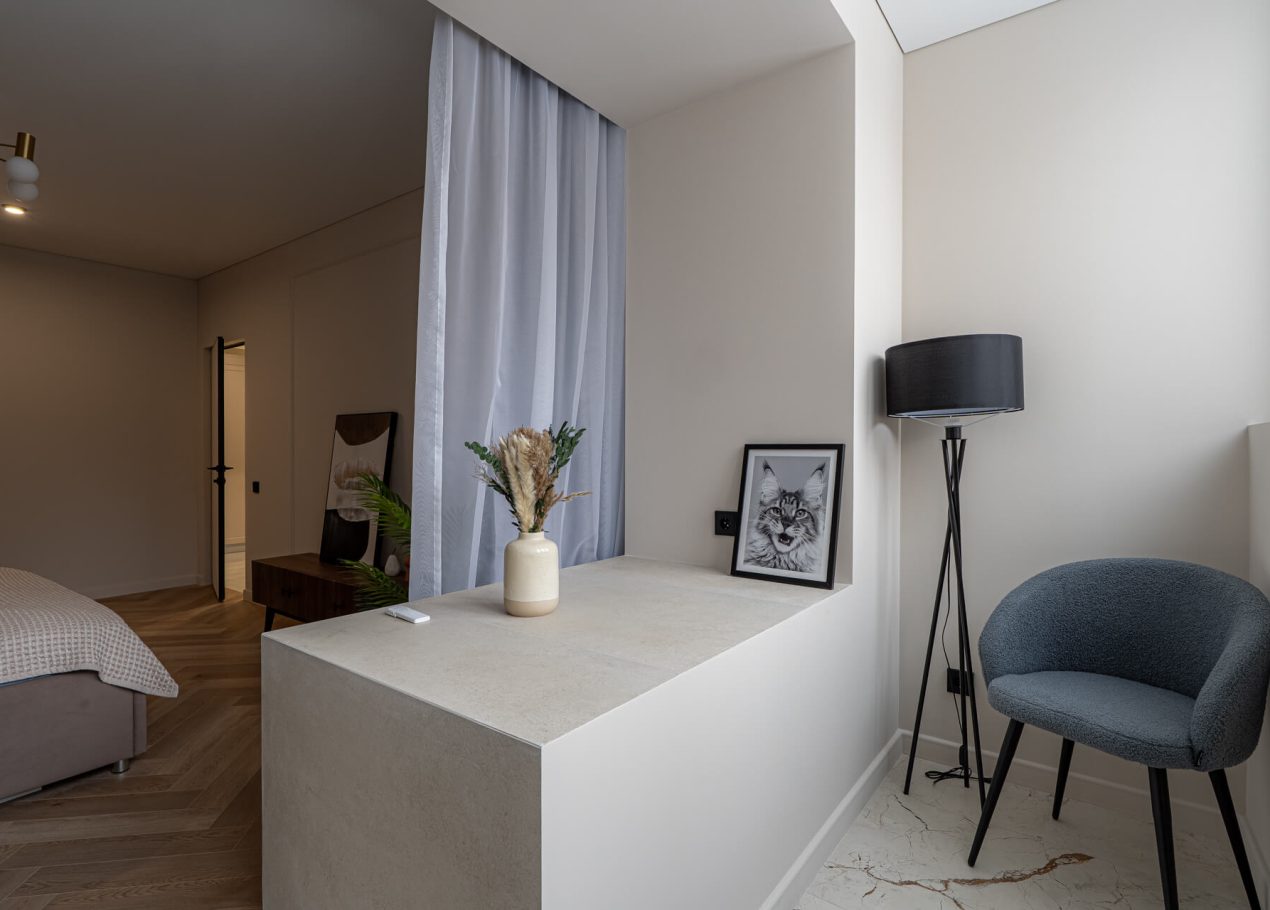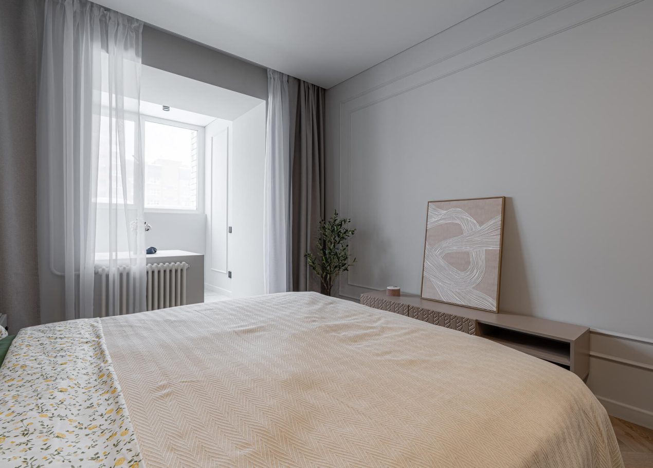 Главной задачей проекта стала грамотная перепланировка и увеличение полезной площади квартиры. В квартире было два балкона, которые мы утеплили и присоединили к комнатам. За счёт этого удалось добавить около 10 м² полезного пространства, что напрямую повлияло на итоговую стоимость квартиры.