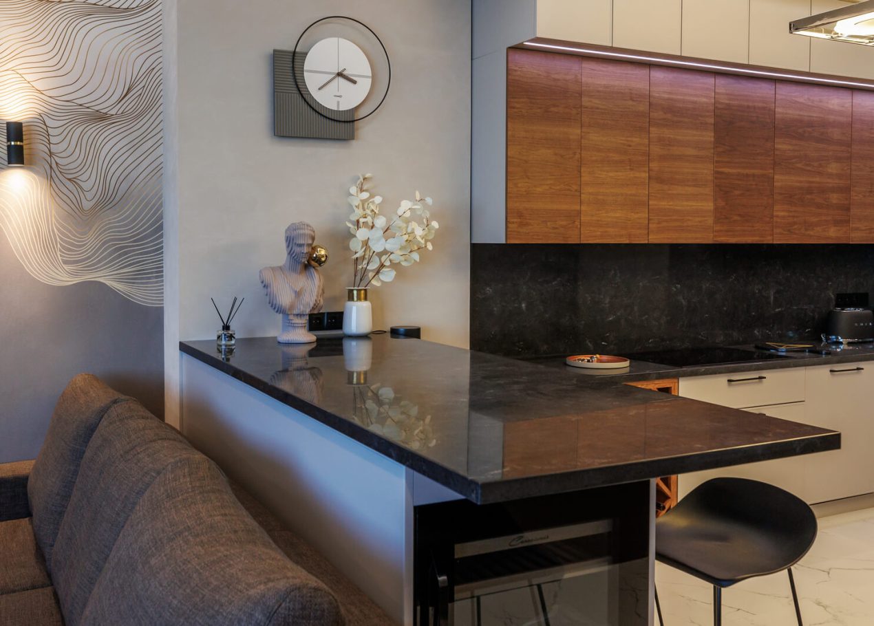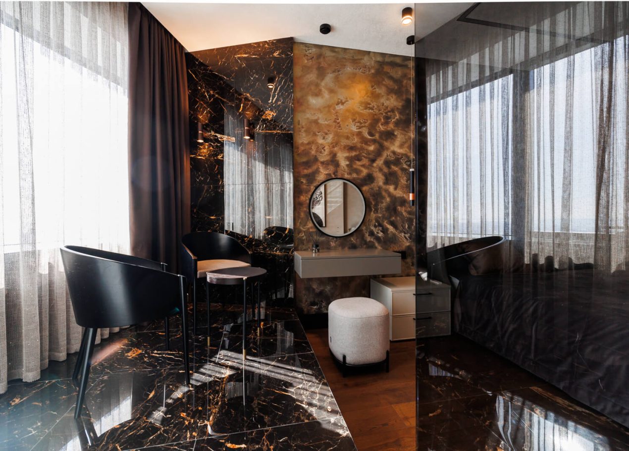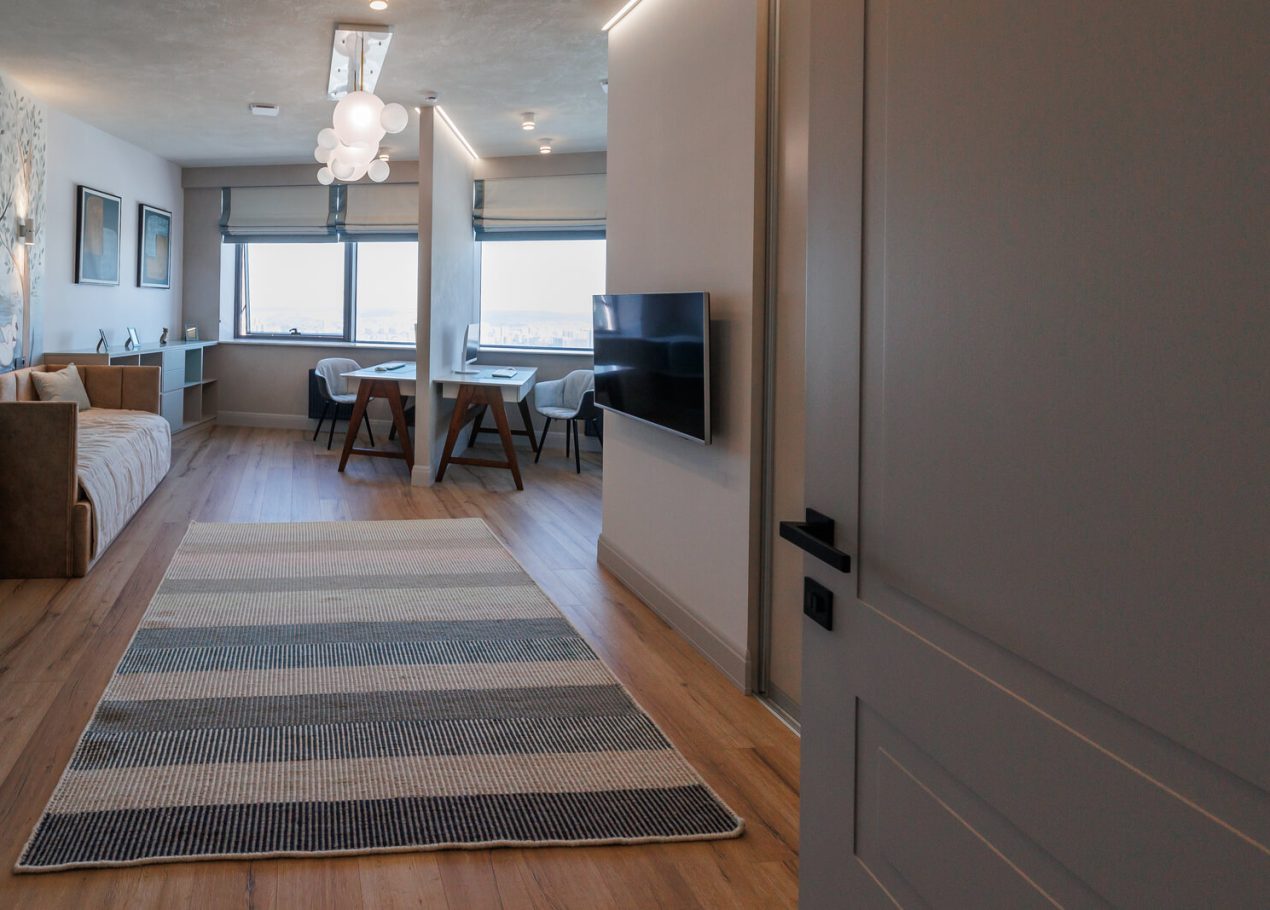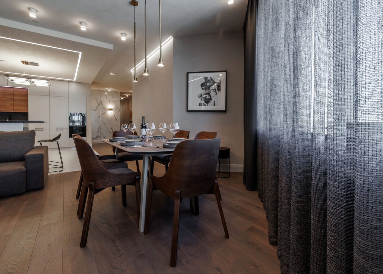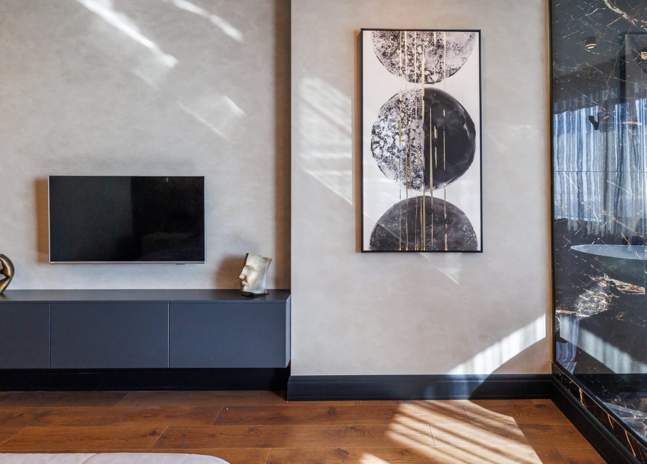Мы реализовали объект под ключ: организовали процесс, выстроили взаимодействие подрядчиков, обеспечили строгий контроль качества и сроков. В результате интерьер подчеркнул статус квартиры в небоскрёбе — современный, масштабный и продуманный до мелочей, полностью соответствующий ожиданиям семьи.