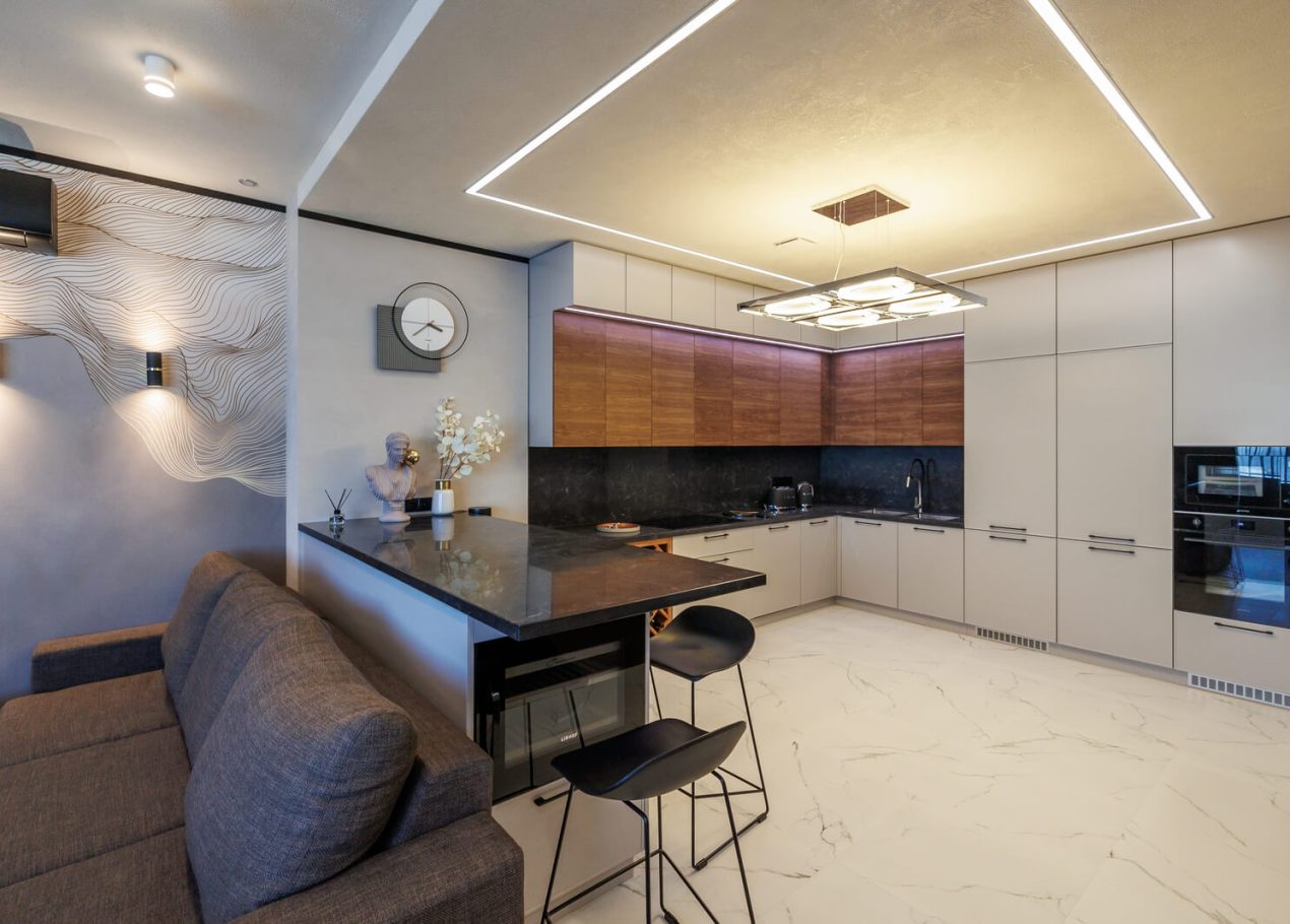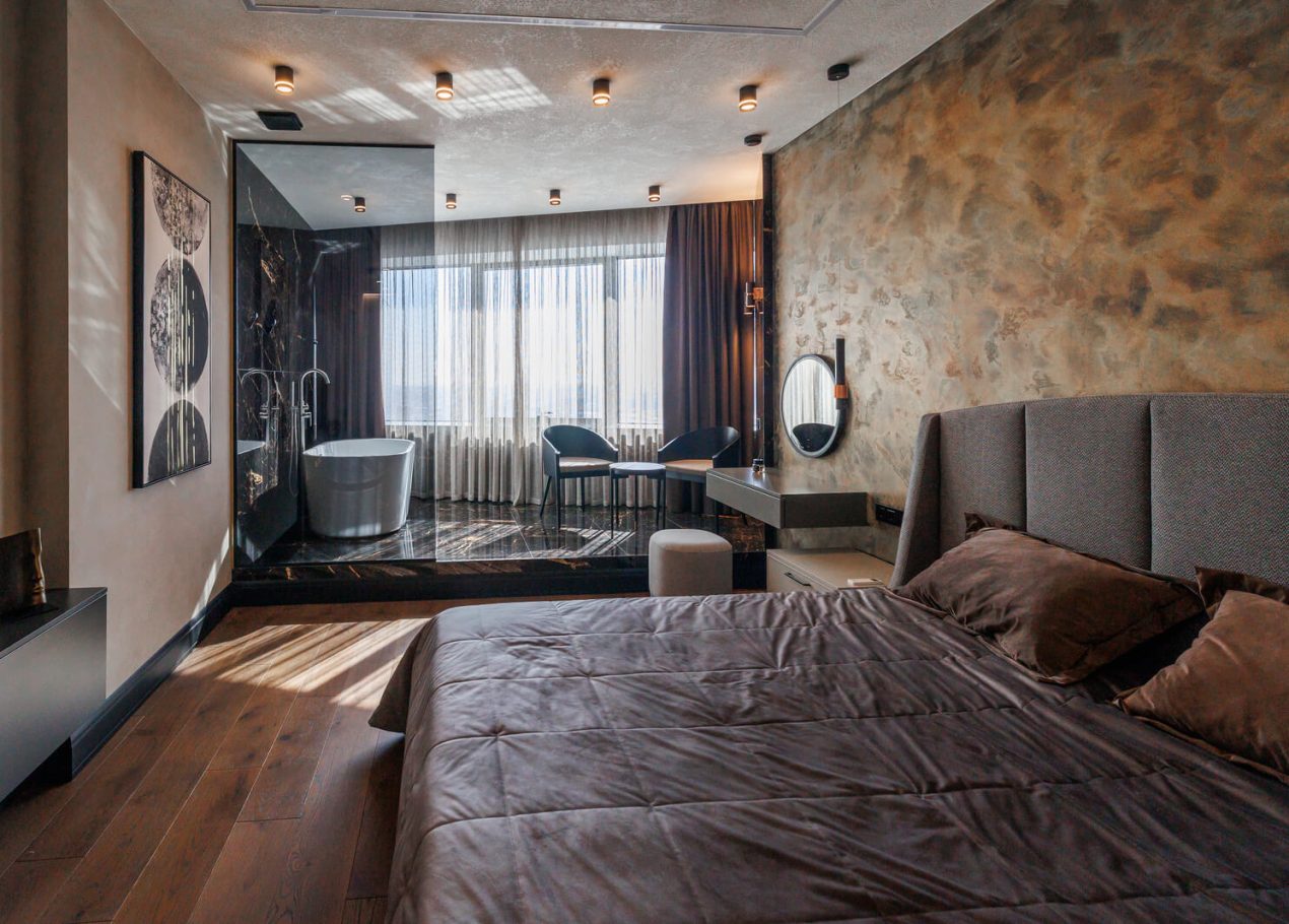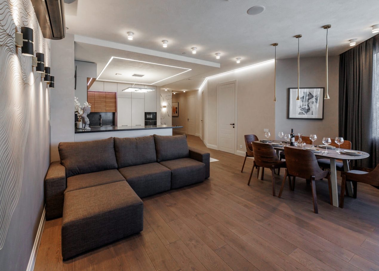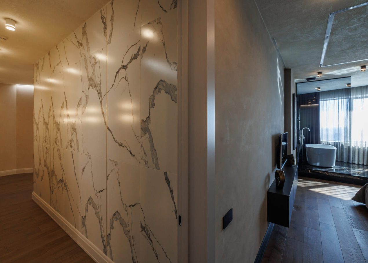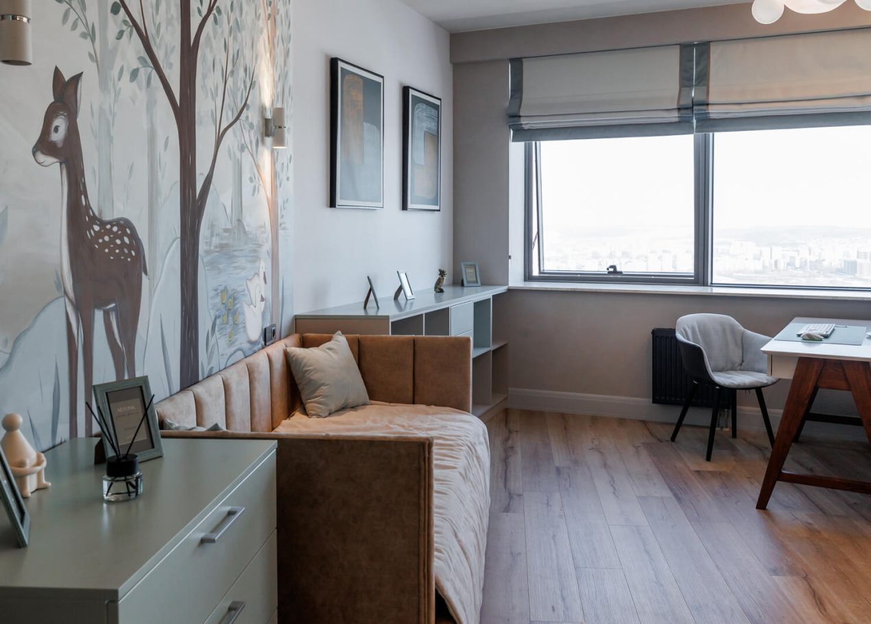 Мы реализовали объект под ключ: организовали процесс, выстроили взаимодействие подрядчиков, обеспечили строгий контроль качества и сроков. В результате интерьер подчеркнул статус квартиры в небоскрёбе — современный, масштабный и продуманный до мелочей, полностью соответствующий ожиданиям семьи.
