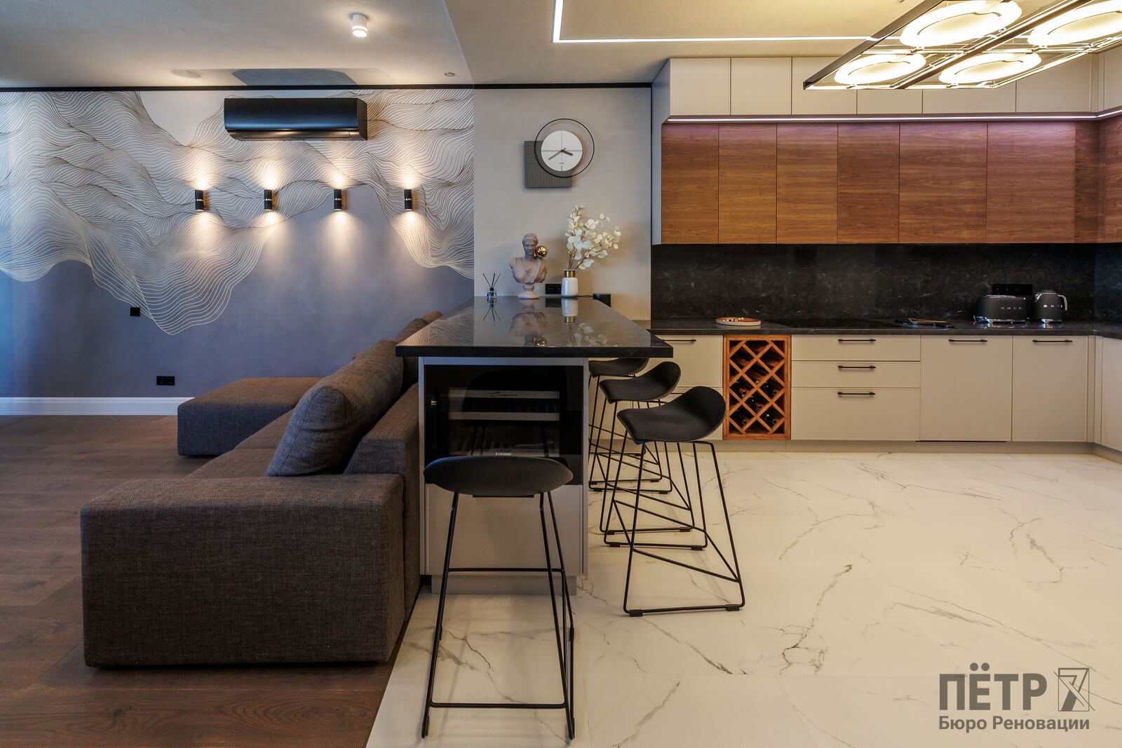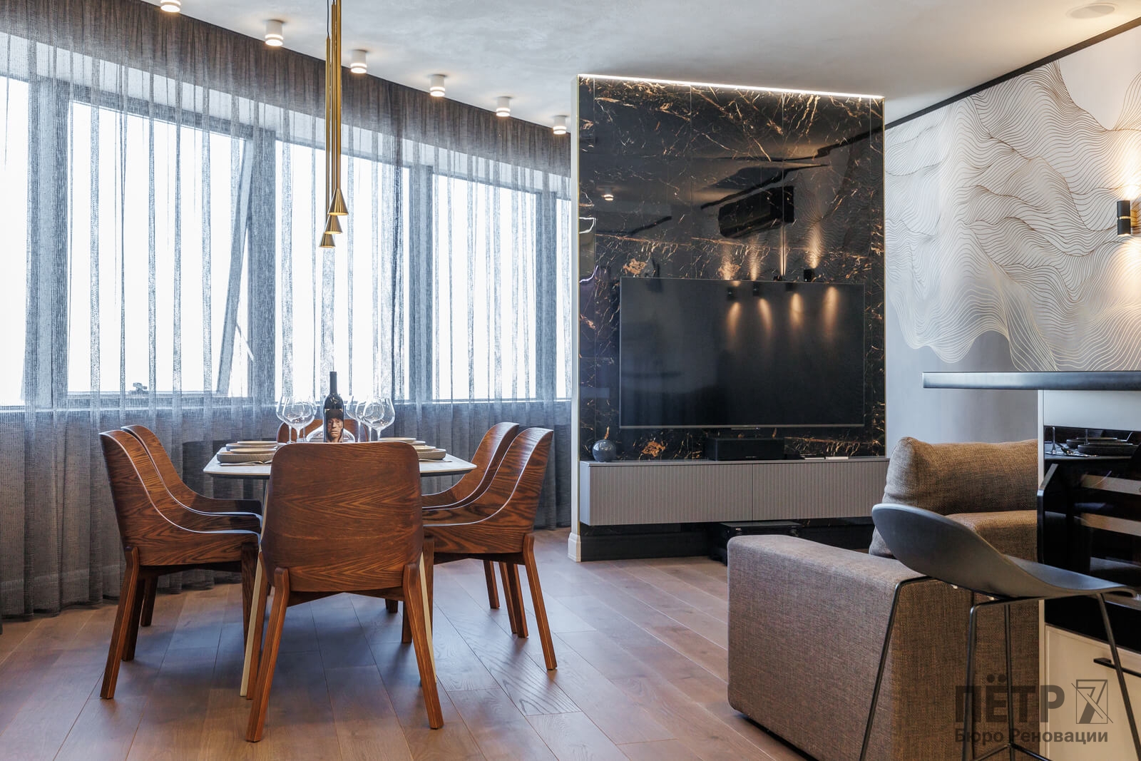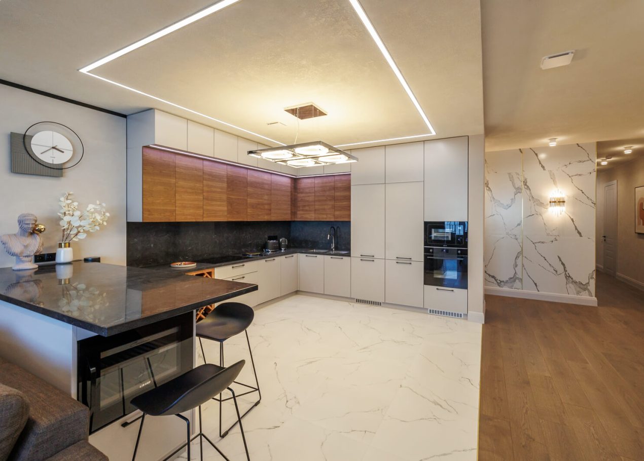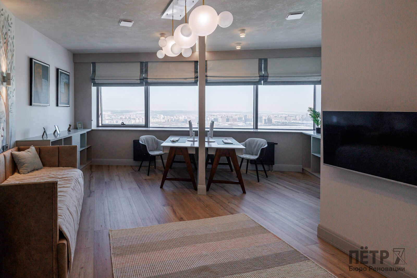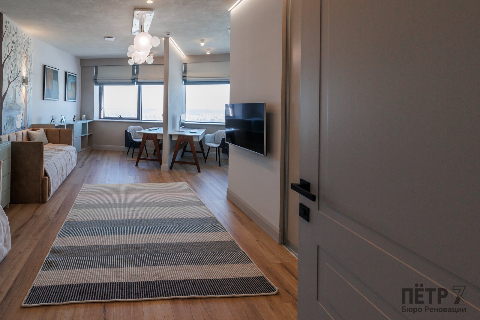 Мы реализовали объект под ключ: организовали процесс, выстроили взаимодействие подрядчиков, обеспечили строгий контроль качества и сроков. В результате интерьер подчеркнул статус квартиры в небоскрёбе — современный, масштабный и продуманный до мелочей, полностью соответствующий ожиданиям семьи.