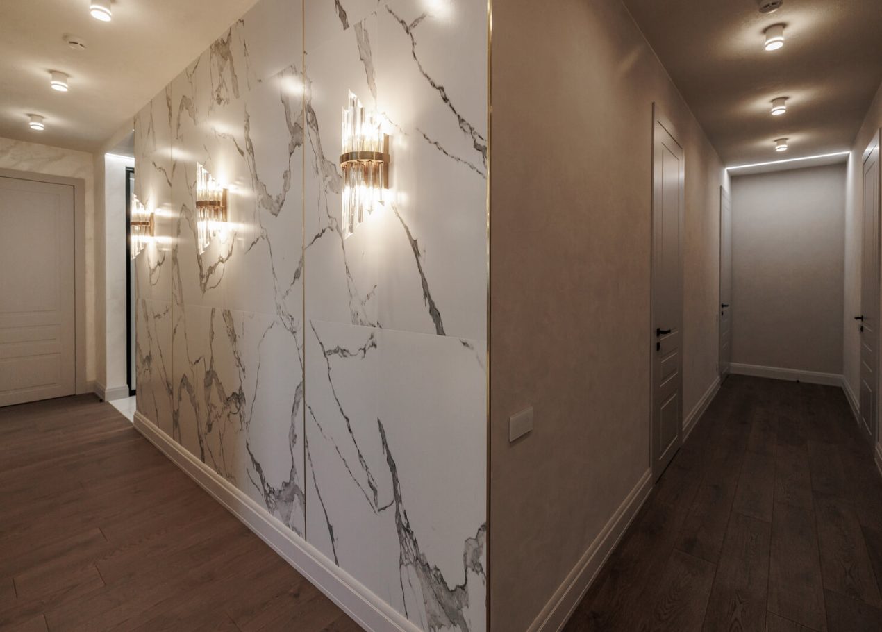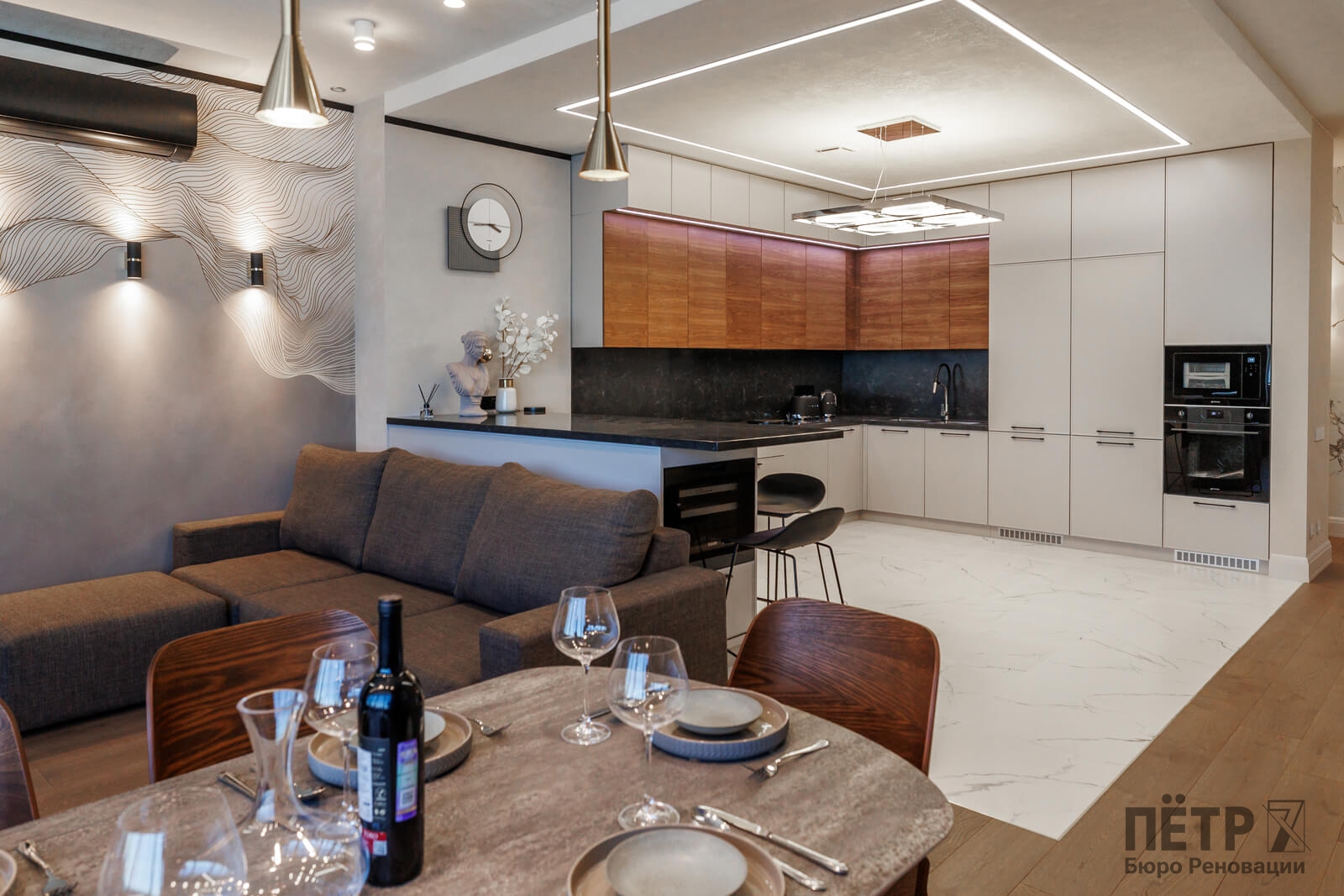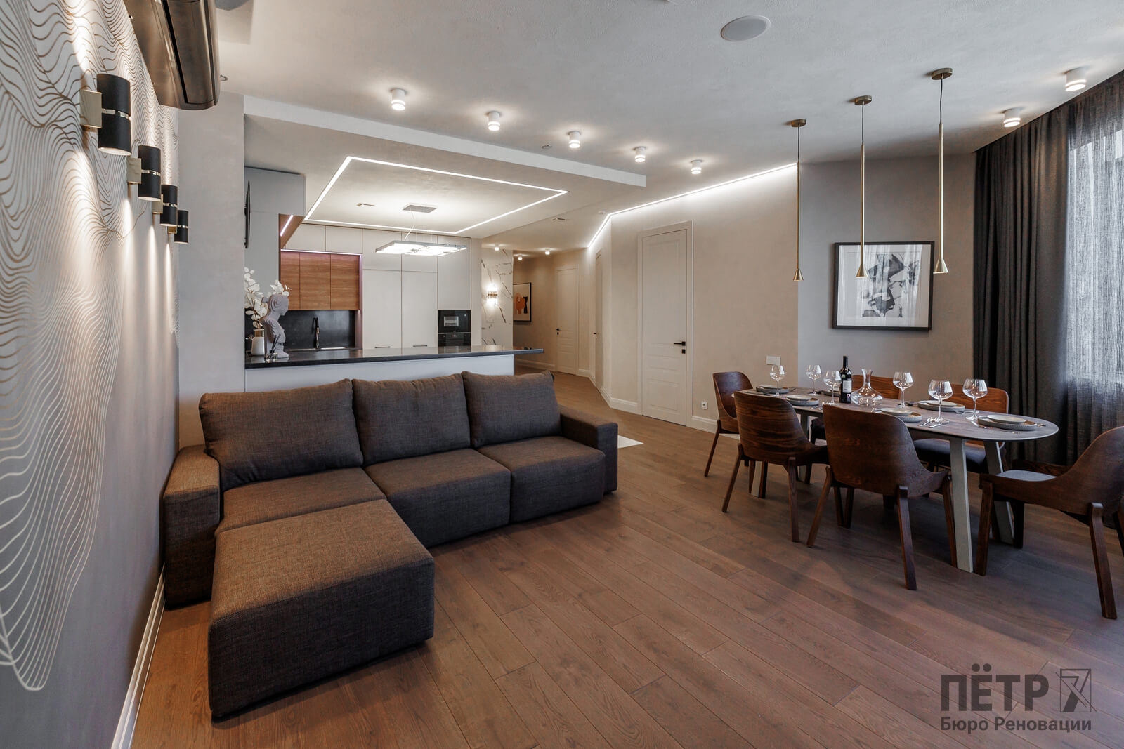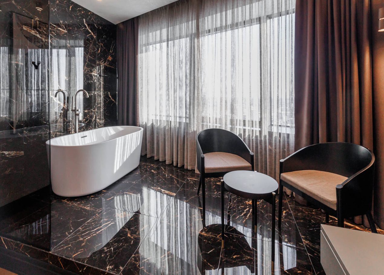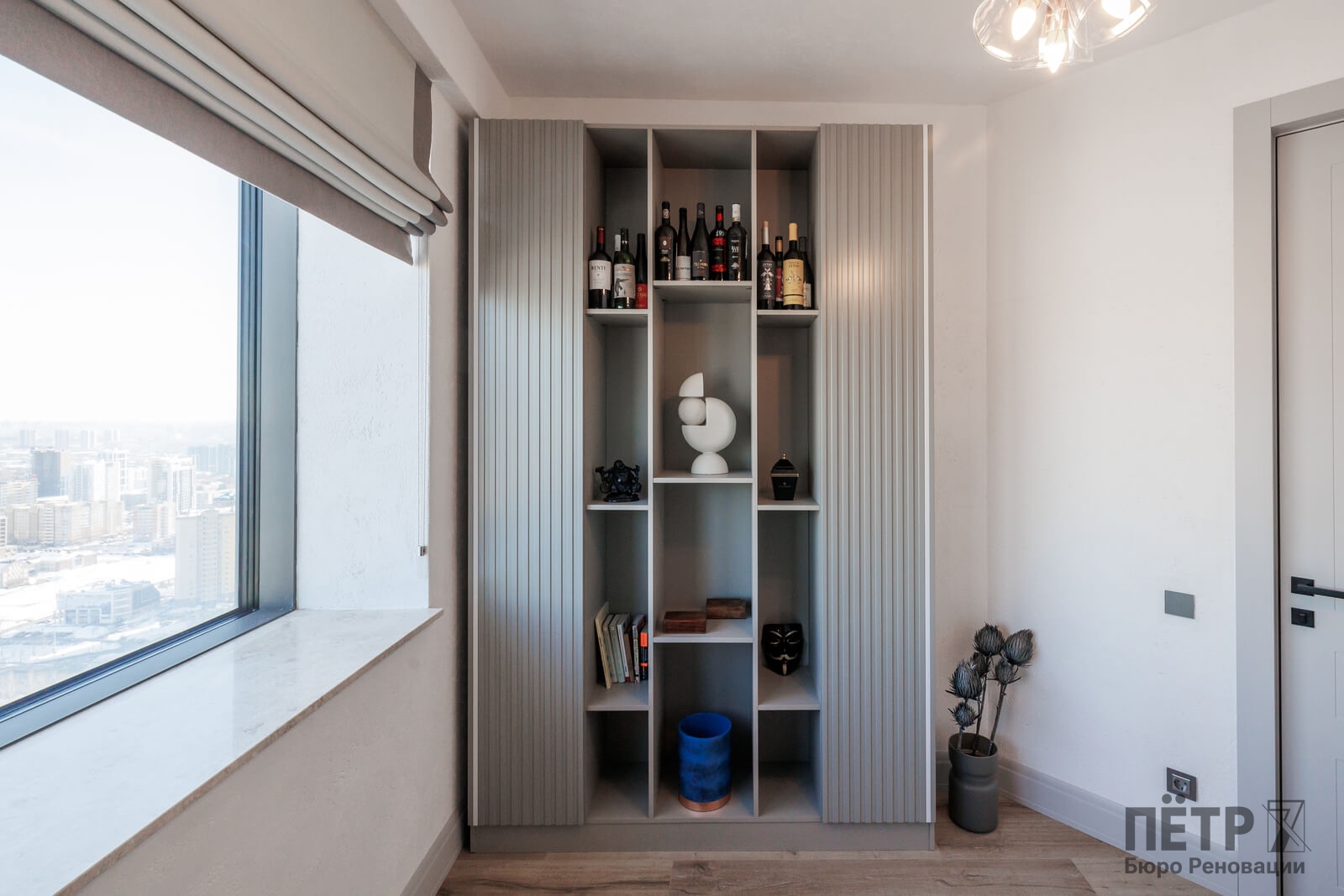 Мы реализовали объект под ключ: организовали процесс, выстроили взаимодействие подрядчиков, обеспечили строгий контроль качества и сроков. В результате интерьер подчеркнул статус квартиры в небоскрёбе — современный, масштабный и продуманный до мелочей, полностью соответствующий ожиданиям семьи.