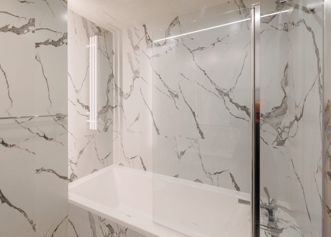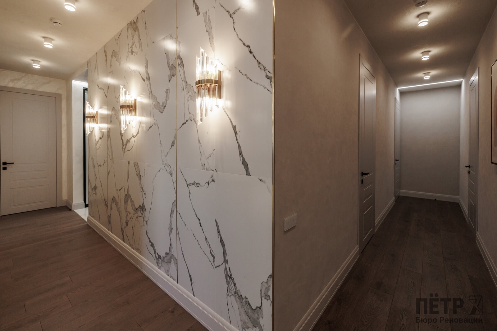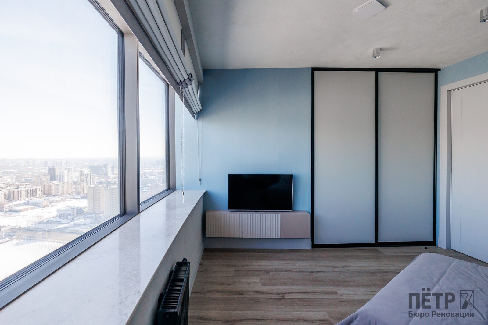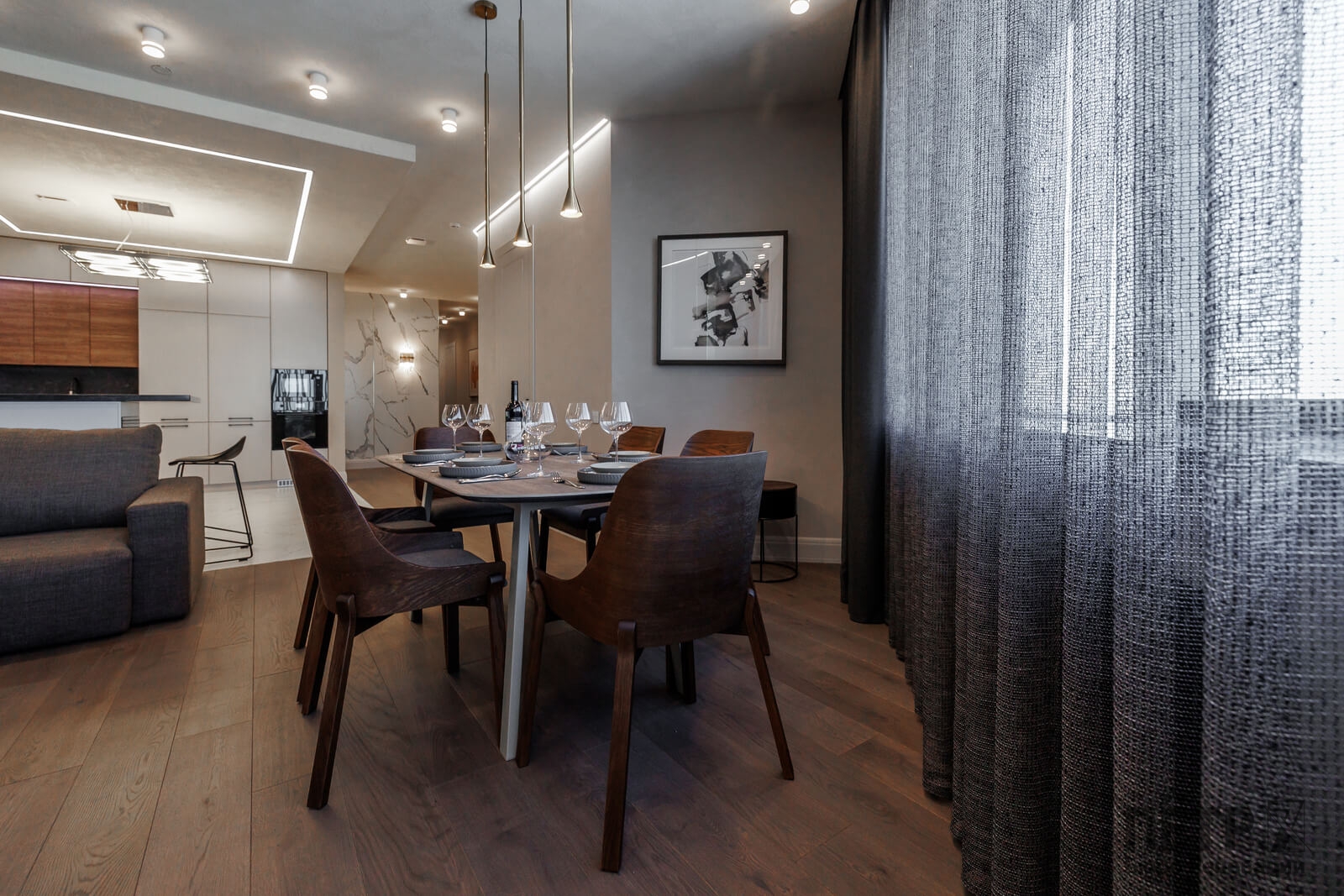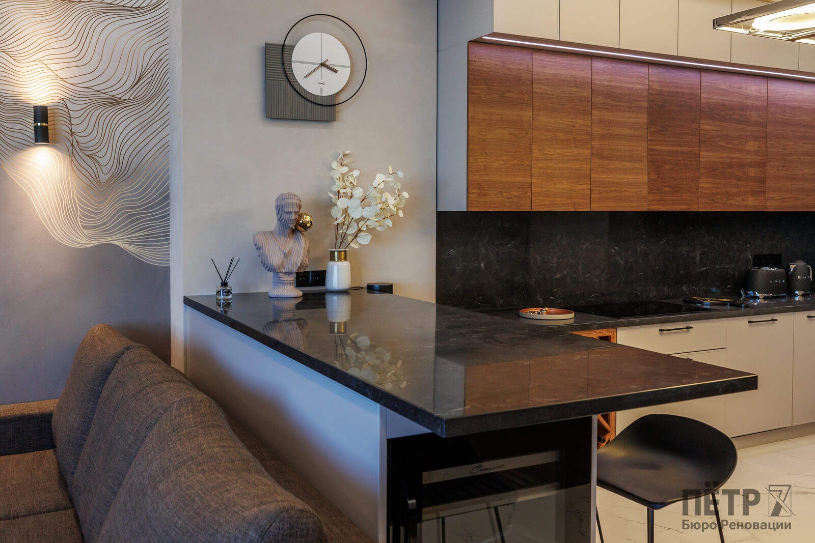 Мы реализовали объект под ключ: организовали процесс, выстроили взаимодействие подрядчиков, обеспечили строгий контроль качества и сроков. В результате интерьер подчеркнул статус квартиры в небоскрёбе — современный, масштабный и продуманный до мелочей, полностью соответствующий ожиданиям семьи.