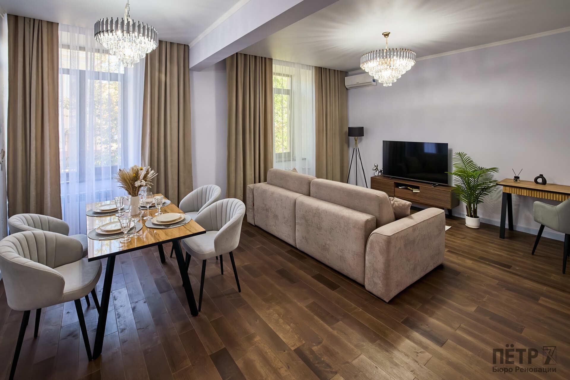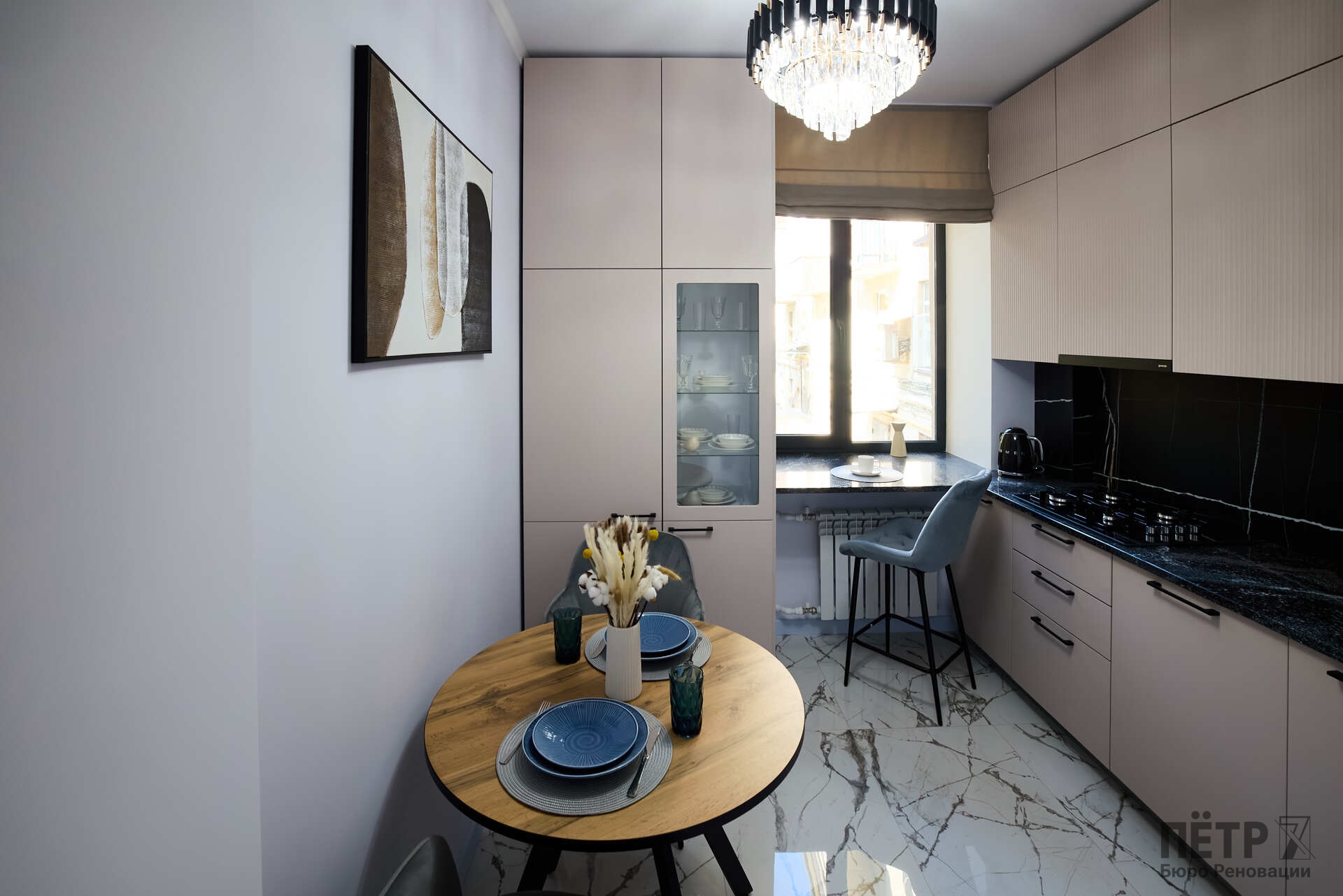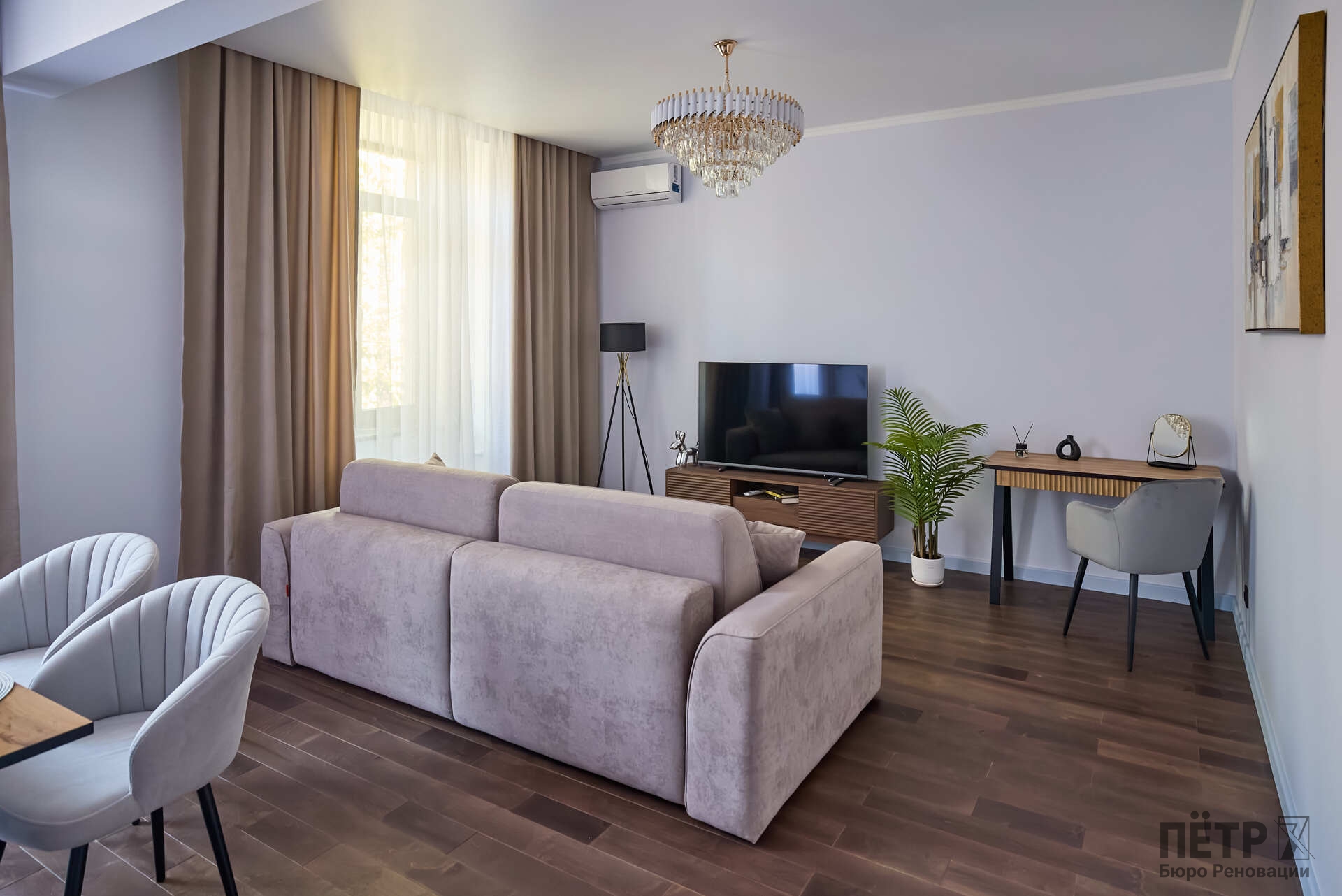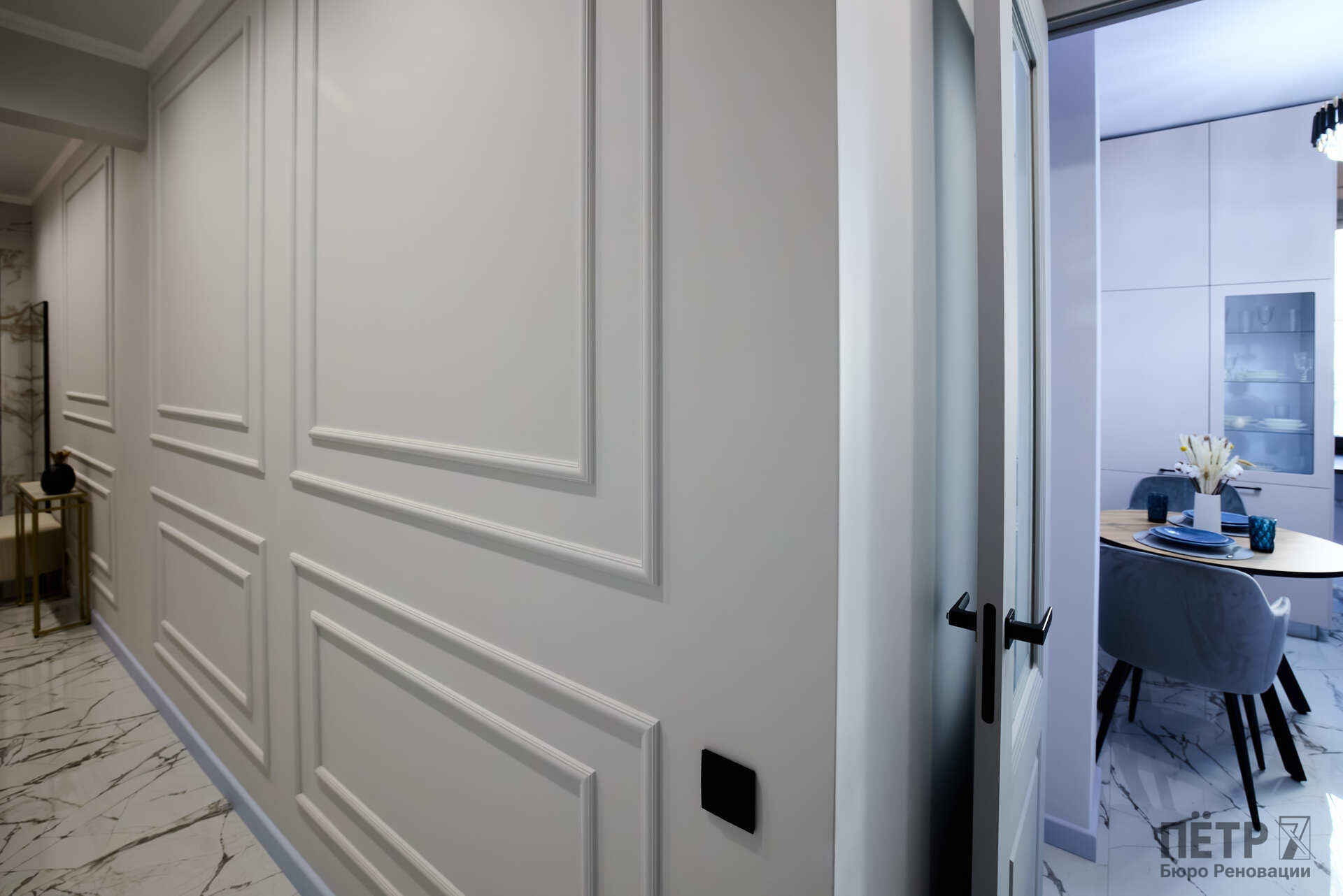 Параллельно решалась планировочная задача: сформировать комфортную мастер-зону и повысить функциональность пространства, сохранив характер сталинки. В результате получился продуманный интерьер с современной эргономикой и прозрачной реализацией — без перерасходов и отклонений от графика.