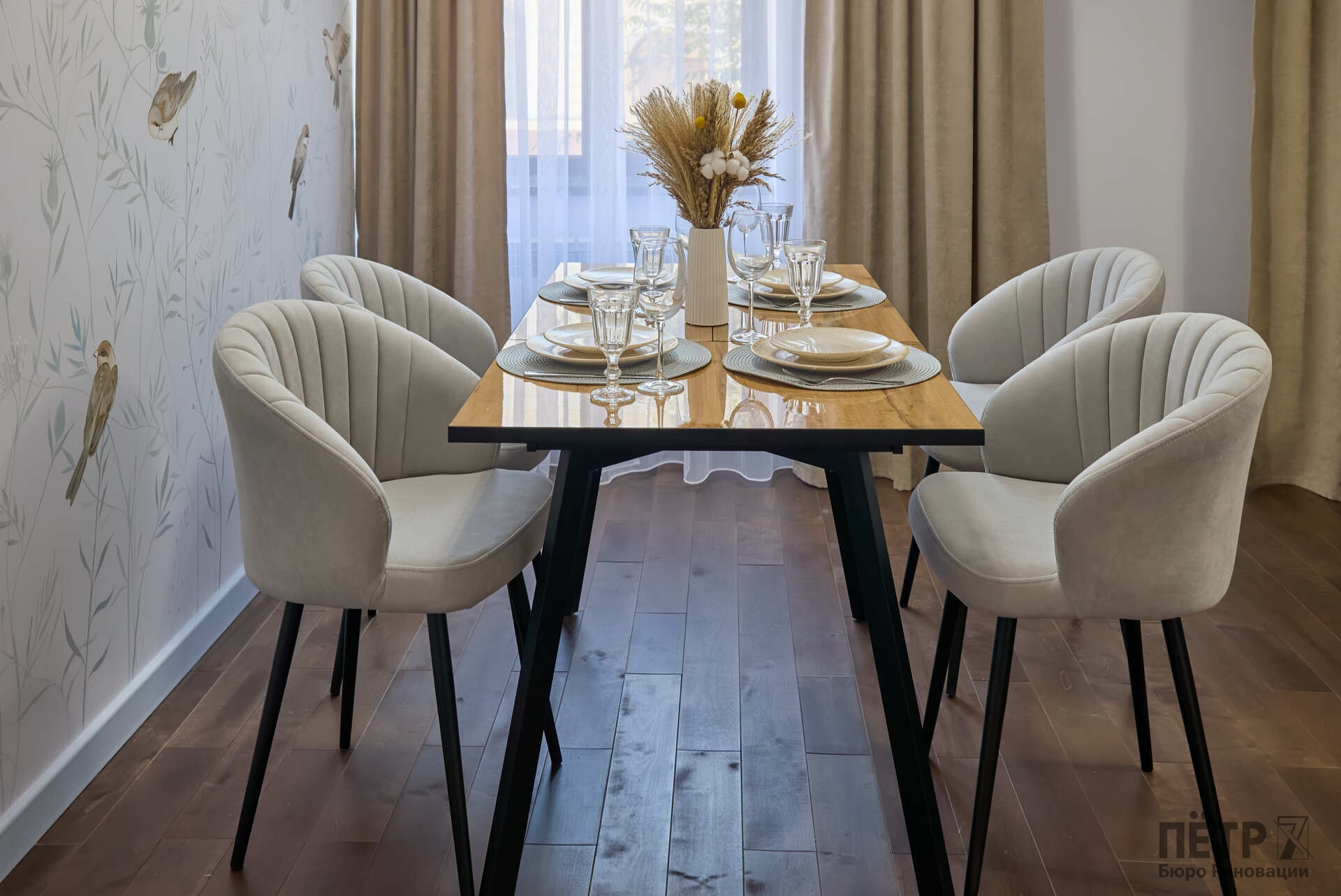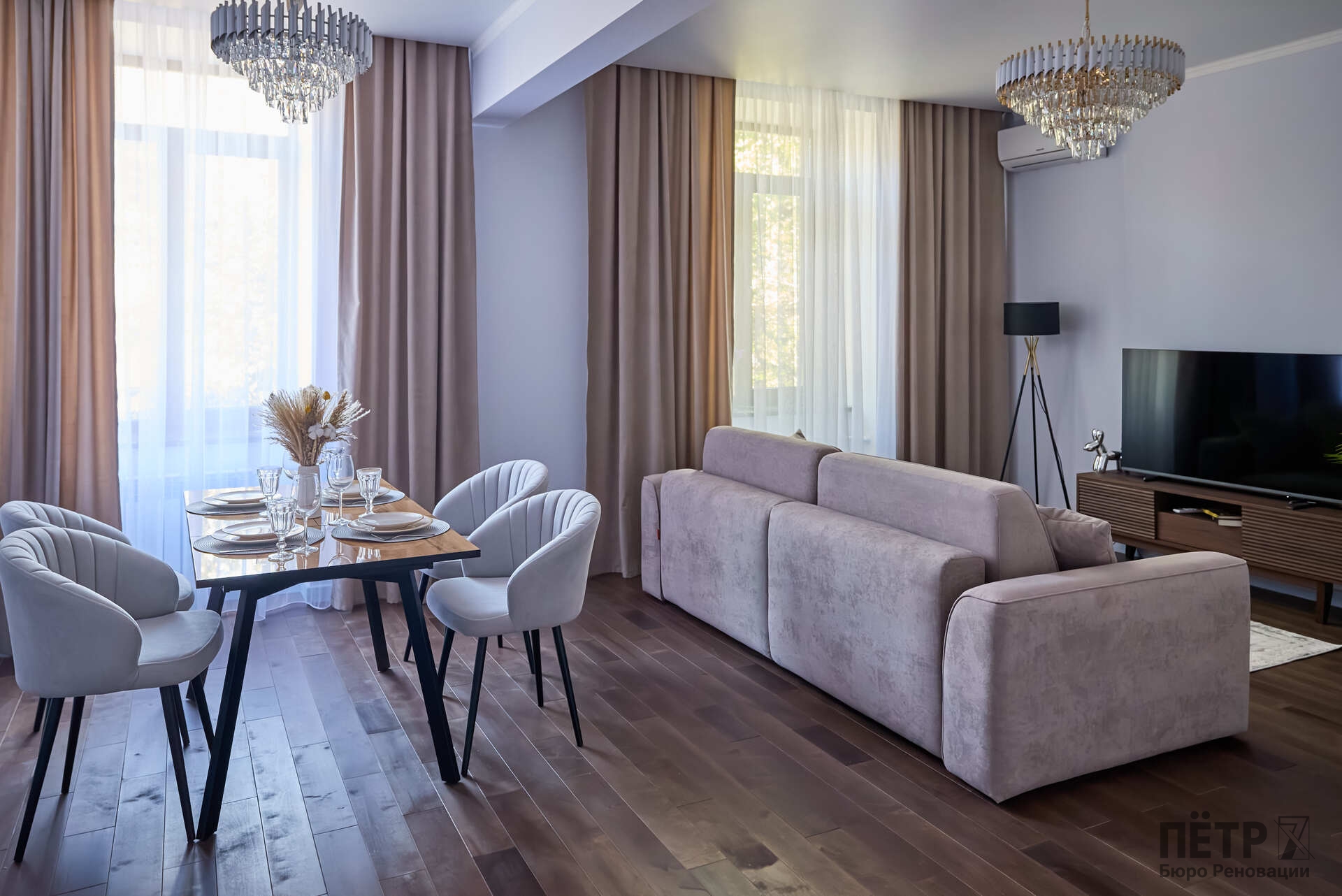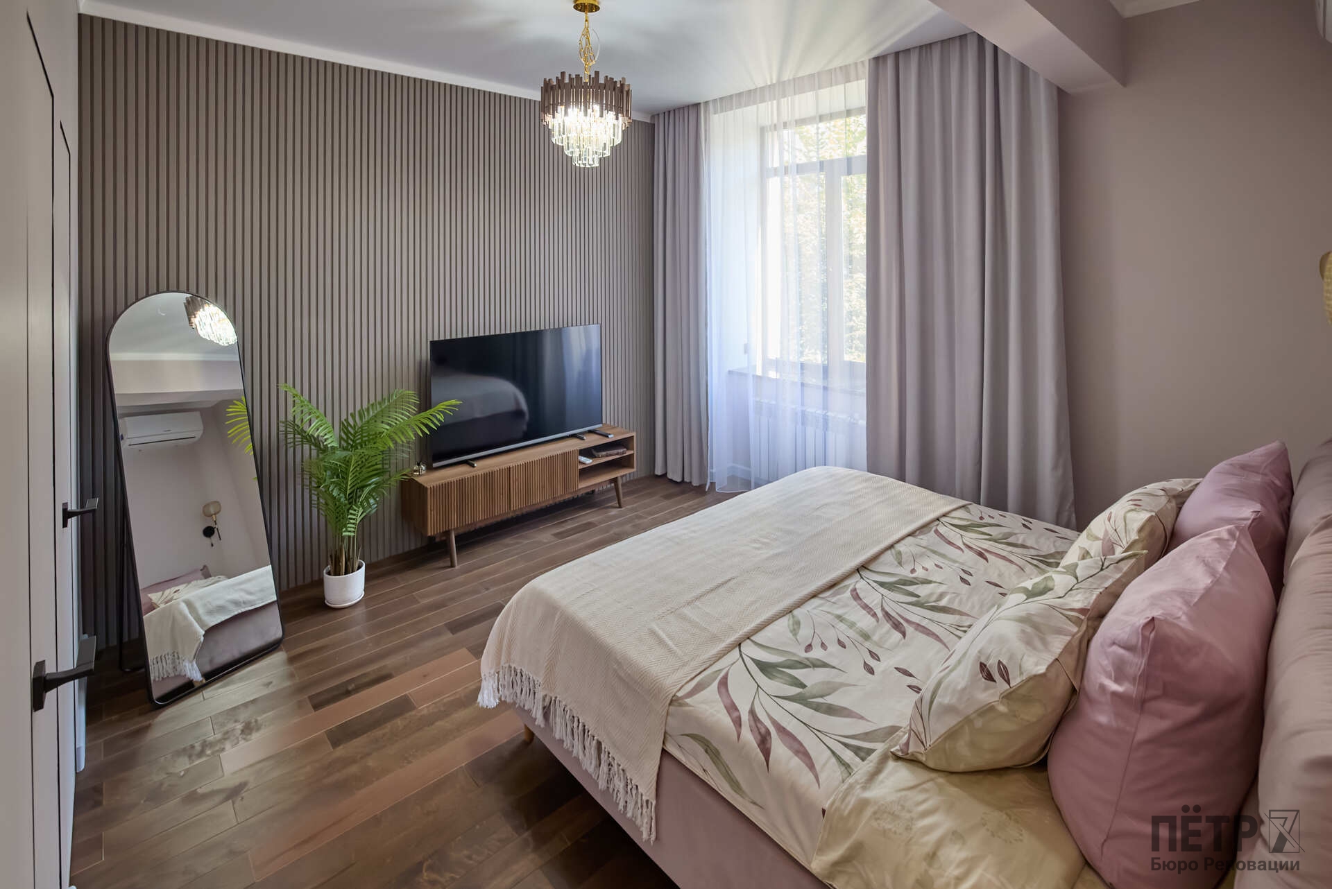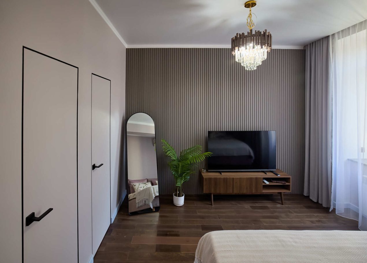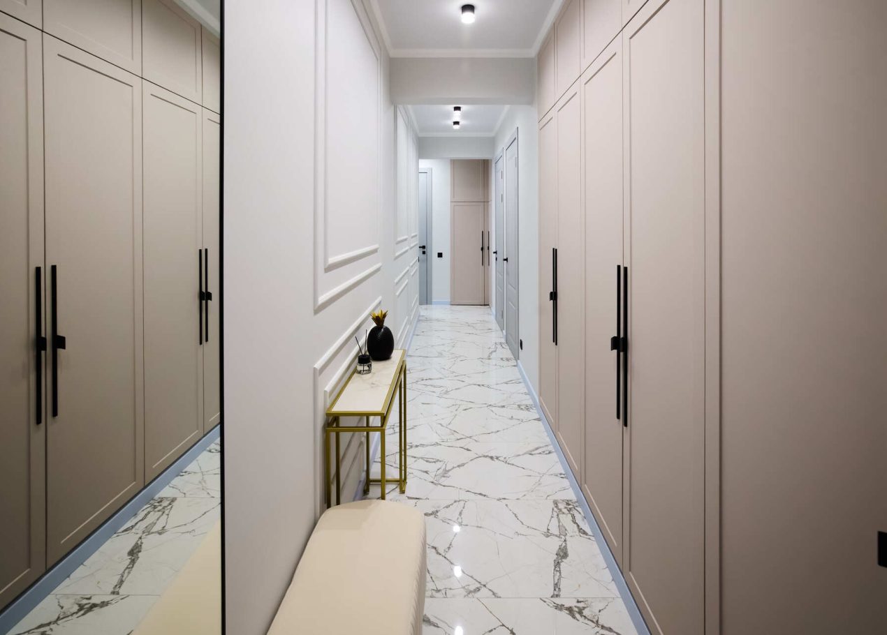 В квартире сформировали удобную и функциональную планировку: отдельная кухня, гостиная, мастер-спальня с собственным санузлом и гардеробной, дополнительный санузел и просторный холл с системой хранения. В отделке использовали практичные современные материалы, включая керамогранит с тёплыми полами и спокойную нейтральную палитру, чтобы интерьер выглядел актуально и гармонировал с архитектурой дома.