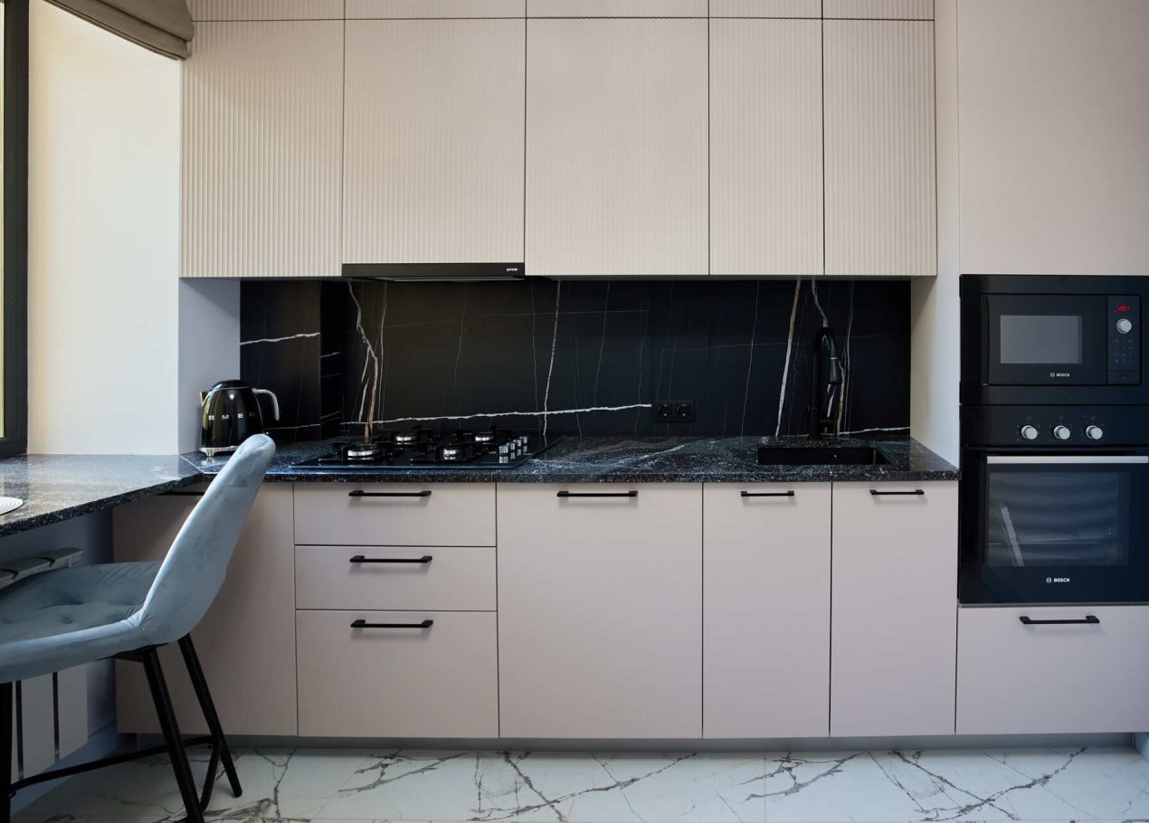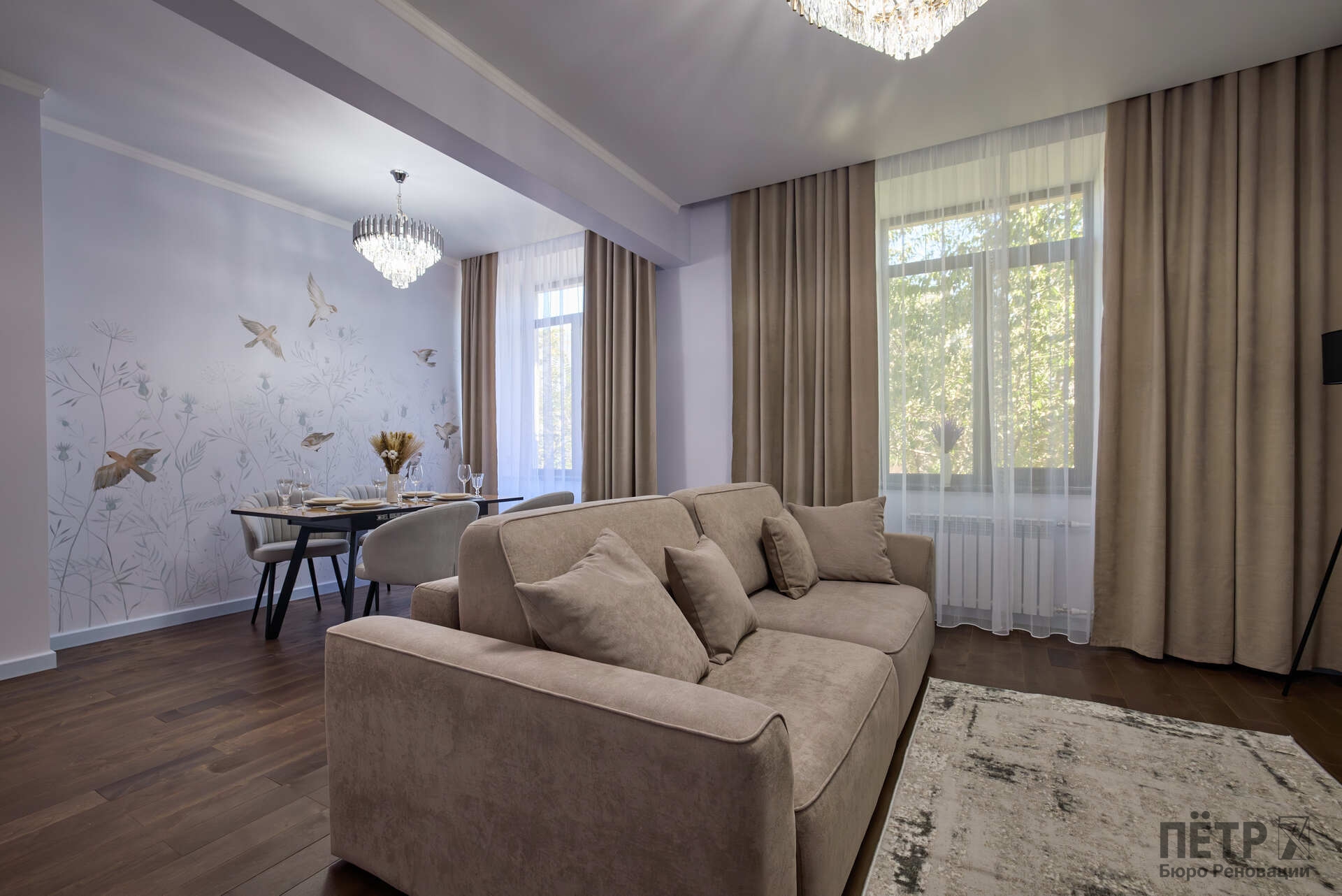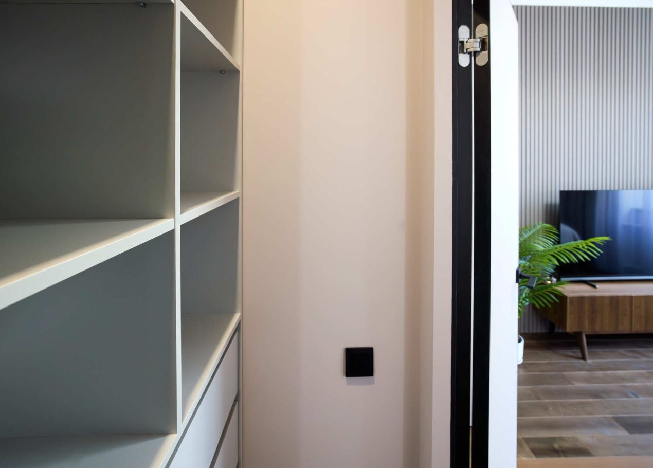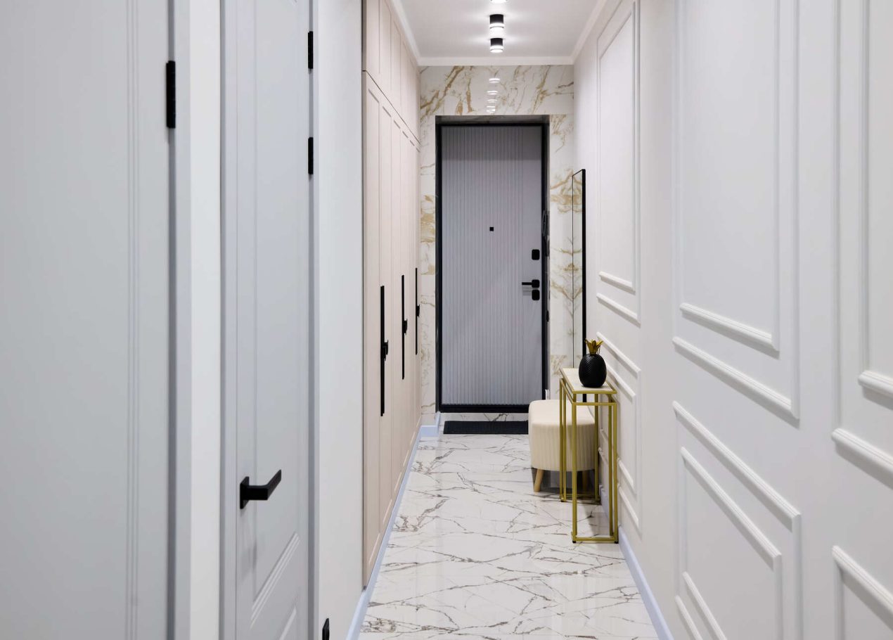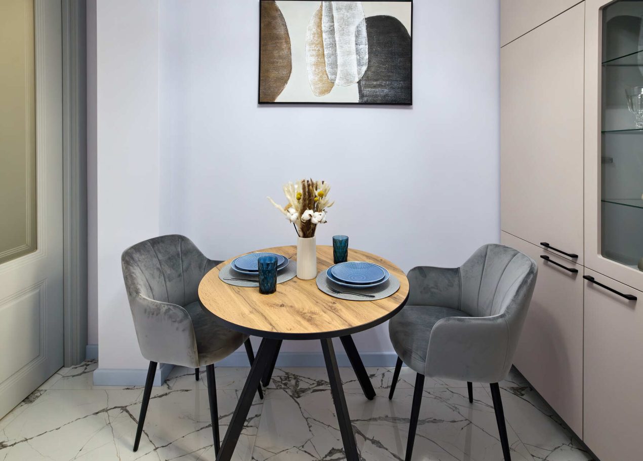 В квартире сформировали удобную и функциональную планировку: отдельная кухня, гостиная, мастер-спальня с собственным санузлом и гардеробной, дополнительный санузел и просторный холл с системой хранения. В отделке использовали практичные современные материалы, включая керамогранит с тёплыми полами и спокойную нейтральную палитру, чтобы интерьер выглядел актуально и гармонировал с архитектурой дома.