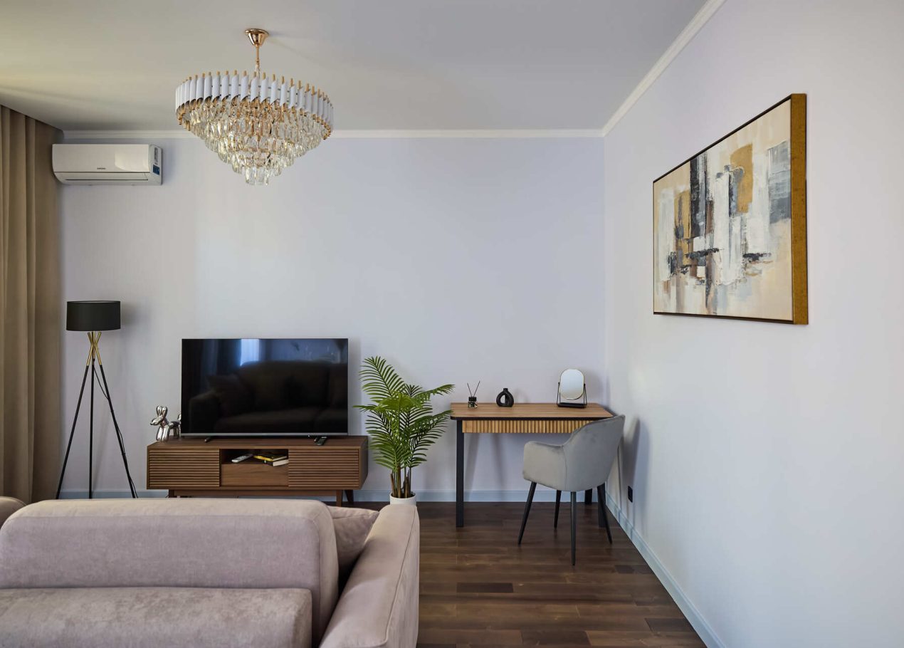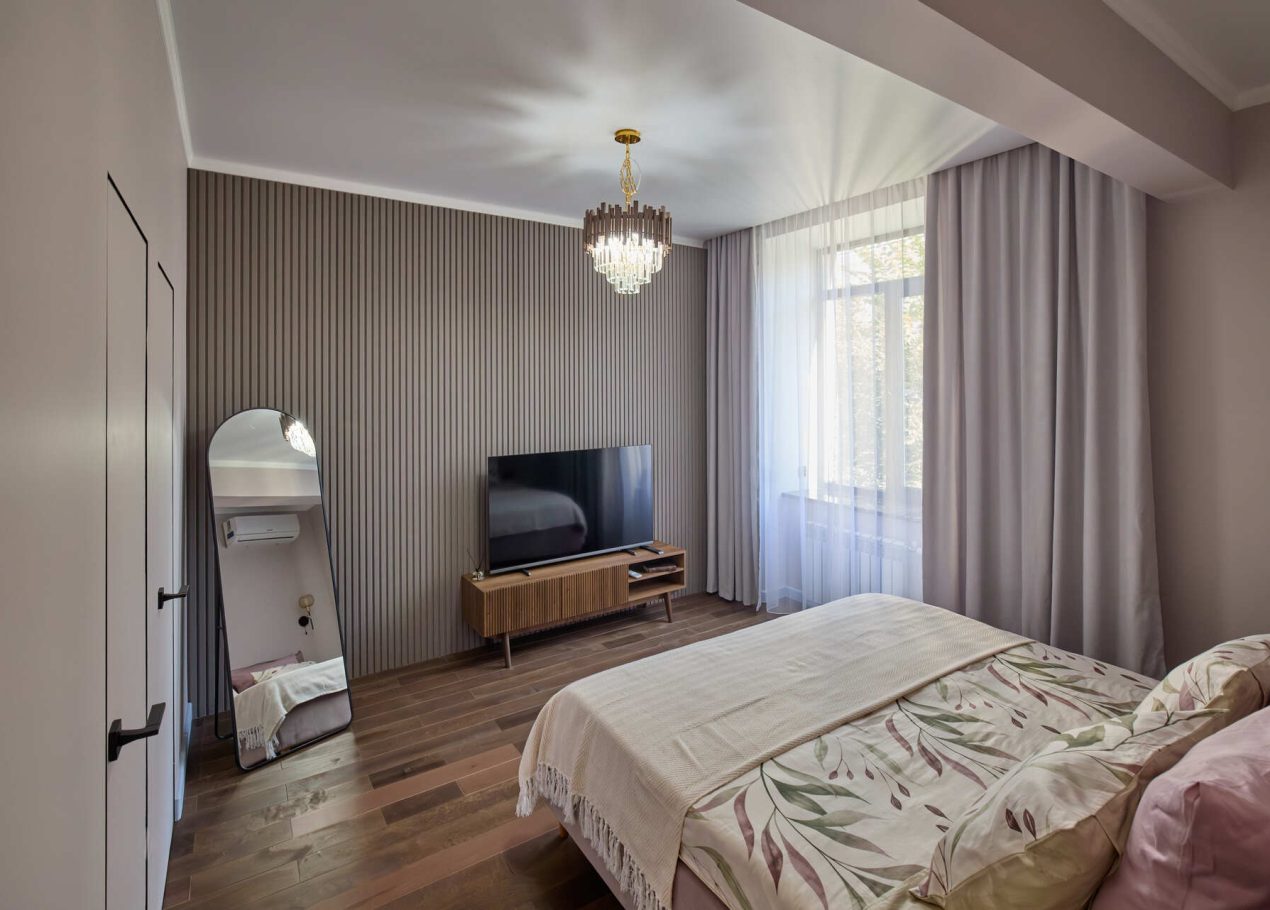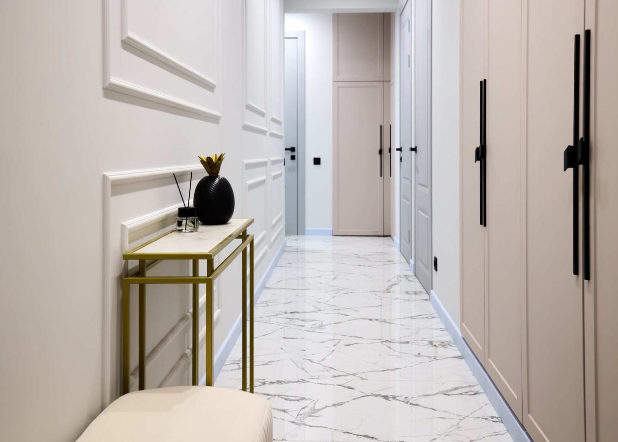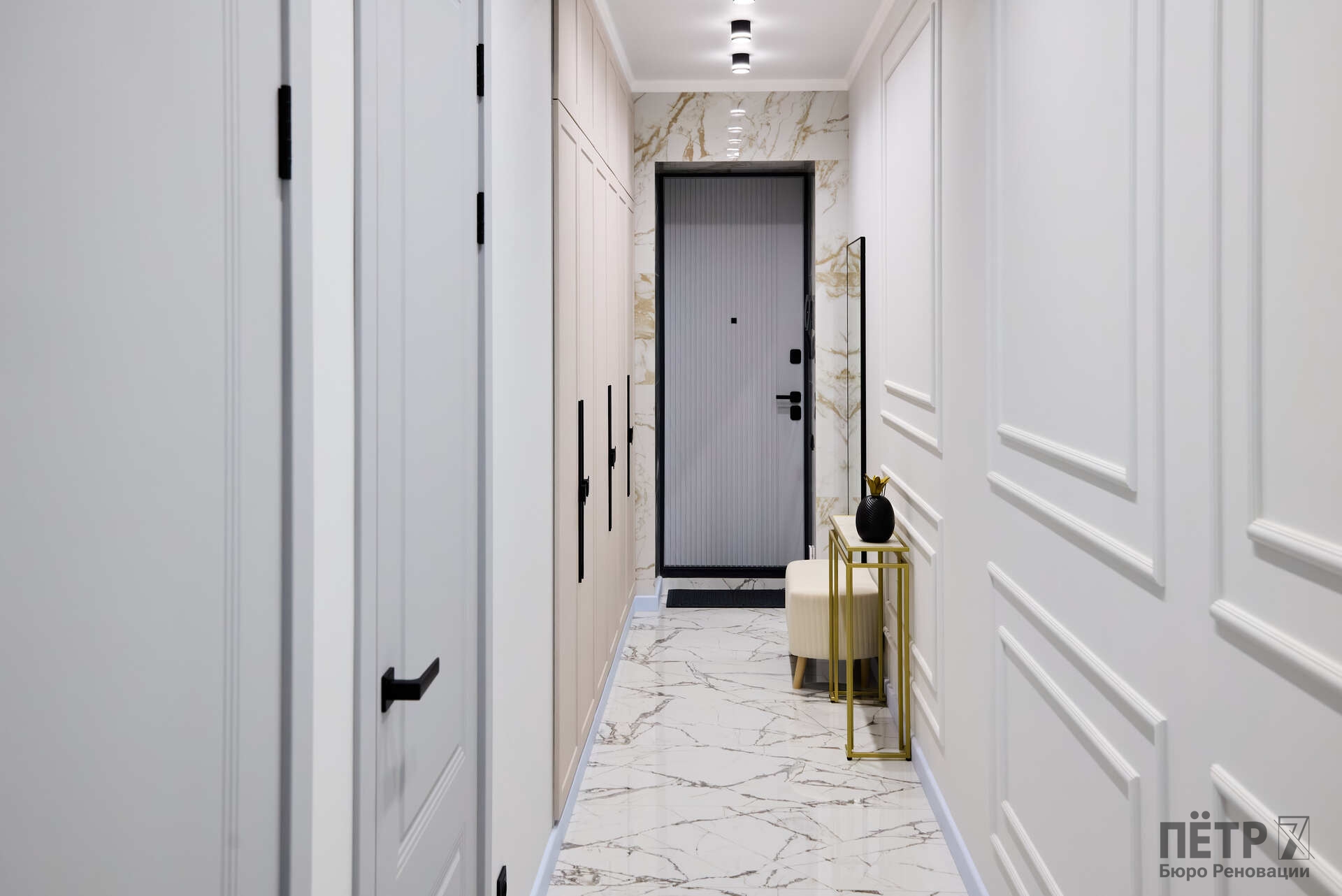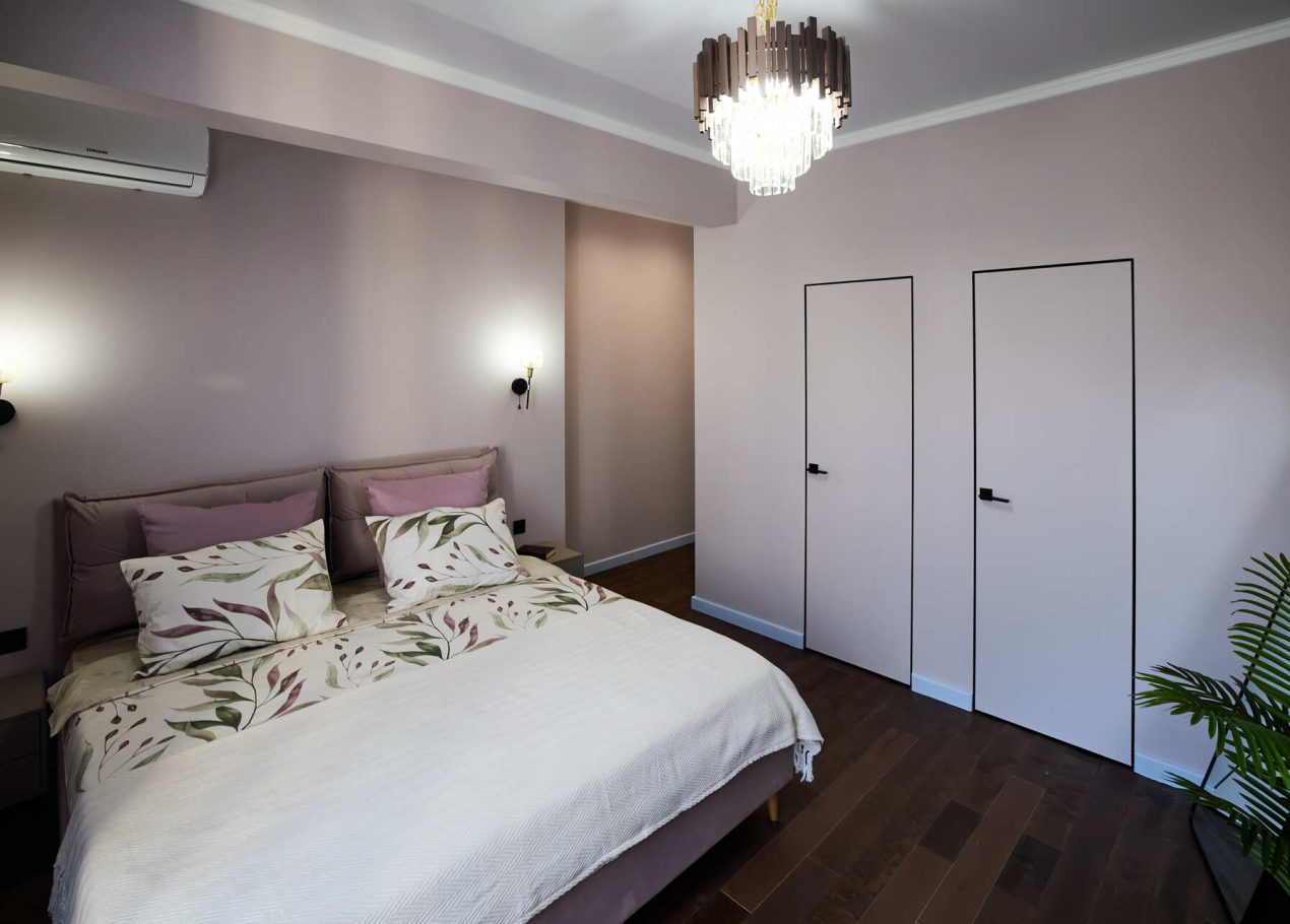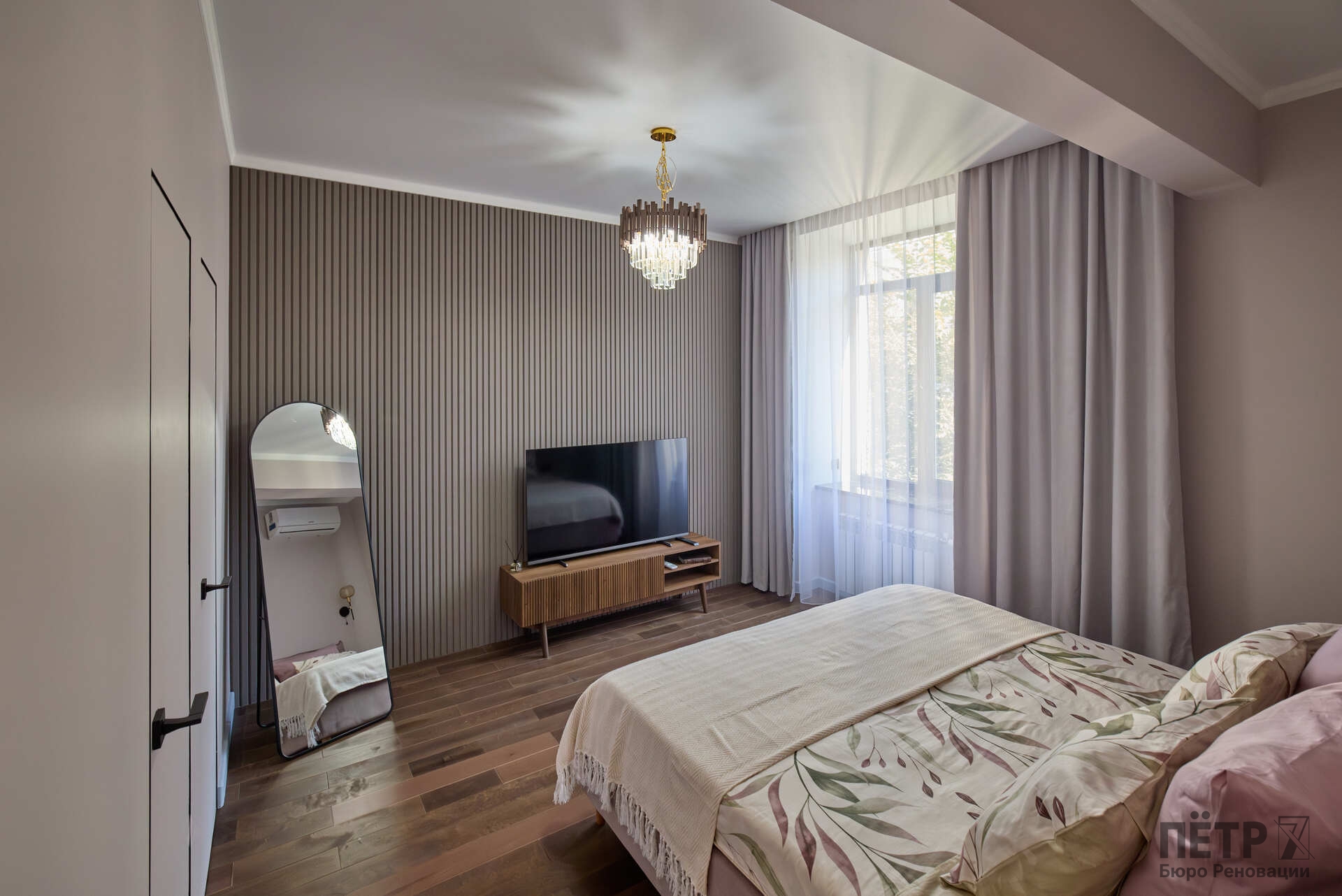 В квартире сформировали удобную и функциональную планировку: отдельная кухня, гостиная, мастер-спальня с собственным санузлом и гардеробной, дополнительный санузел и просторный холл с системой хранения. В отделке использовали практичные современные материалы, включая керамогранит с тёплыми полами и спокойную нейтральную палитру, чтобы интерьер выглядел актуально и гармонировал с архитектурой дома.