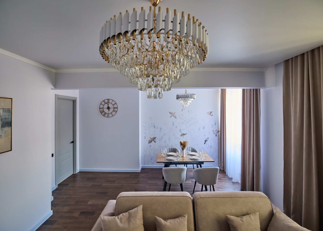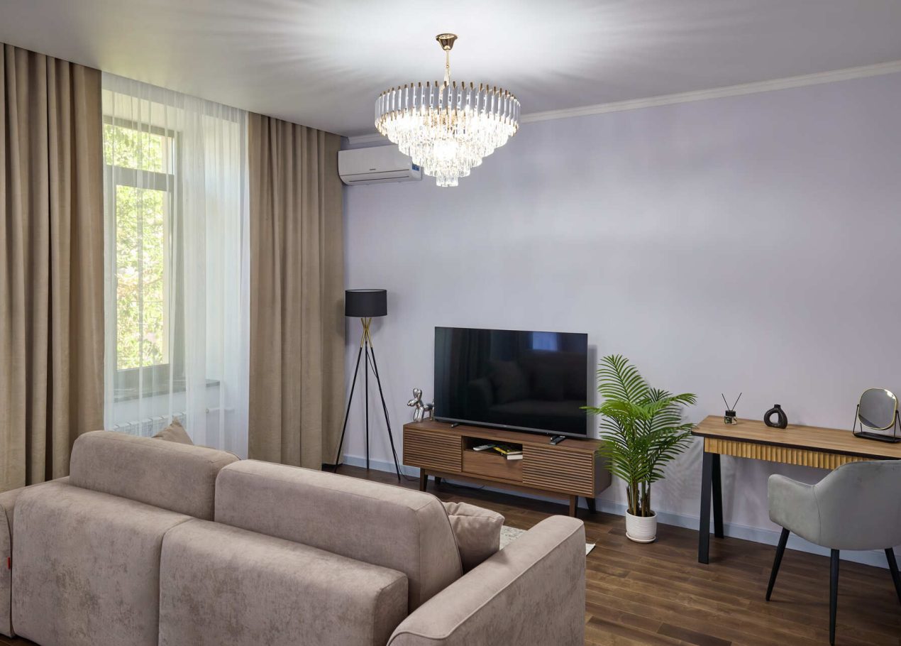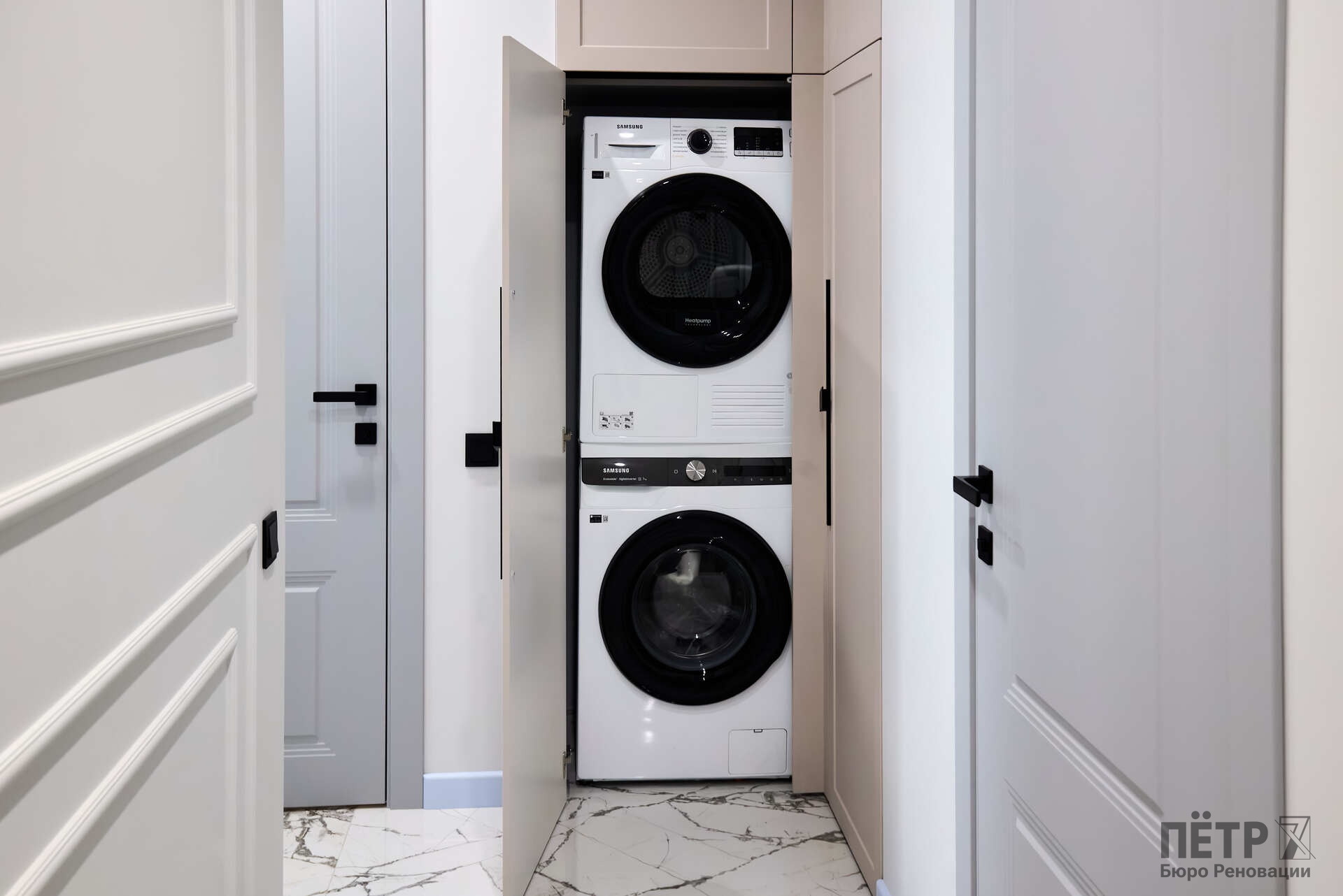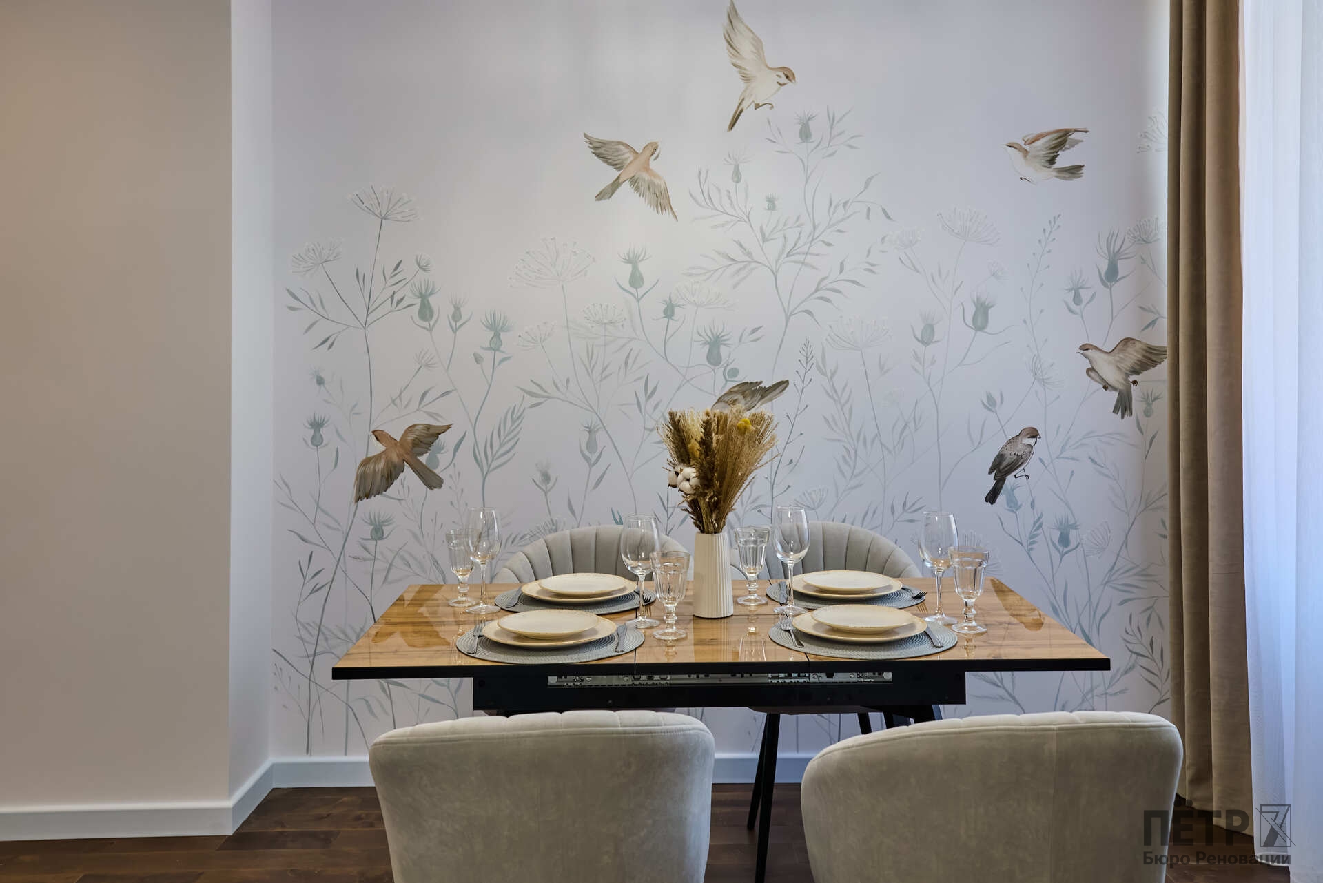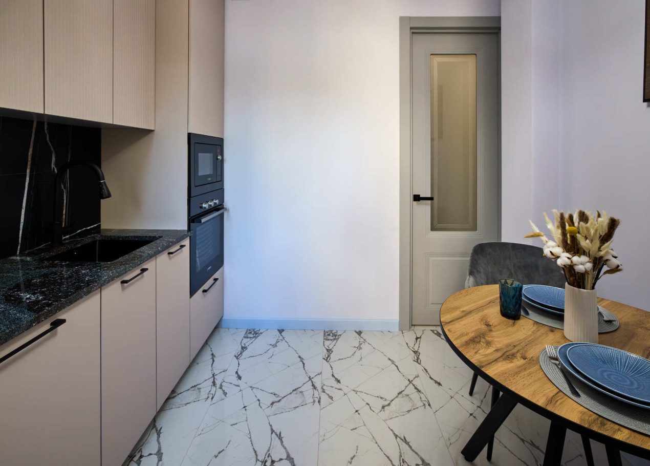 В квартире сформировали удобную и функциональную планировку: отдельная кухня, гостиная, мастер-спальня с собственным санузлом и гардеробной, дополнительный санузел и просторный холл с системой хранения. В отделке использовали практичные современные материалы, включая керамогранит с тёплыми полами и спокойную нейтральную палитру, чтобы интерьер выглядел актуально и гармонировал с архитектурой дома.