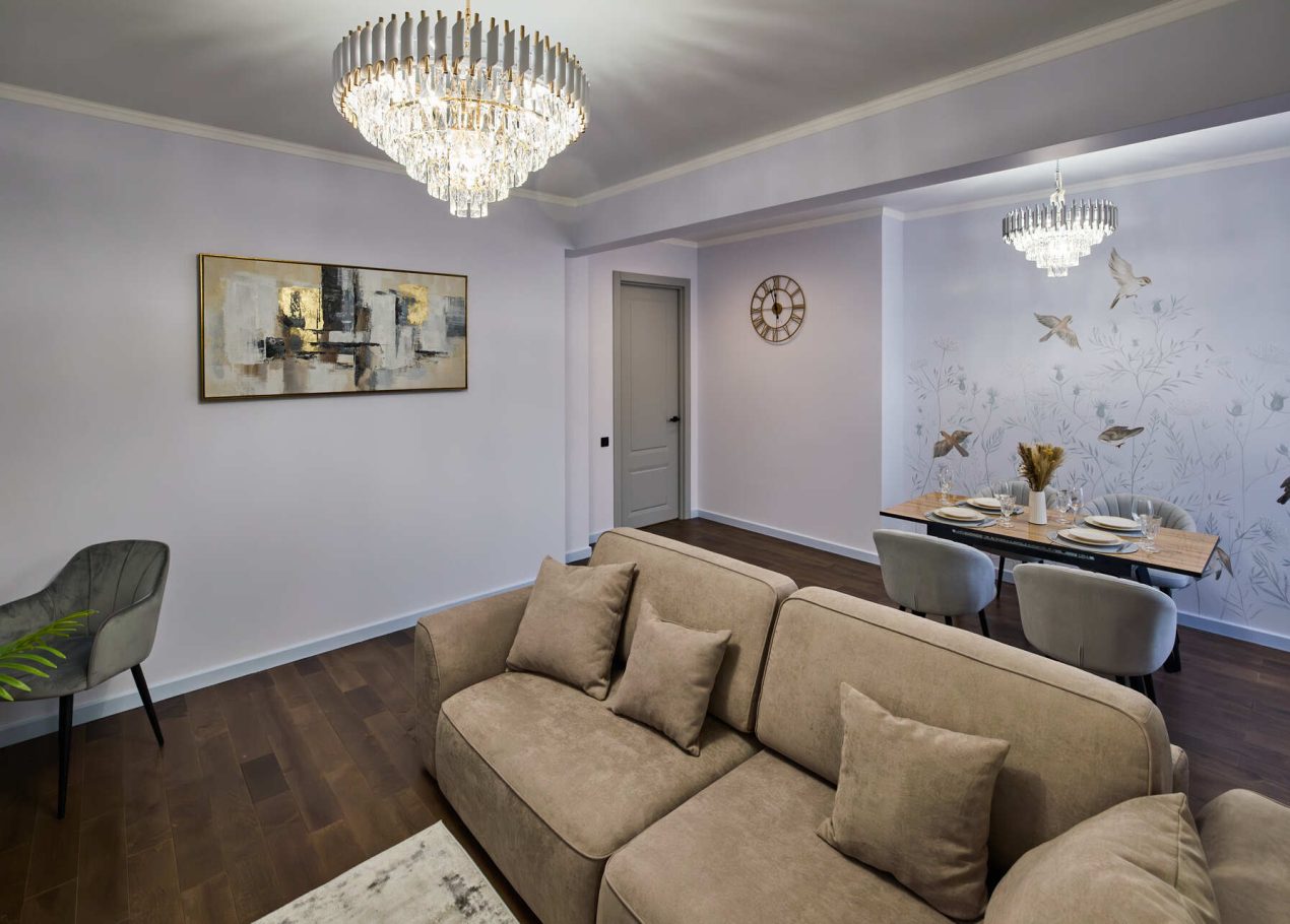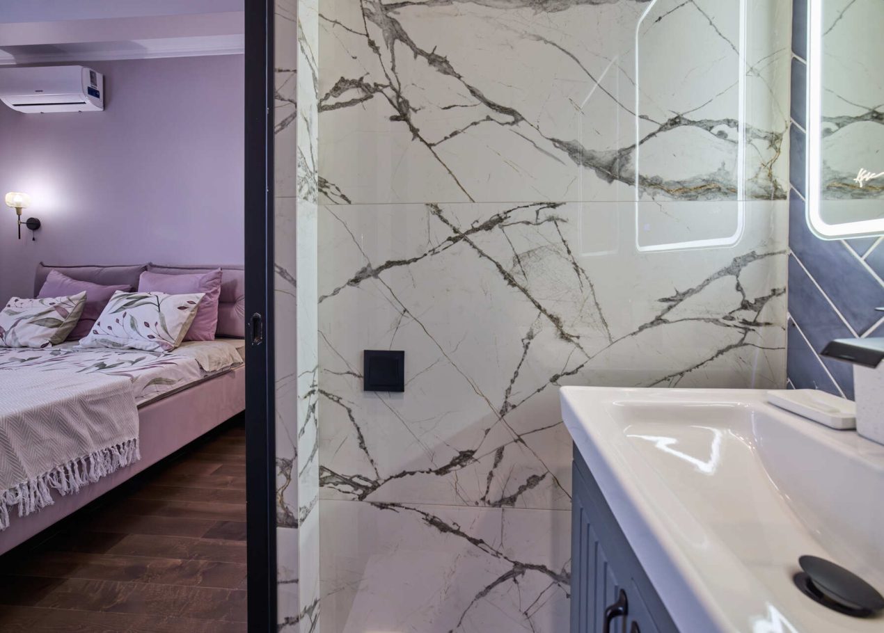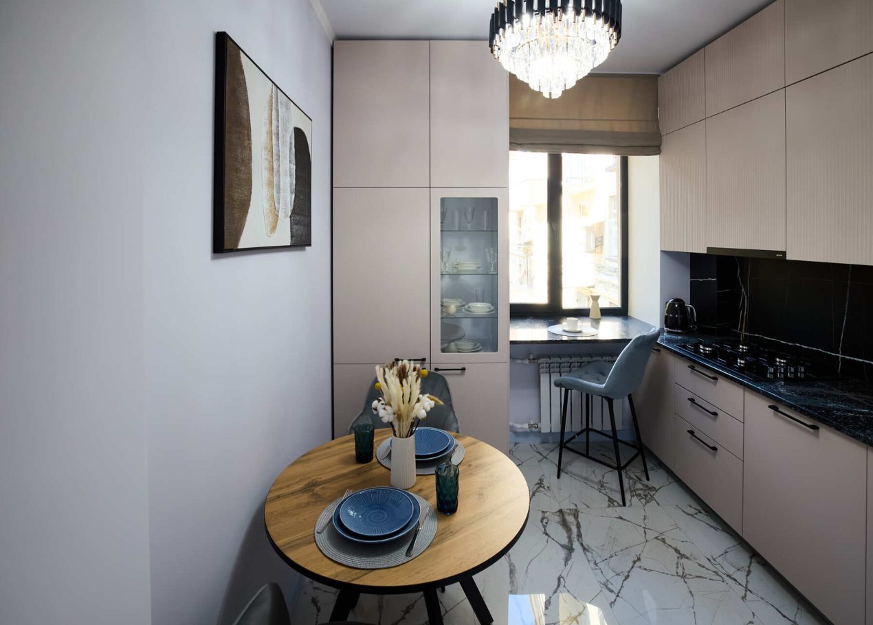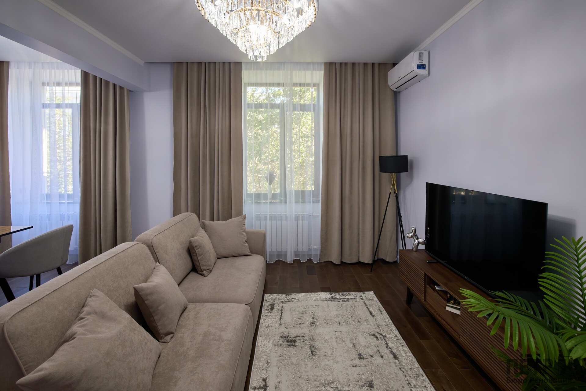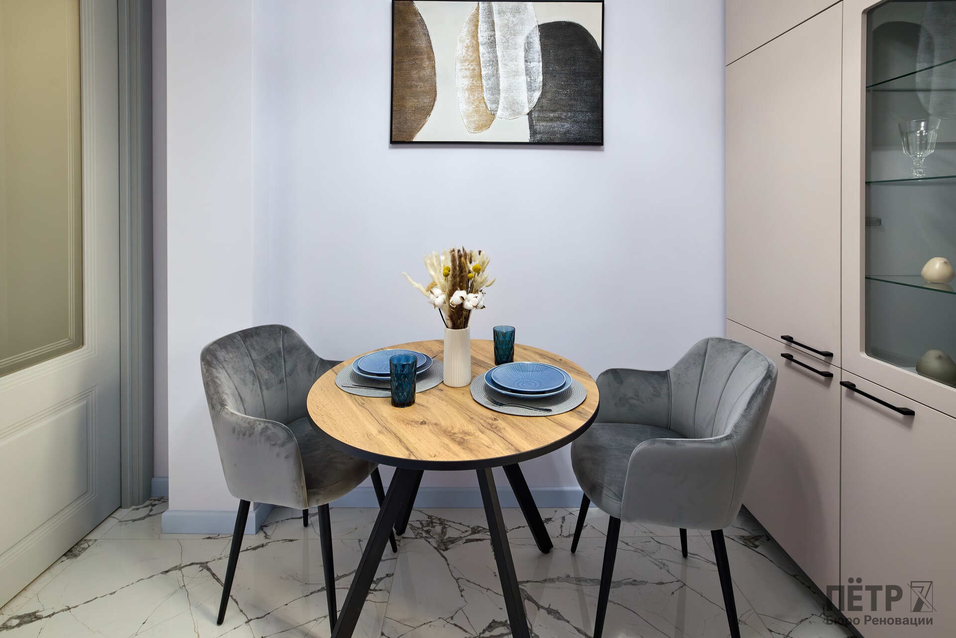 В квартире сформировали удобную и функциональную планировку: отдельная кухня, гостиная, мастер-спальня с собственным санузлом и гардеробной, дополнительный санузел и просторный холл с системой хранения. В отделке использовали практичные современные материалы, включая керамогранит с тёплыми полами и спокойную нейтральную палитру, чтобы интерьер выглядел актуально и гармонировал с архитектурой дома.