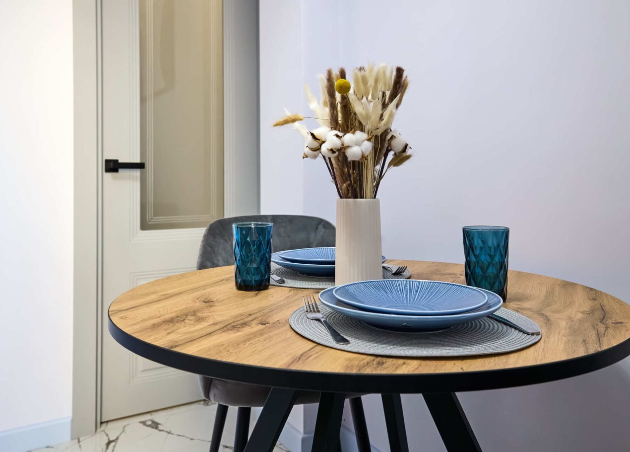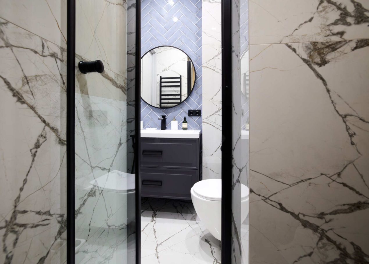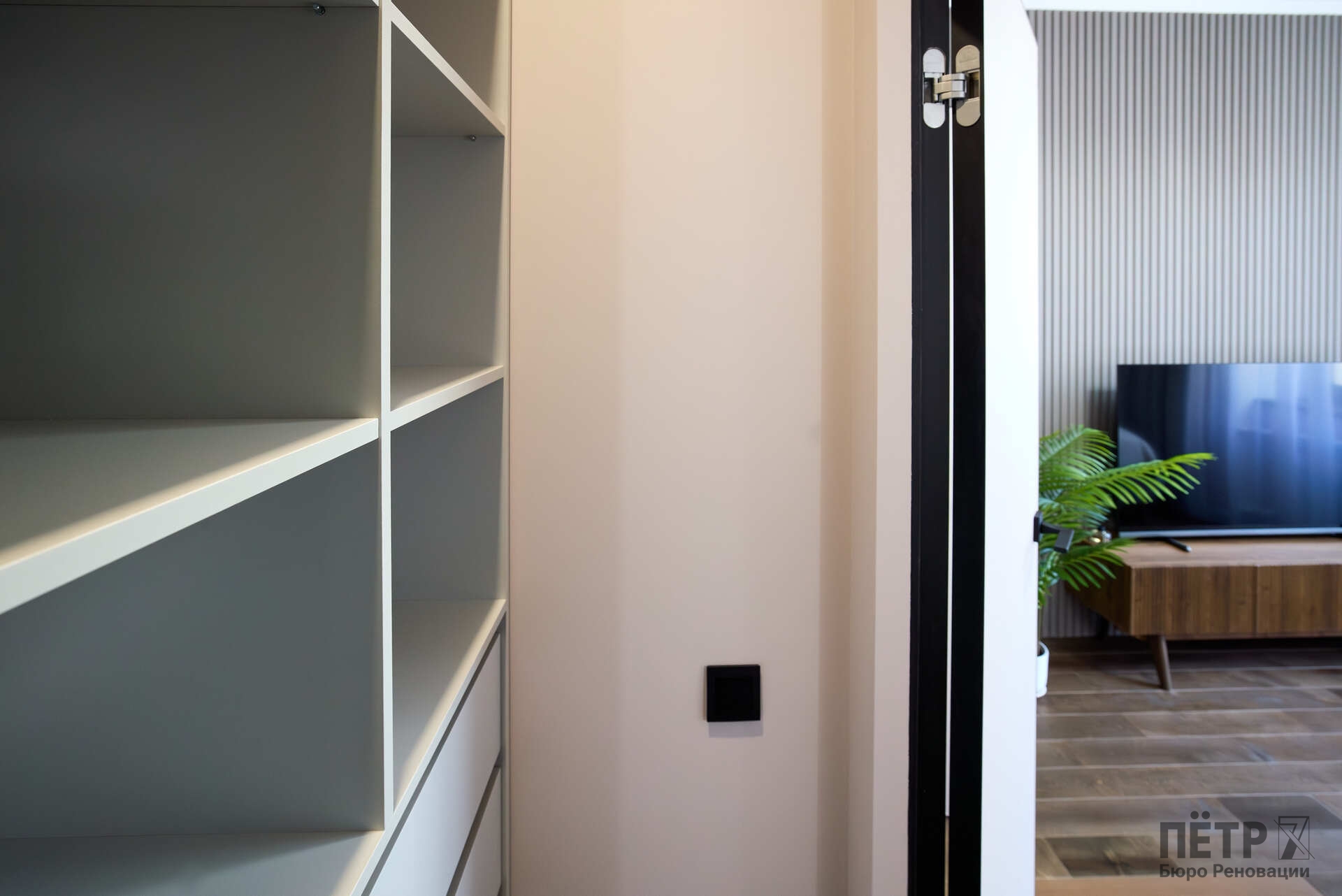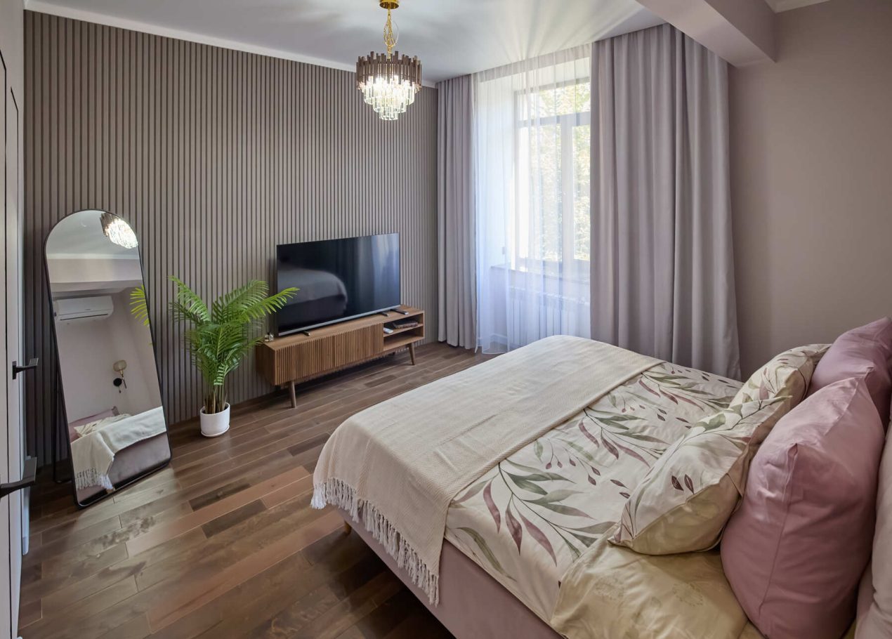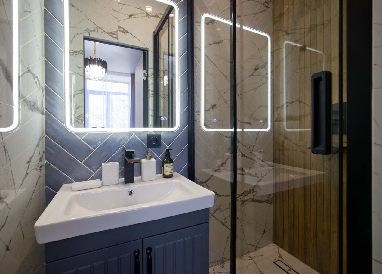 В квартире сформировали удобную и функциональную планировку: отдельная кухня, гостиная, мастер-спальня с собственным санузлом и гардеробной, дополнительный санузел и просторный холл с системой хранения. В отделке использовали практичные современные материалы, включая керамогранит с тёплыми полами и спокойную нейтральную палитру, чтобы интерьер выглядел актуально и гармонировал с архитектурой дома.
