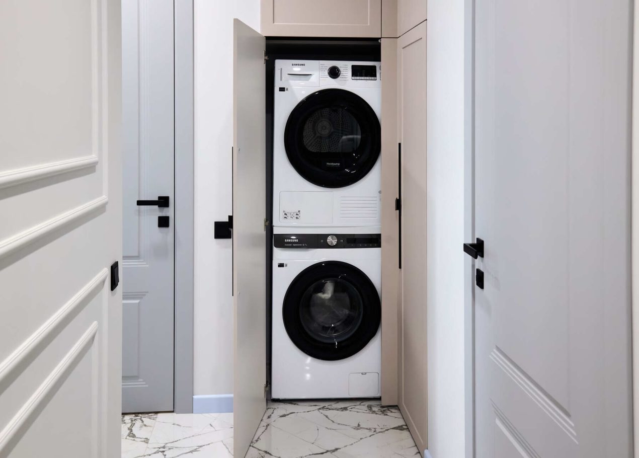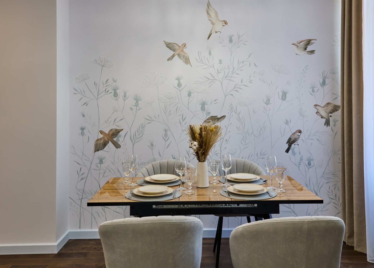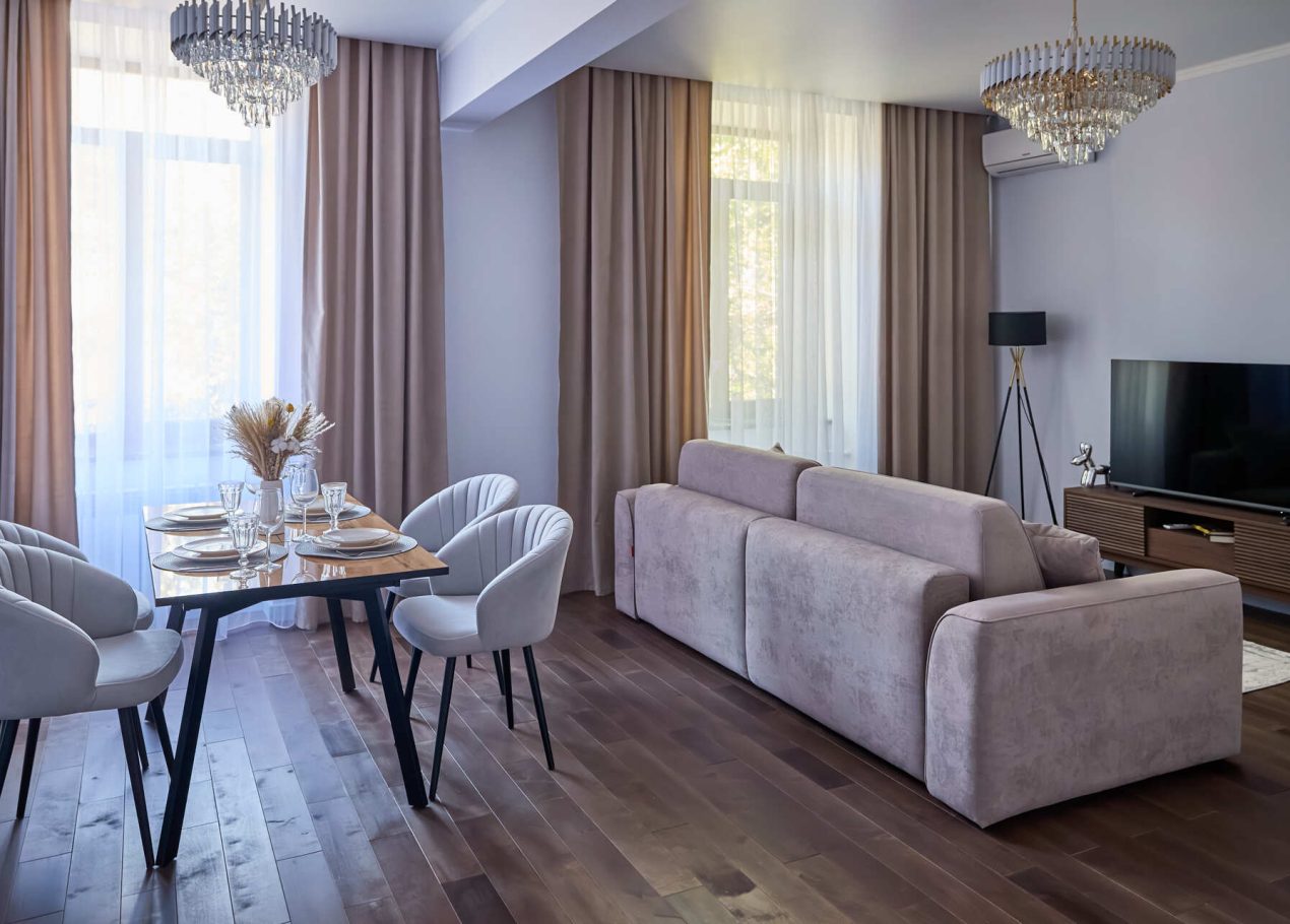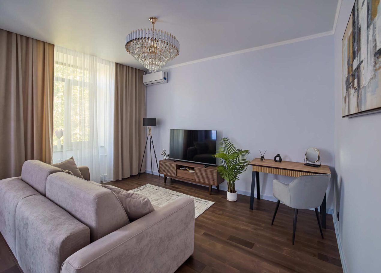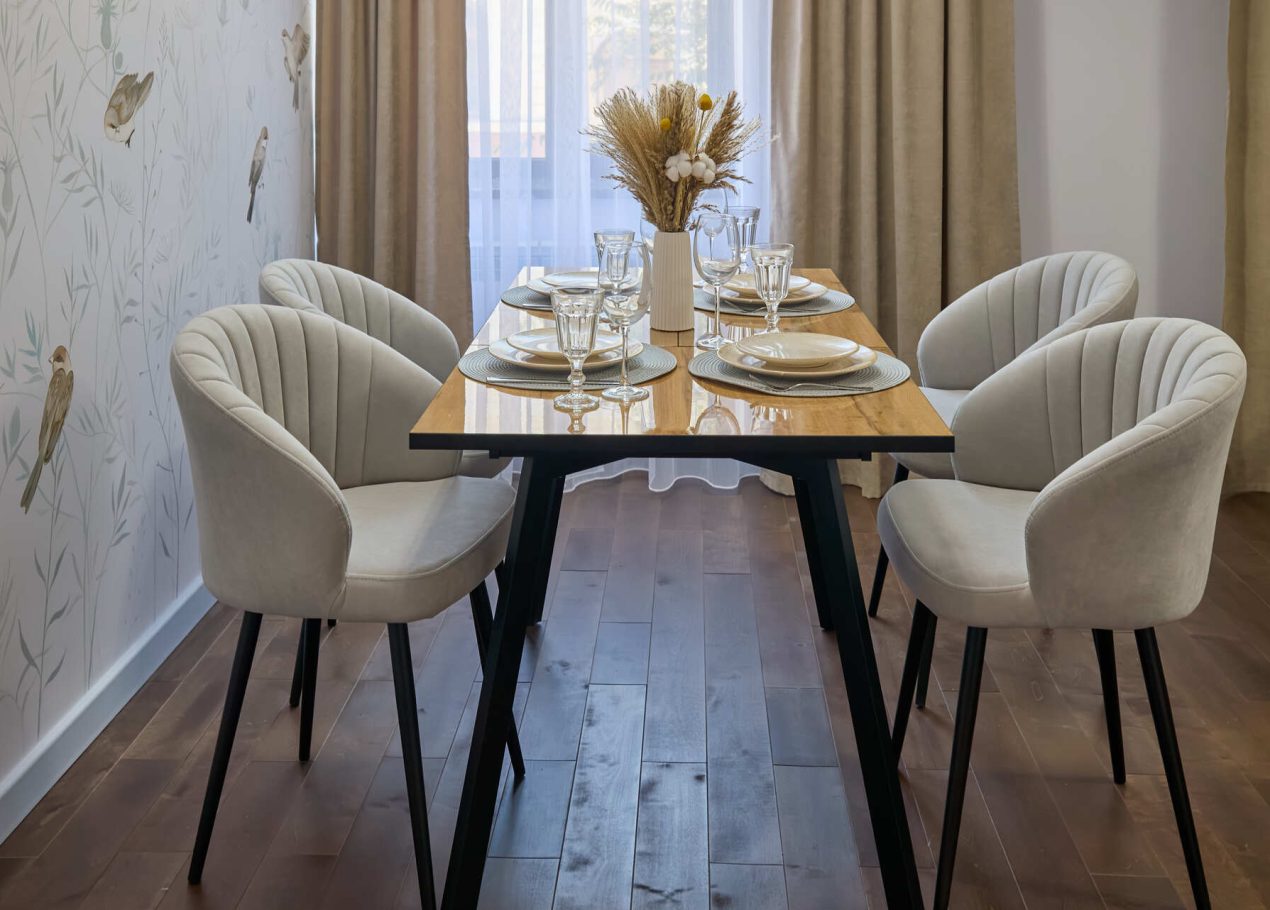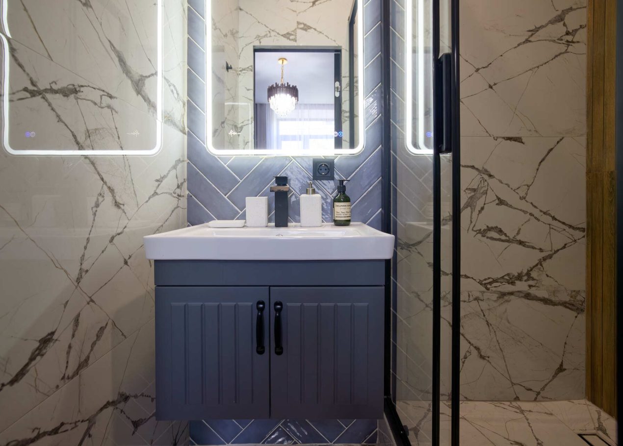 В квартире сформировали удобную и функциональную планировку: отдельная кухня, гостиная, мастер-спальня с собственным санузлом и гардеробной, дополнительный санузел и просторный холл с системой хранения. В отделке использовали практичные современные материалы, включая керамогранит с тёплыми полами и спокойную нейтральную палитру, чтобы интерьер выглядел актуально и гармонировал с архитектурой дома.