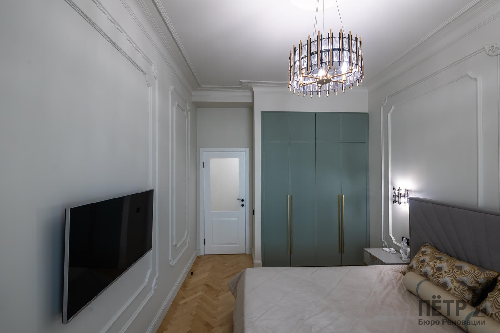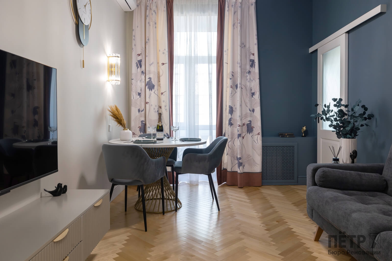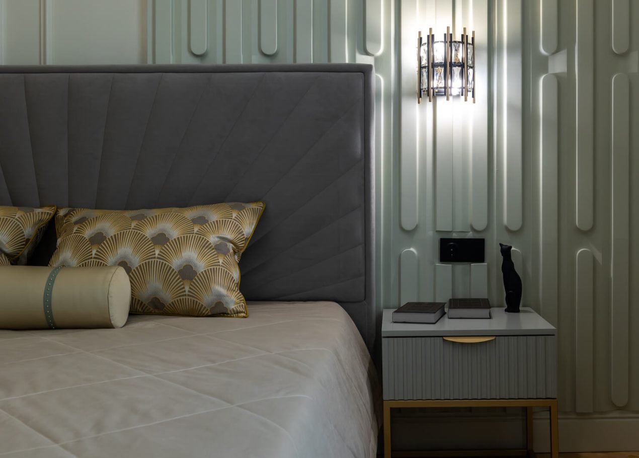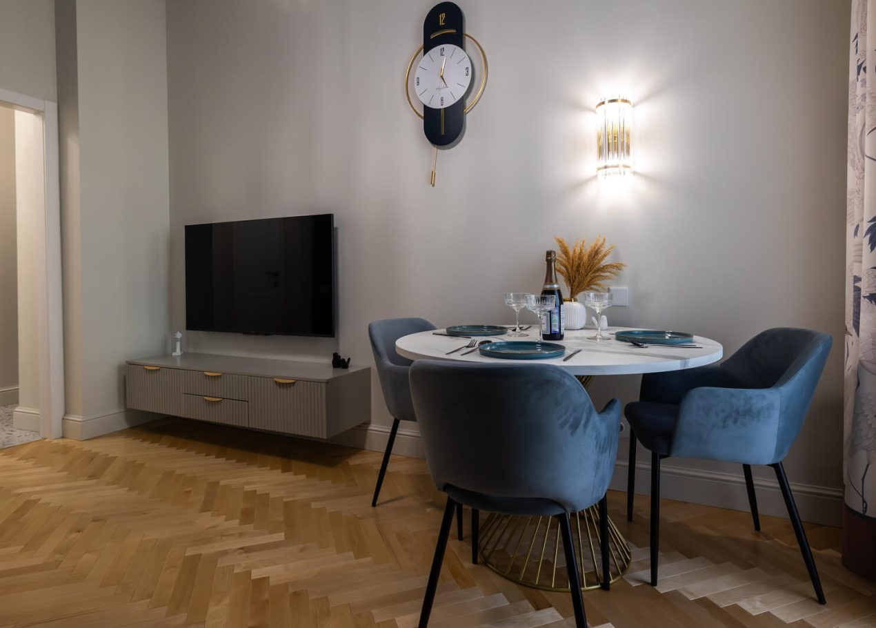 В интерьере сохранили характерные элементы исторического жилья: потолки около 3,4 метра, паркет «ёлочкой», спокойную архитектуру стен и аккуратные интерьерные акценты. Все инженерные системы были полностью обновлены, что позволило совместить архитектуру старого фонда с современным уровнем комфорта.